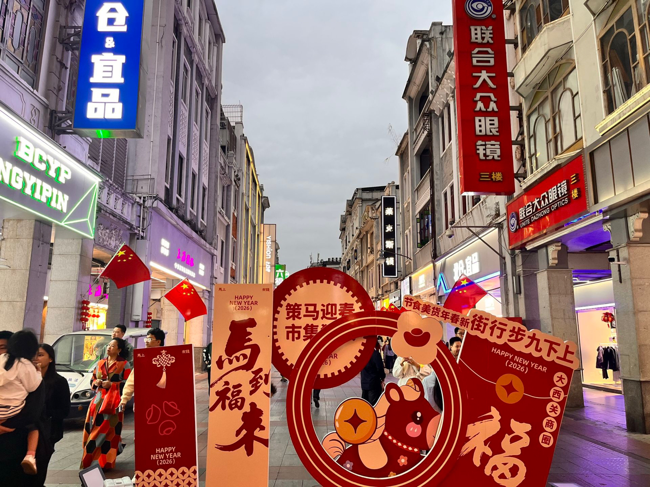 大西关的年味,在上下九步行街氤氲开来。红绸漫卷,福字生辉,卡通鼠跃于古韵檐角;策马迎春市集里,灯笼摇曳,人声笑语织成暖流。镜头掠过仓&宜品的窗棂、BCYP NGYIPIN的招牌,映着国旗与灯光,恍若时光慢行——马到福来,年在烟火深处悄然绽放。