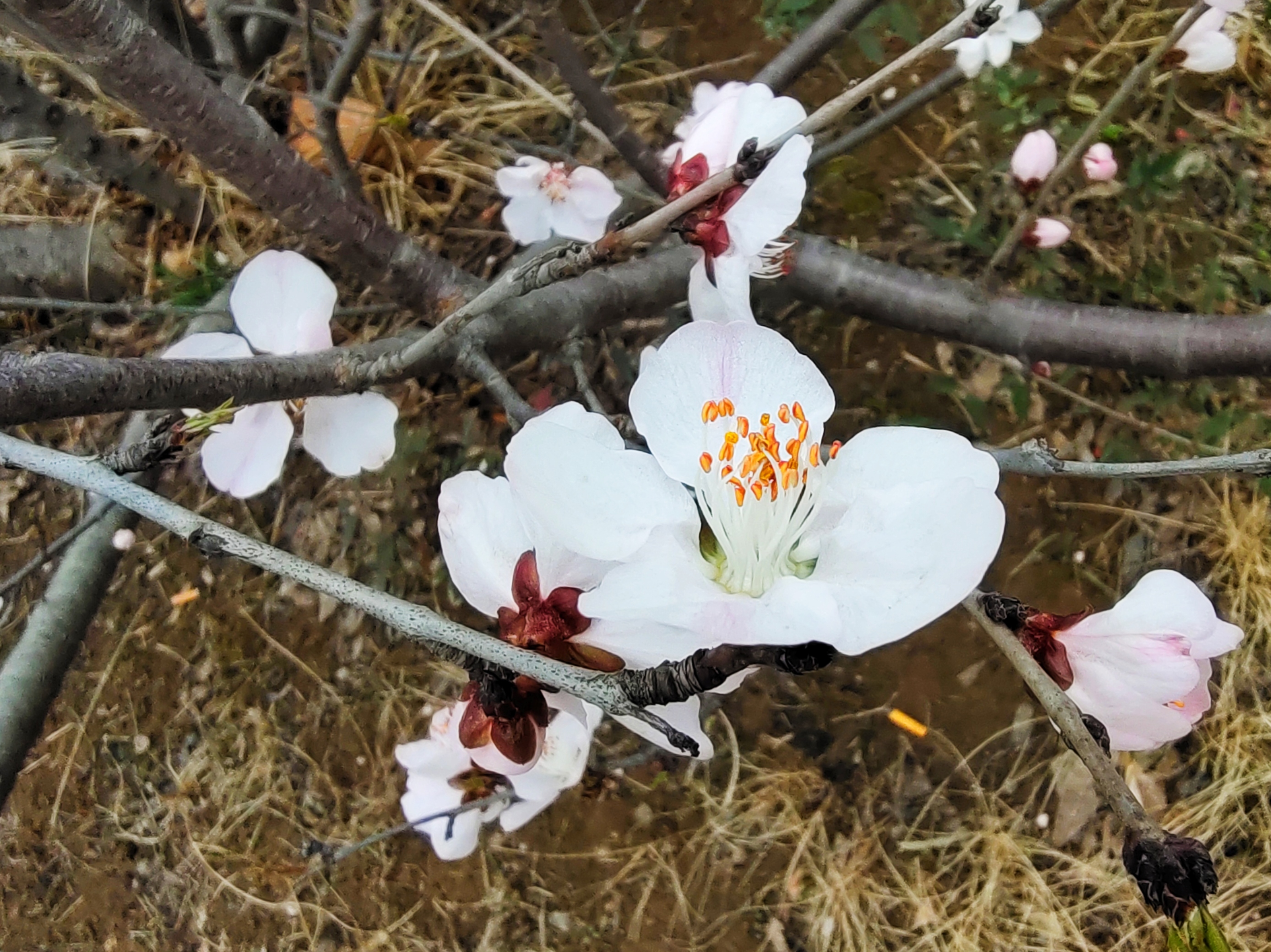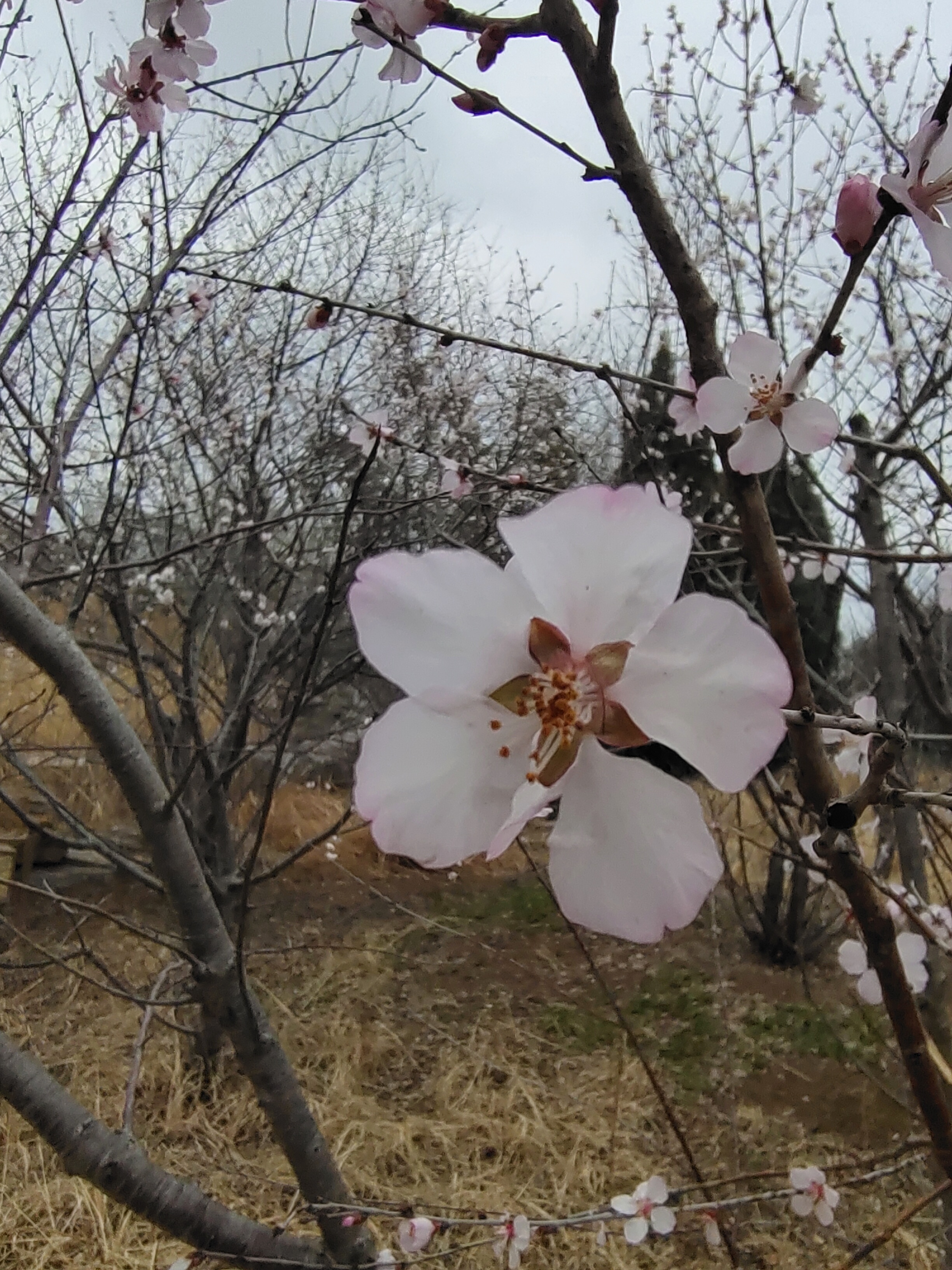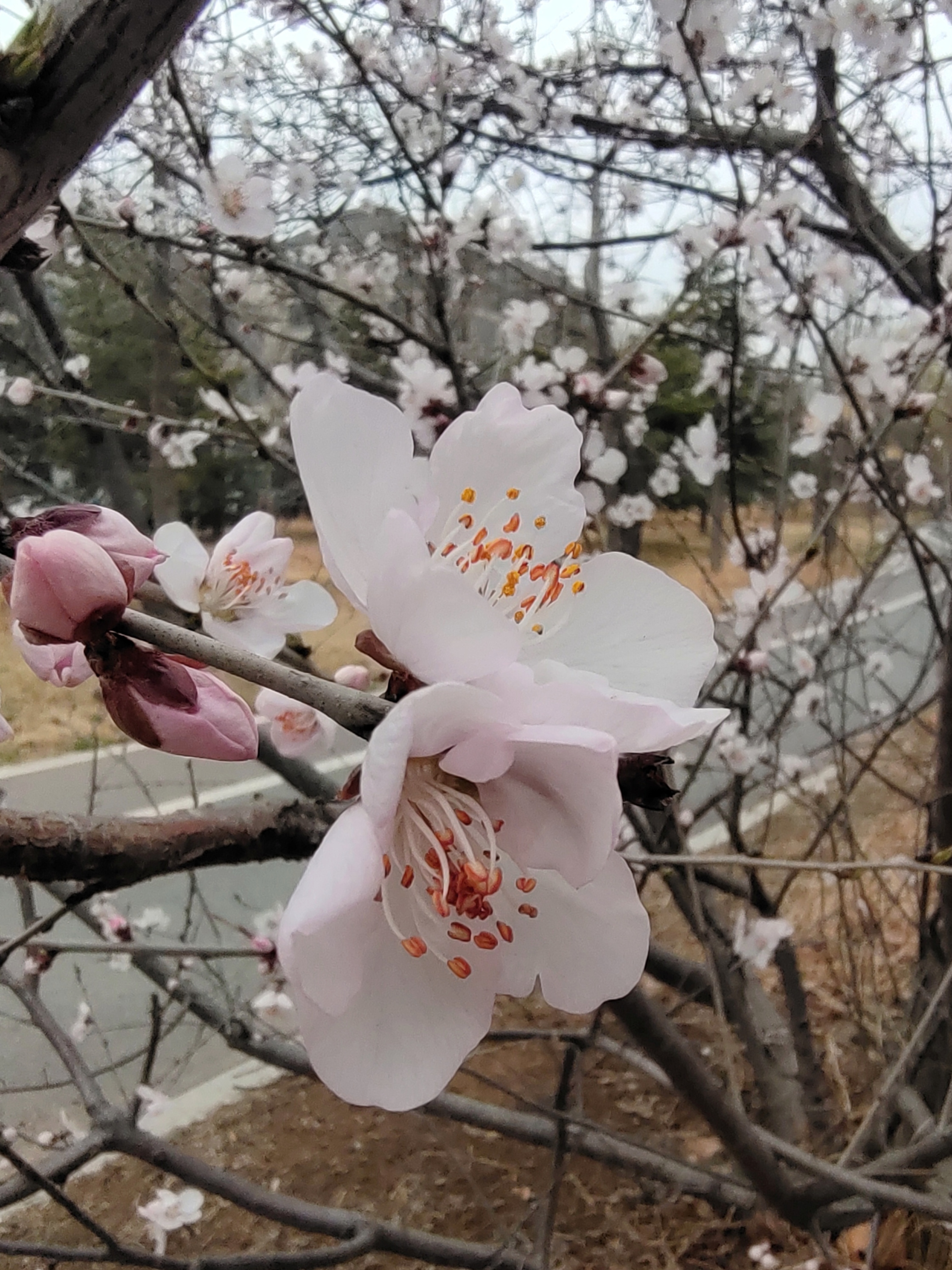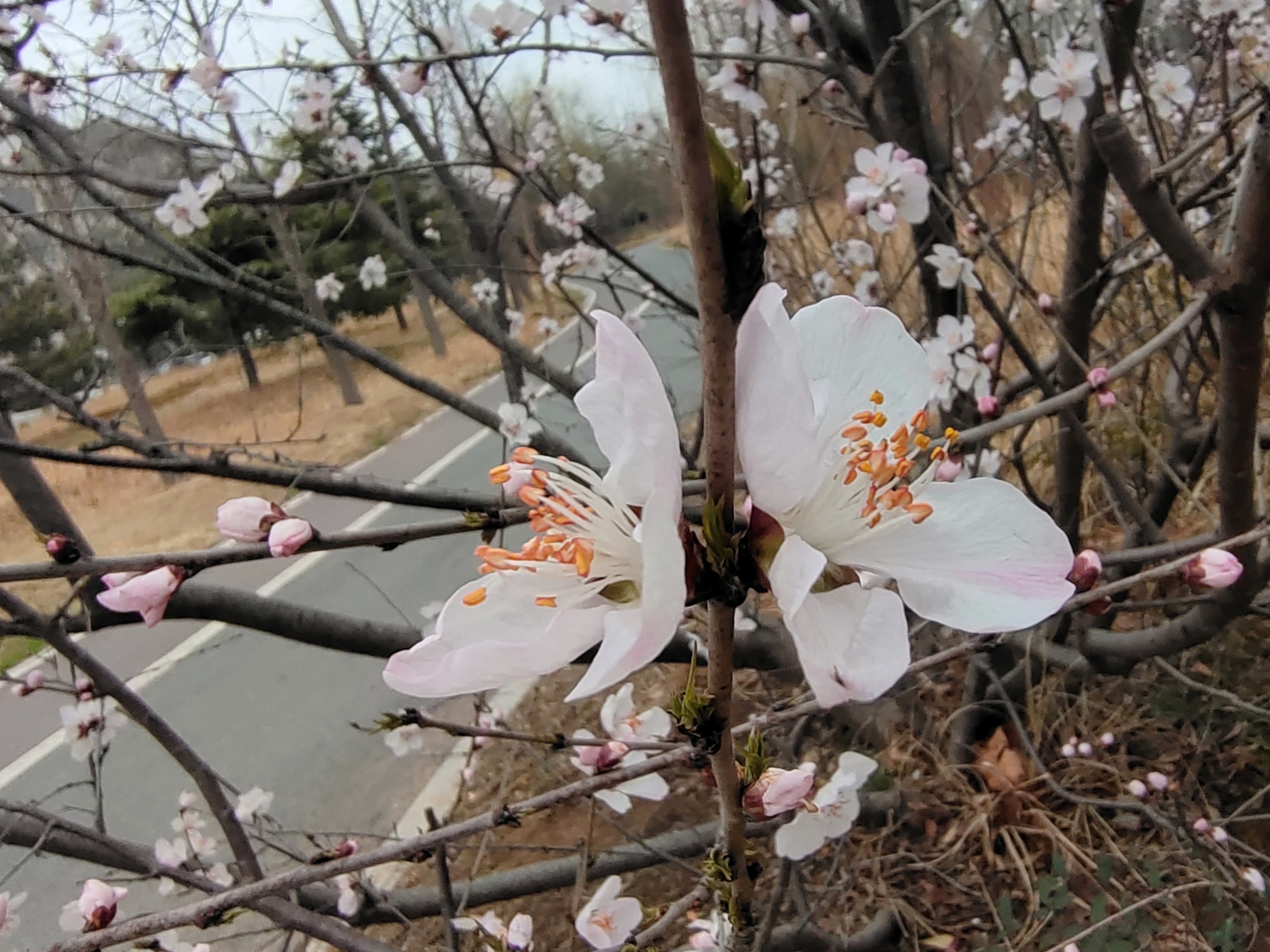 早春桃花开了,粉白花瓣配橙蕊,枯草地上枝头闹,随手一拍都是春日小确幸。