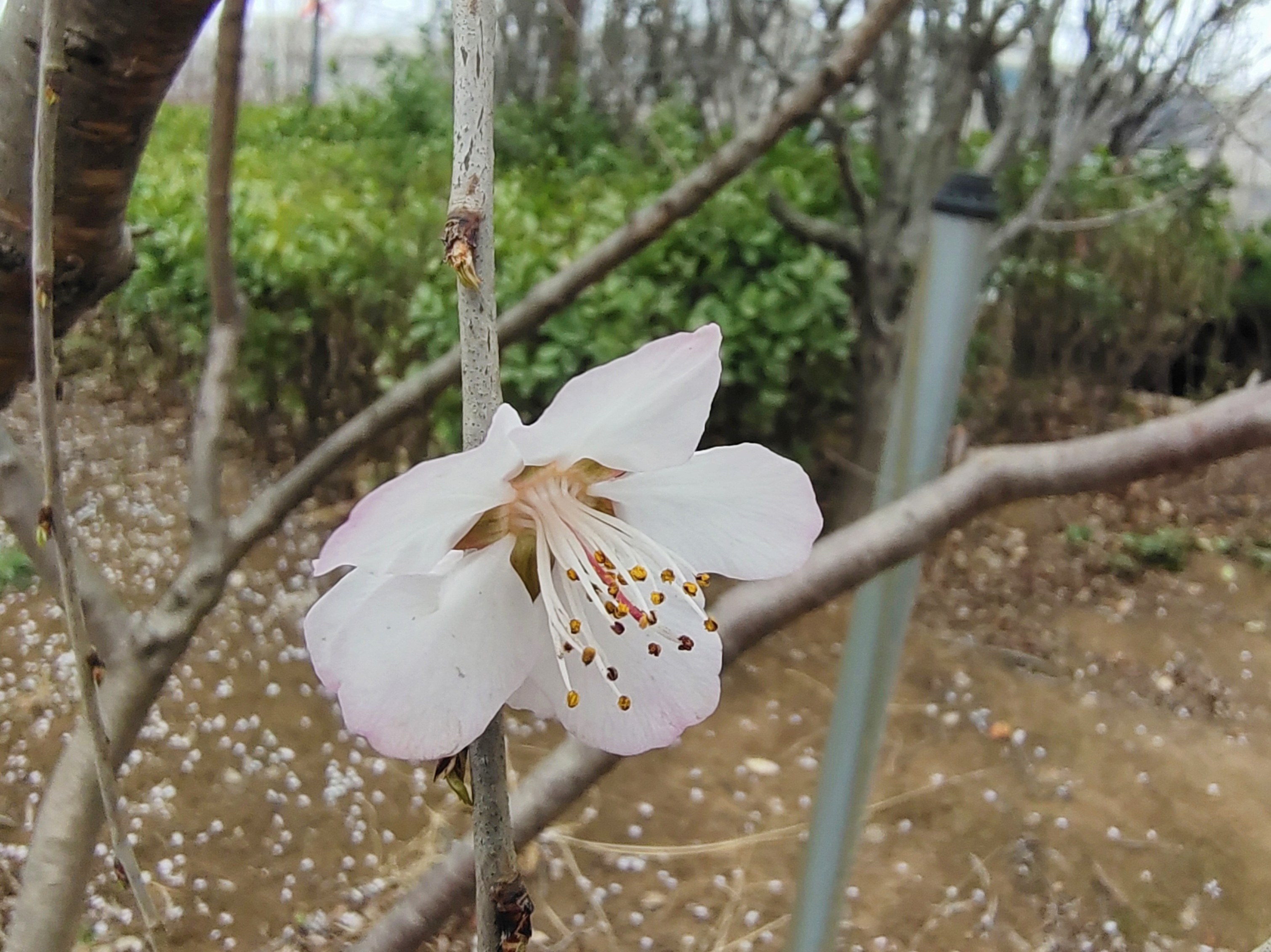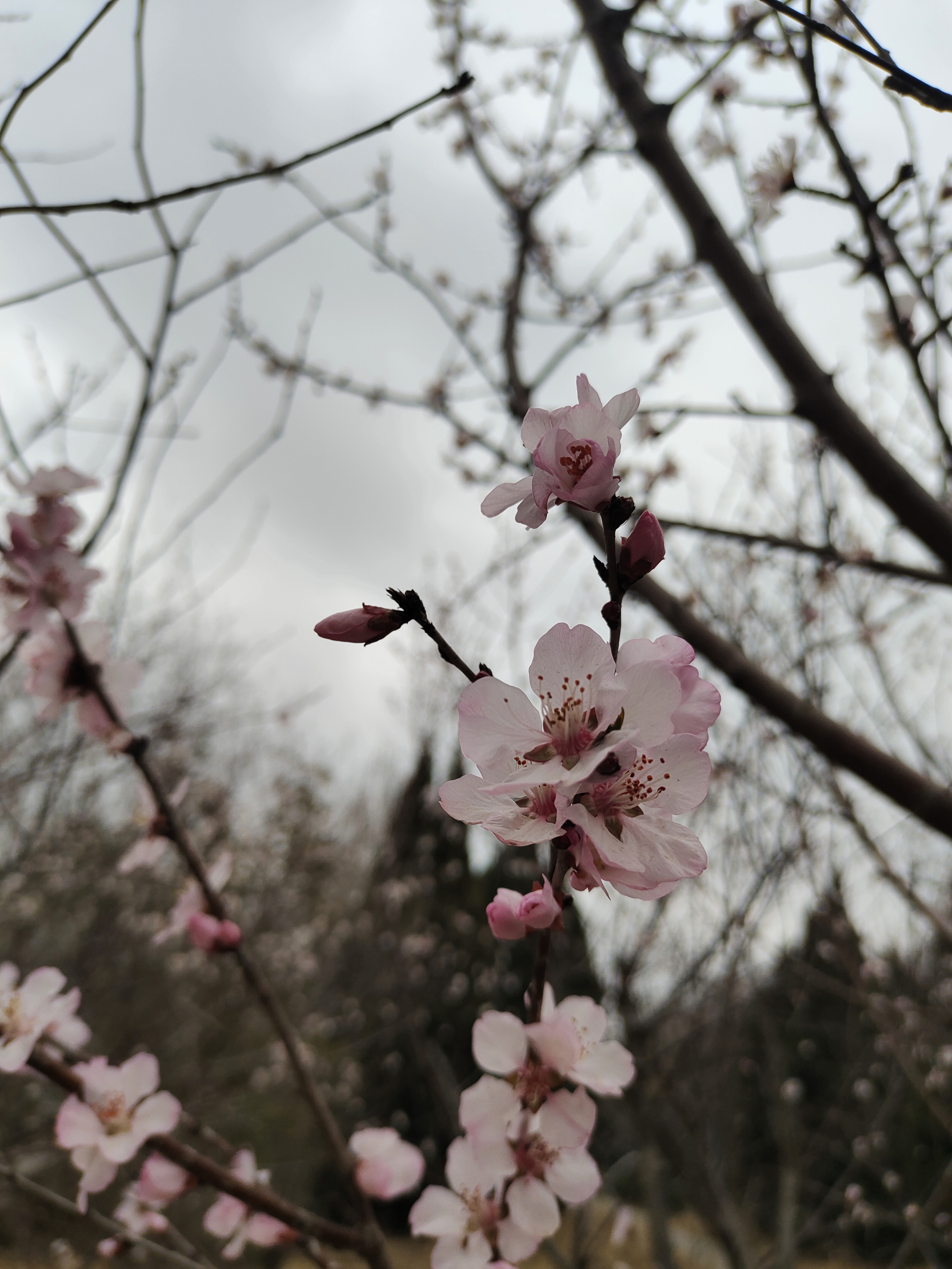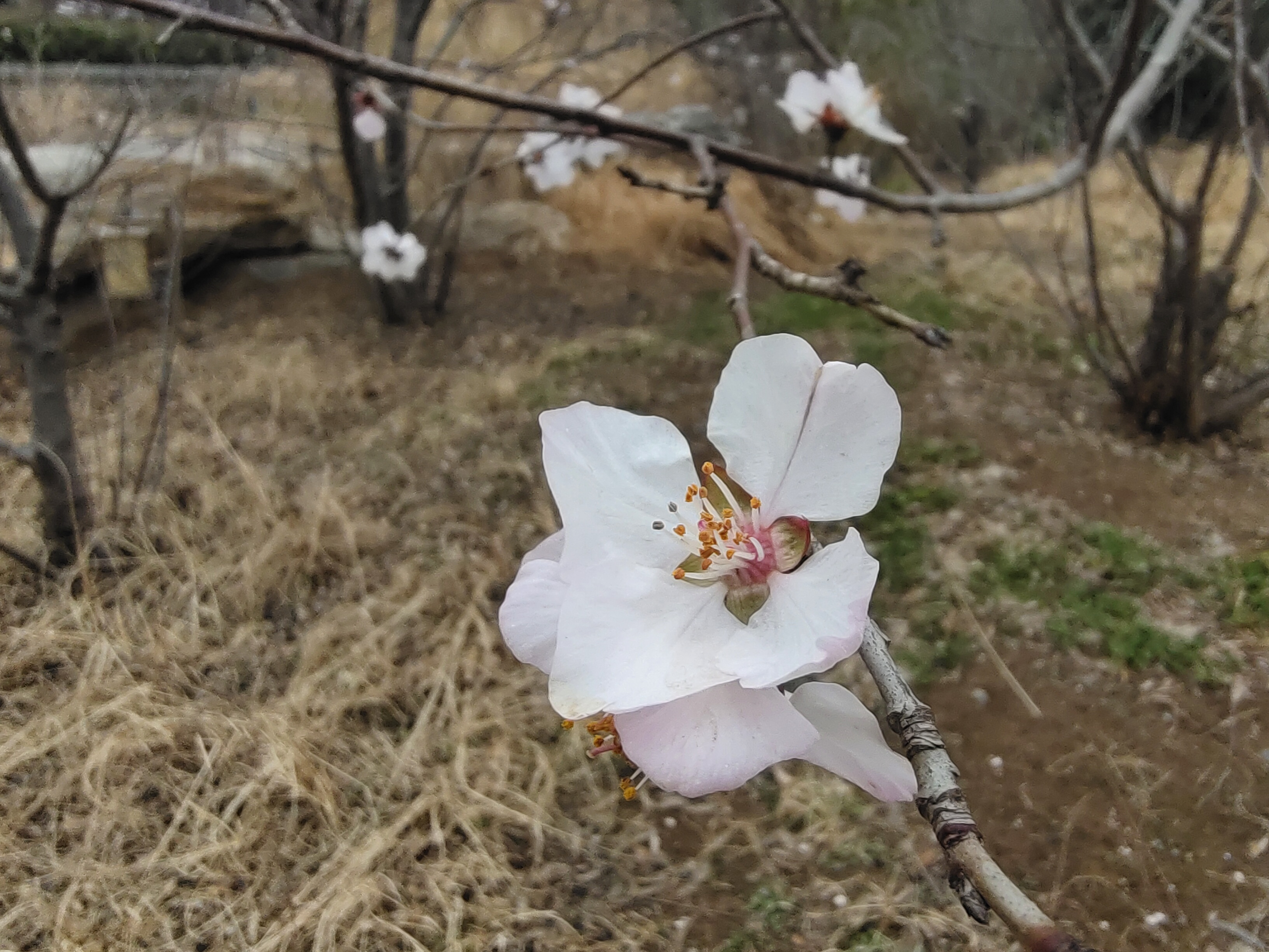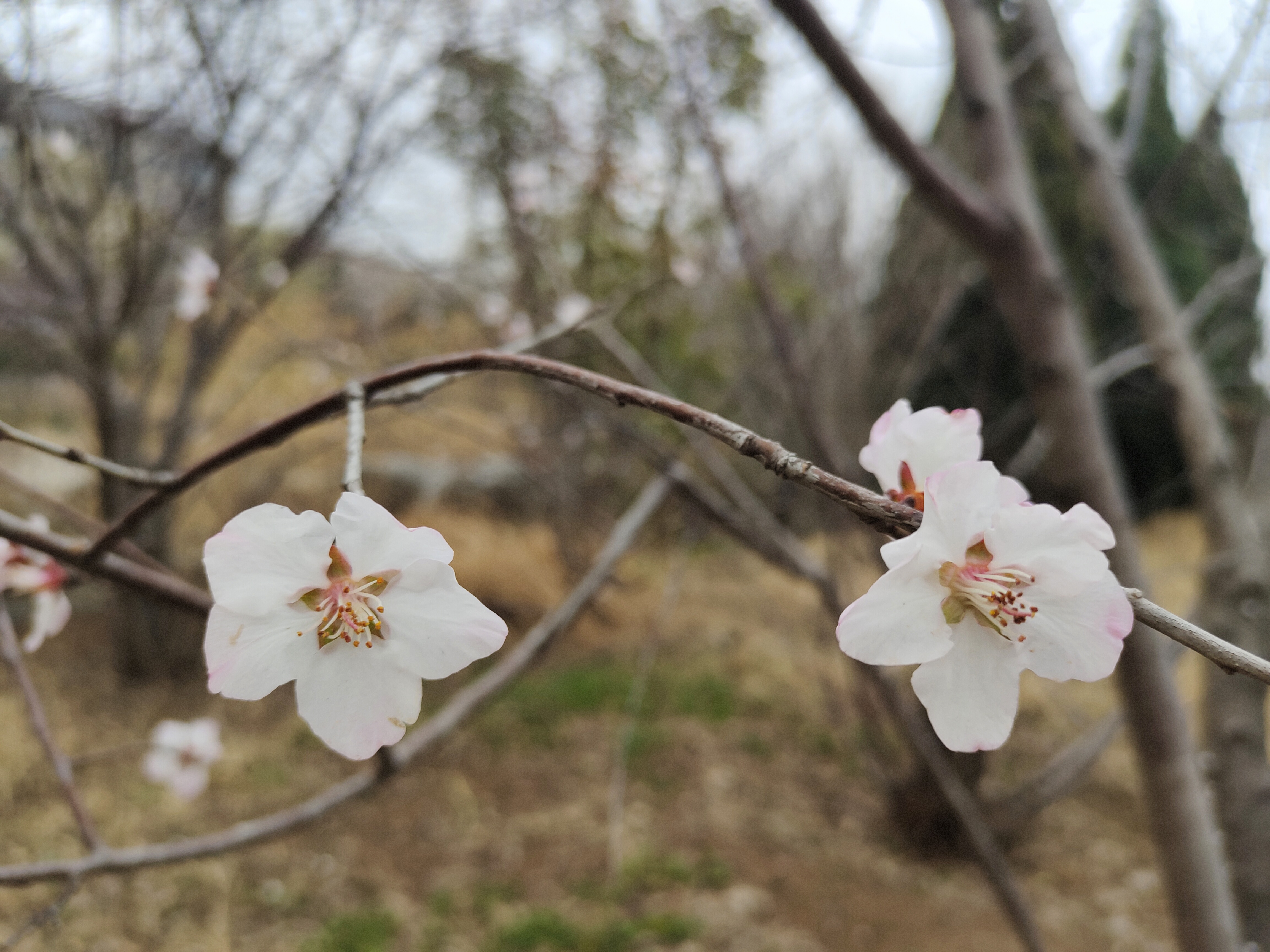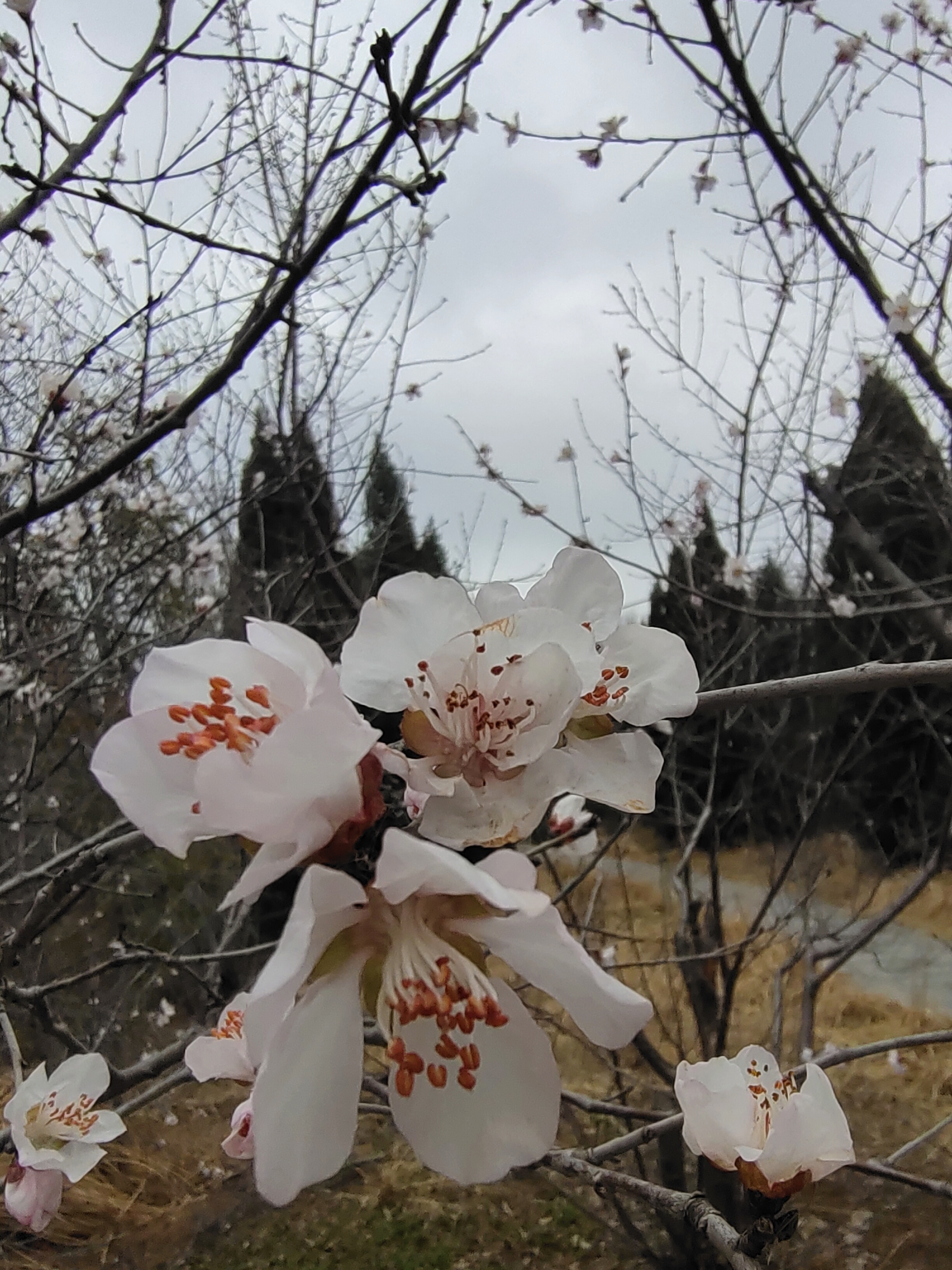 早春桃花开了,粉白花瓣配橙蕊,枯草地上枝头闹,随手一拍都是春日小确幸。