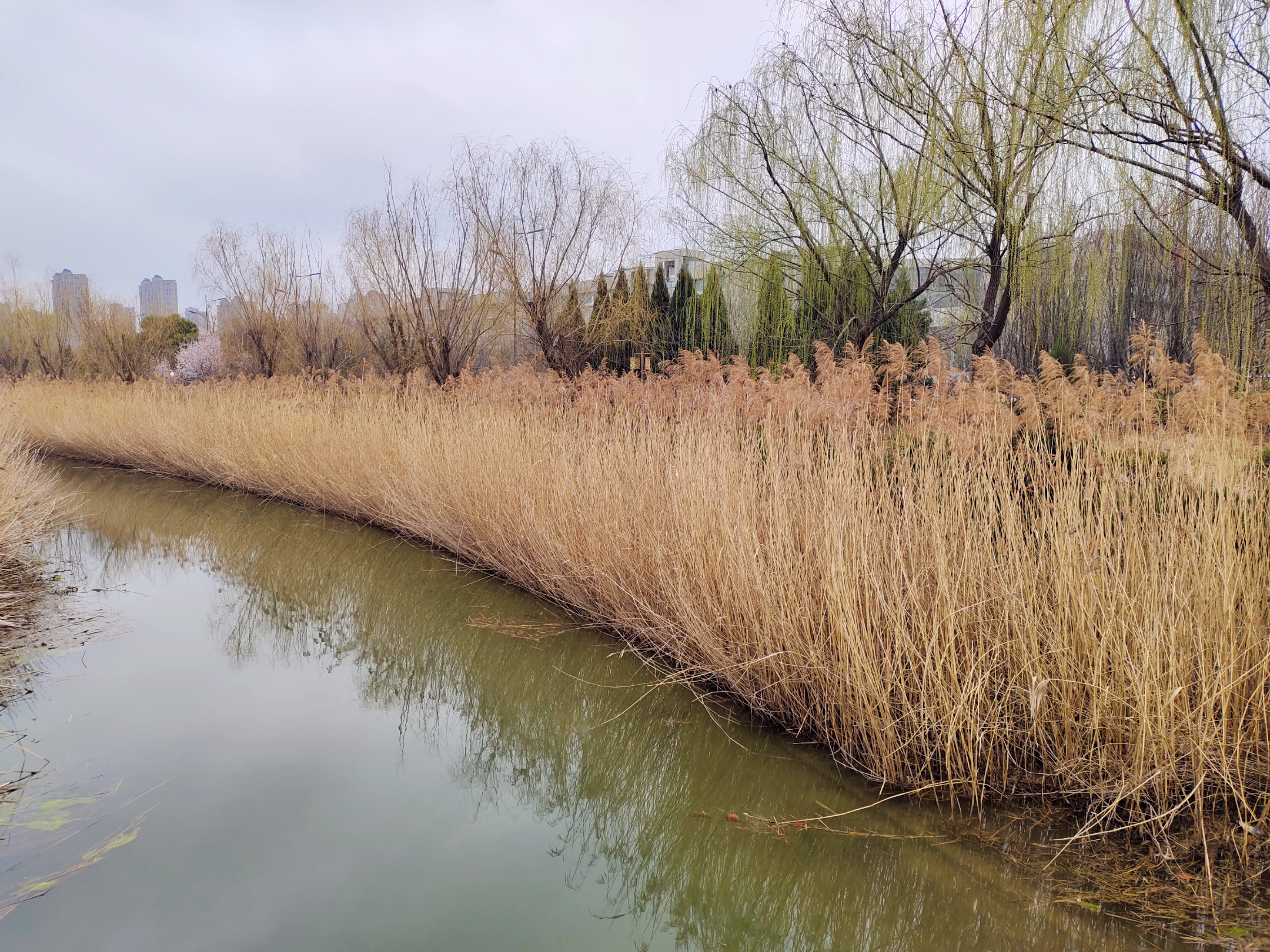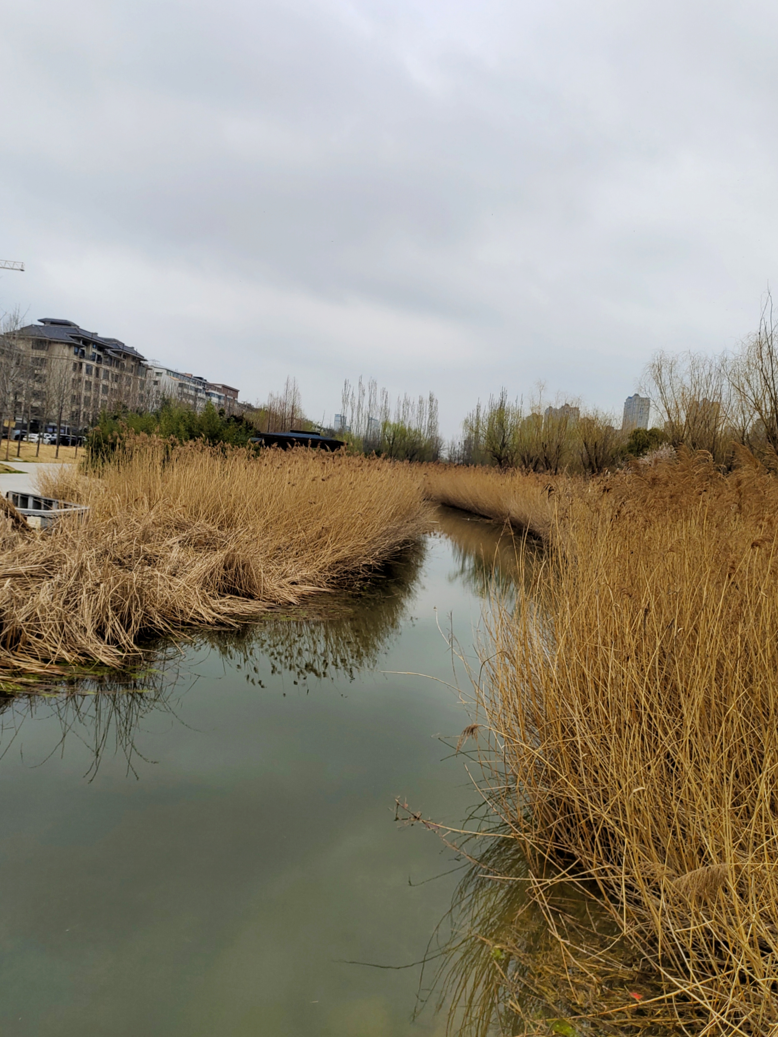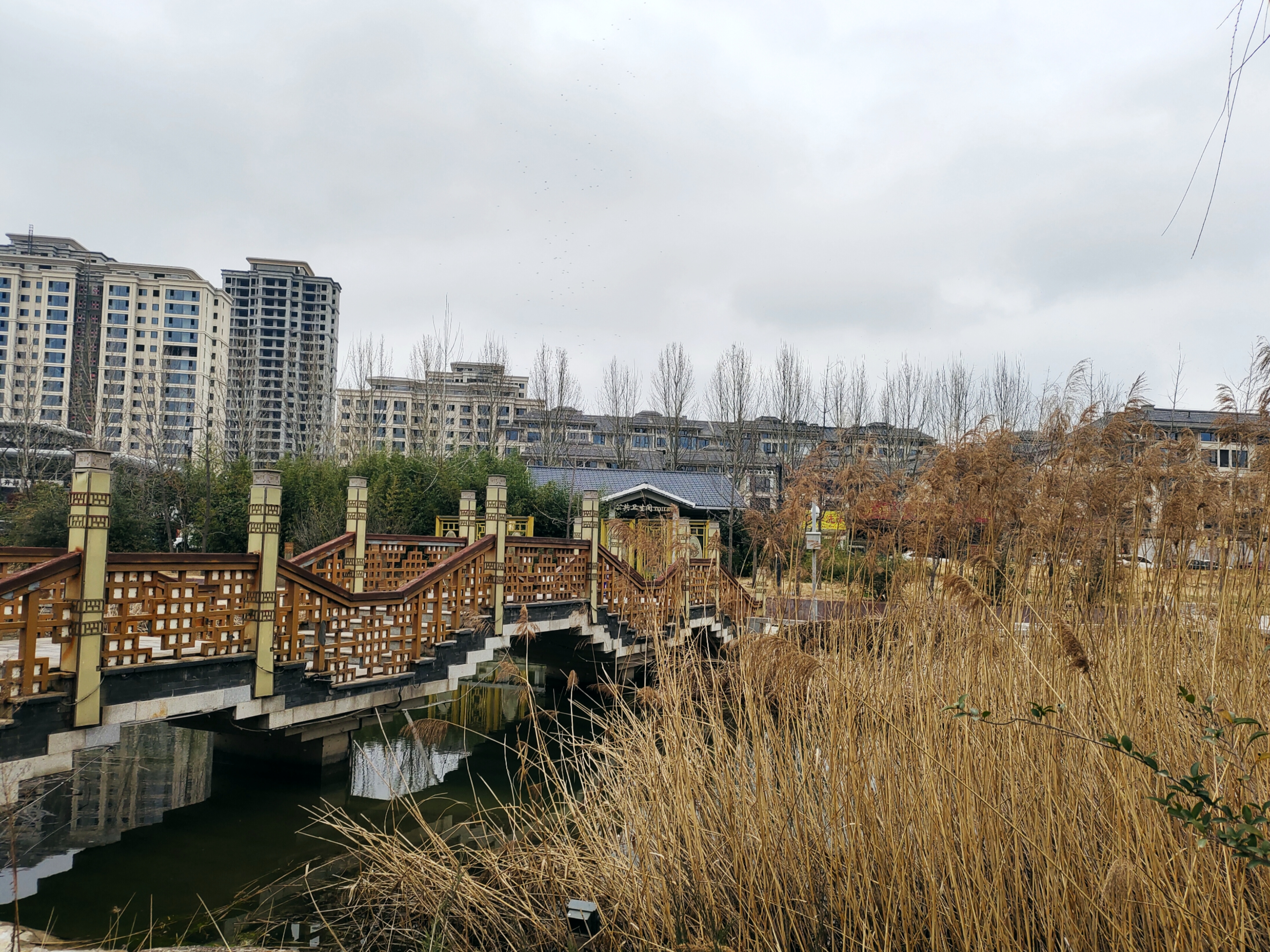 芦苇轻摇,木桥静卧,阴天下的水镜里,城市与野趣悄然相融。