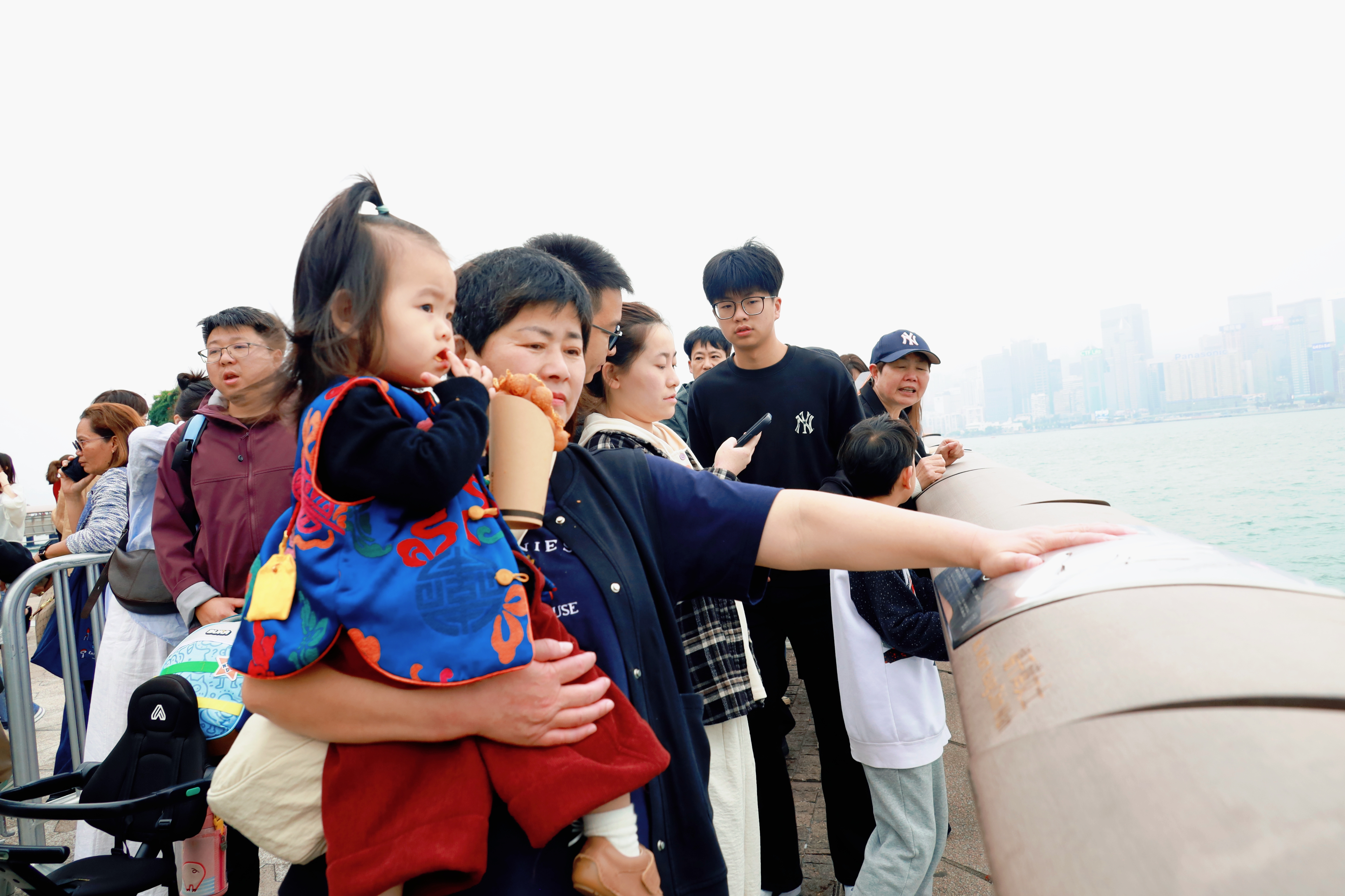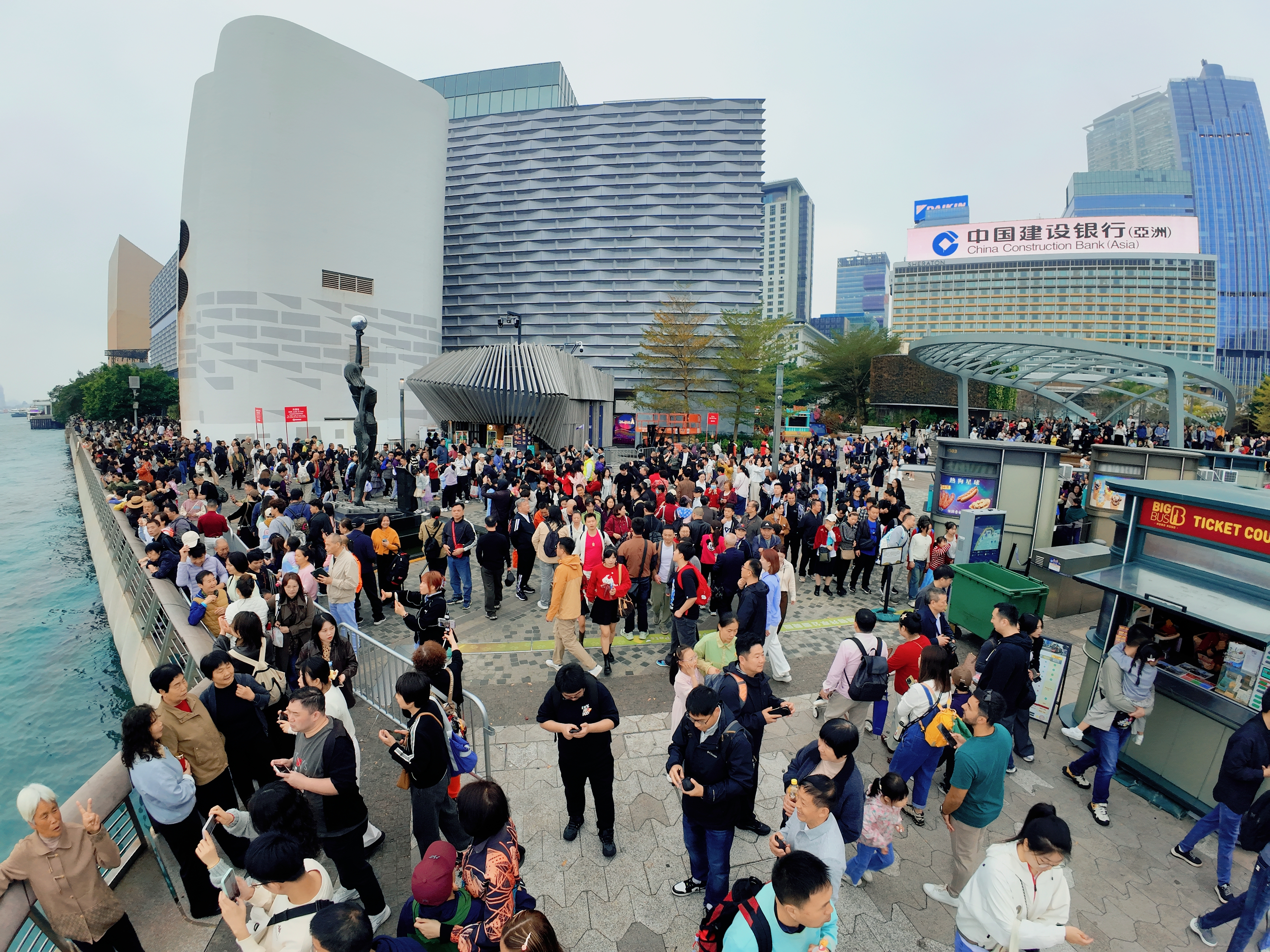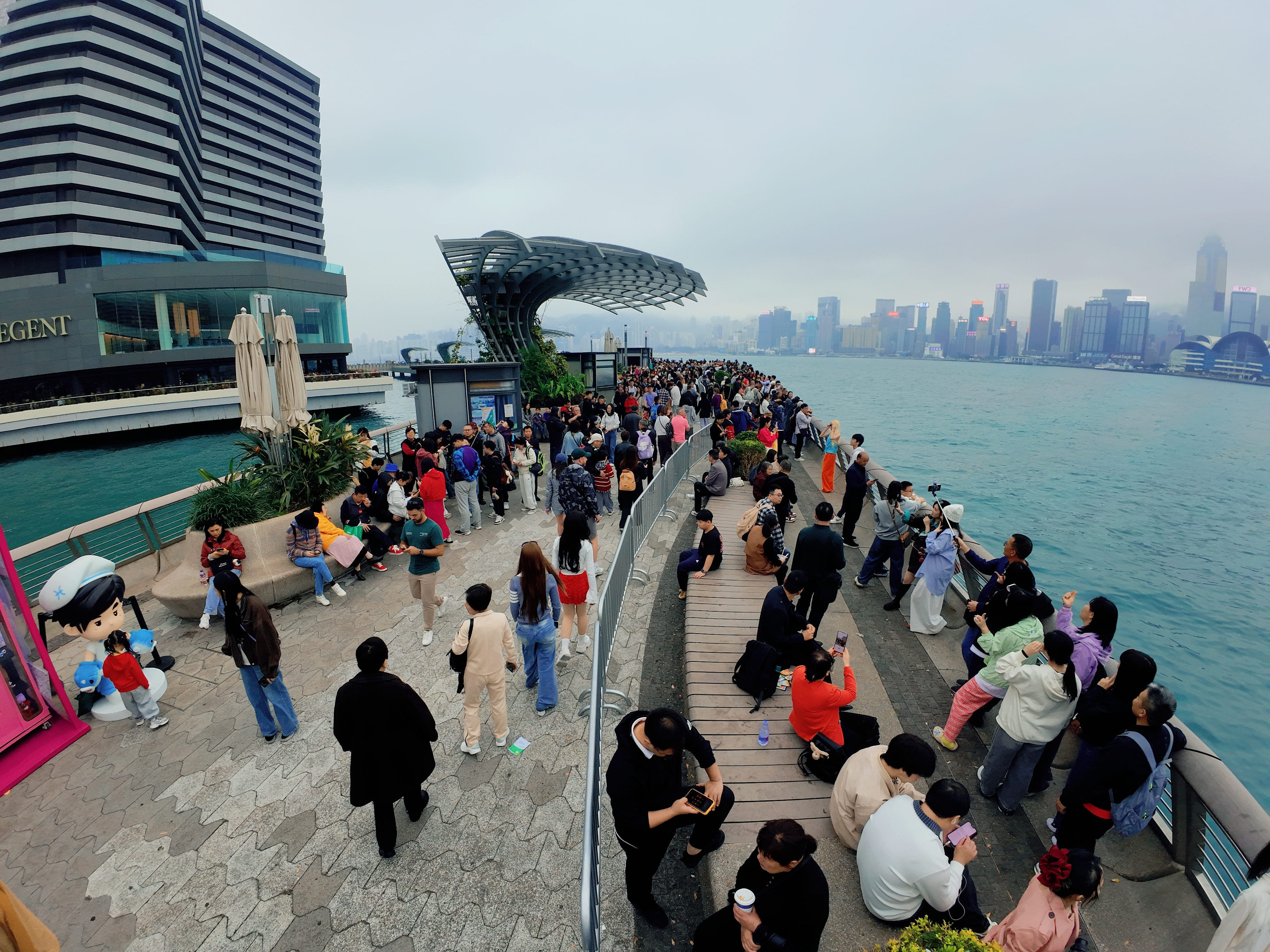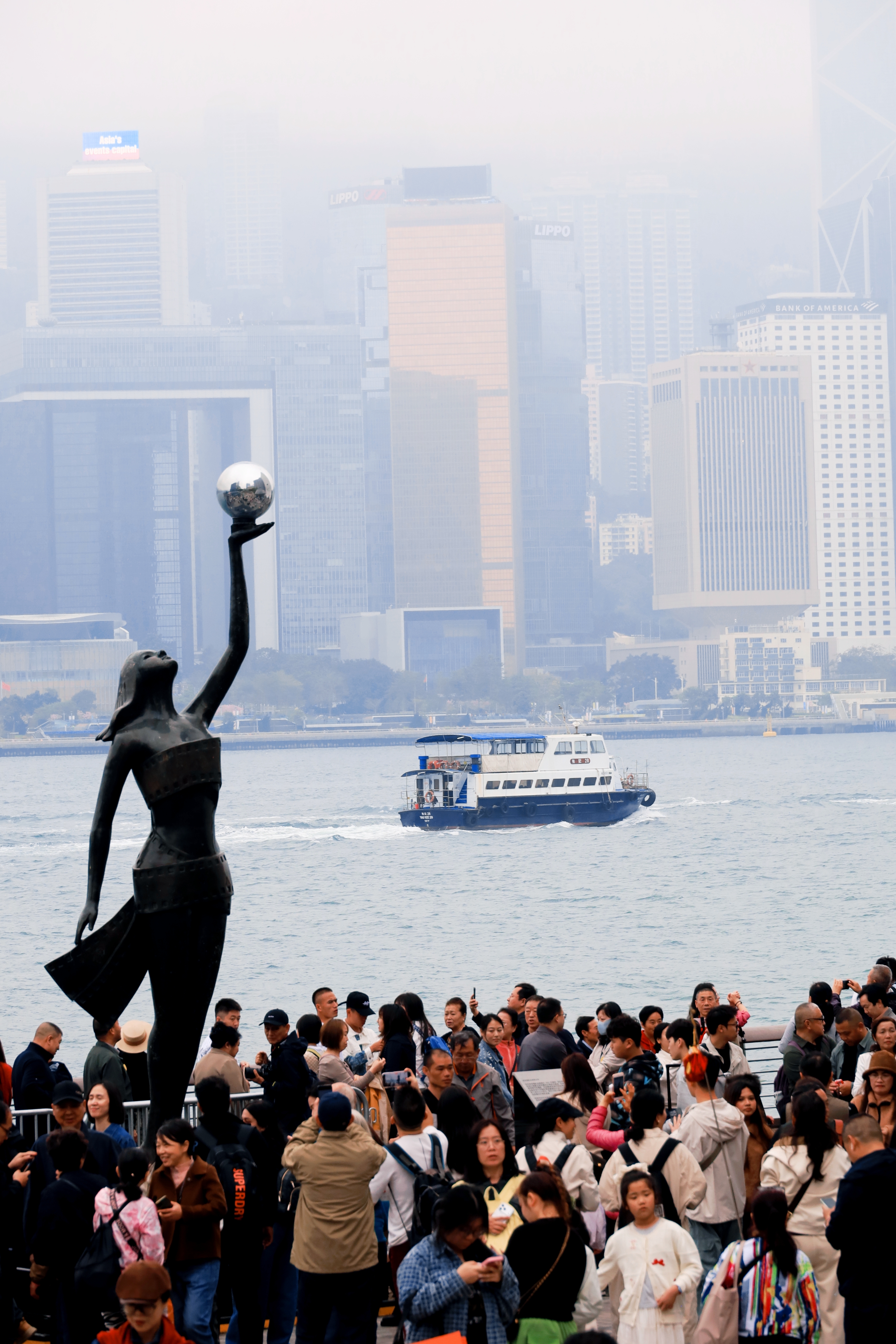 这是香港星光大道的标志性雕塑“星光夫人”,它手持银色球体,背景是维多利亚港的繁华天际线与往来渡轮,现场有不少游客在此驻足游览。