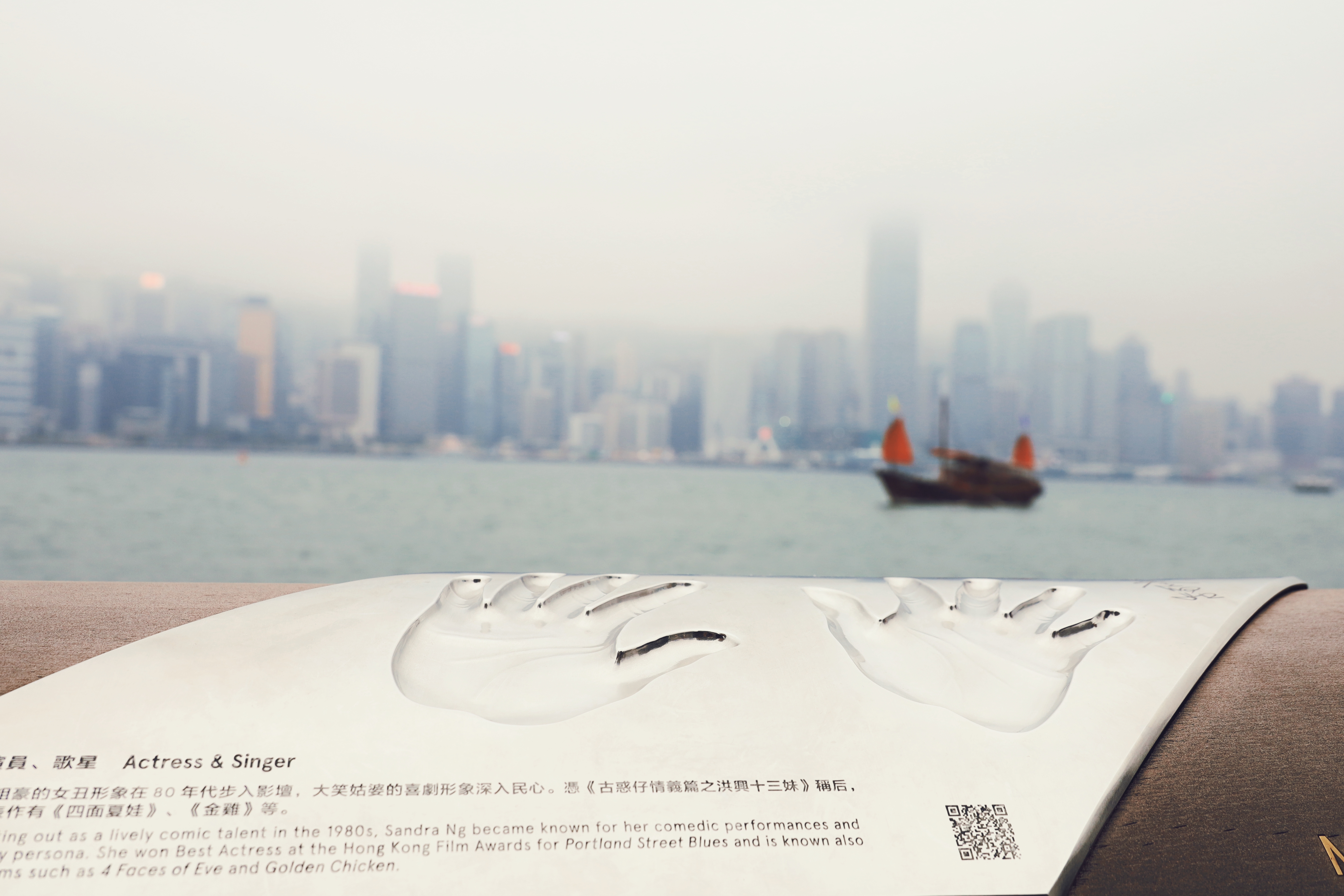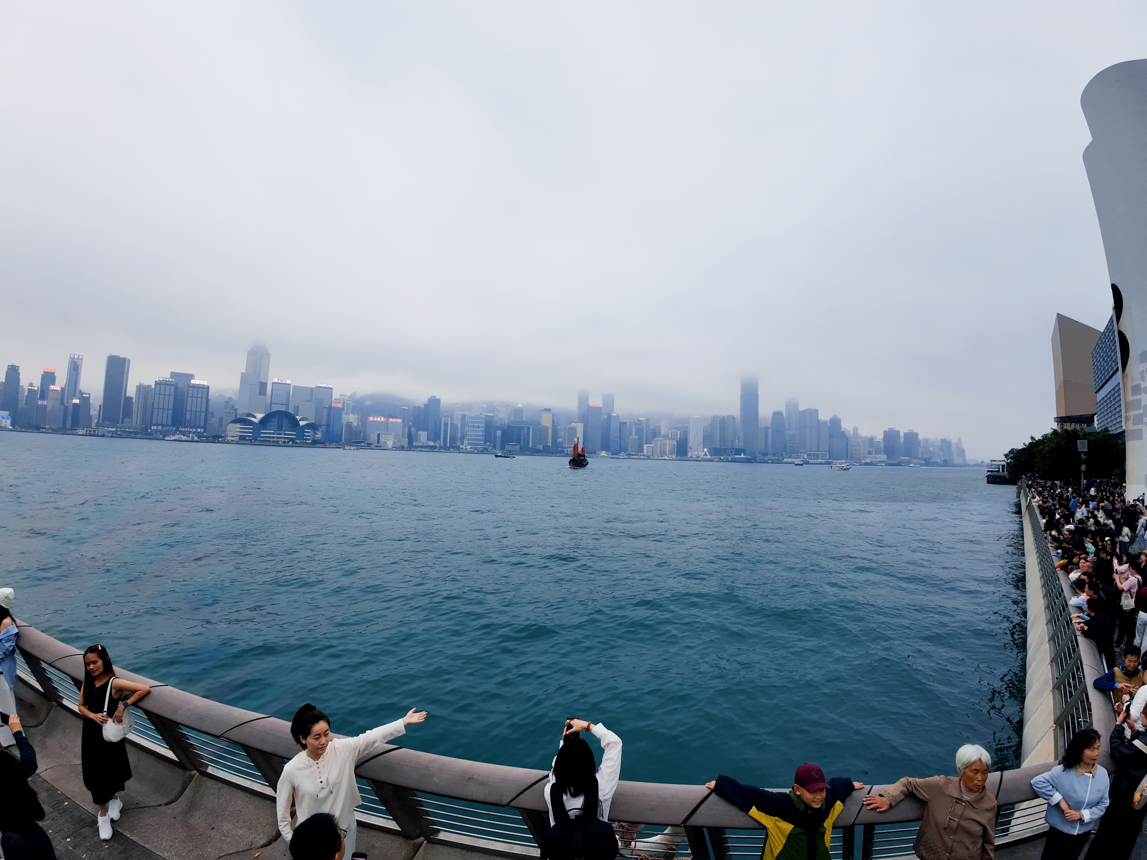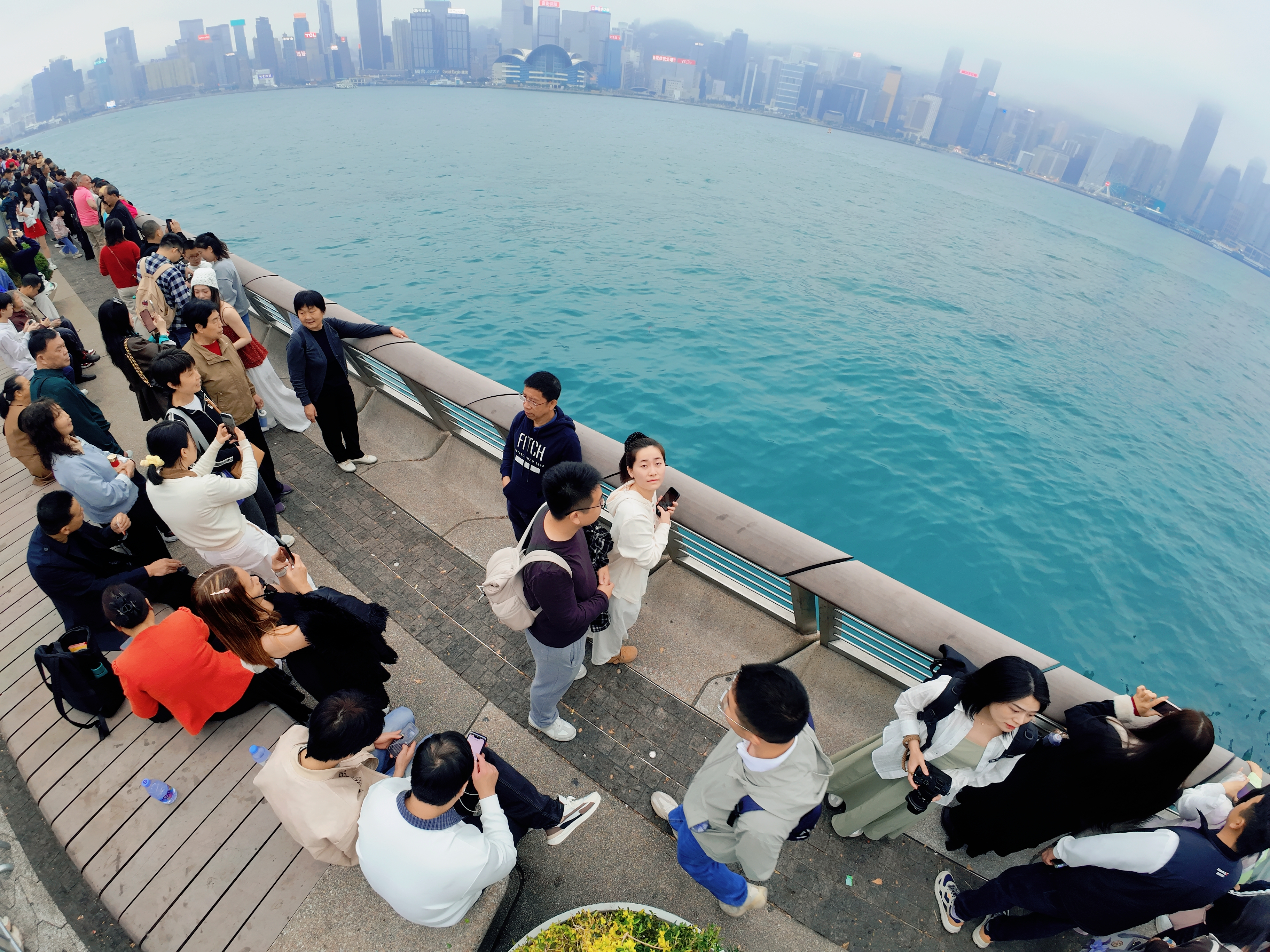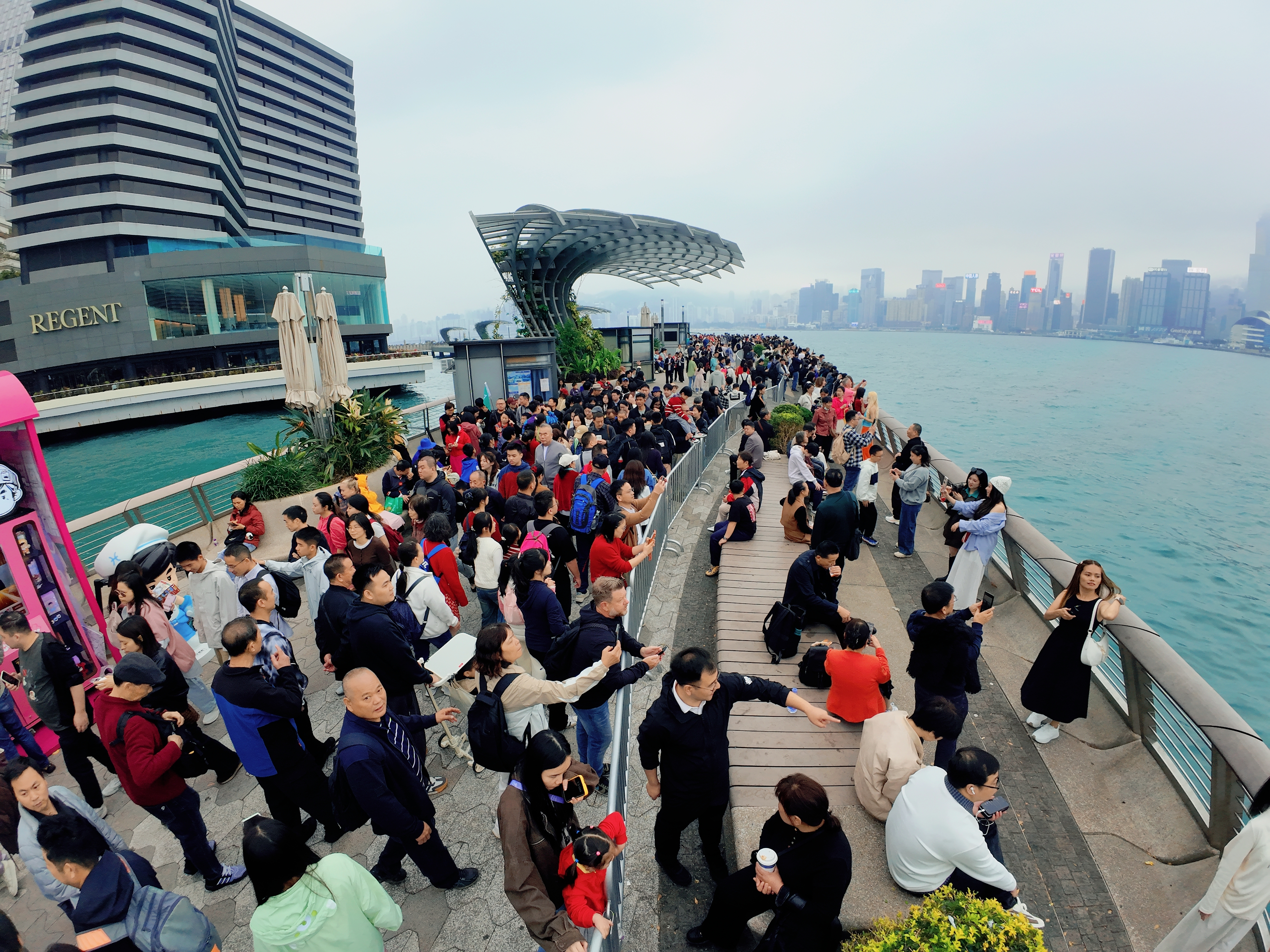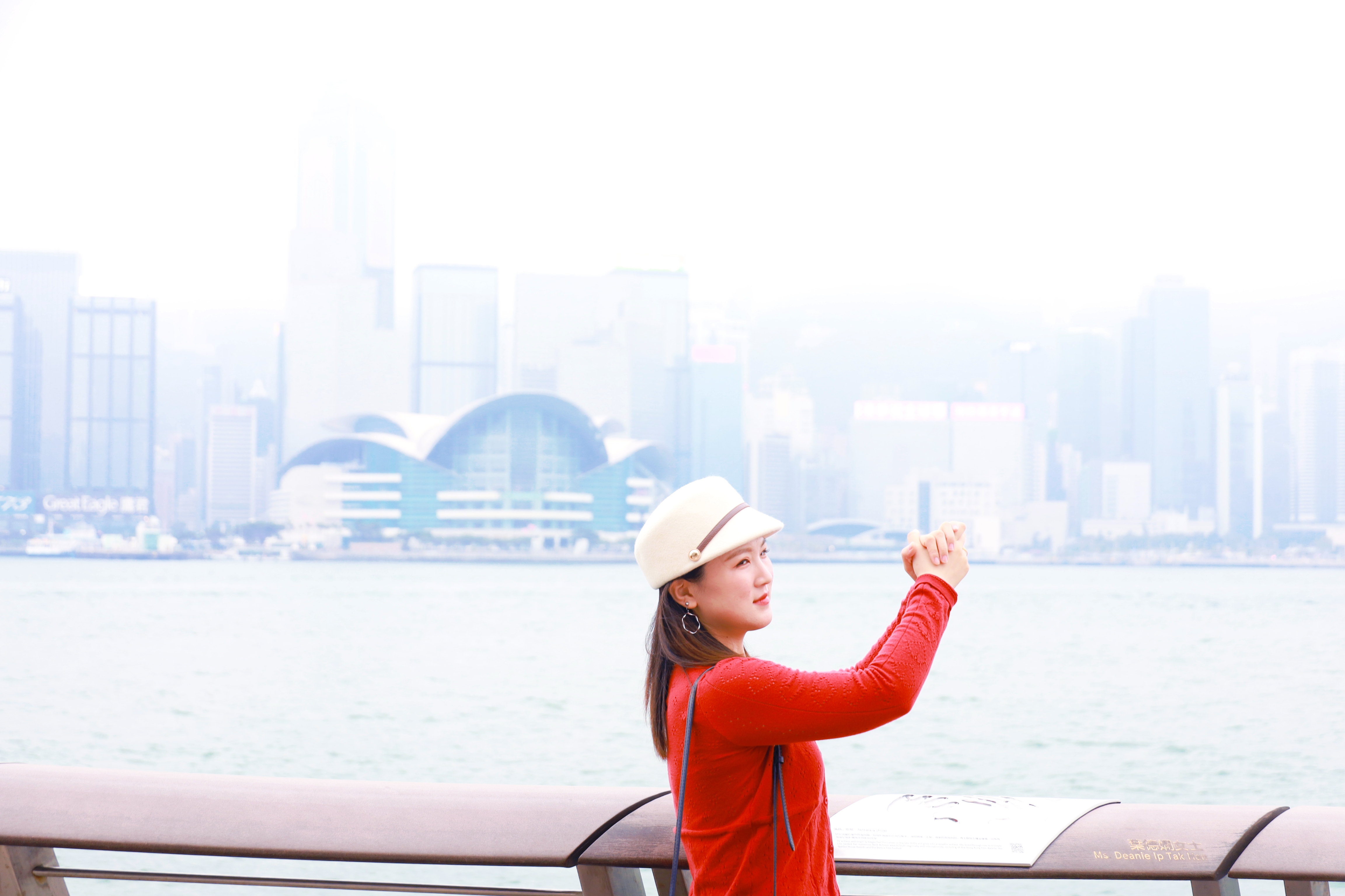 这是香港星光大道的标志性雕塑“星光夫人”,它手持银色球体,背景是维多利亚港的繁华天际线与往来渡轮,现场有不少游客在此驻足游览。