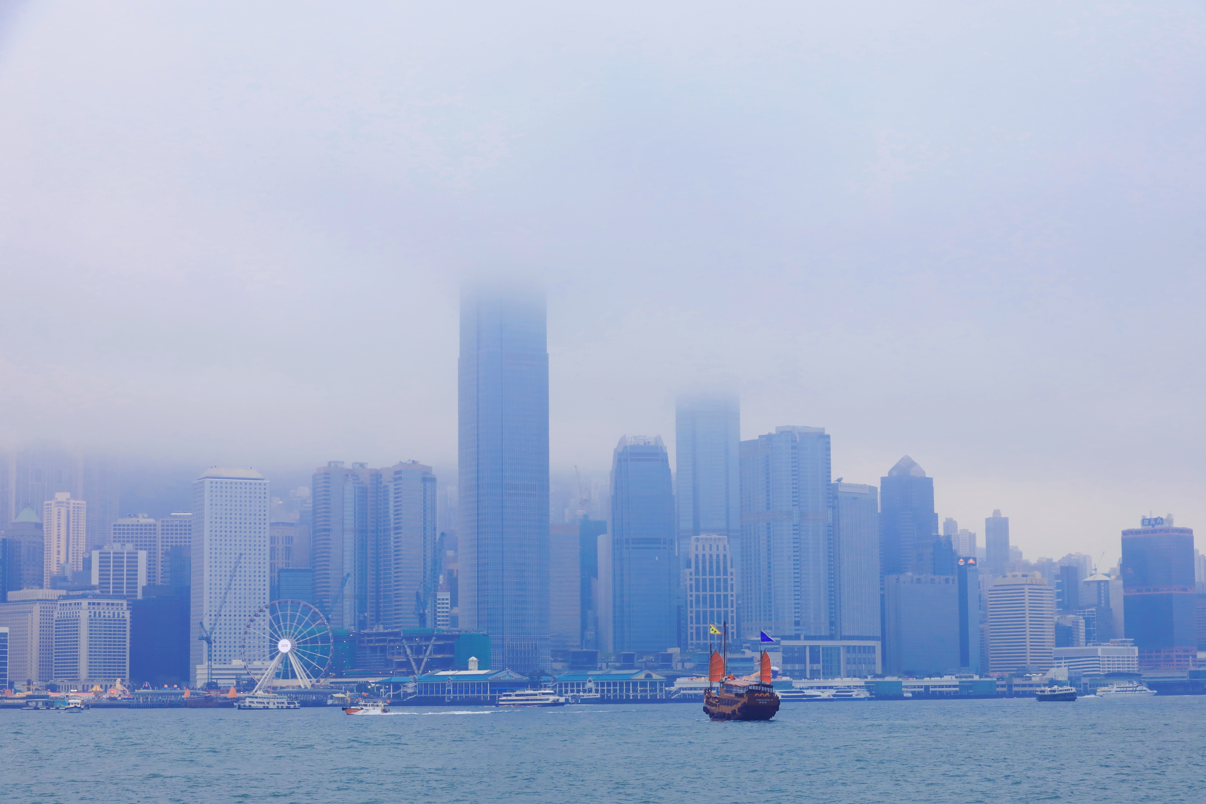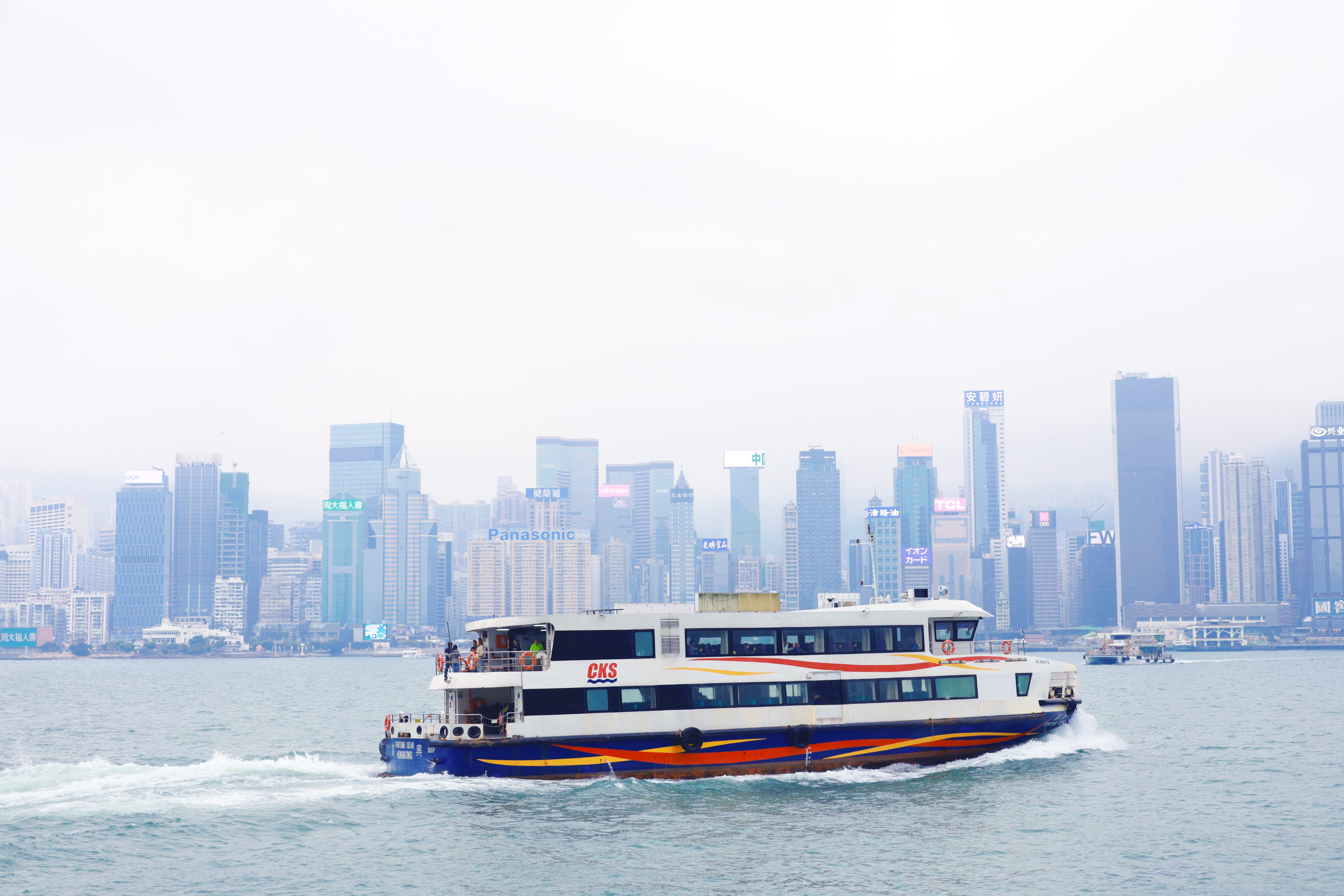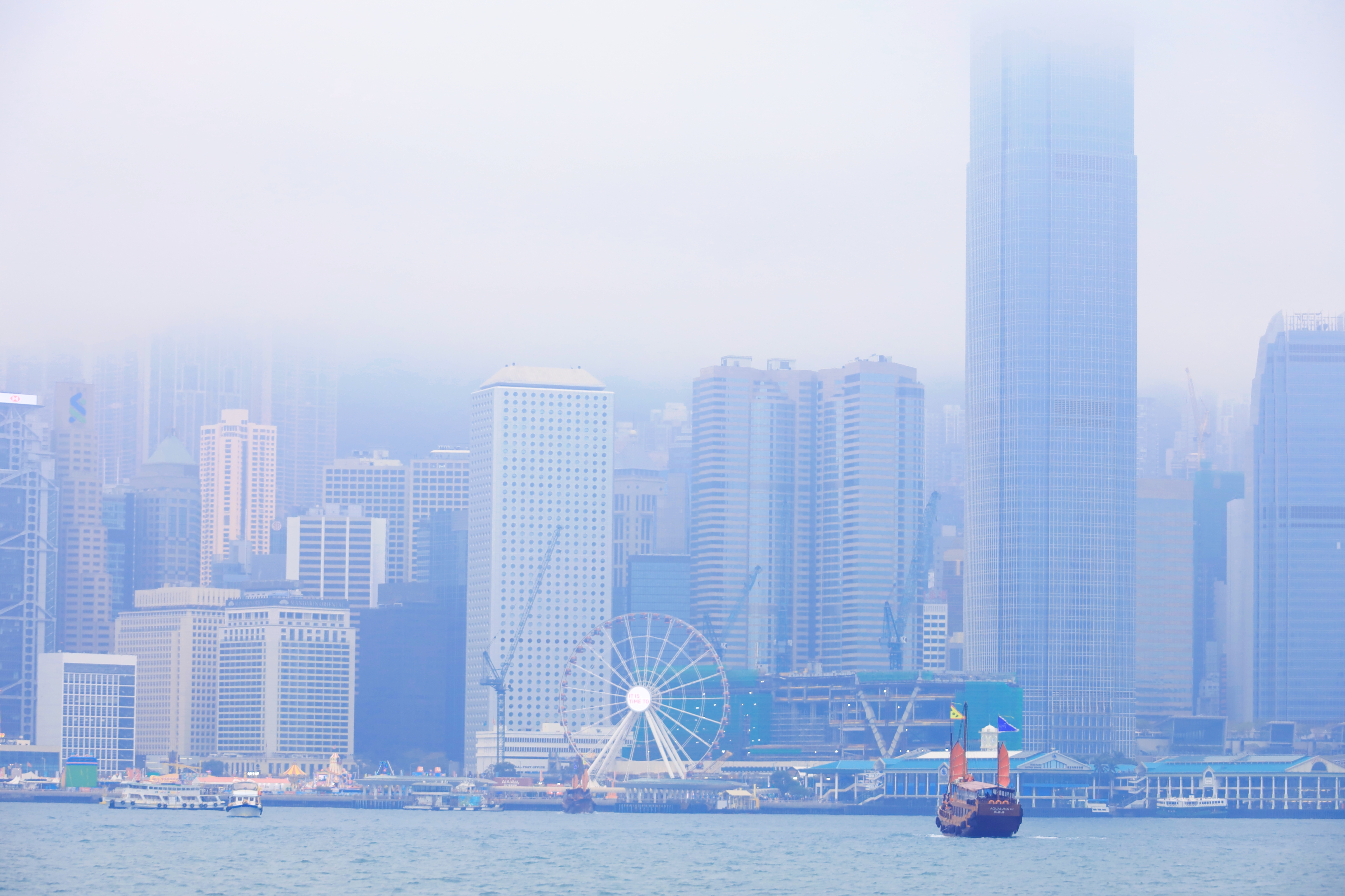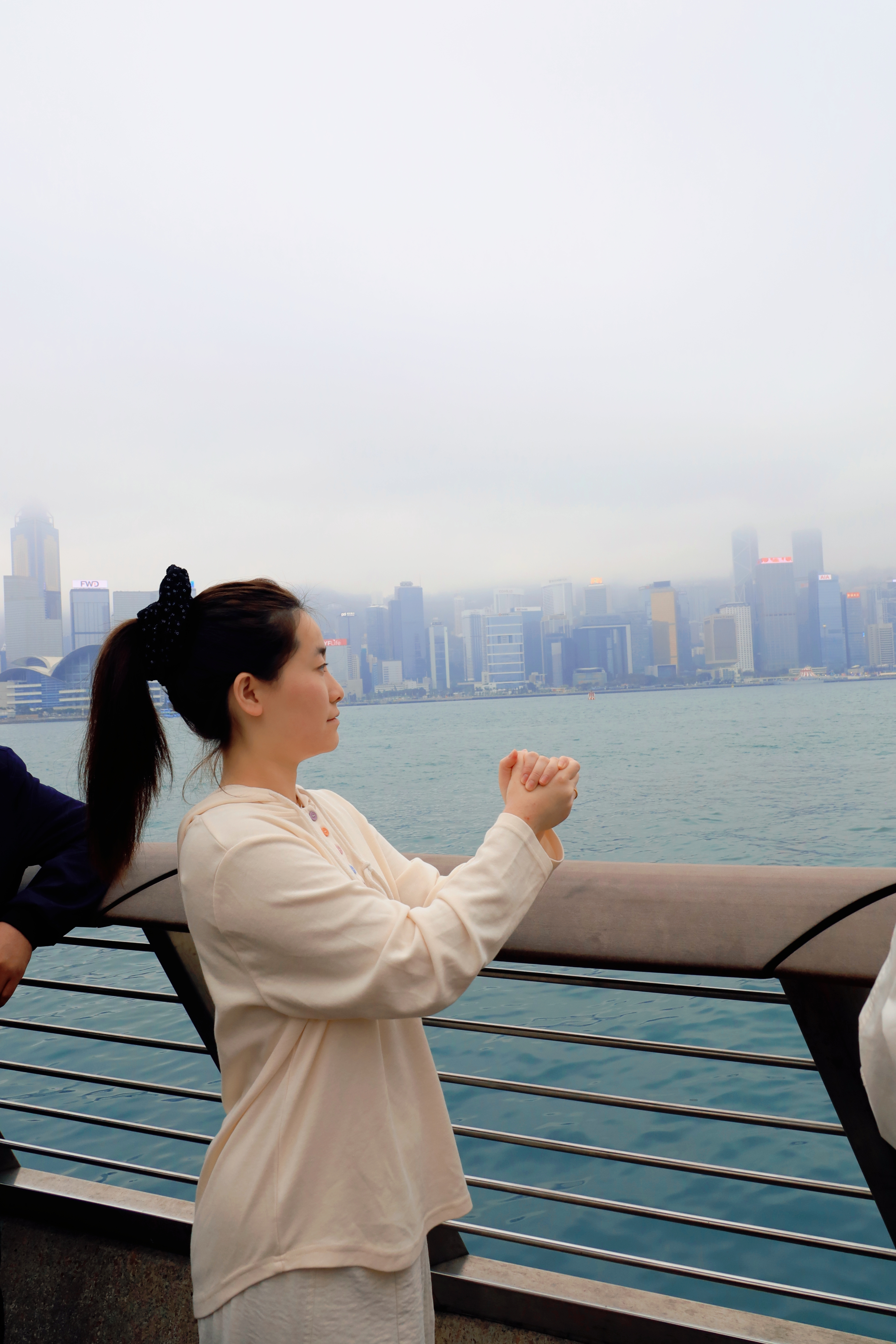 这是香港星光大道的标志性雕塑“星光夫人”,它手持银色球体,背景是维多利亚港的繁华天际线与往来渡轮,现场有不少游客在此驻足游览。