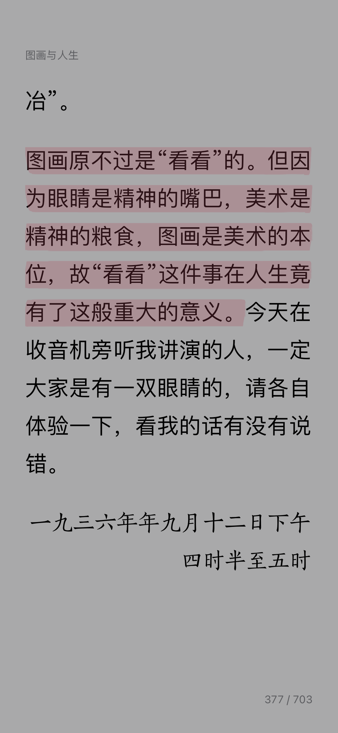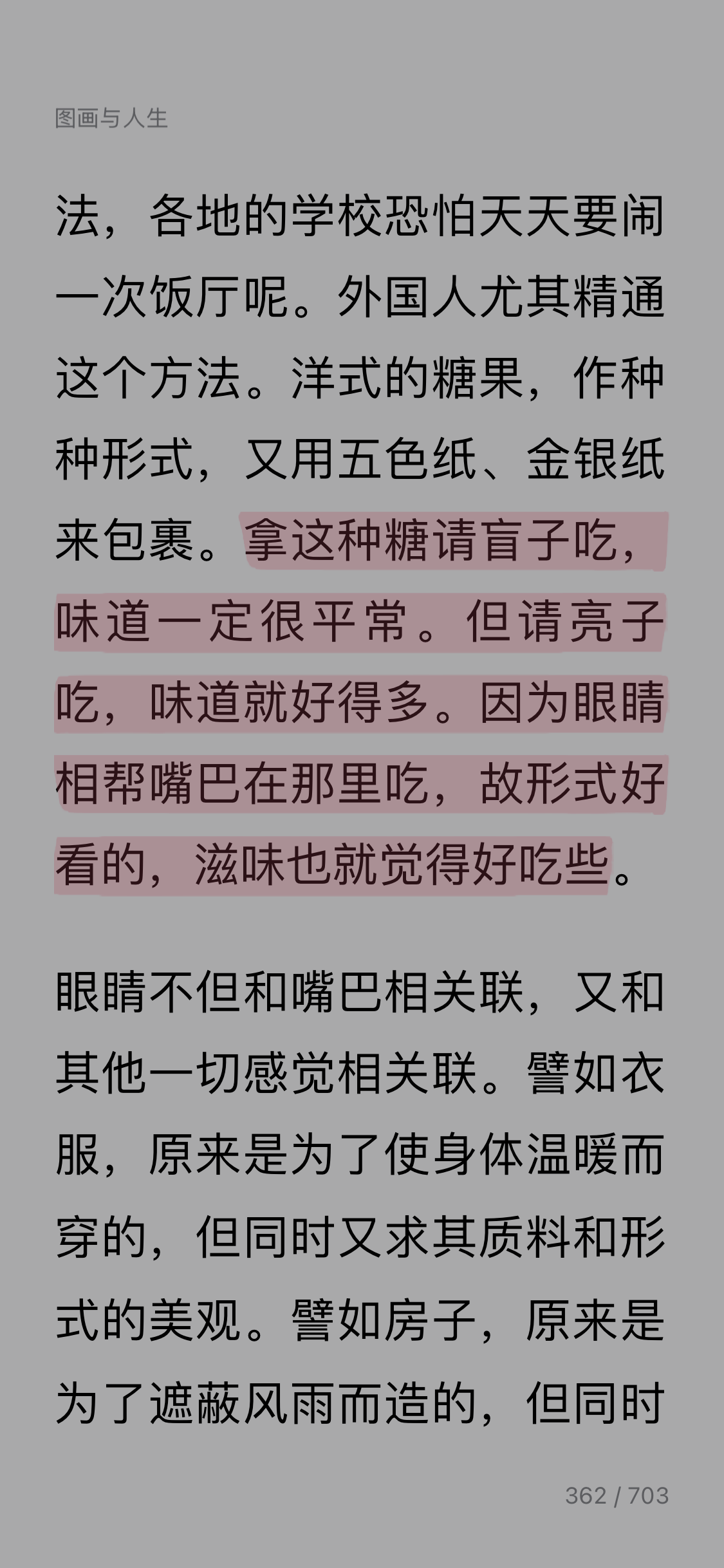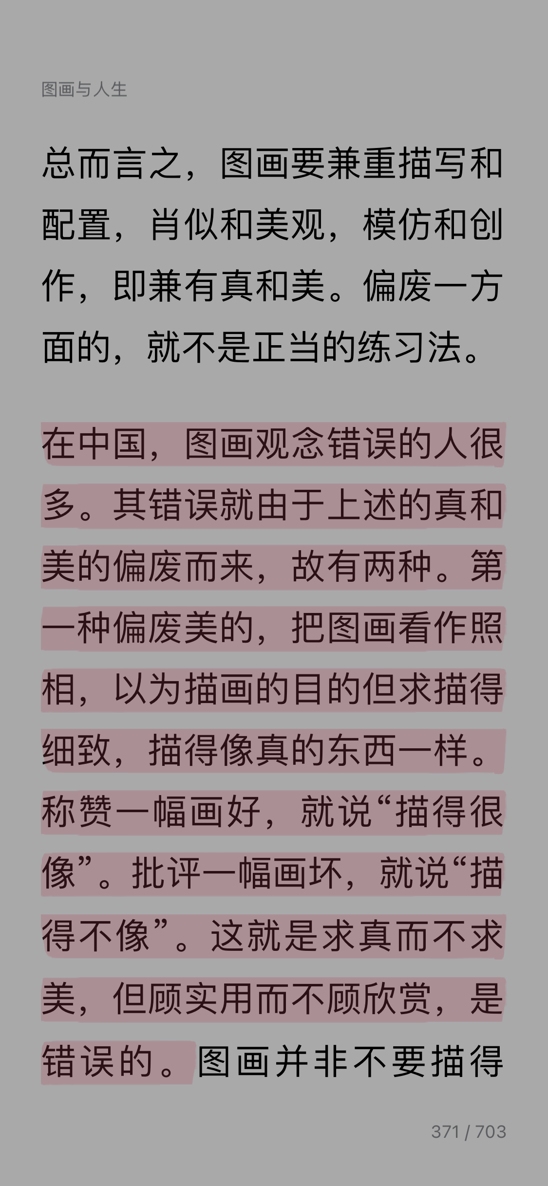 Day17: 今天看丰子恺的《缘缘堂随笔精选》之《图画与人生》。 这篇文章应该是丰老讲课的内容,真的是深入浅出地讲解学习图画对于我们人生的重要性。 丰老很会打比方,他从用嘴吃和用眼睛看的关系铺陈讲到吃是满足生理需求,看是满足精神需求,要看美的东西,如果菜卖相好看,吃起来更香,由此延展到用眼睛看不光和嘴巴有关系和所有感官都有关系。从隐喻回到本体,美术就是精神的食粮。美术按形式、用途又可分为四类,而图画既是平面美术又是欣赏美术,它是美术的本位,我们要有美术的修养,只要练习图画就是。但特别强调了图画练习需要兼顾“真”和“美”,偏废一方都会带来不正确的练习。最后总结点睛,为什么图画对我们而言是这般意义重大。 感觉听了一堂美学教育课,也清晰了图画练习需要注意“真”和“美”的平衡,不要偏废,以前我喜欢求真,也确实会有纳闷,相机有后还需要图画吗?今天看了丰老的讲课稿,醍醐灌顶,以后练习画图也知道需要怎么平衡了。真是受益匪浅。