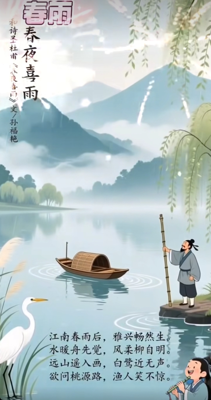 敬和诗圣杜甫《春夜喜雨》 --孙福艳 江南春雨后,雅兴畅然生。 水暖舟先觉,风柔柳自明。 远山遥入画,白鹭近无声。 欲问桃源路,渔人笑不惊。 (随笔)