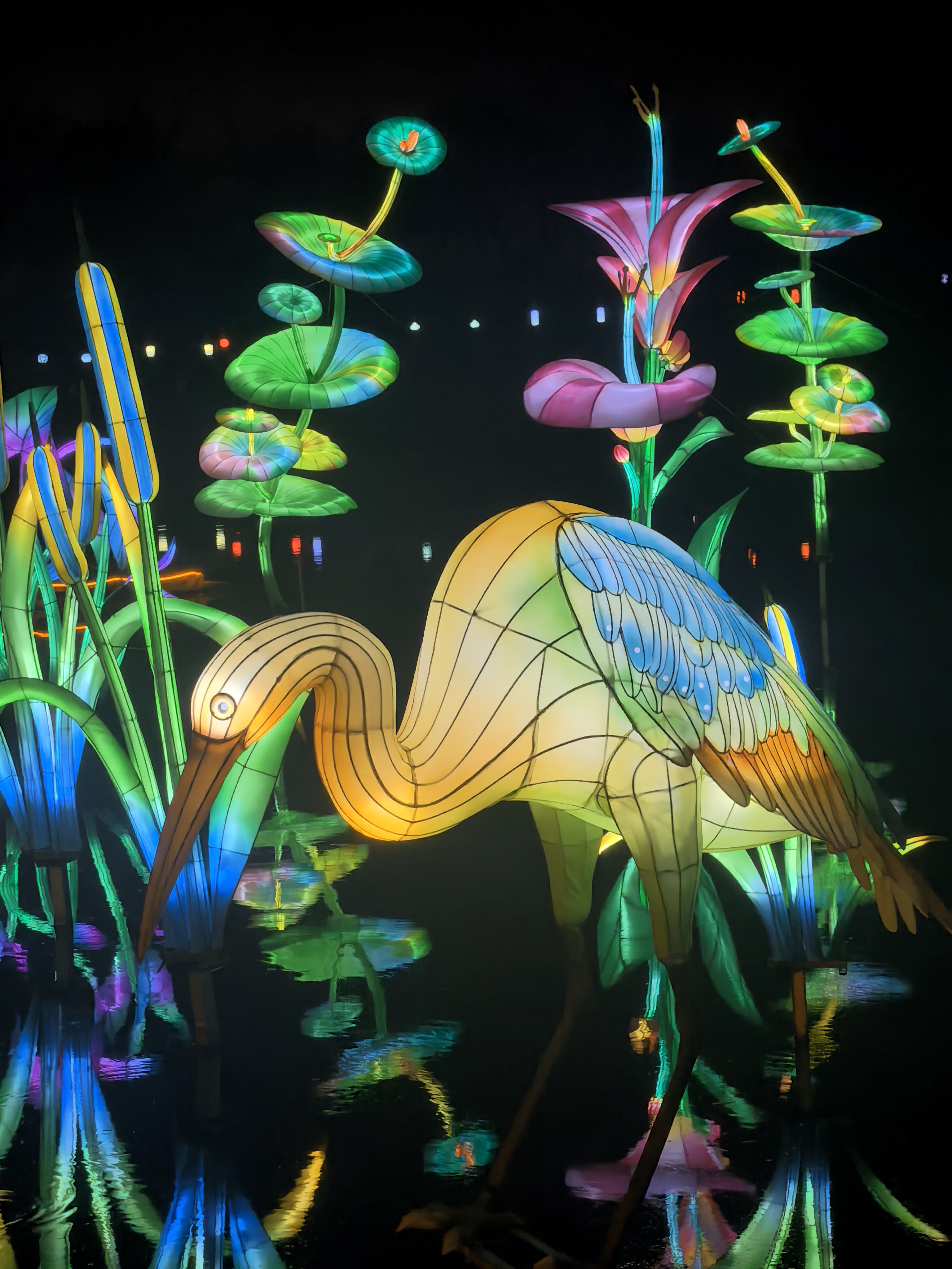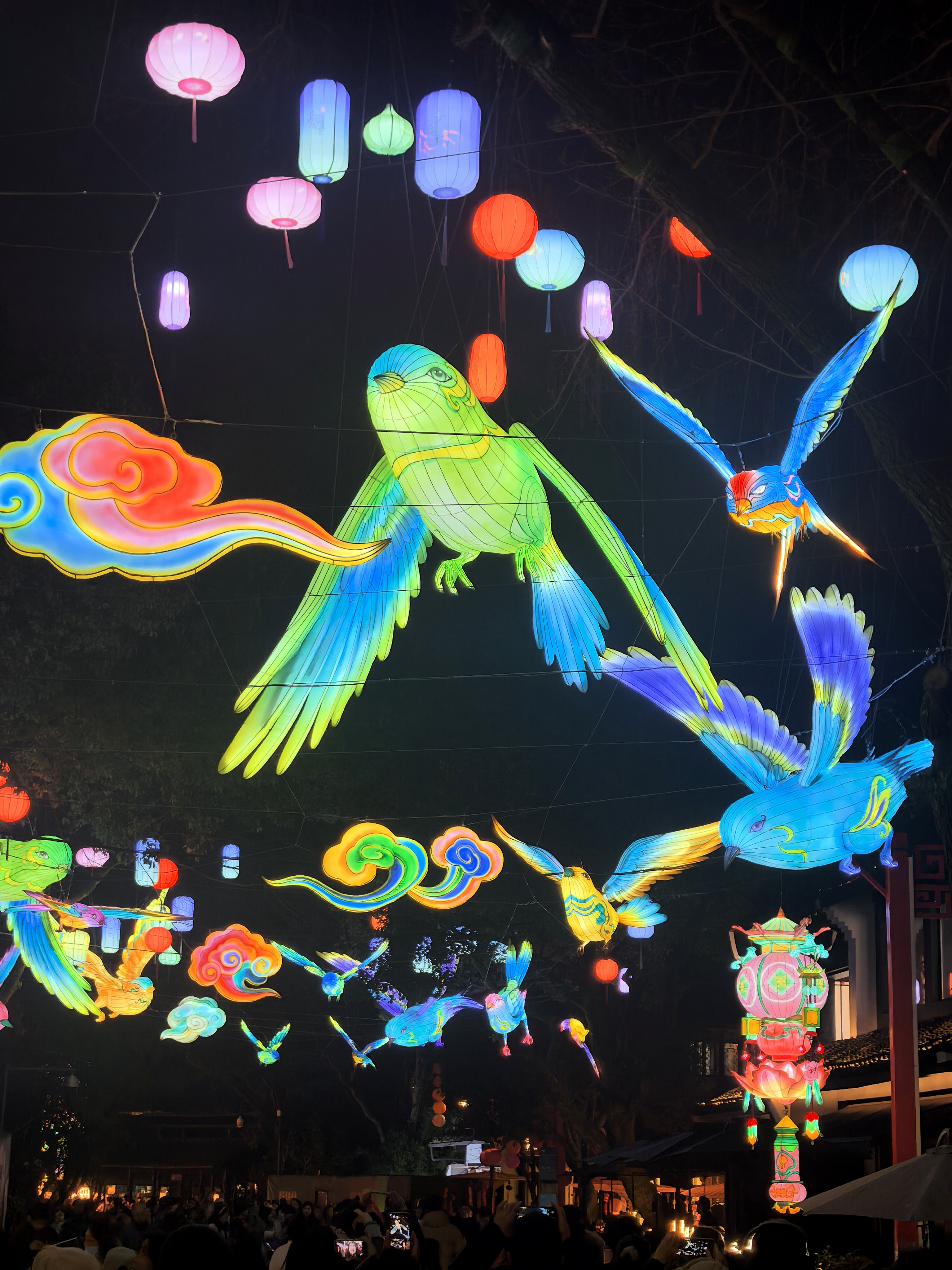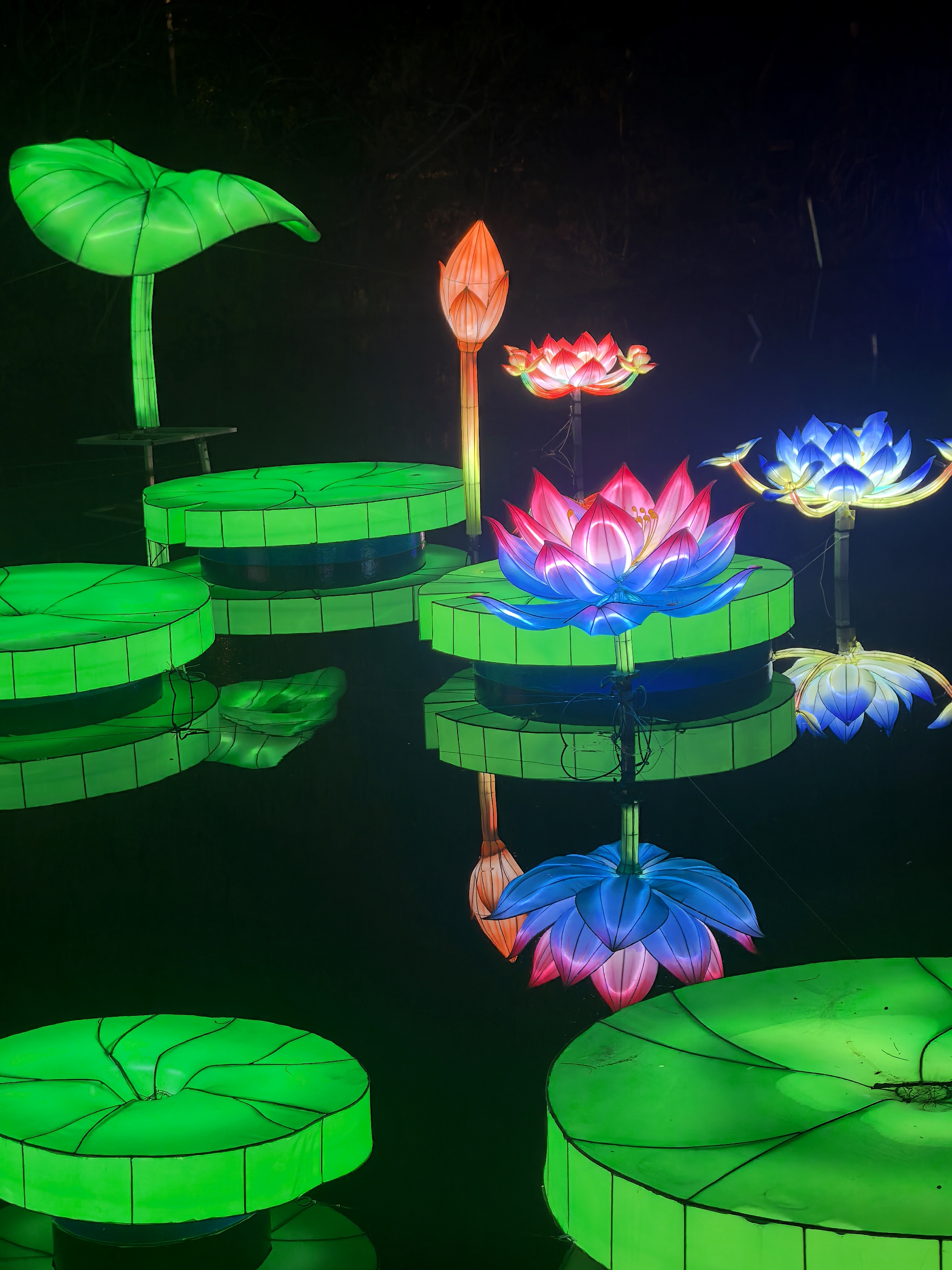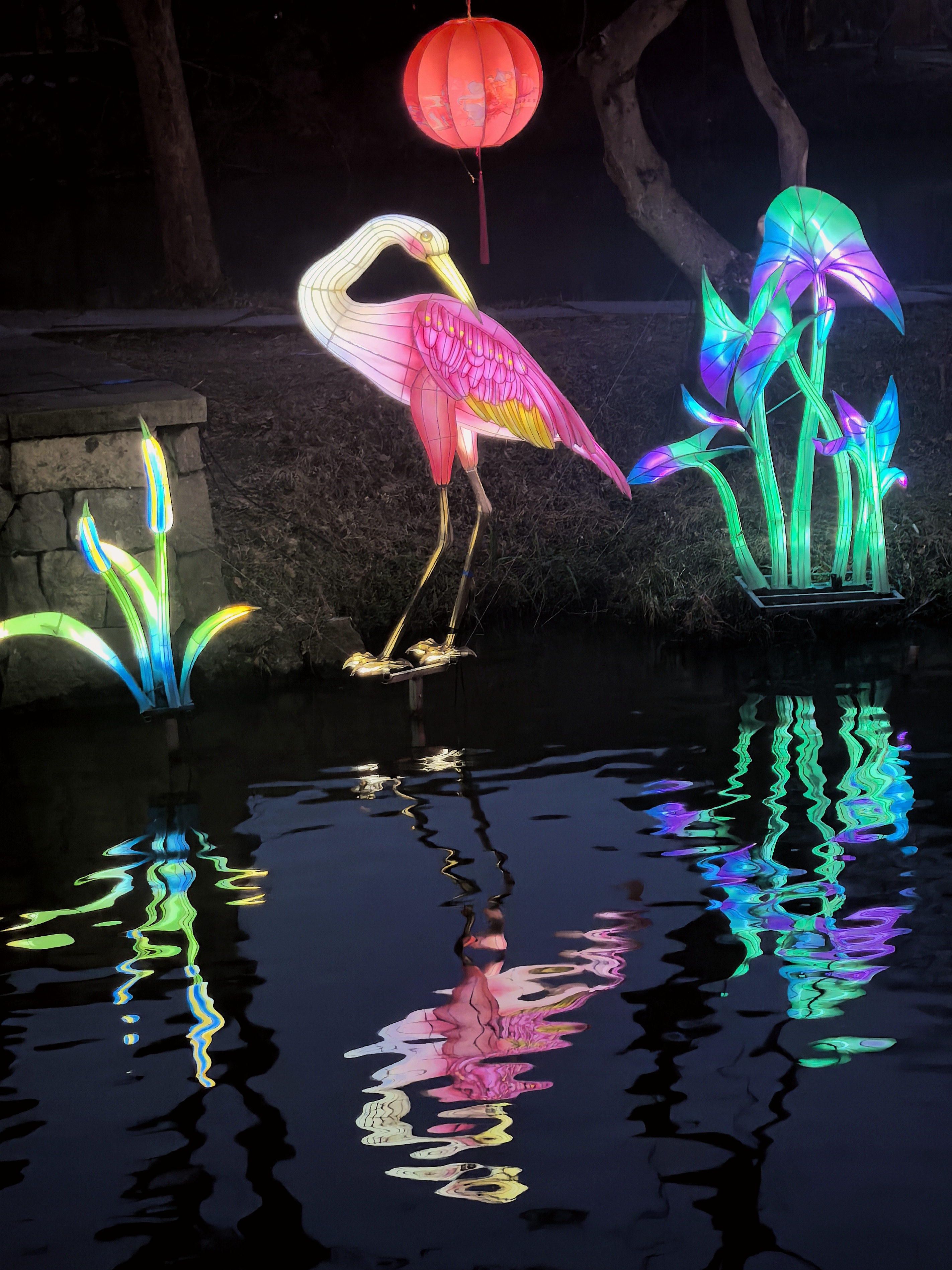 如果说白天的西溪是水墨丹青,那么夜晚的西溪便是流光溢彩的工笔重彩。 赏了西溪梅花后,时间有早,忍不住先粗看了一下。所以,从下午开始到晚上,实际上我观了两遍,犹似既看到素颜淡妆的平常模样,也看到浓妆艳抹惊艳四座的场上名伶。 匠心独运的布景,将灯火与水影玩出了极致的浪漫。看那水面上,巨大的莲花灯静静绽放,粉红的花瓣在绿叶的衬托下娇艳欲滴,倒映在水中,仿佛水底也藏着一个斑斓的世界。一只只仙鹤灯组立于水中,姿态优雅,羽毛的纹理在灯光的勾勒下清晰可见。 光影与水波的互动,微风拂过,水波荡漾,灯影也随之摇曳生姿,虚实难辨,如梦似幻。岸边的树木也被彩灯装点,红的、黄的、蓝的、绿的,五彩斑斓,与水中倒影交相辉映,构成了一幅幅梦幻的画卷。 这不仅仅是灯的展示,更是光与影、水与火的艺术交响,让人沉醉其中,流连忘返。