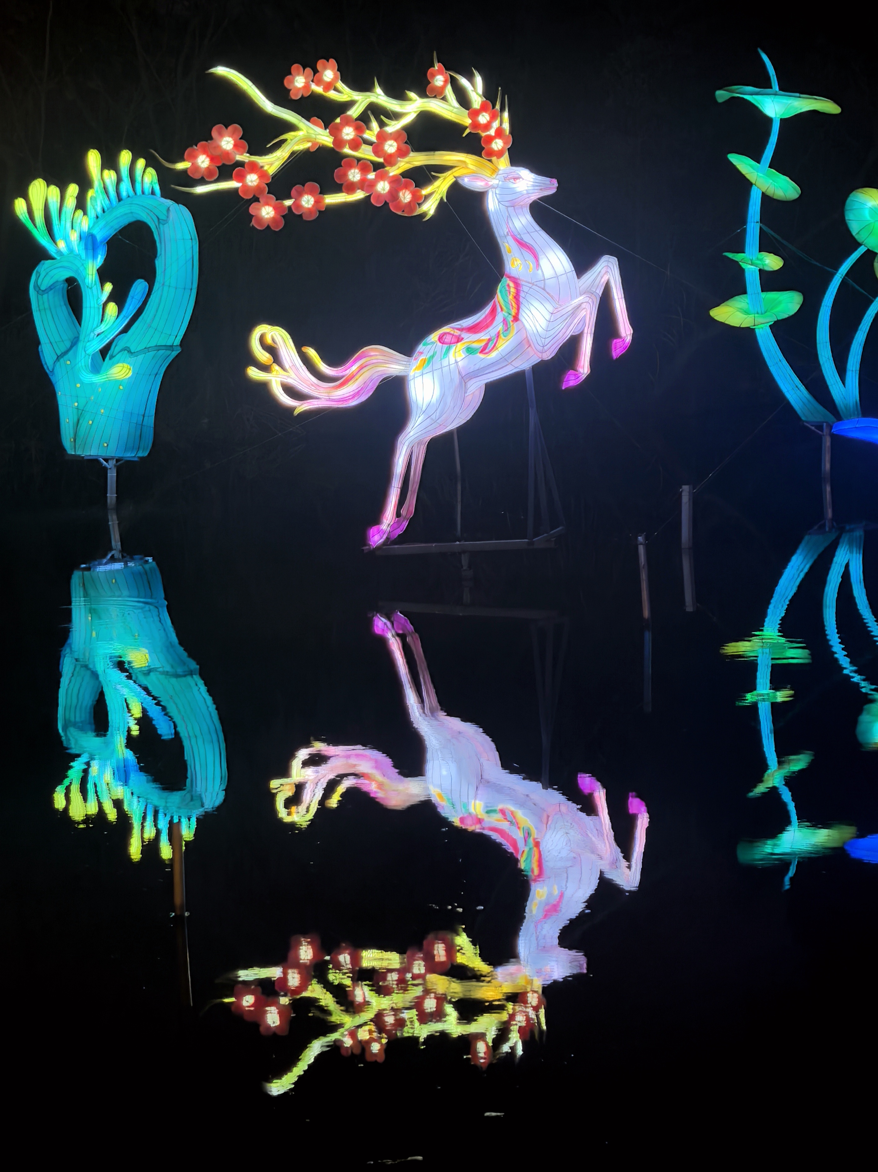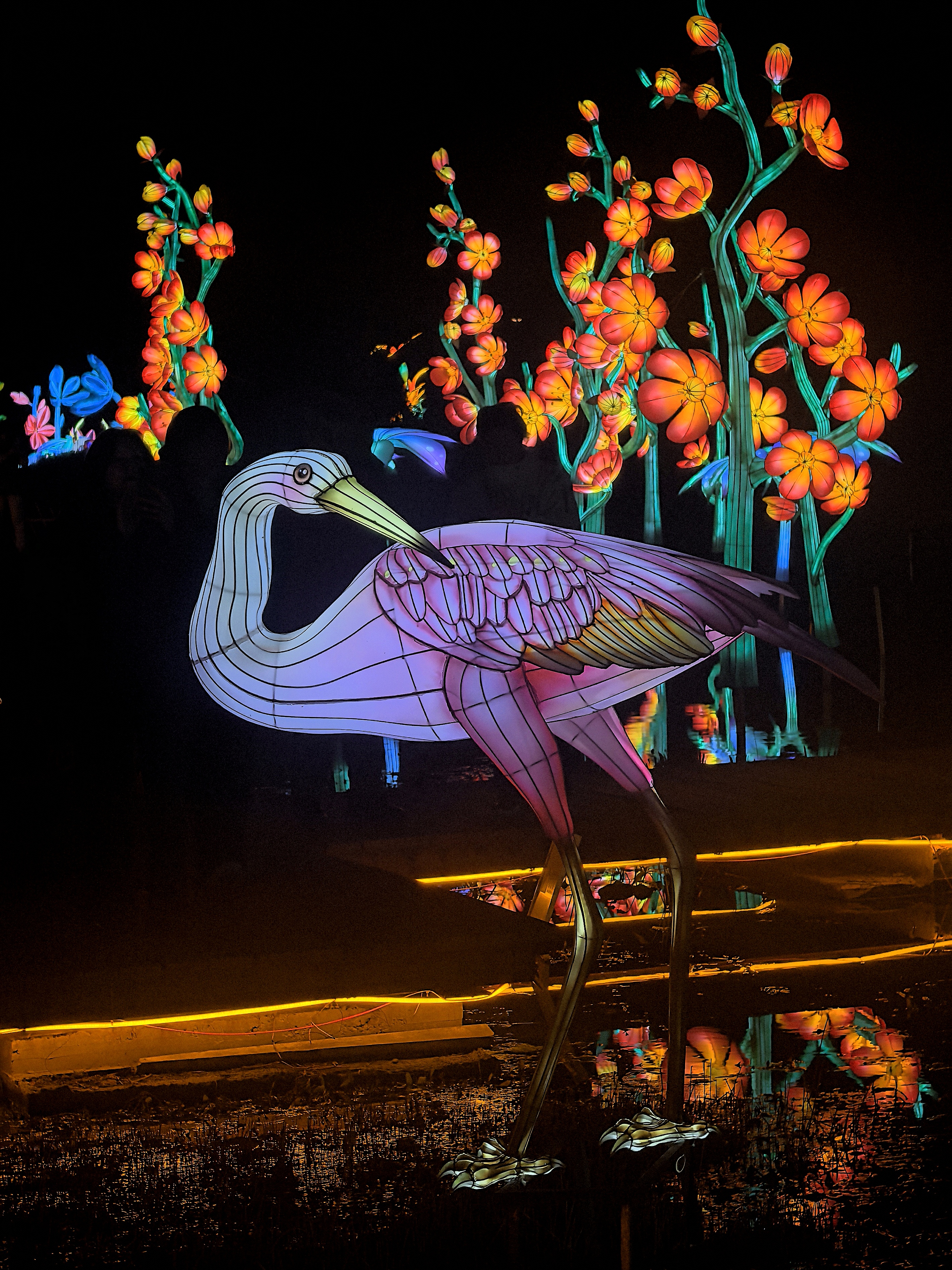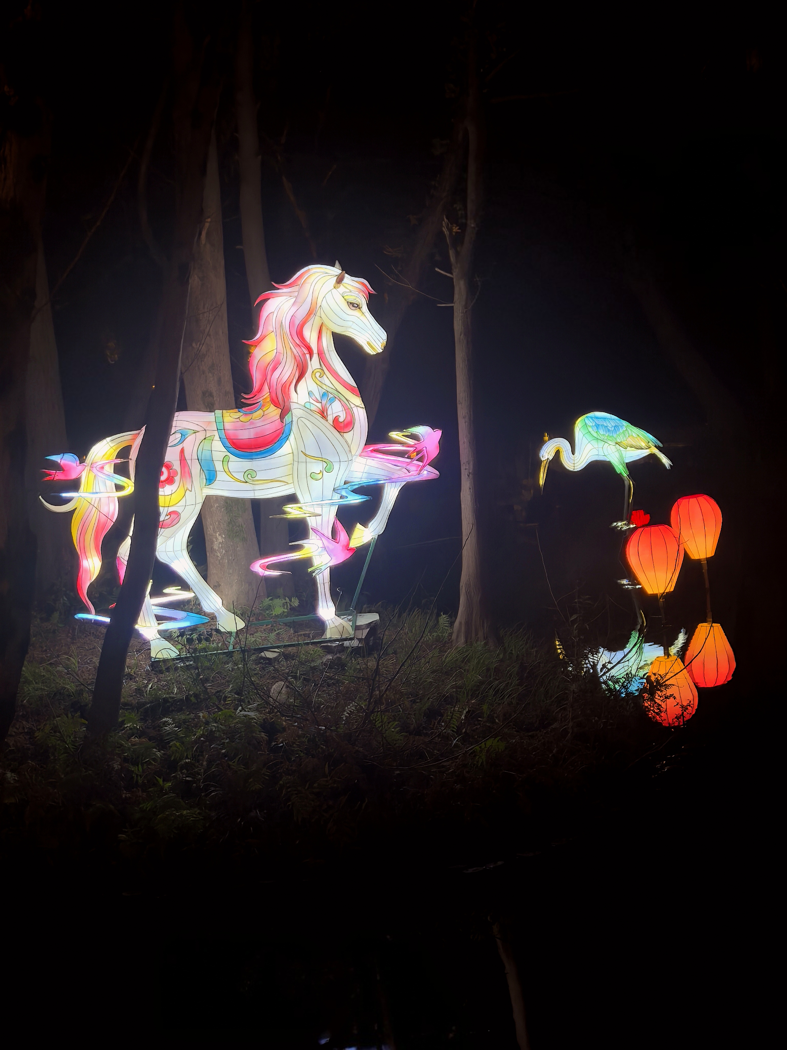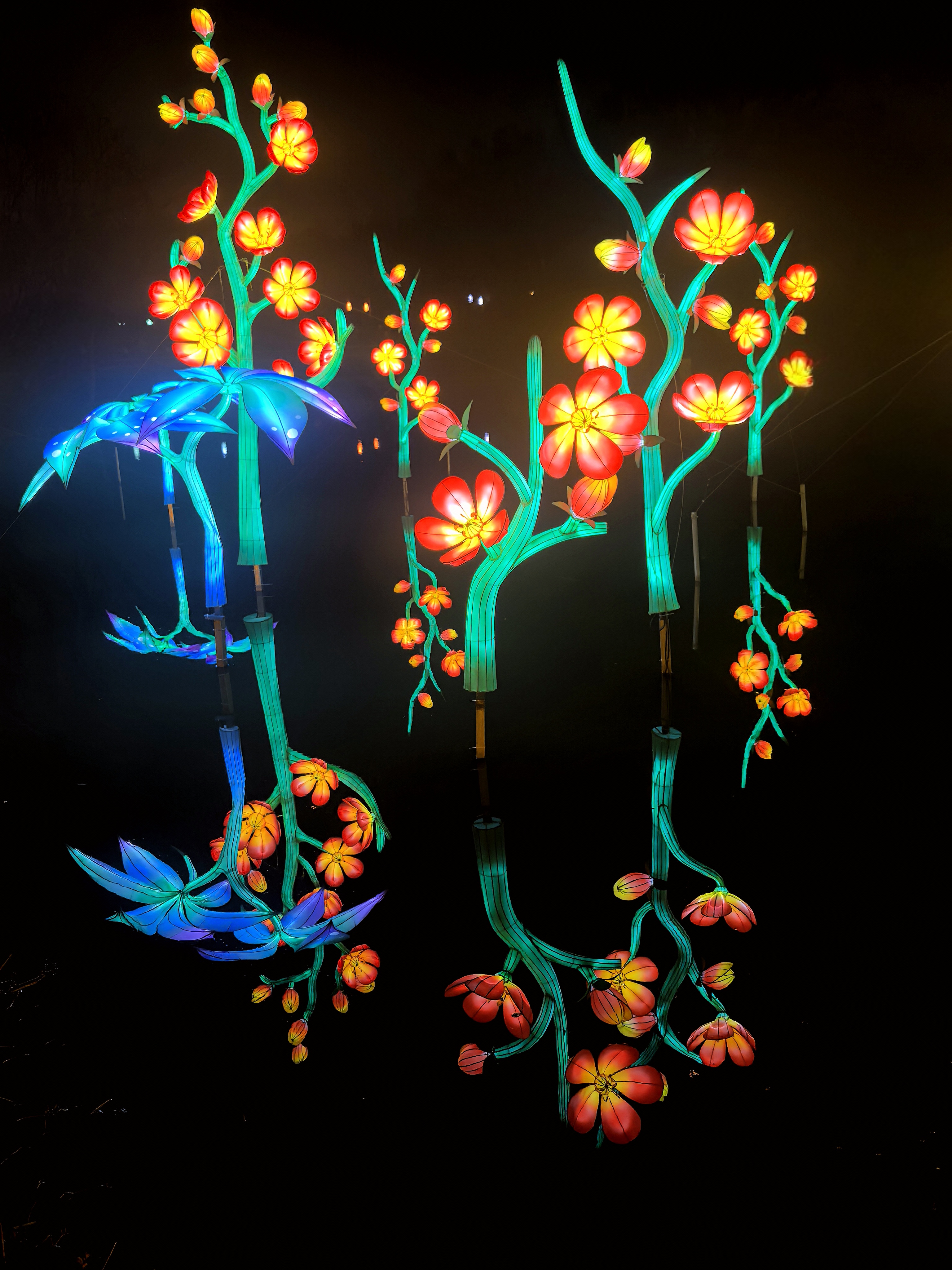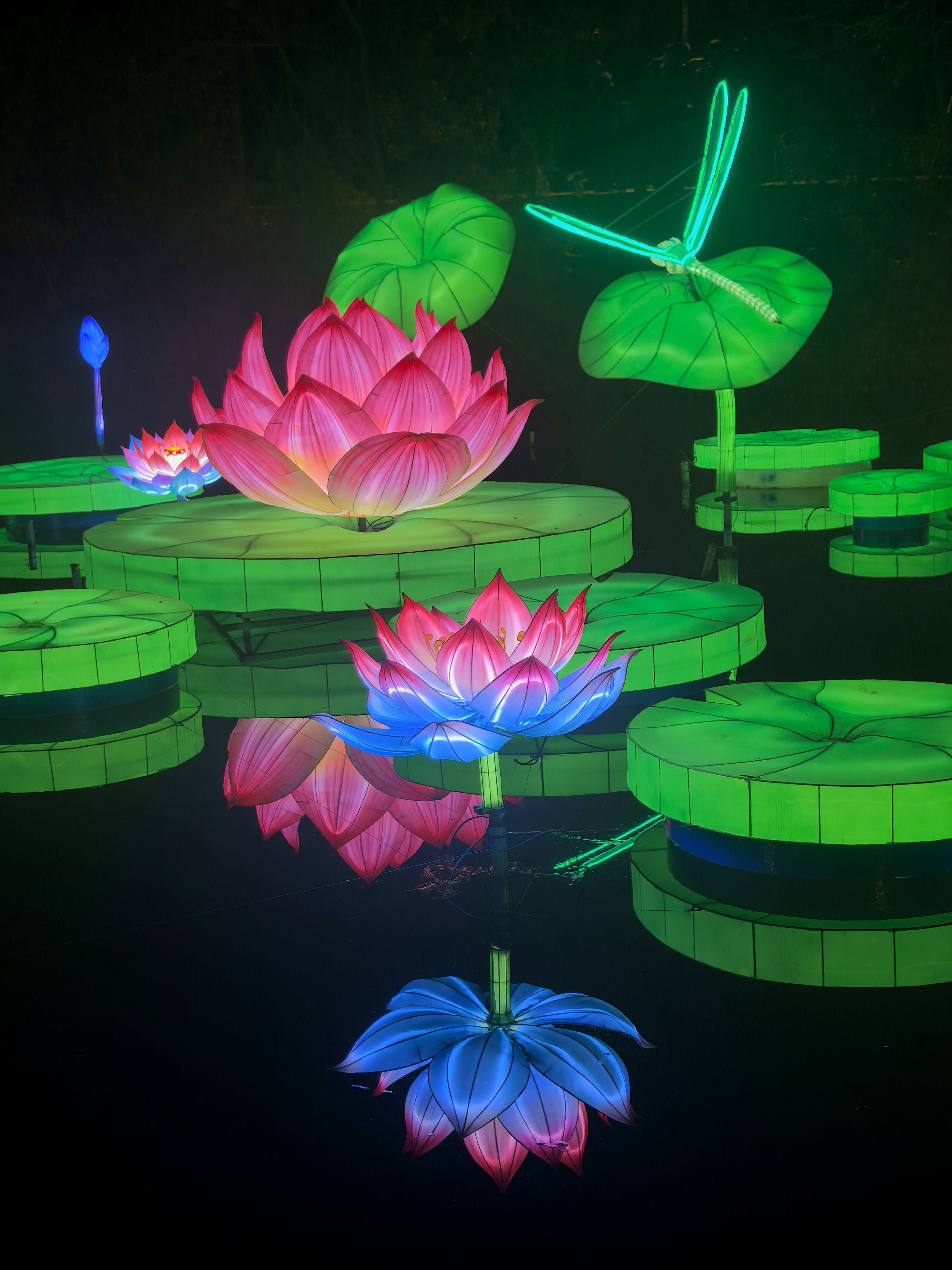 如果说白天的西溪是水墨丹青,那么夜晚的西溪便是流光溢彩的工笔重彩。 赏了西溪梅花后,时间有早,忍不住先粗看了一下。所以,从下午开始到晚上,实际上我观了两遍,犹似既看到素颜淡妆的平常模样,也看到浓妆艳抹惊艳四座的场上名伶。 匠心独运的布景,将灯火与水影玩出了极致的浪漫。看那水面上,巨大的莲花灯静静绽放,粉红的花瓣在绿叶的衬托下娇艳欲滴,倒映在水中,仿佛水底也藏着一个斑斓的世界。一只只仙鹤灯组立于水中,姿态优雅,羽毛的纹理在灯光的勾勒下清晰可见。 光影与水波的互动,微风拂过,水波荡漾,灯影也随之摇曳生姿,虚实难辨,如梦似幻。岸边的树木也被彩灯装点,红的、黄的、蓝的、绿的,五彩斑斓,与水中倒影交相辉映,构成了一幅幅梦幻的画卷。 这不仅仅是灯的展示,更是光与影、水与火的艺术交响,让人沉醉其中,流连忘返。
