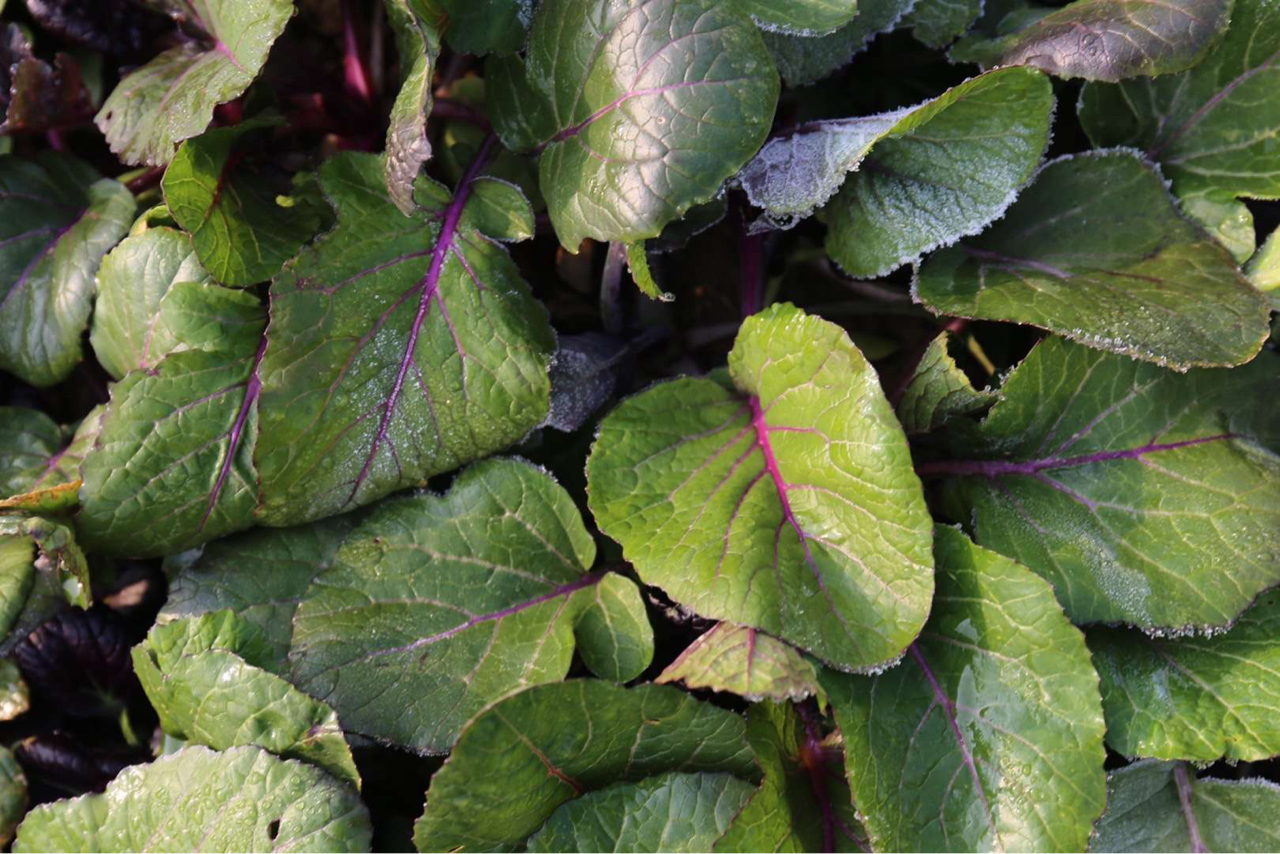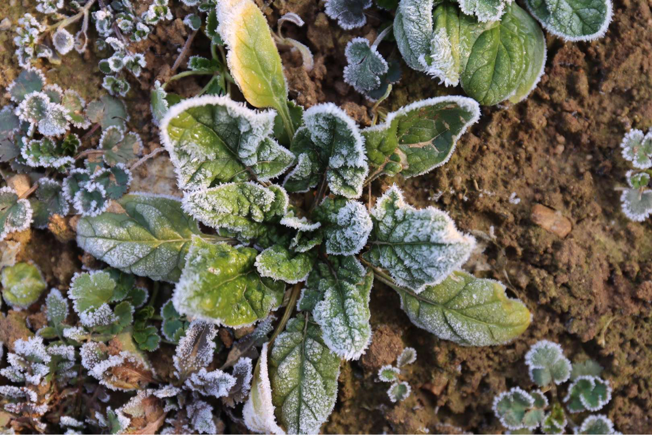 冬晨薄霜轻覆,紫叶芥菜静立田埂。叶脉如紫霞游走,绿意在寒中悄然涌动。露珠悬于叶尖,晶莹里映着微光,仿佛大地未醒的梦。霜花与生机共舞,原来凛冽深处,自有温柔生长。