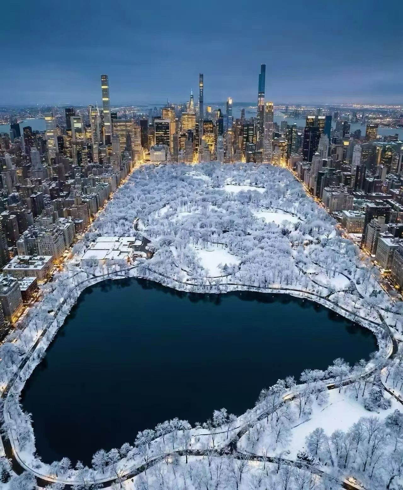 雪后中央公园,曼哈顿天际线悄悄镶了银边~湖面静卧,树梢披白,黄昏把高楼染成暖橘,冬日城市绿洲get!
