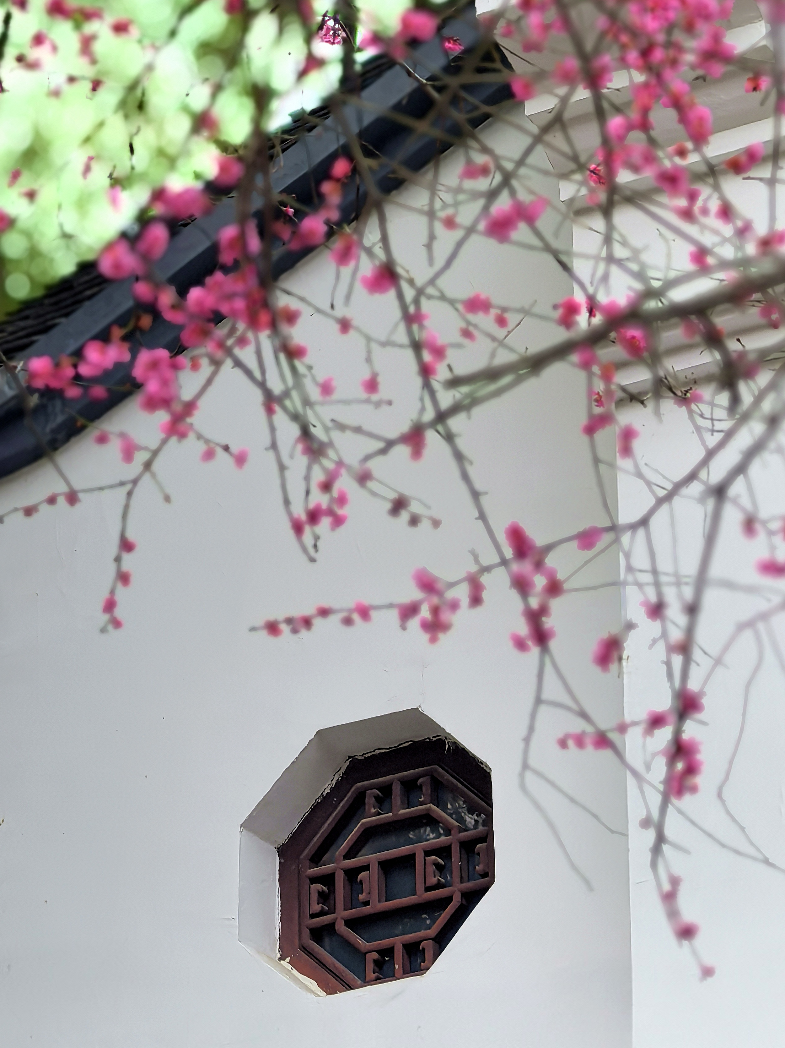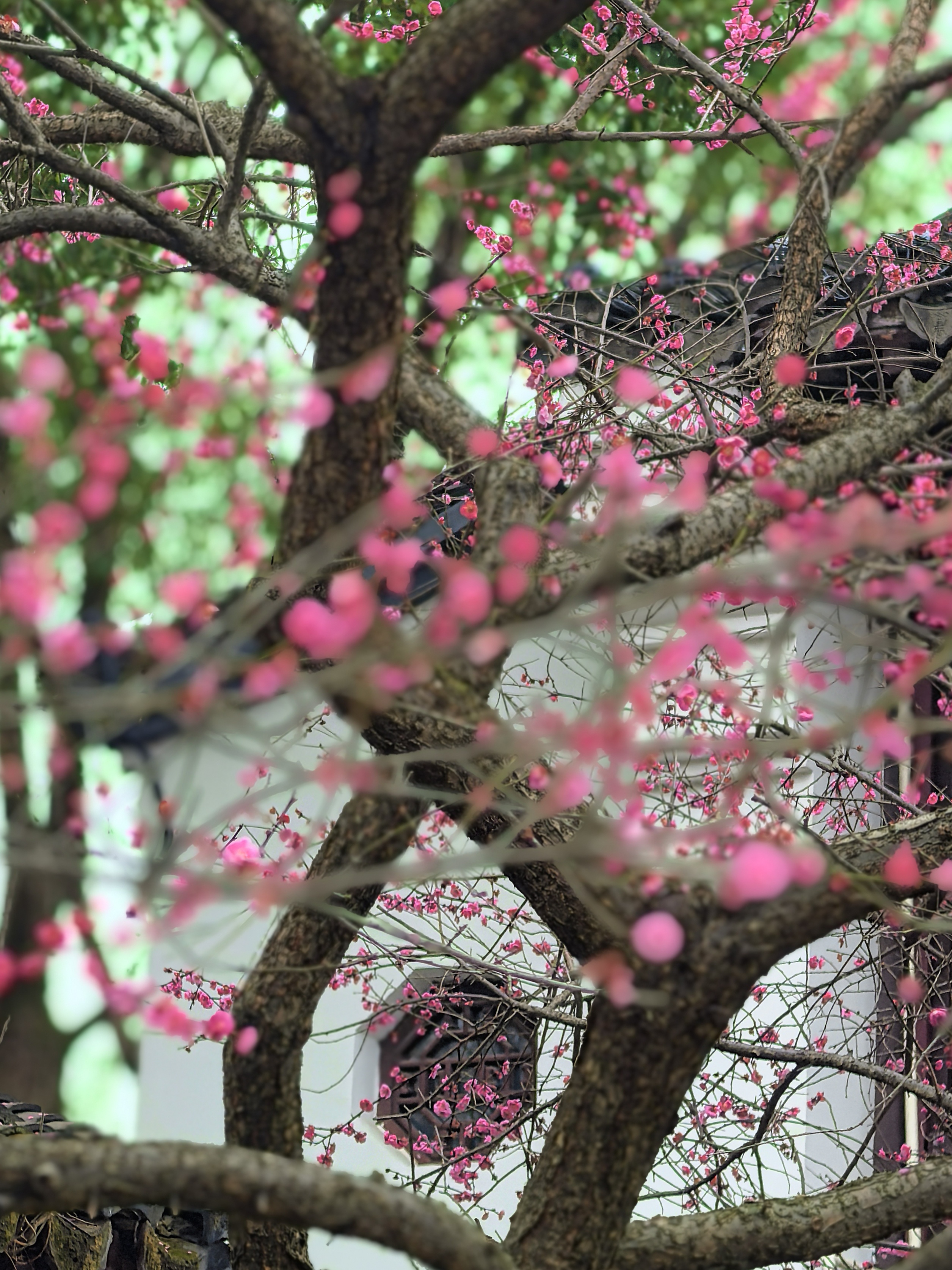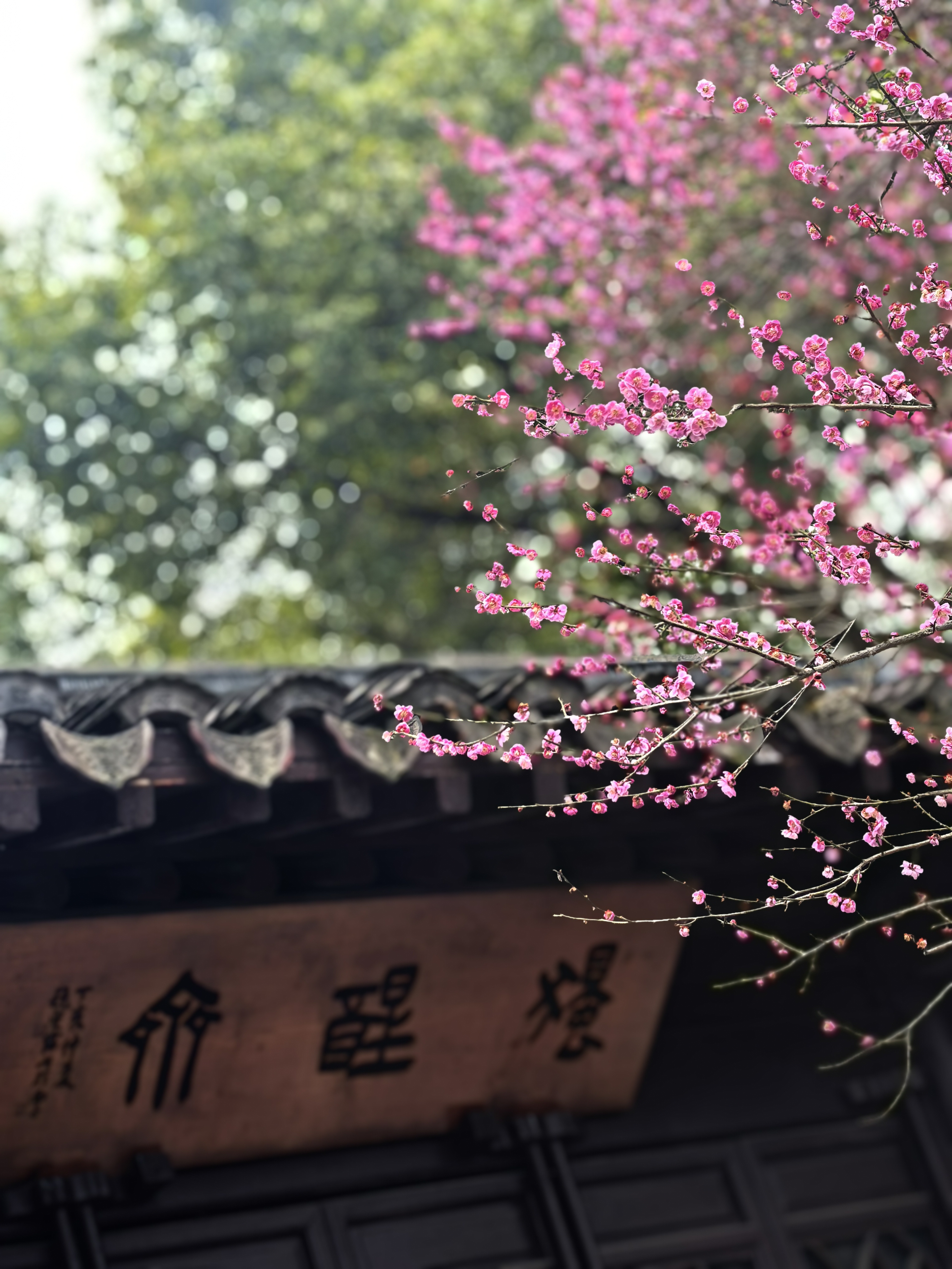 西溪高庄有个园中园,长着一株红梅,似乎是被时光遗忘的精灵。它不似百年古树那般沧桑厚重,却有着几十年的静默守望。 静静伫立在挂着“西溪书画研究会”牌子的小院一侧,枝干斜逸,粉红的花朵在黛瓦白墙的映衬下,显得格外清雅脱俗。 这株红梅,开得恬淡而宁静,仿佛是为这方寸天地而生。它不争春色,只在寂静中吐露芬芳,与周边的墙角黛瓦相得益彰,构成了一幅天然的水墨丹青。院中还有一株蜡梅,点点金黄的小花点缀在红梅丛中,红黄相间,别有一番情趣。 发现这株红梅的游人寥寥无几,只有两三个如我一样有心之人,被它的美所吸引,驻足良久,对着它拍个没完。 喧嚣的尘世中,能寻得这样一处静谧的角落,与红梅相伴,实乃游高庄之幸事。