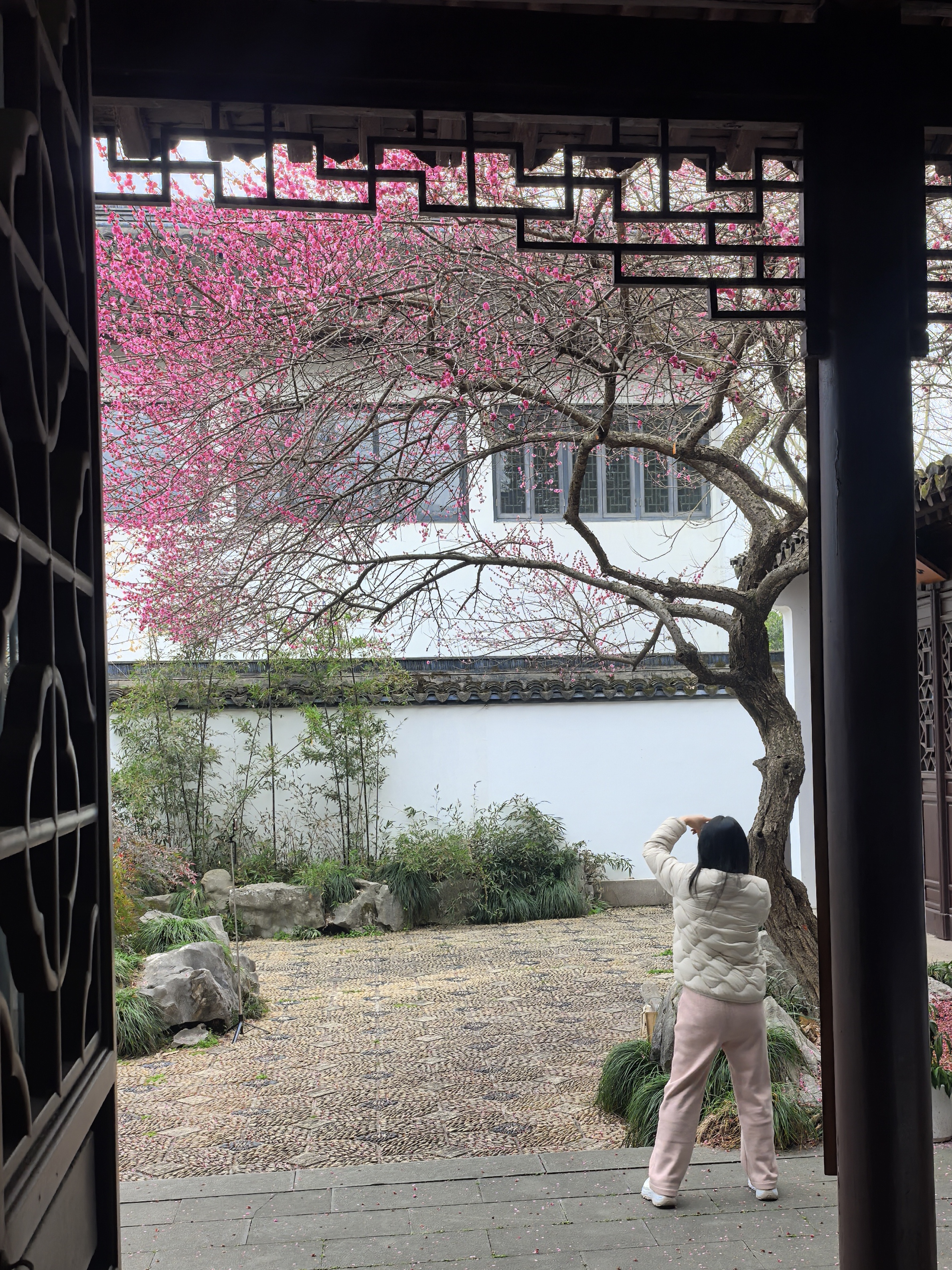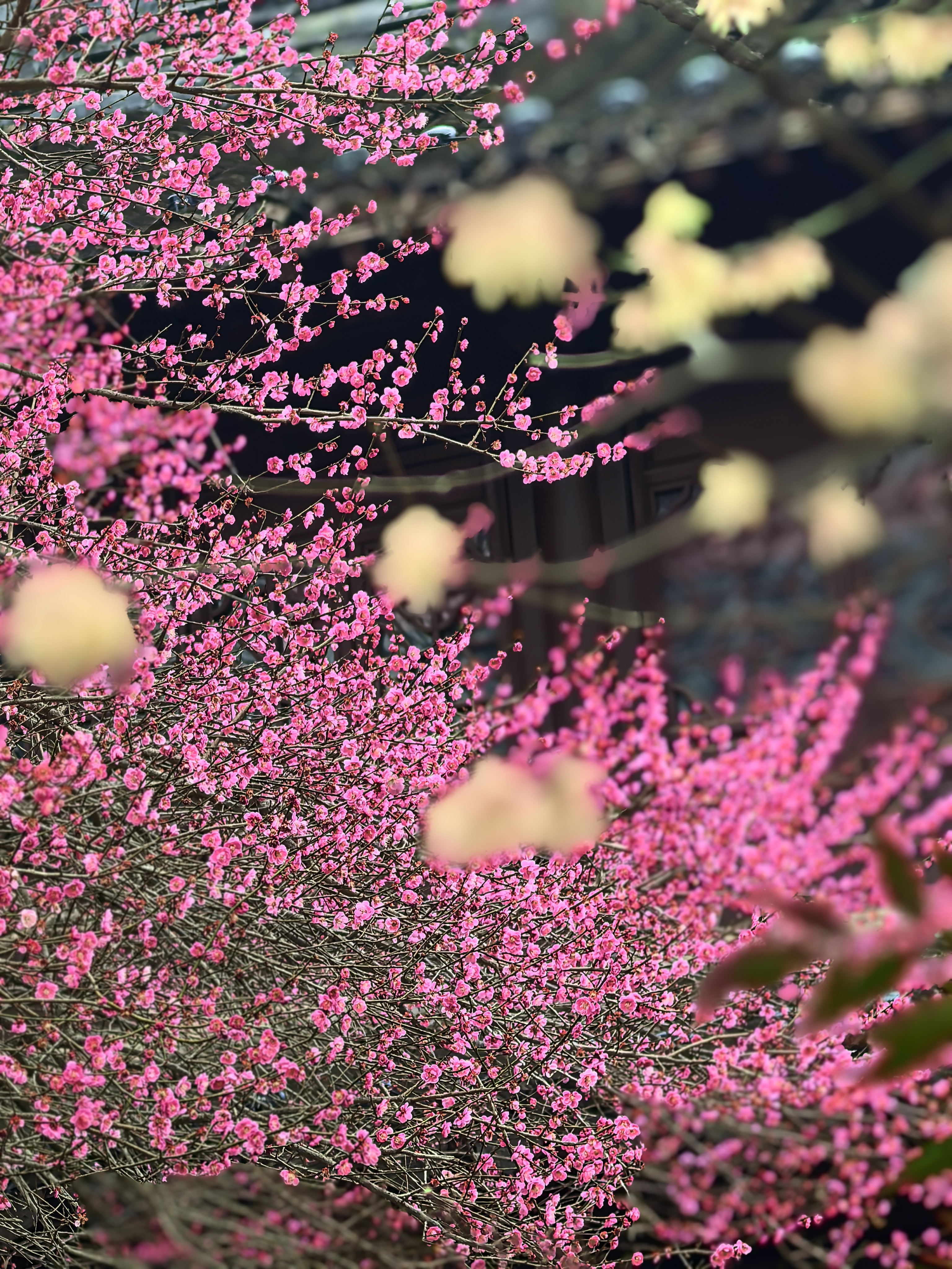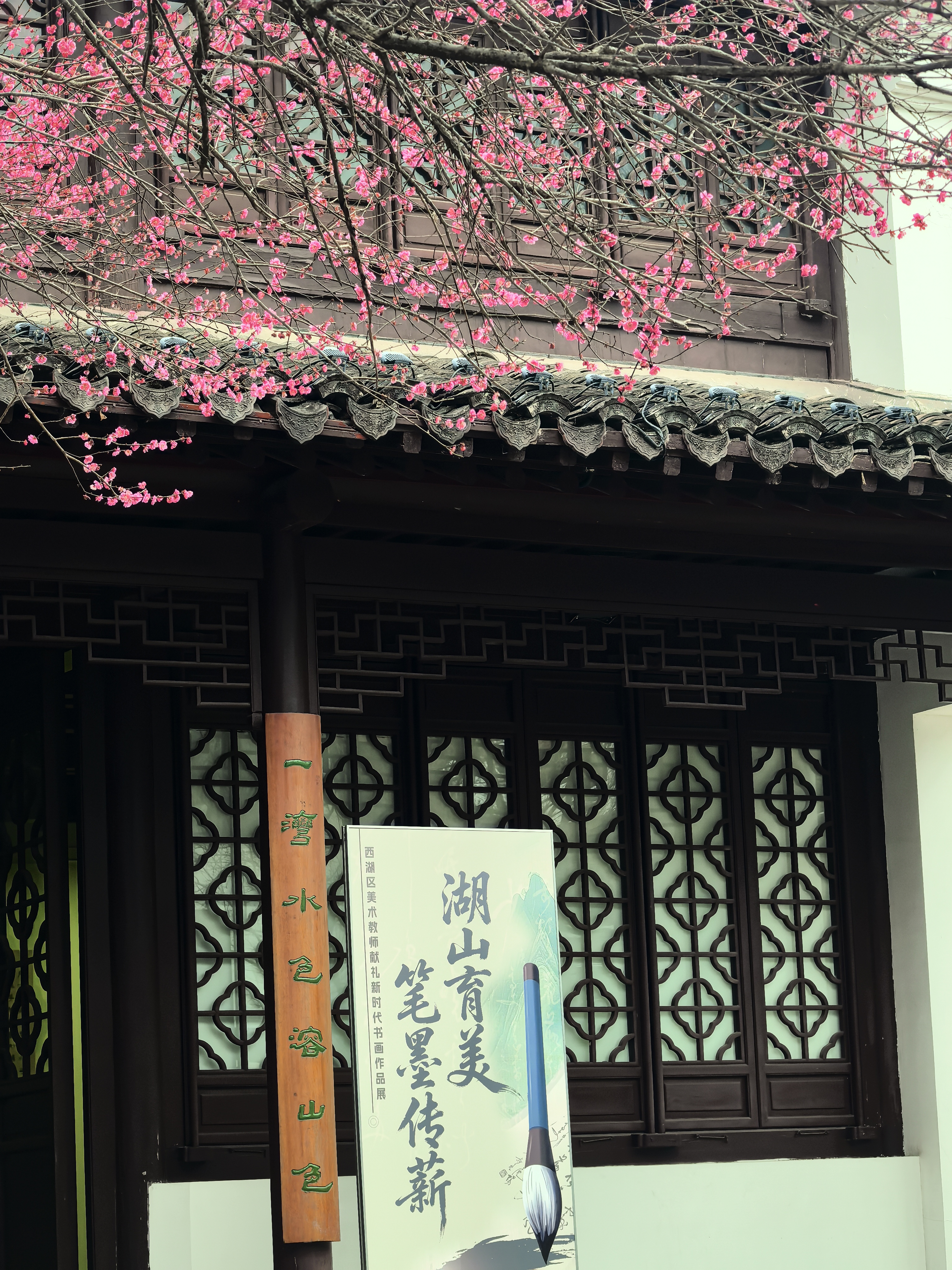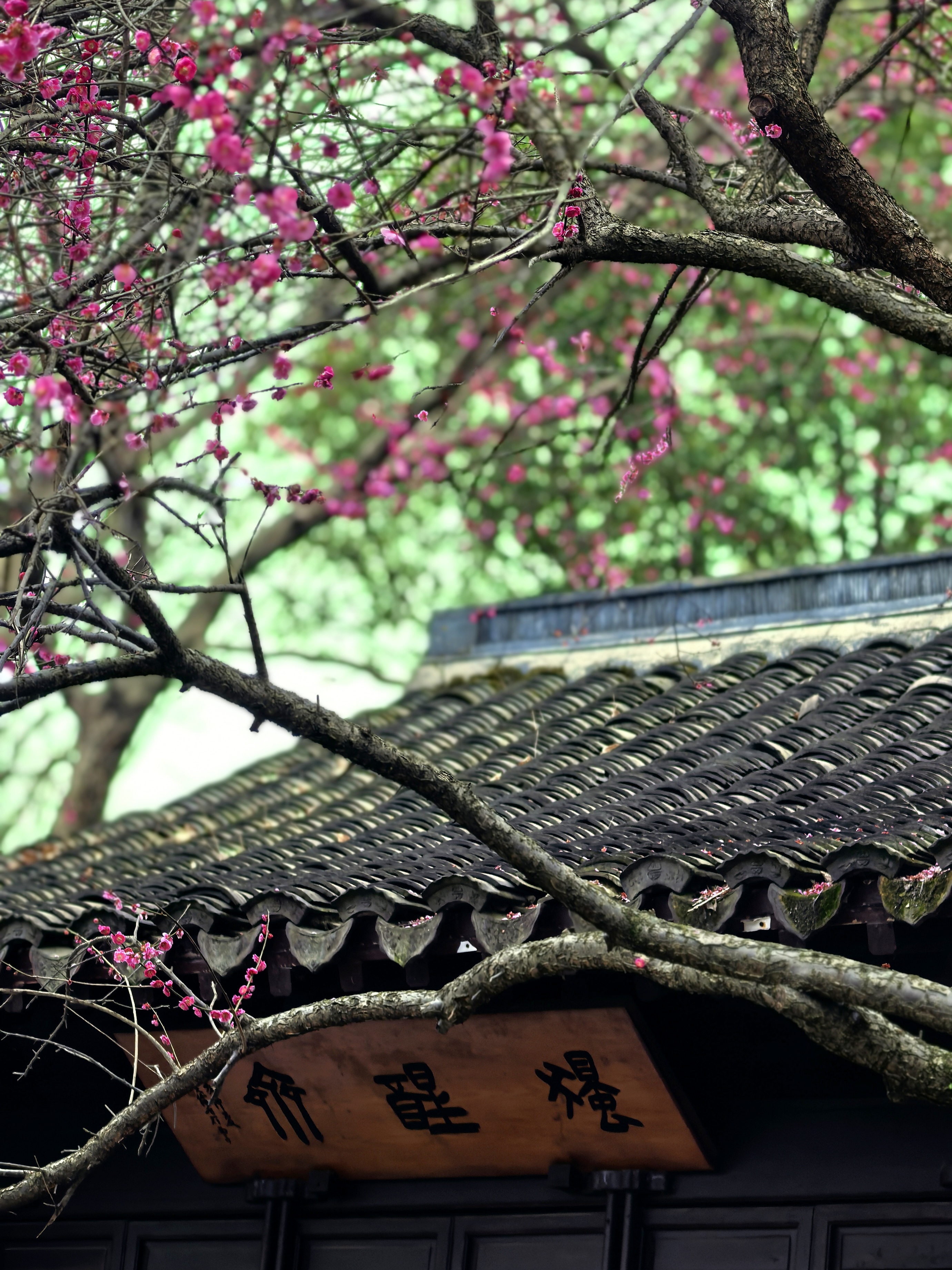 西溪高庄有个园中园,长着一株红梅,似乎是被时光遗忘的精灵。它不似百年古树那般沧桑厚重,却有着几十年的静默守望。 静静伫立在挂着“西溪书画研究会”牌子的小院一侧,枝干斜逸,粉红的花朵在黛瓦白墙的映衬下,显得格外清雅脱俗。 这株红梅,开得恬淡而宁静,仿佛是为这方寸天地而生。它不争春色,只在寂静中吐露芬芳,与周边的墙角黛瓦相得益彰,构成了一幅天然的水墨丹青。院中还有一株蜡梅,点点金黄的小花点缀在红梅丛中,红黄相间,别有一番情趣。 发现这株红梅的游人寥寥无几,只有两三个如我一样有心之人,被它的美所吸引,驻足良久,对着它拍个没完。 喧嚣的尘世中,能寻得这样一处静谧的角落,与红梅相伴,实乃游高庄之幸事。