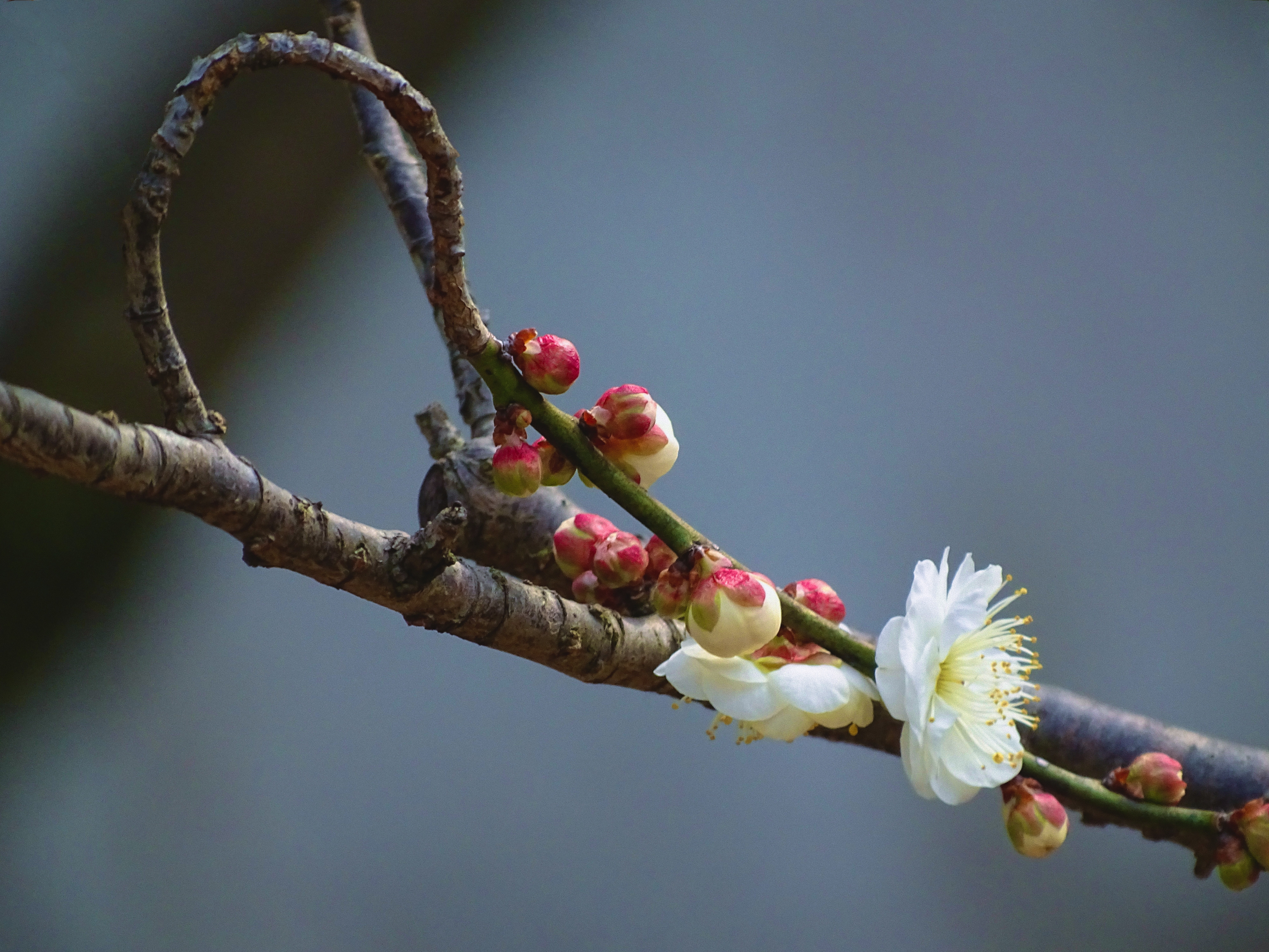 龙游梅的枝干弯出独特弧度,像极了自然的书法。几朵白花悄然绽放,嫩黄的花蕊藏着春日的温柔。旁边的花苞鼓鼓囊囊,等着和春天撞个满怀。