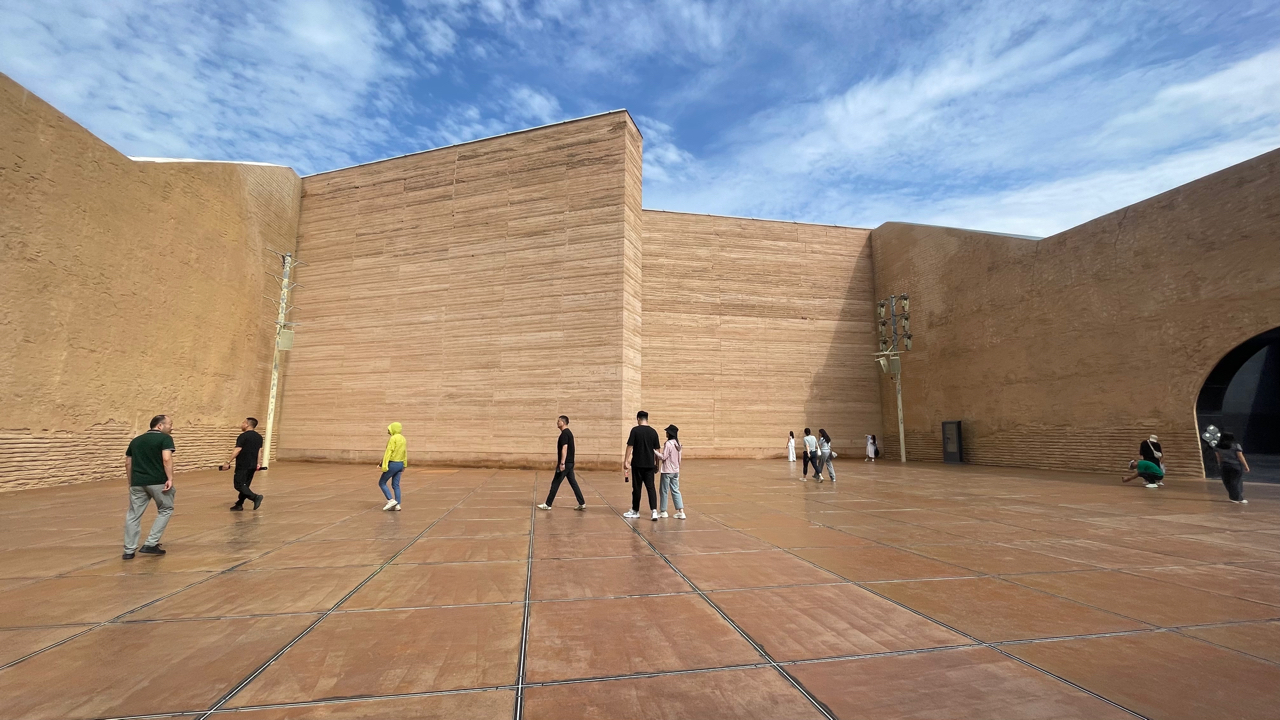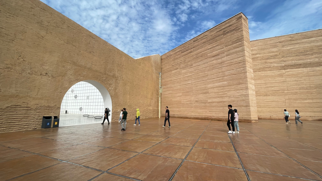 戈壁深处,土黄墙体静默如史,拱门框住一片澄澈蓝天。玻璃幕墙映着流云与游人身影,木质地板在阳光下泛暖光。“大地之子”酣眠于广场中央,风过耳畔,似有远古低语。这里是沙漠里的艺术馆,是西北苍茫中悄然生长的当代诗行——建筑、雕塑、人与天,在敦煌的光里,彼此凝望,久久不言。