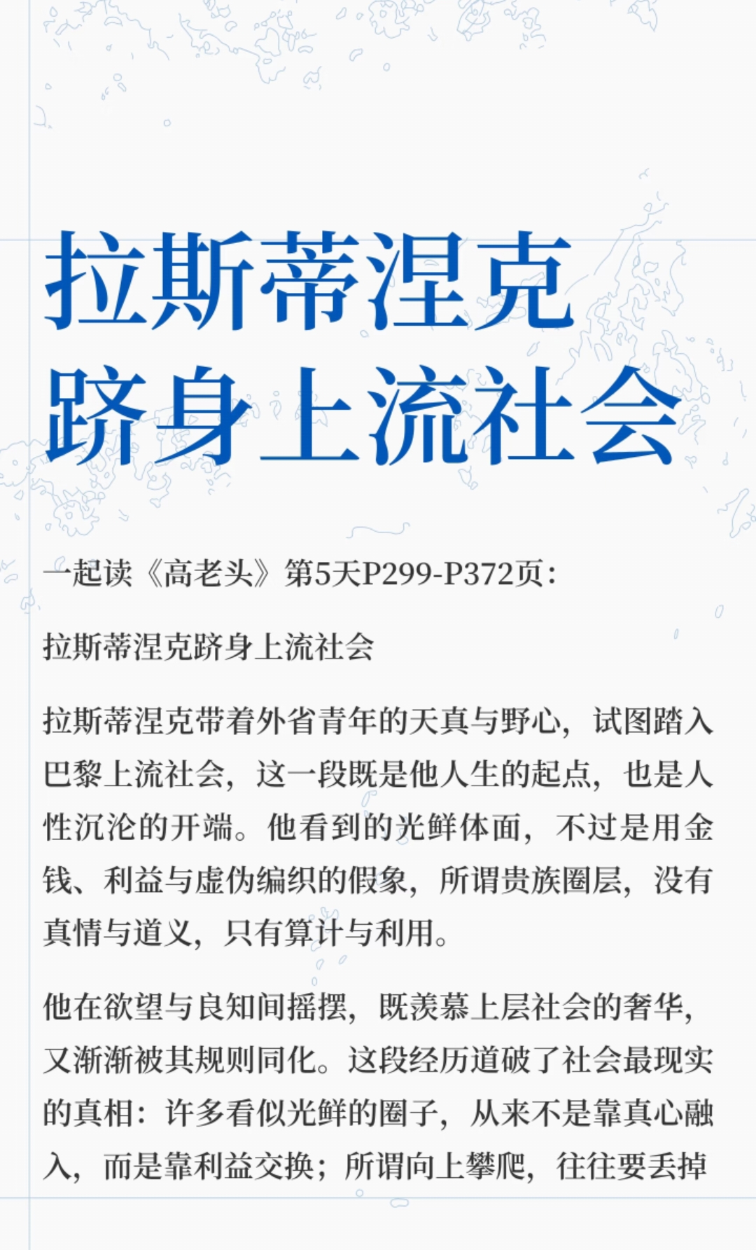 文学经典 | 《高老头》(五) 一起读《高老头》第5天第299-373页: 拉斯蒂涅克跻身上流社会 拉斯蒂涅克通过野心踏入巴黎上流社会,却发现那里充斥着金钱、利益与虚伪。他既羡慕光鲜外表,又逐渐被规则同化。 这段经历揭示了社会的真实面貌,真正的高贵源于内心的纯粹与底线,而非外在的光鲜与门第。