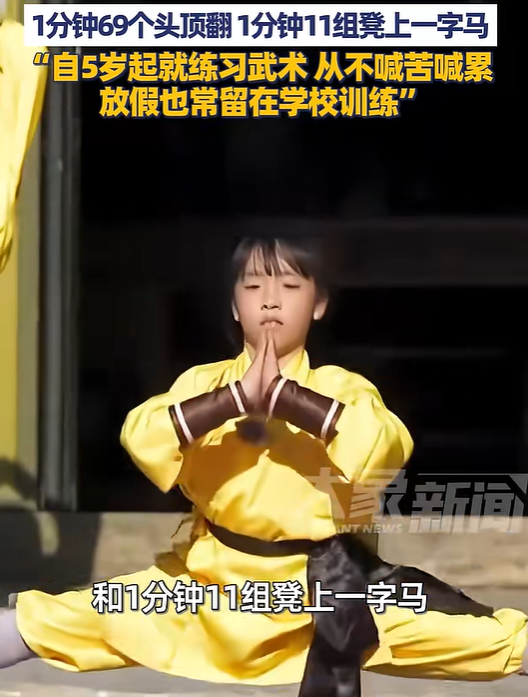 近日,来自河南汤阴岳飞故里的12岁女孩张思璇,以1分钟69个头顶翻和1分钟11组凳子上一字马,创下两项吉尼斯世界纪录,相关节目登上意大利电视台,惊艳海外,尽显中华武术精气神!