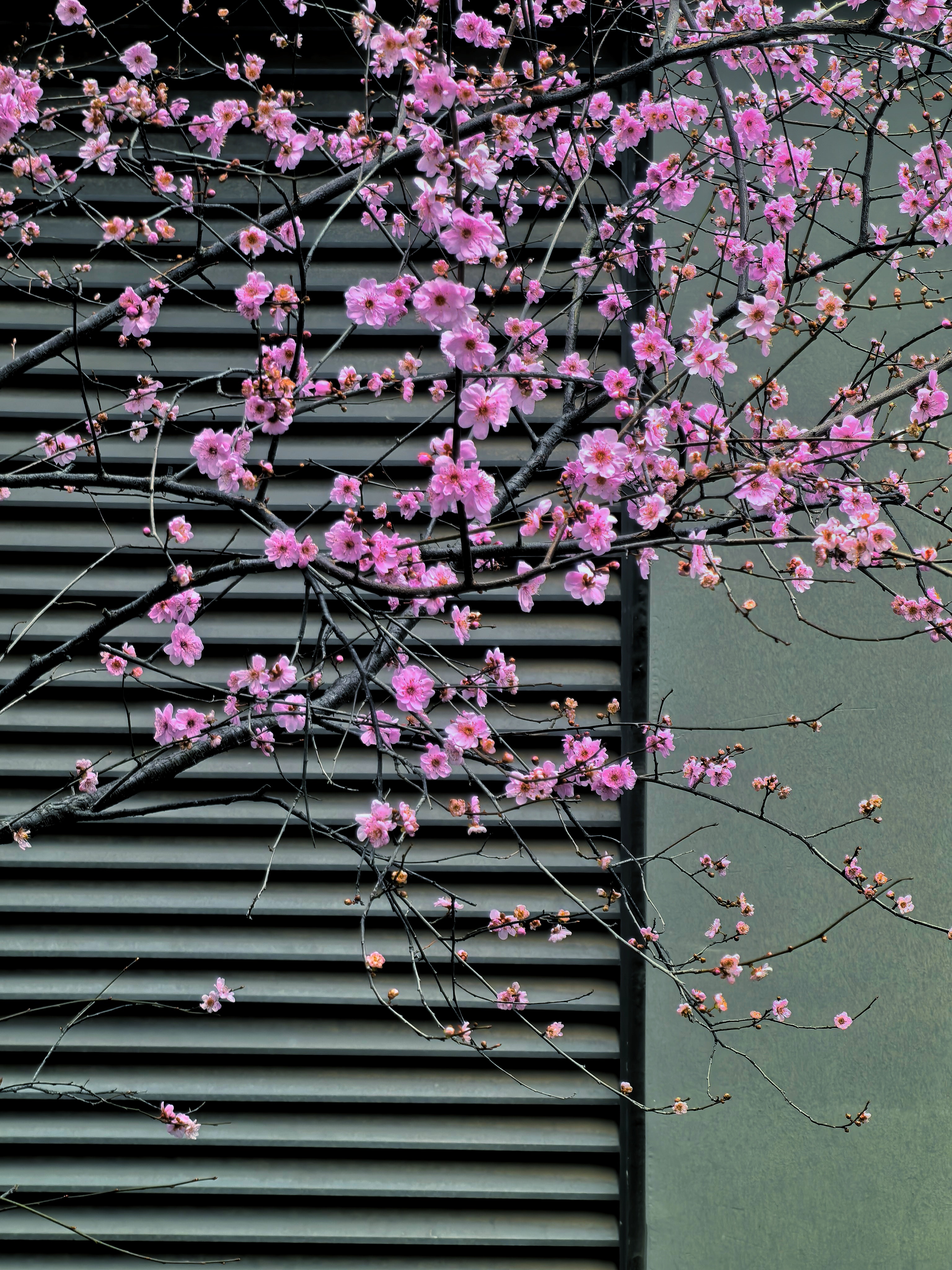 义乌市壹号院庆云二区,小区里的深灰的百叶窗和墙面,与美人梅粉嫩的花枝形成了强烈的视觉对比,让花朵显得格外柔美。 美人梅(也常被归为梅花的一种),是重瓣粉型梅花与红叶李的园艺杂交品种。 楼扬勤摄 HUAWEI Mate 60 Pro