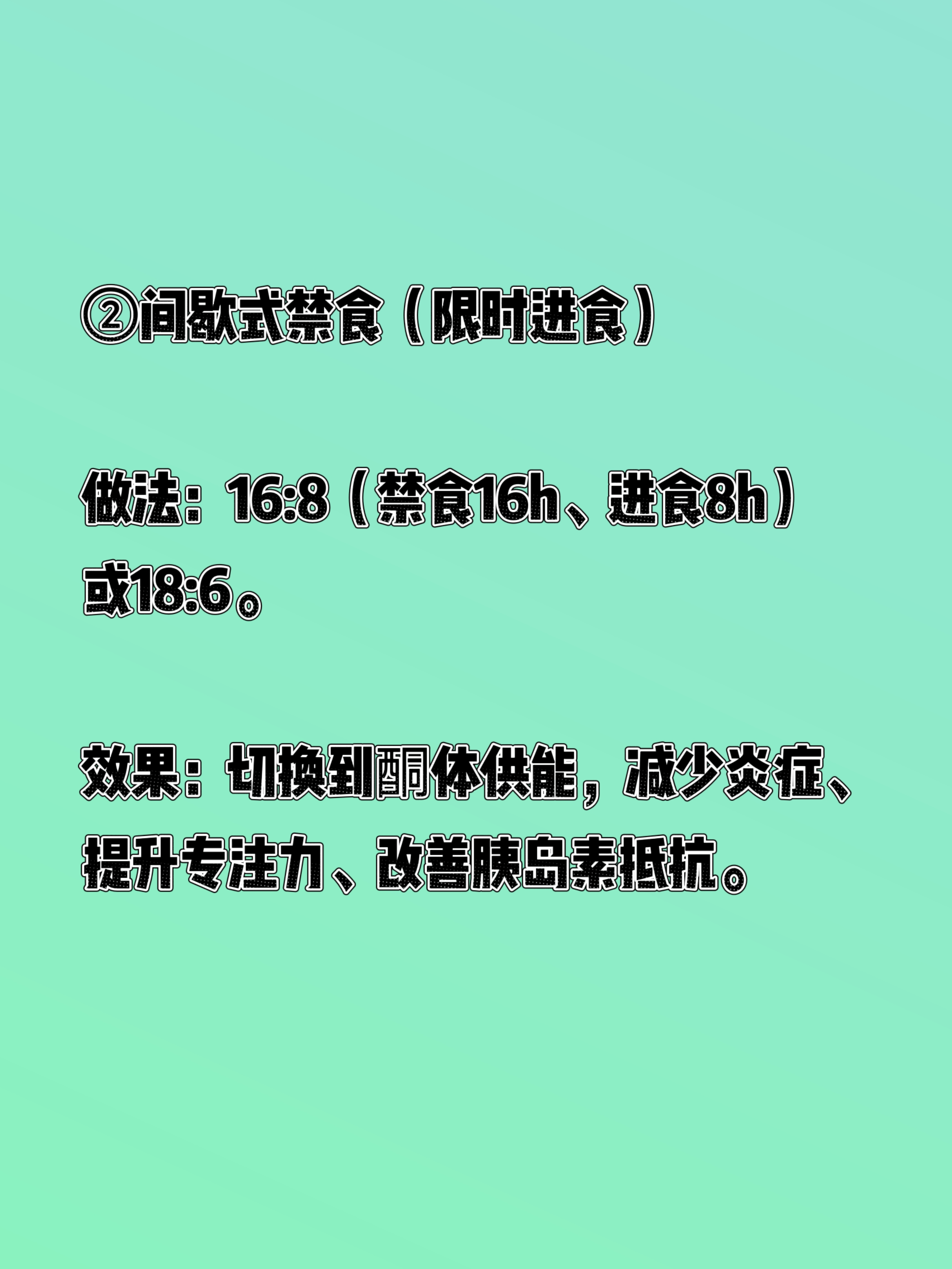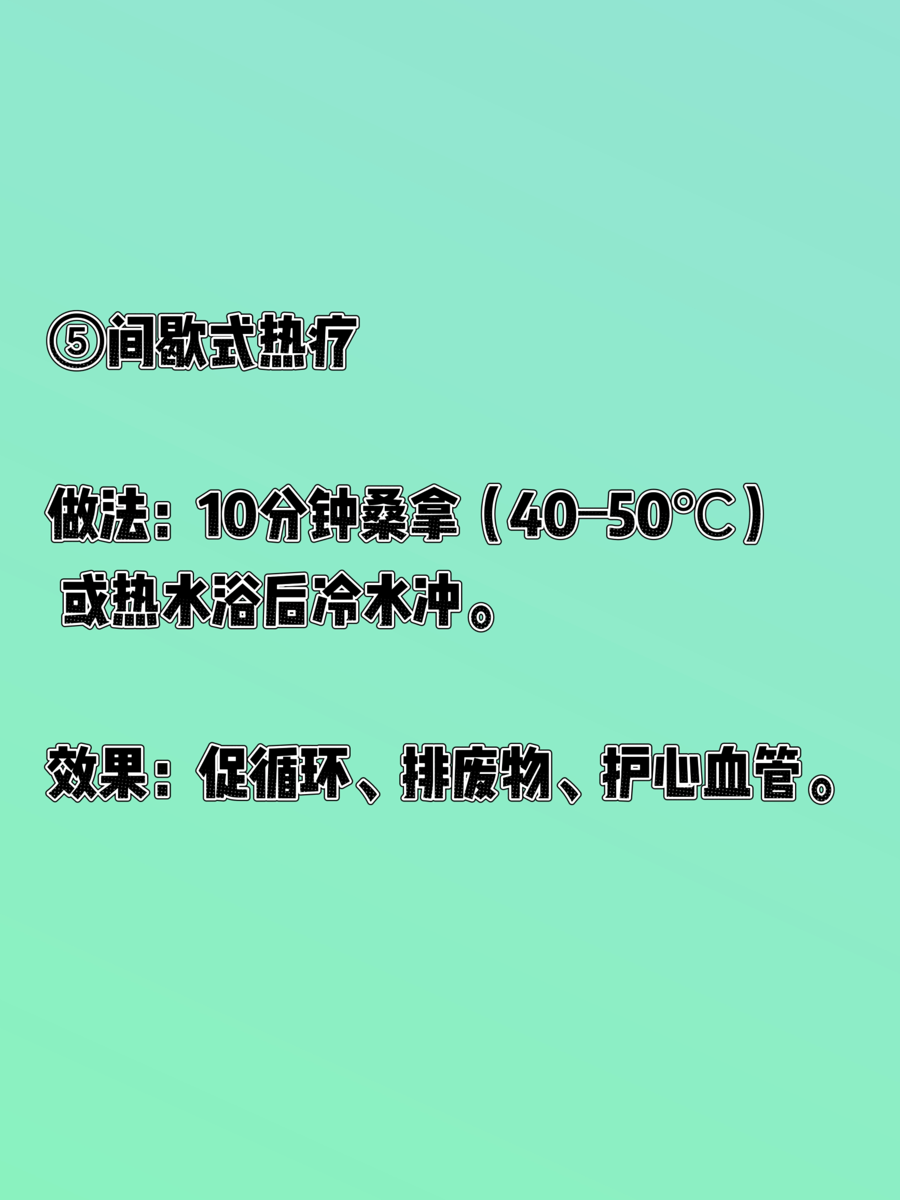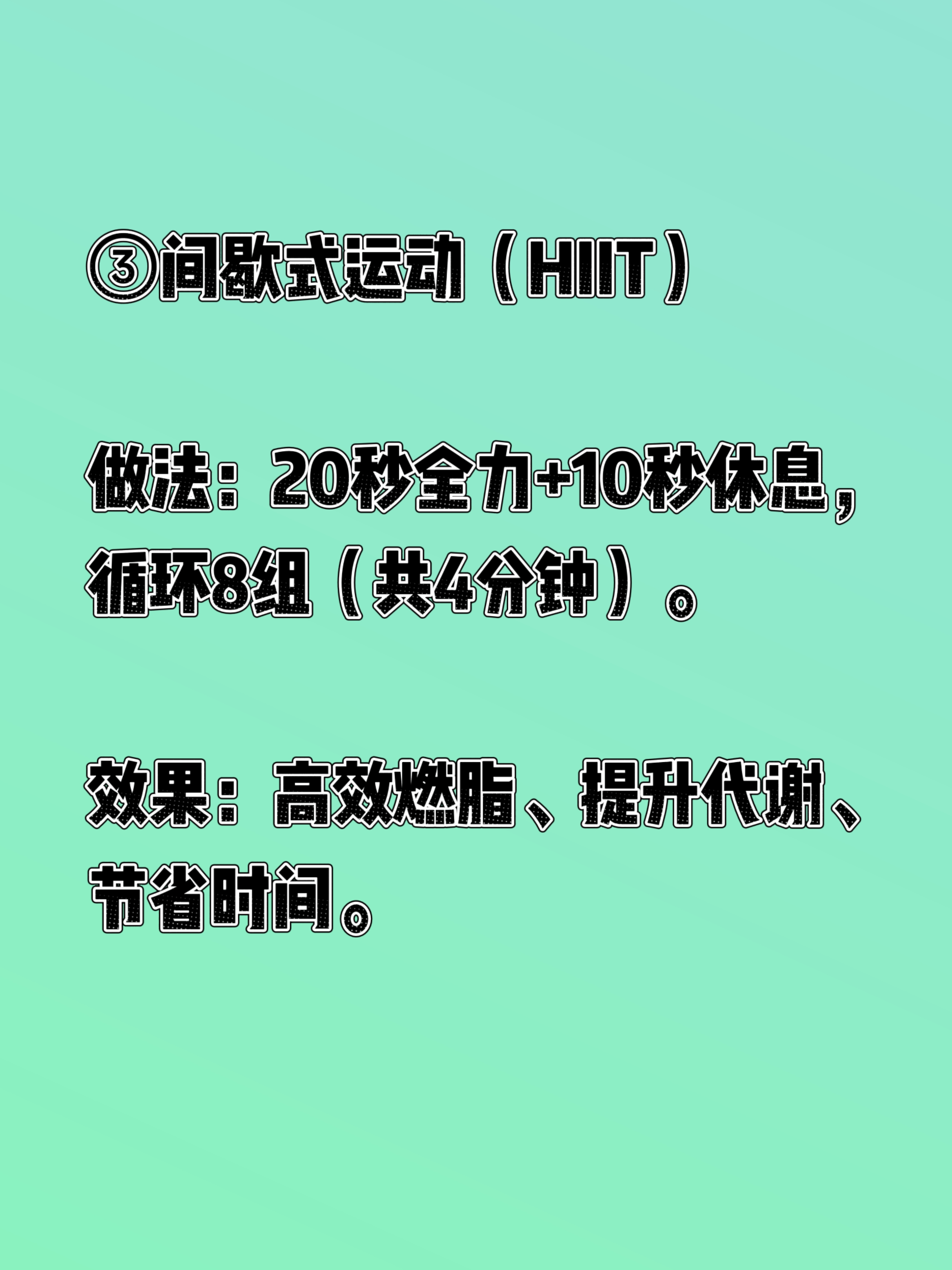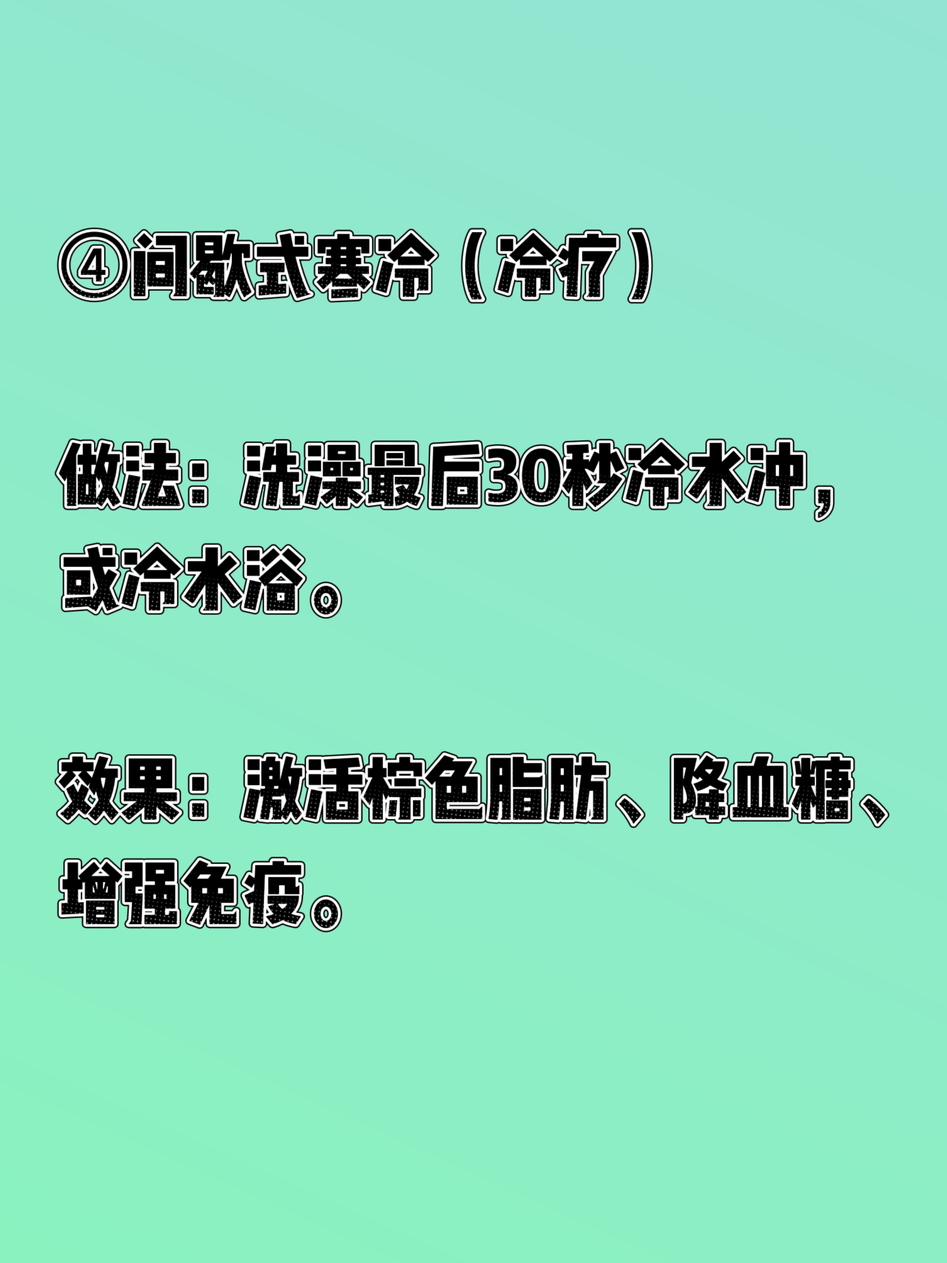 来一起身体革命,尝试“间歇式生活”! 最近读了西博·汉诺赛特的《身体革命:八种间歇式生活法》,这本书更像一篇生活风格的学术论文,很专业很学术。通过现代人生活方式对健康的负面影响,然后介绍了间歇式生活的理念和其细胞层面的益处。 在下面简单总结一下比较时候每天尝试的几个方法。 ①间歇式呼吸(4-7-8法) 做法:吸气4秒→屏息7秒→呼气8秒,每天早/中/晚各5分钟。 效果:激活副交感神经,快速放松、改善失眠、缓解偏头痛。 ②间歇式禁食(限时进食) 做法:16:8(禁食16h、进食8h)或18:6。 效果:切换到酮体供能,减少炎症、提升专注力、改善胰岛素抵抗。 ③间歇式运动(HIIT) 做法:20秒全力+10秒休息,循环8组(共4分钟)。 效果:高效燃脂、提升代谢、节省时间。 ④间歇式寒冷(冷疗) 做法:洗澡最后30秒冷水冲,或冷水浴。 效果:激活棕色脂肪、降血糖、增强免疫。 ⑤间歇式热疗 做法:10分钟桑拿(40–50℃) 或热水浴后冷水冲。 效果:促循环、排废物、护心血管。 ⑥间歇式睡眠 做法:分段睡眠+20分钟午睡,避免熬夜后硬撑。 效果:优化修复、提升白天精力。 ⑦间歇式认知 做法:每天10–15分钟冥想/学习新技能,脱离惯性思维。 效果:重塑大脑、提升专注与创造力。 ⑧间歇式饮水/环境 饮水:短时间少喝→正常喝,训练身体水调节。 环境:偶尔离开恒温,适应温度变化,增强适应力。 特别注意,作者特别说明了“间歇式生活法”并不适用于所有群体,建议大家认真阅读后选择自己适合的部分运动!