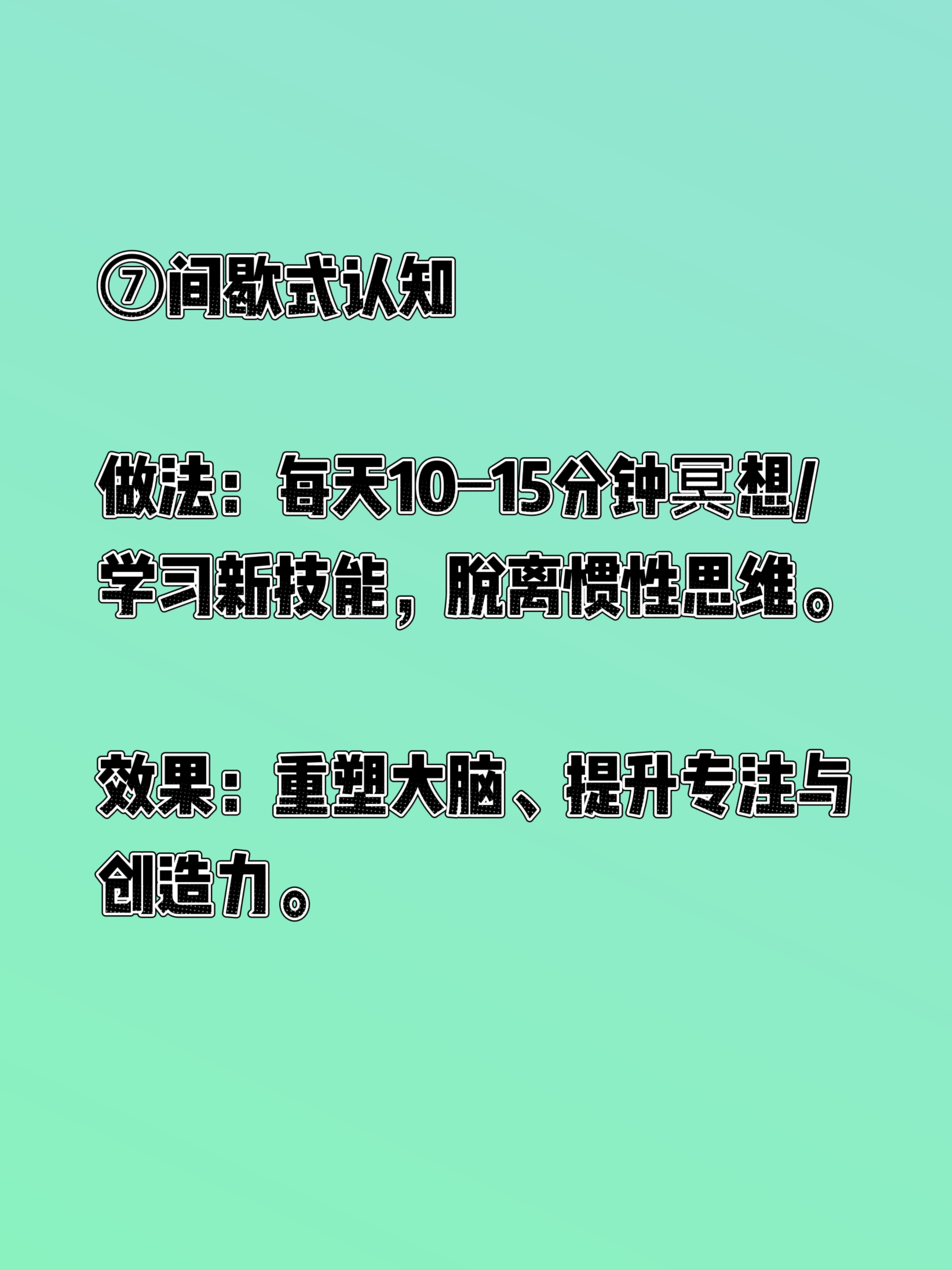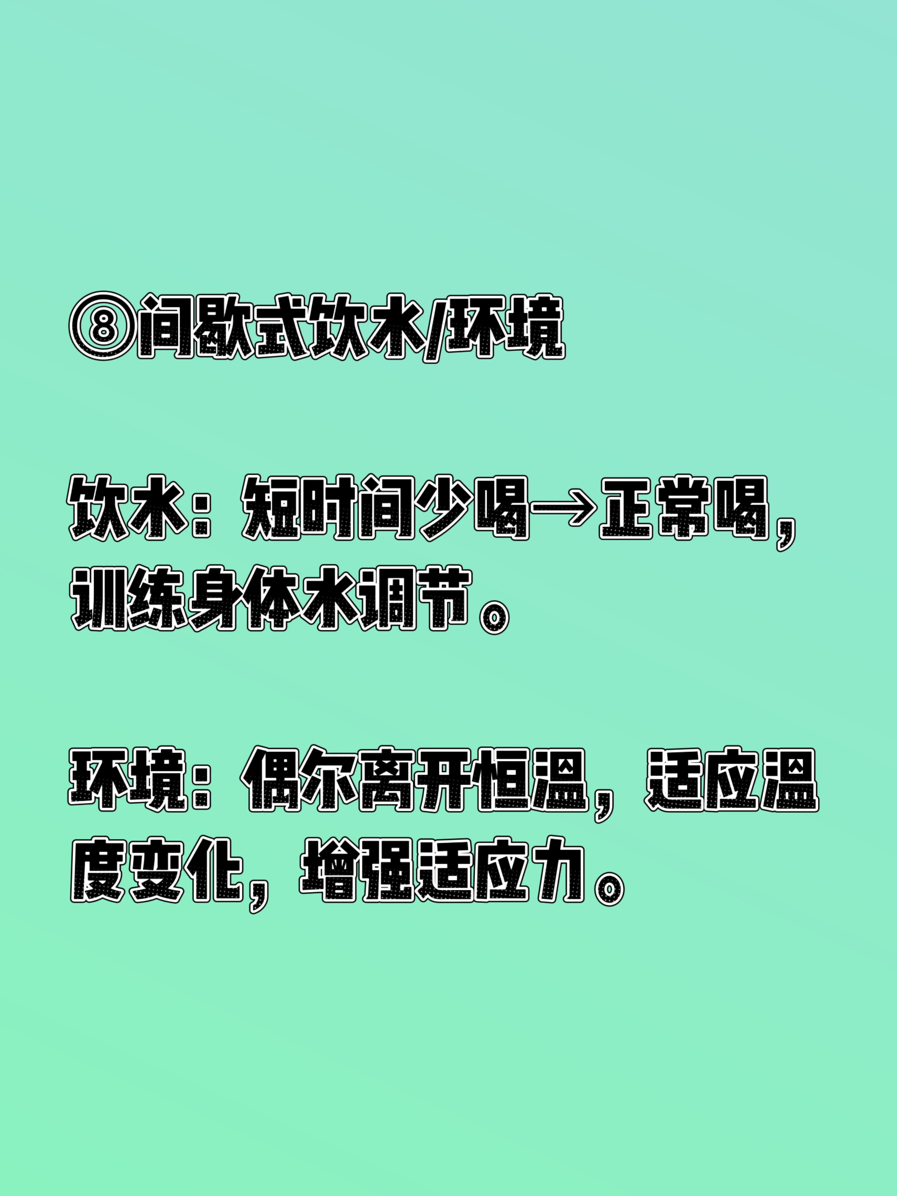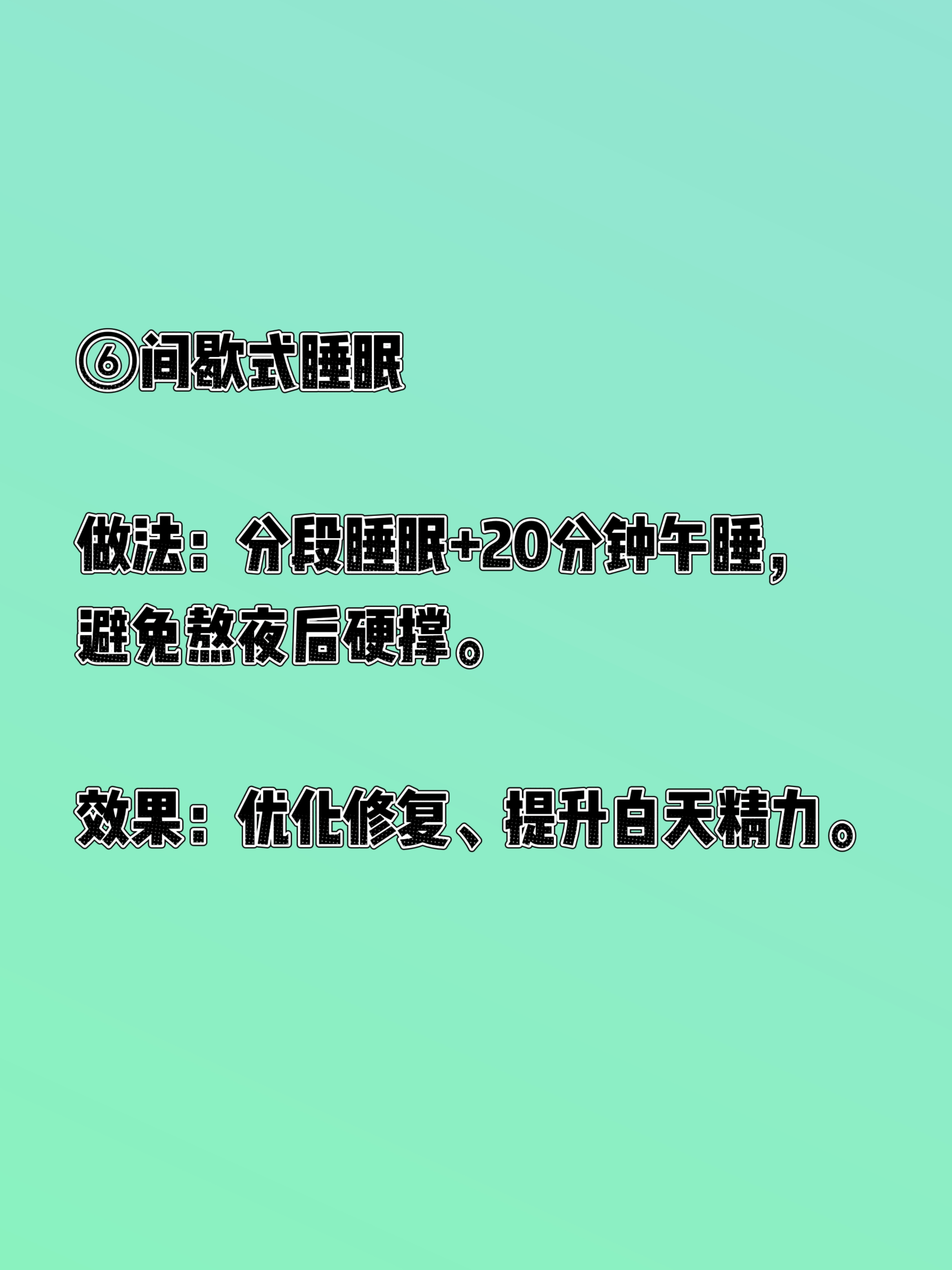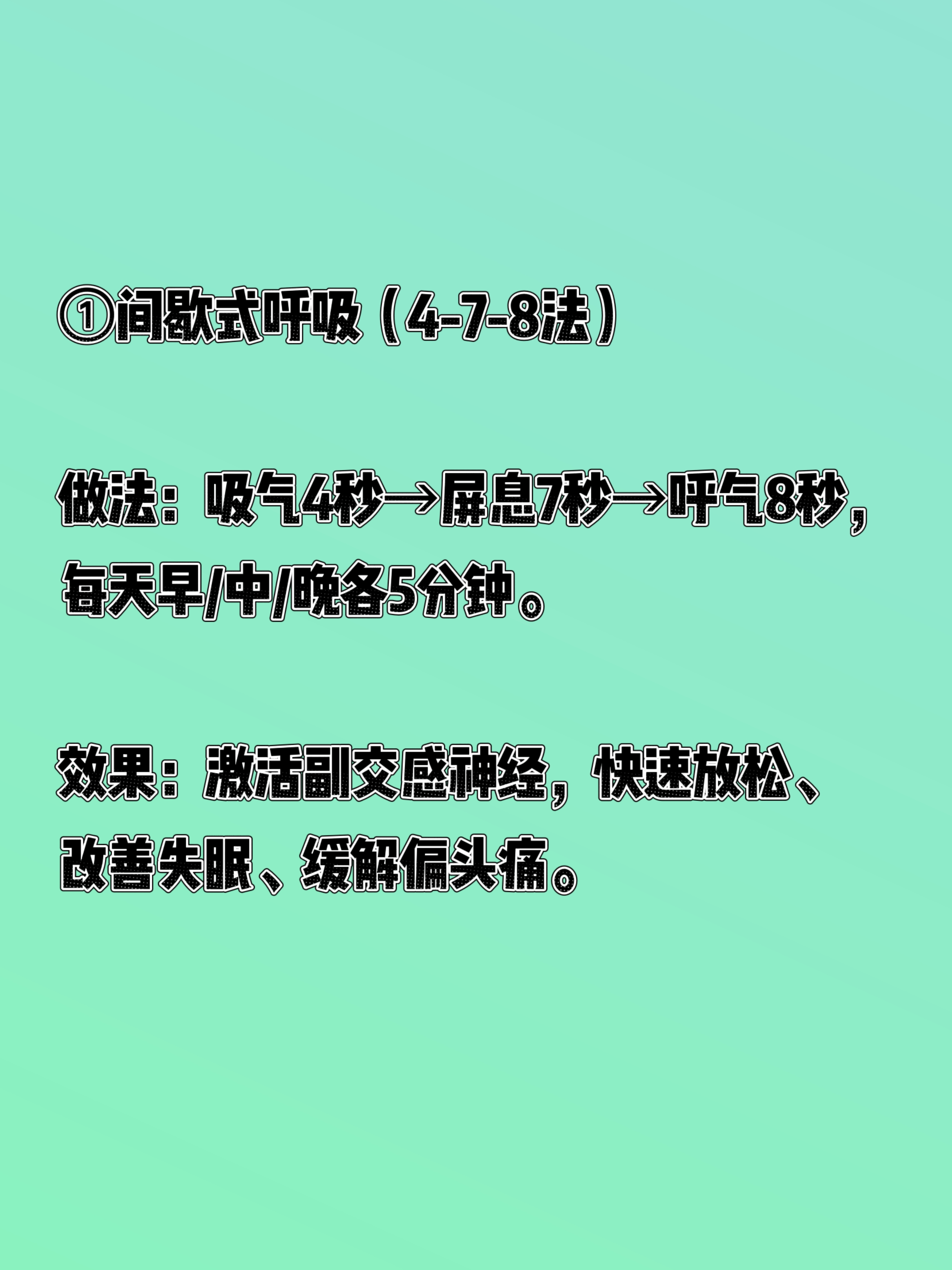 来一起身体革命,尝试“间歇式生活”! 最近读了西博·汉诺赛特的《身体革命:八种间歇式生活法》,这本书更像一篇生活风格的学术论文,很专业很学术。通过现代人生活方式对健康的负面影响,然后介绍了间歇式生活的理念和其细胞层面的益处。 在下面简单总结一下比较时候每天尝试的几个方法。 ①间歇式呼吸(4-7-8法) 做法:吸气4秒→屏息7秒→呼气8秒,每天早/中/晚各5分钟。 效果:激活副交感神经,快速放松、改善失眠、缓解偏头痛。 ②间歇式禁食(限时进食) 做法:16:8(禁食16h、进食8h)或18:6。 效果:切换到酮体供能,减少炎症、提升专注力、改善胰岛素抵抗。 ③间歇式运动(HIIT) 做法:20秒全力+10秒休息,循环8组(共4分钟)。 效果:高效燃脂、提升代谢、节省时间。 ④间歇式寒冷(冷疗) 做法:洗澡最后30秒冷水冲,或冷水浴。 效果:激活棕色脂肪、降血糖、增强免疫。 ⑤间歇式热疗 做法:10分钟桑拿(40–50℃) 或热水浴后冷水冲。 效果:促循环、排废物、护心血管。 ⑥间歇式睡眠 做法:分段睡眠+20分钟午睡,避免熬夜后硬撑。 效果:优化修复、提升白天精力。 ⑦间歇式认知 做法:每天10–15分钟冥想/学习新技能,脱离惯性思维。 效果:重塑大脑、提升专注与创造力。 ⑧间歇式饮水/环境 饮水:短时间少喝→正常喝,训练身体水调节。 环境:偶尔离开恒温,适应温度变化,增强适应力。 特别注意,作者特别说明了“间歇式生活法”并不适用于所有群体,建议大家认真阅读后选择自己适合的部分运动!