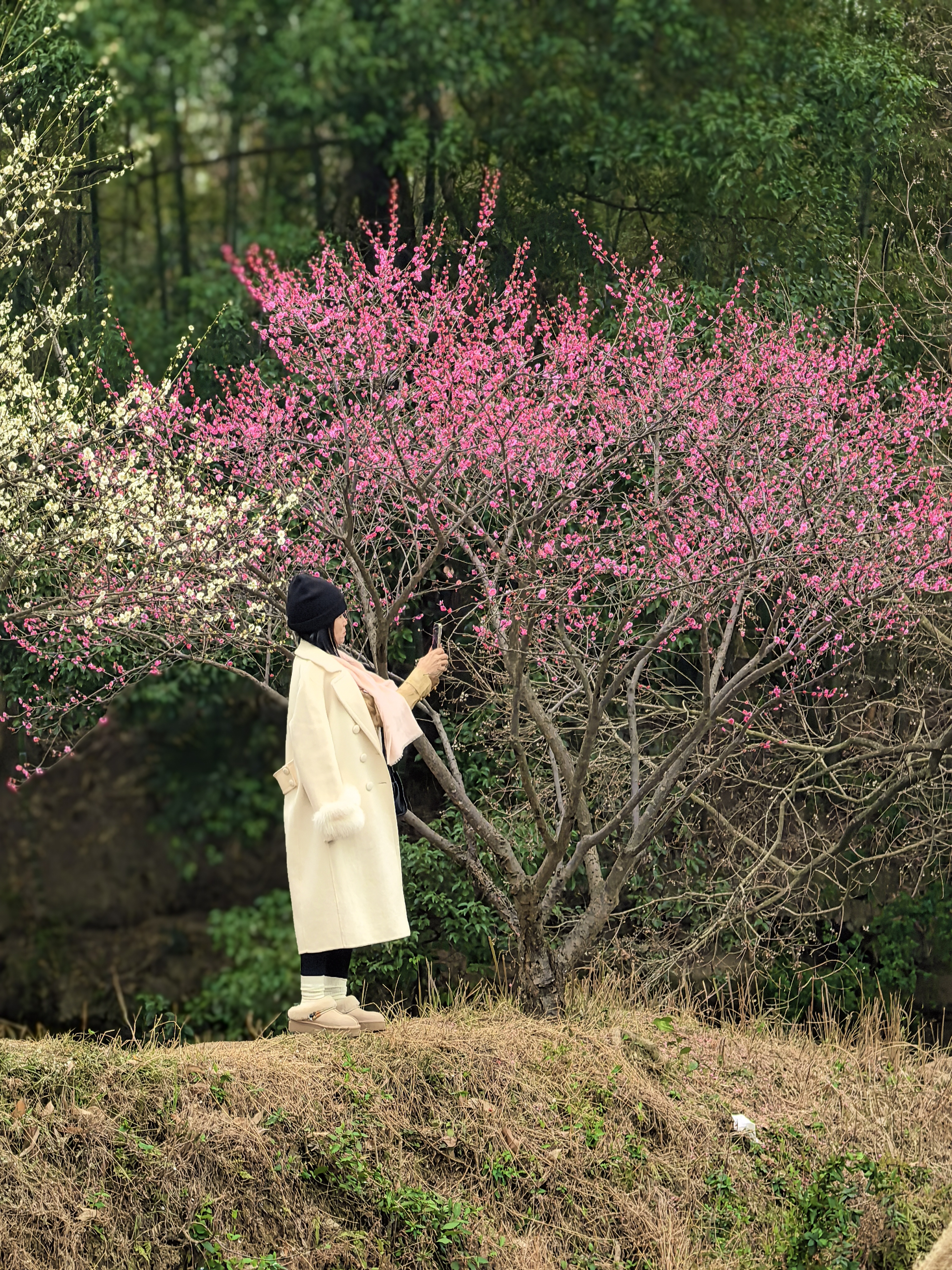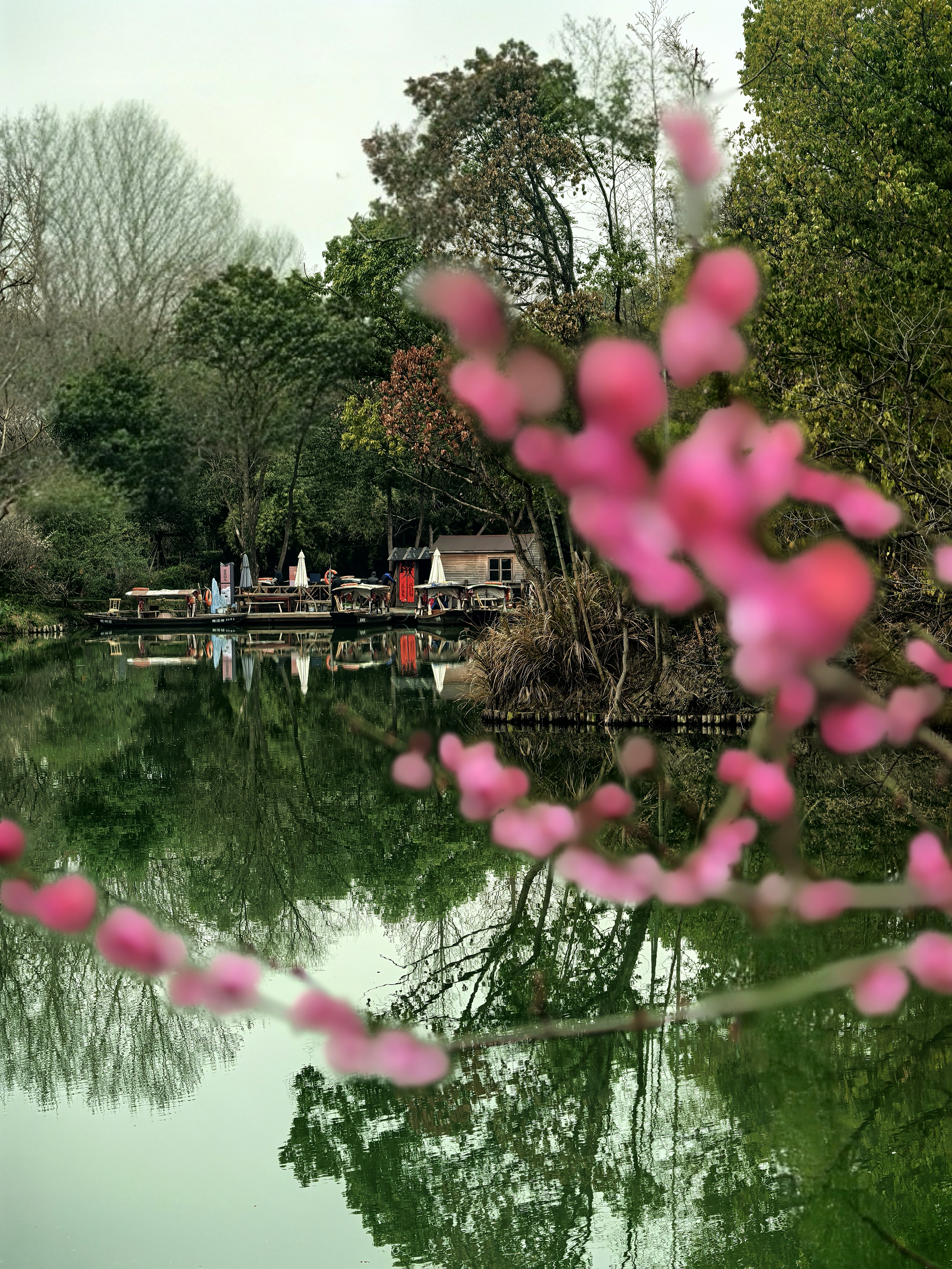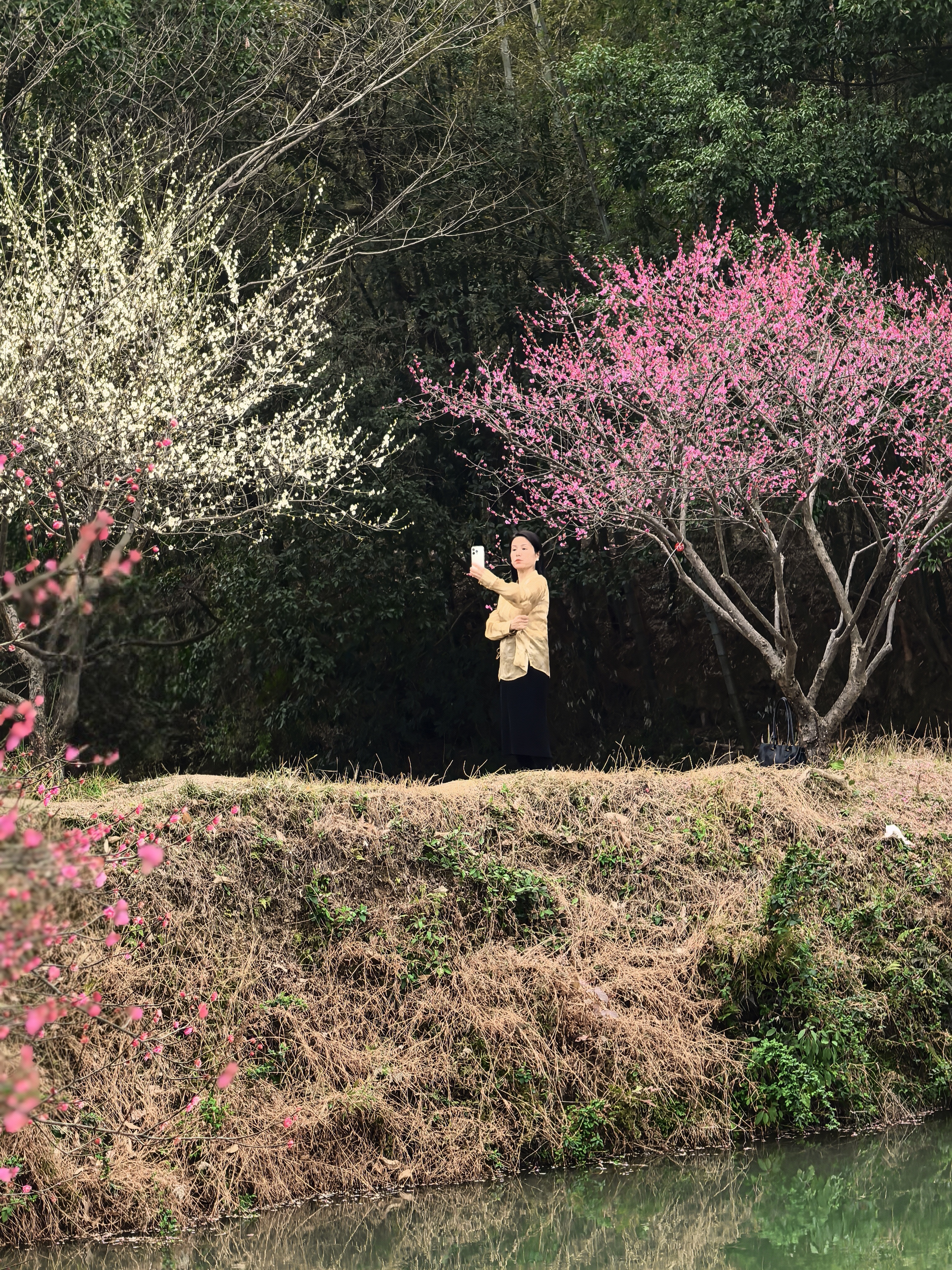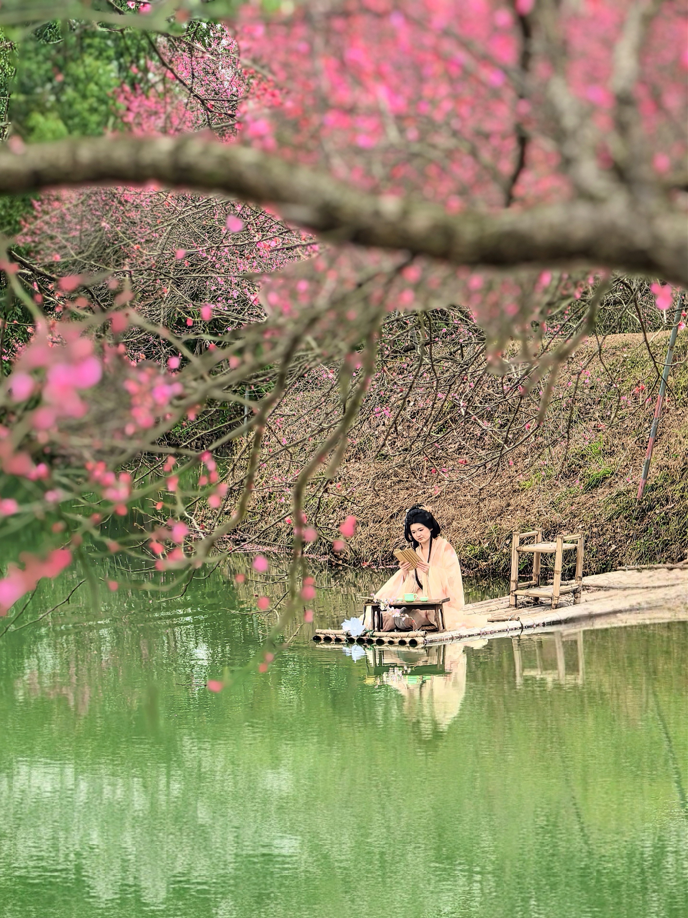 从梅竹山庄到茭庐山庄,是一条梅花夹岸的赏梅大道,梅花以一种磅礴的气势迎接着春天的到来。粉红的花海沿着蜿蜒的小径铺展,如云霞般绚烂,将冬日的萧瑟一扫而空。 翡翠般的河汊静静流淌,倒映着岸边的花影,一位身着素衣的女子泛舟其上,或静坐品茗,或轻抚横笛,那悠扬的笛声仿佛在与花语低吟,为这静谧的湿地增添了诗意。 岸边,鲜红的梅朵热烈绽放,与脚下枯黄的苇草交织在一起,新发的柳芽也悄悄探出头来,嫩绿的枝条轻拂水面。这枯荣交替、新旧更迭的景象,正是季节转换最生动的注脚。