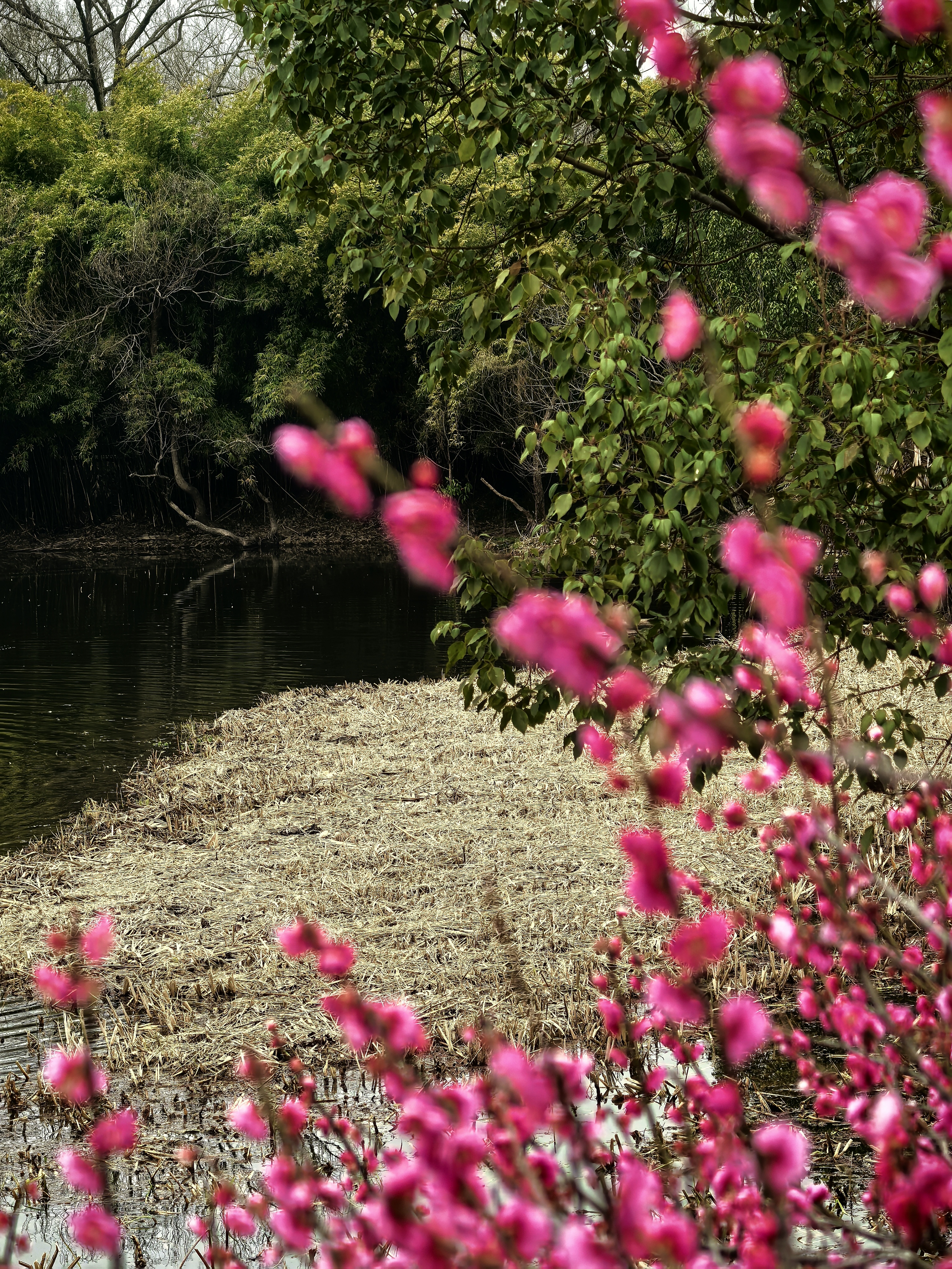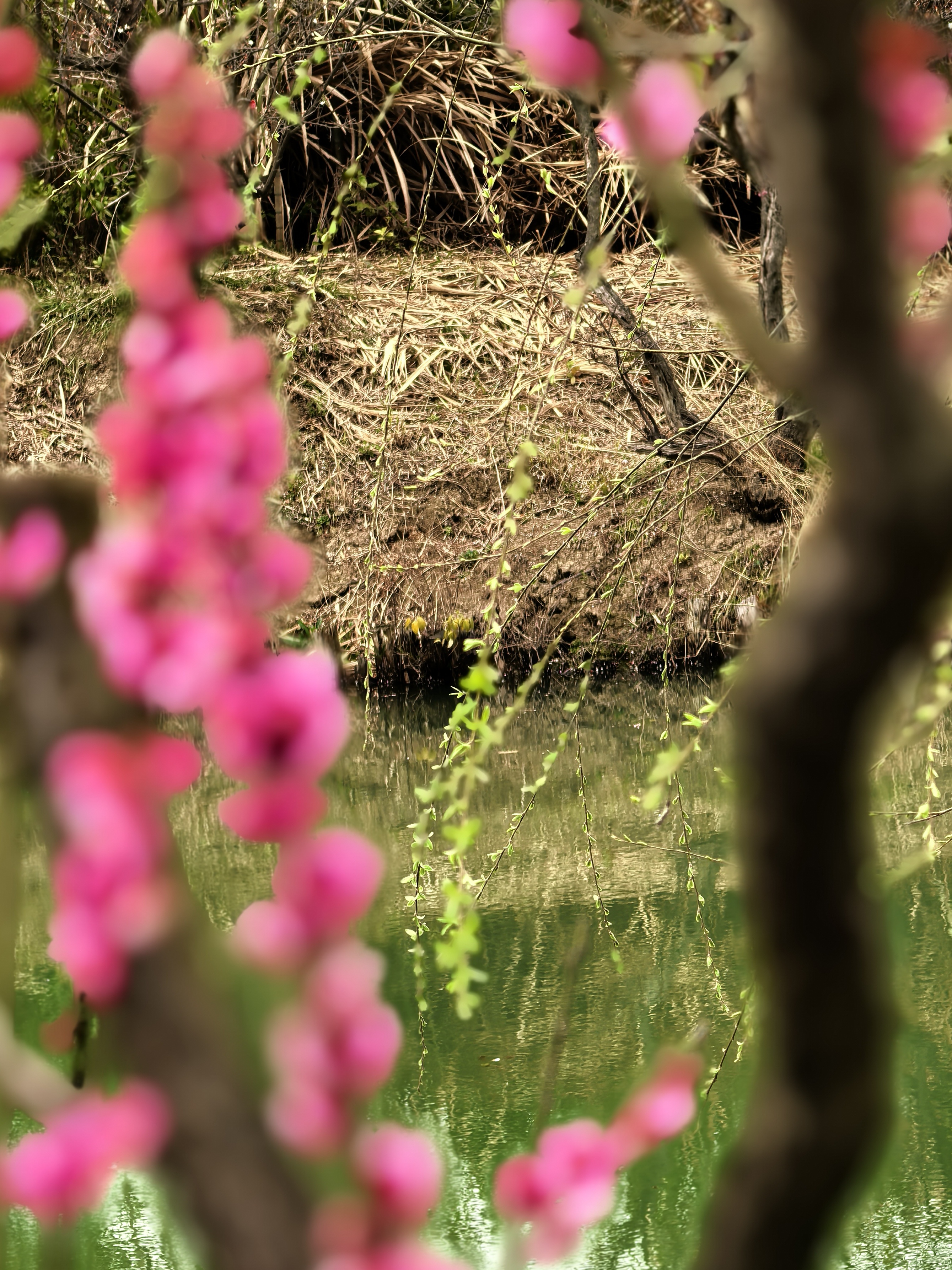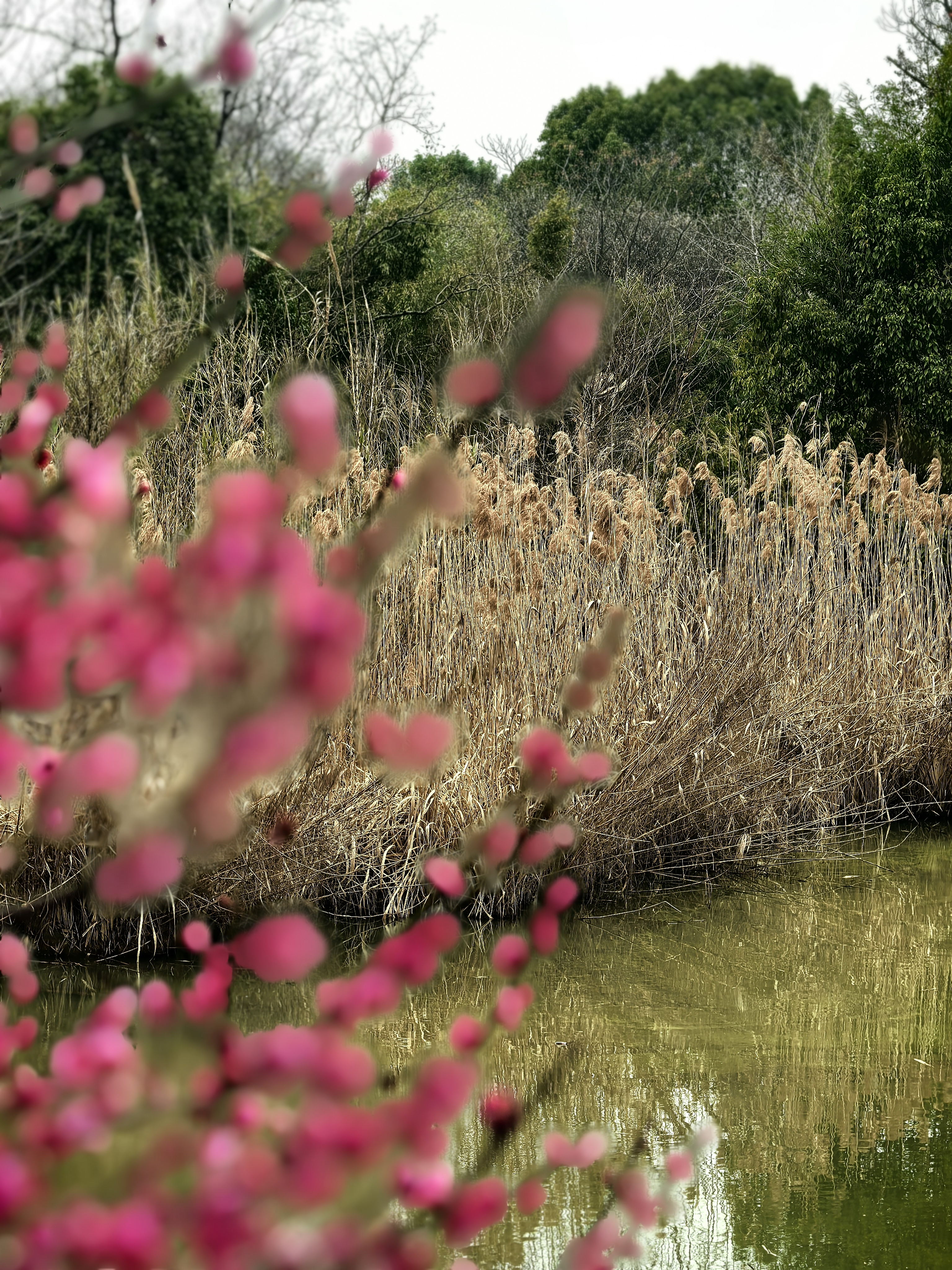 从梅竹山庄到茭庐山庄,是一条梅花夹岸的赏梅大道,梅花以一种磅礴的气势迎接着春天的到来。粉红的花海沿着蜿蜒的小径铺展,如云霞般绚烂,将冬日的萧瑟一扫而空。 翡翠般的河汊静静流淌,倒映着岸边的花影,一位身着素衣的女子泛舟其上,或静坐品茗,或轻抚横笛,那悠扬的笛声仿佛在与花语低吟,为这静谧的湿地增添了诗意。 岸边,鲜红的梅朵热烈绽放,与脚下枯黄的苇草交织在一起,新发的柳芽也悄悄探出头来,嫩绿的枝条轻拂水面。这枯荣交替、新旧更迭的景象,正是季节转换最生动的注脚。
