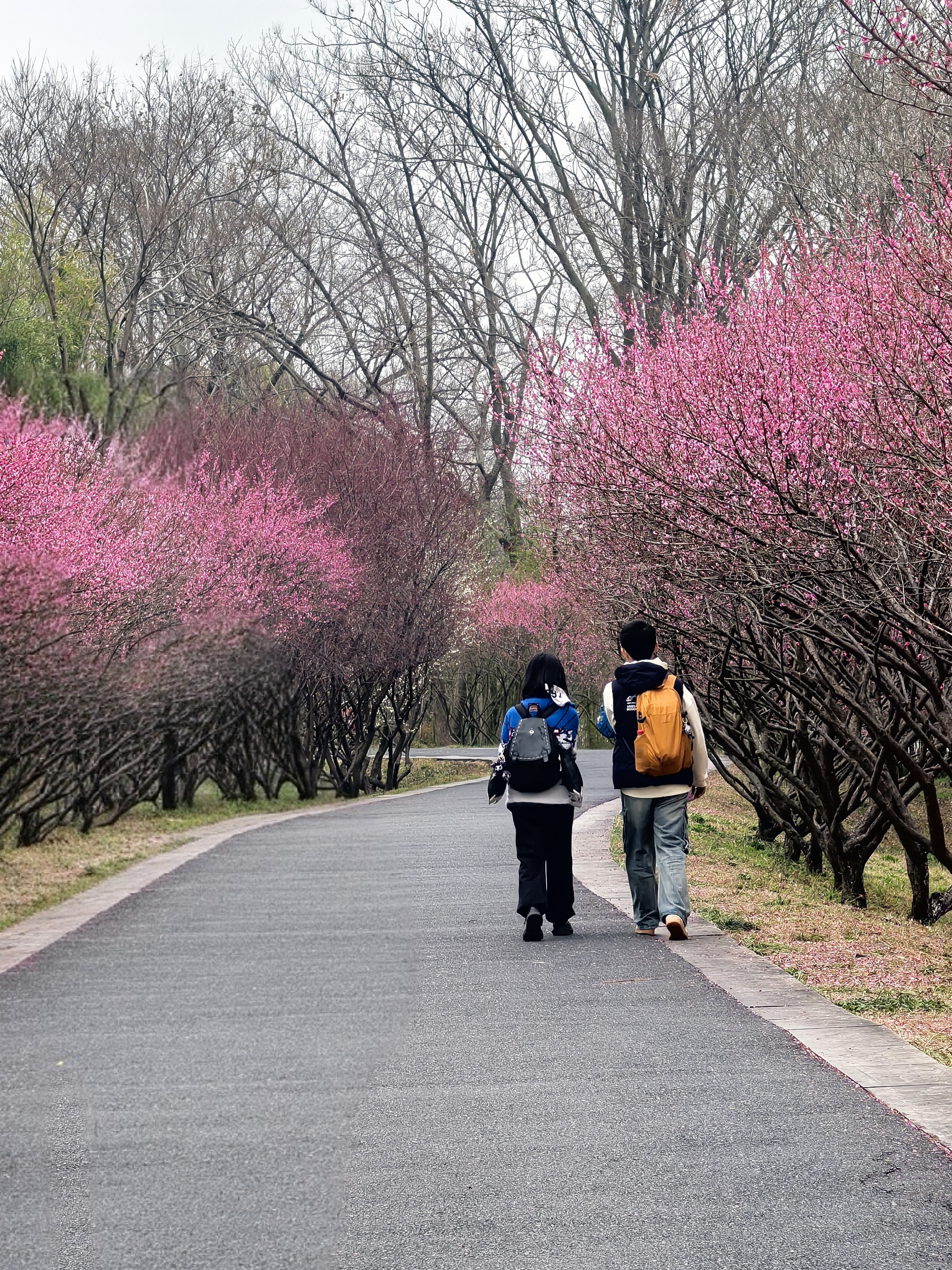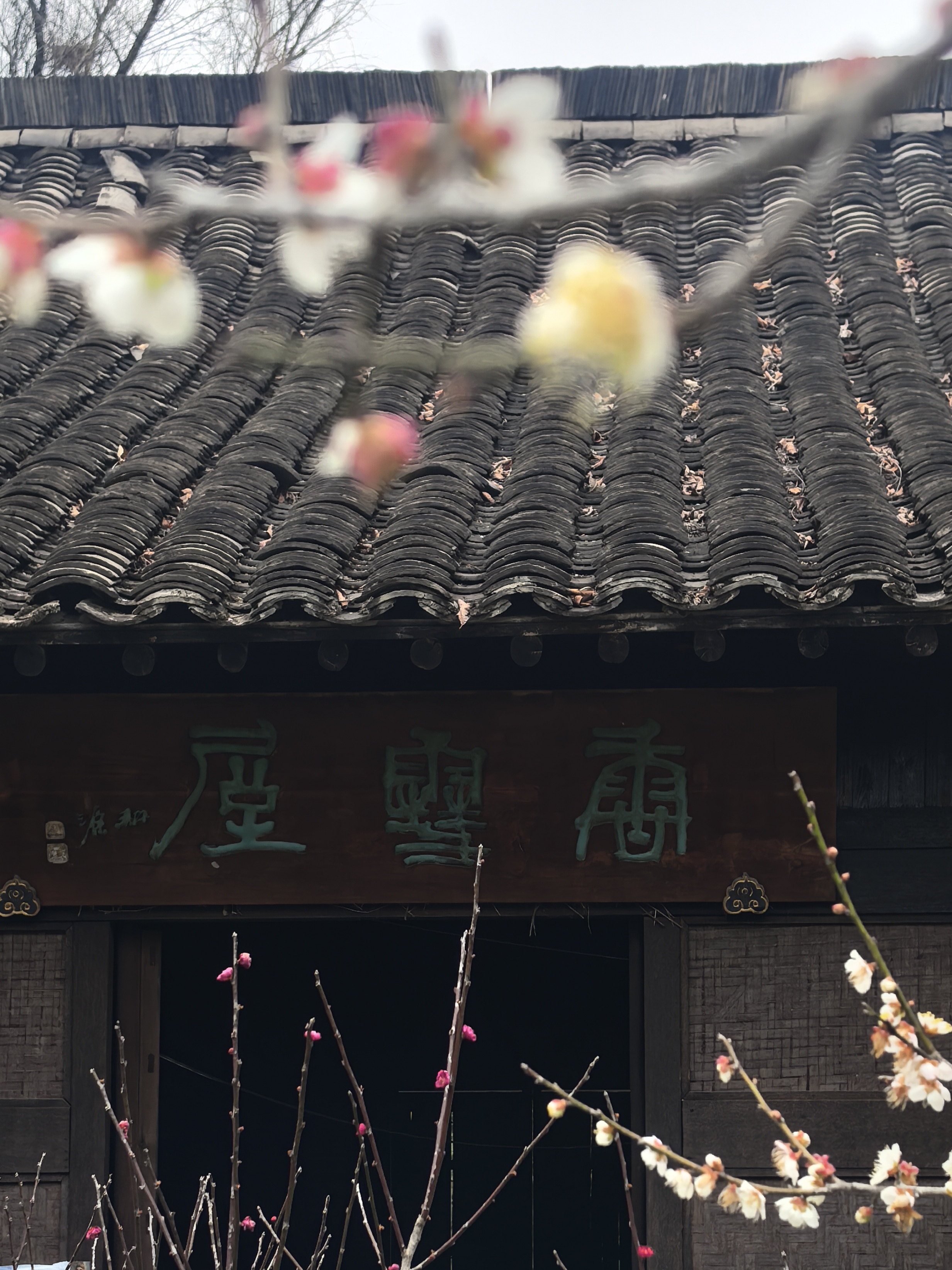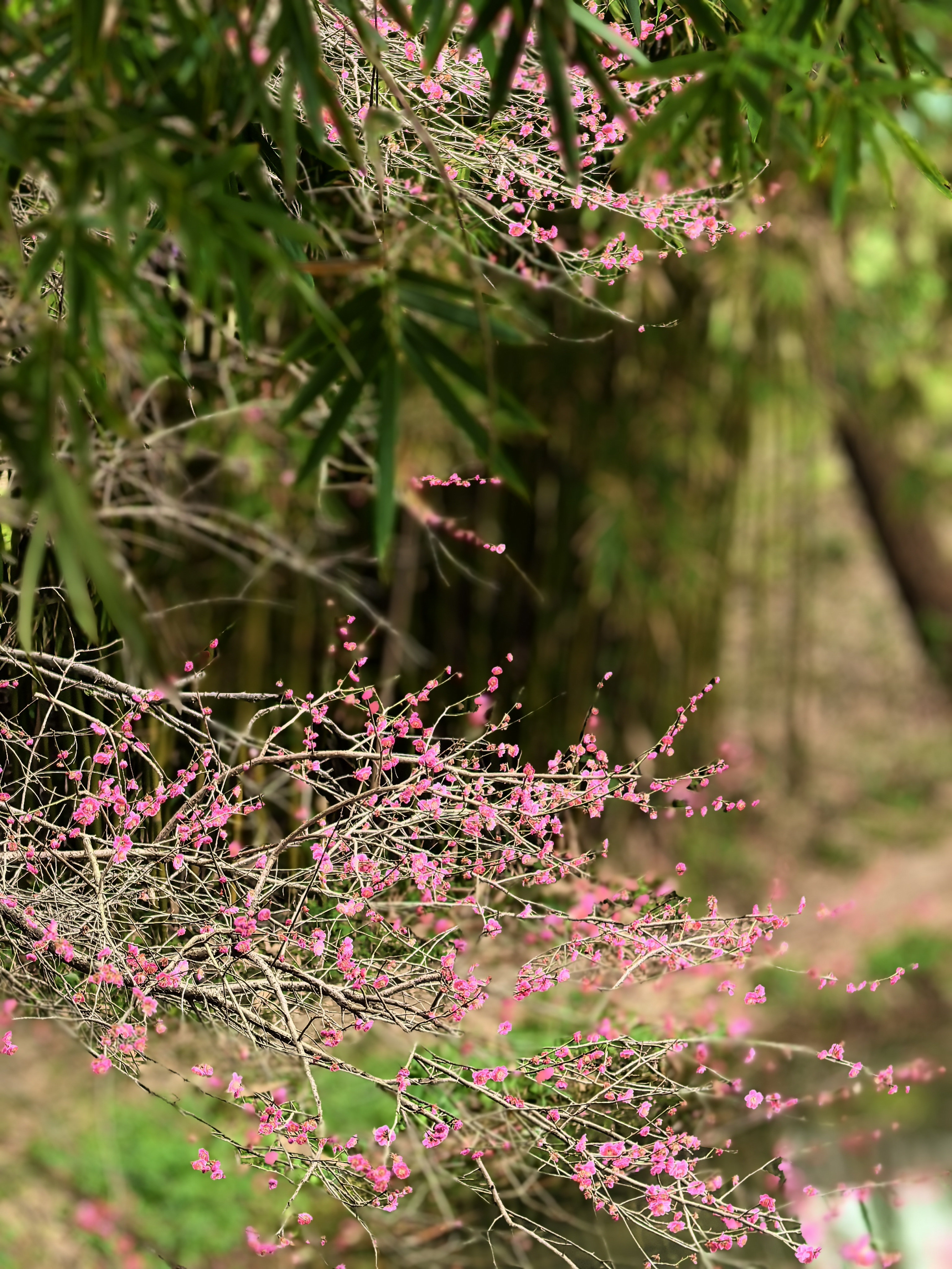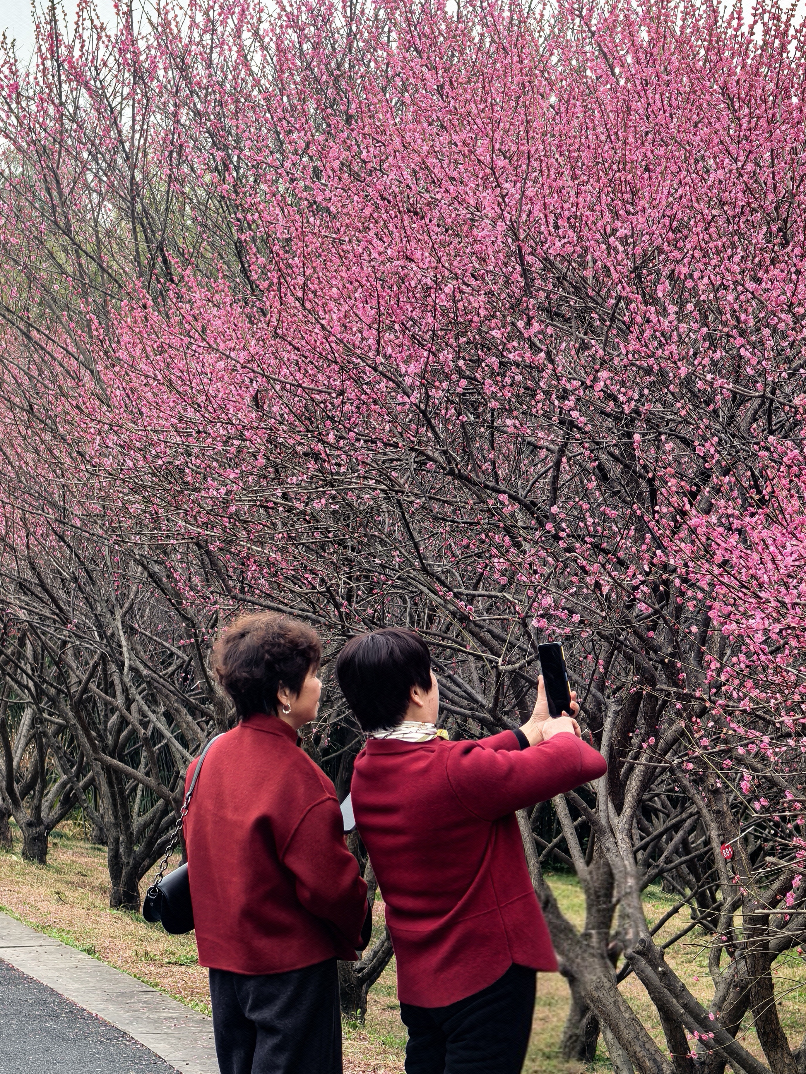 从梅竹山庄到茭庐山庄,是一条梅花夹岸的赏梅大道,梅花以一种磅礴的气势迎接着春天的到来。粉红的花海沿着蜿蜒的小径铺展,如云霞般绚烂,将冬日的萧瑟一扫而空。 翡翠般的河汊静静流淌,倒映着岸边的花影,一位身着素衣的女子泛舟其上,或静坐品茗,或轻抚横笛,那悠扬的笛声仿佛在与花语低吟,为这静谧的湿地增添了诗意。 岸边,鲜红的梅朵热烈绽放,与脚下枯黄的苇草交织在一起,新发的柳芽也悄悄探出头来,嫩绿的枝条轻拂水面。这枯荣交替、新旧更迭的景象,正是季节转换最生动的注脚。