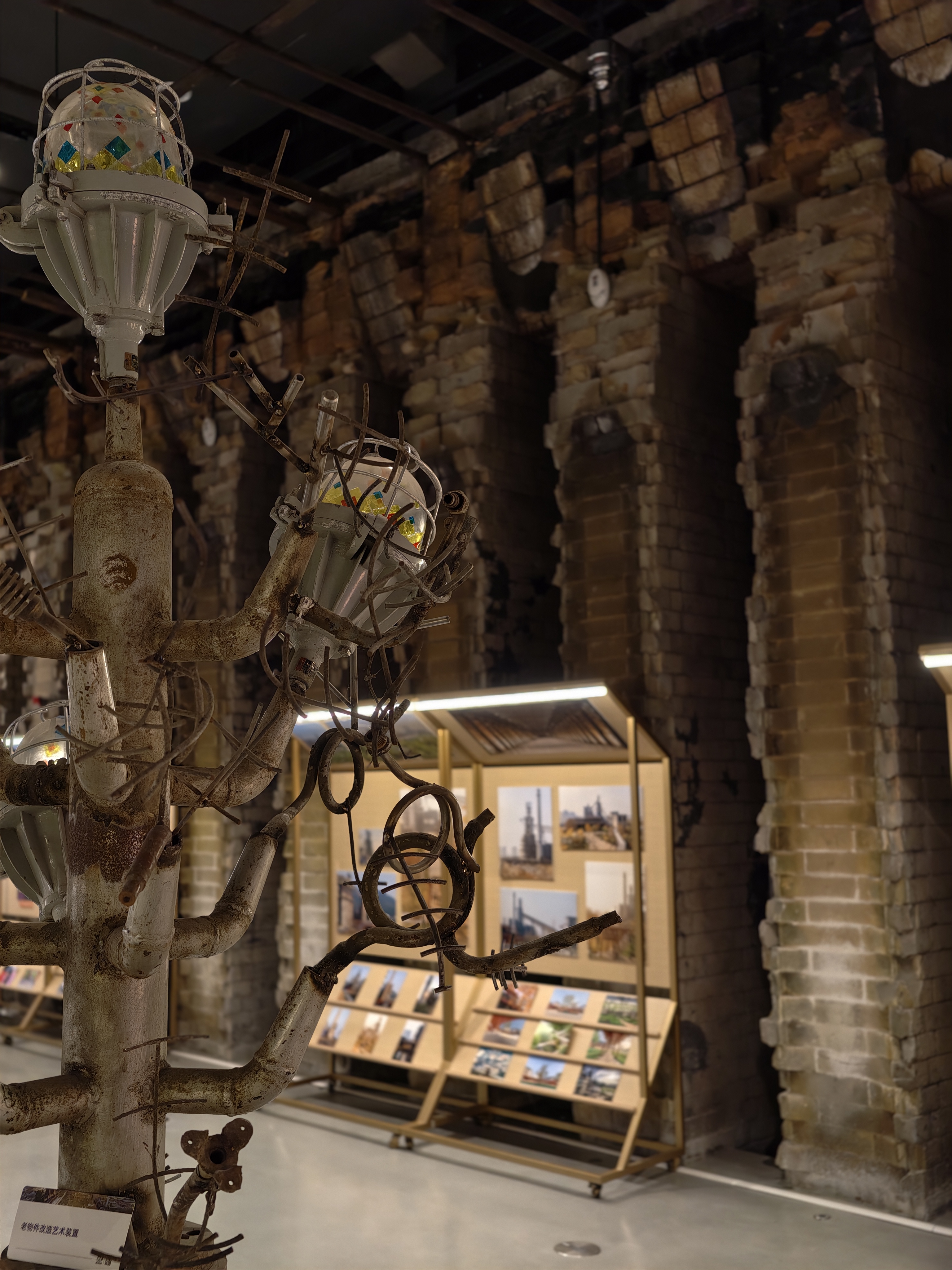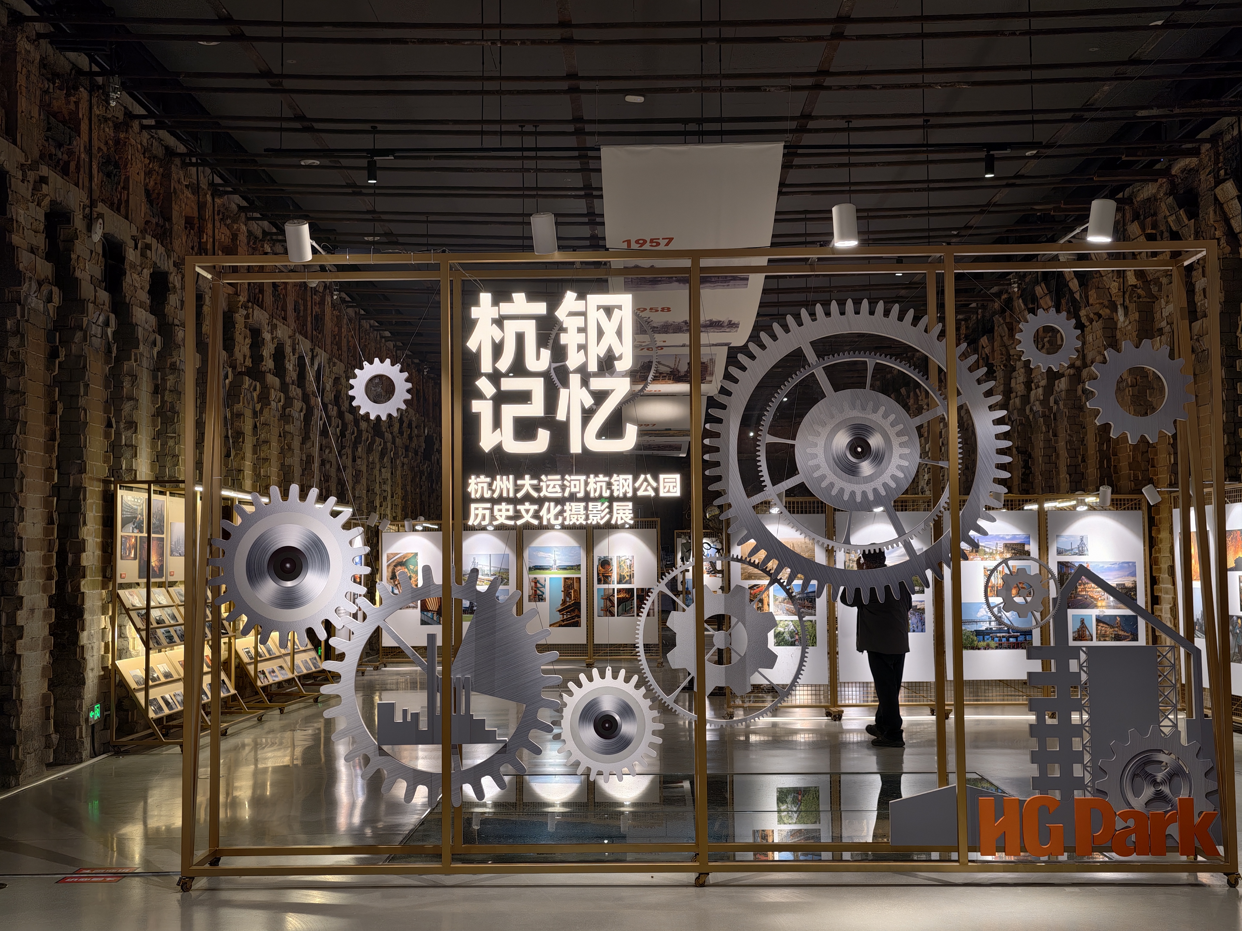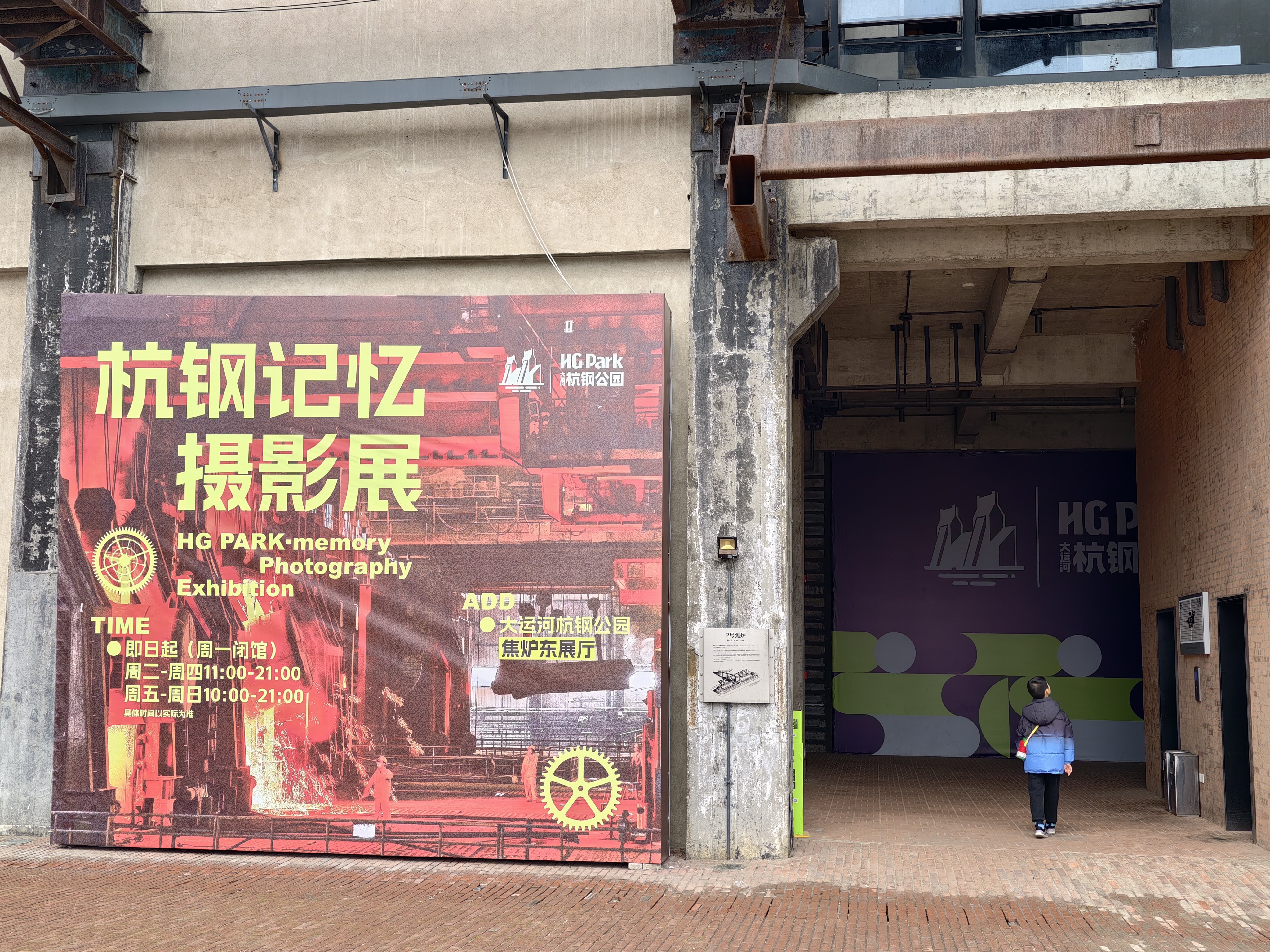 杭钢公园里有一个杭钢记忆摄影展,里面有许多杭钢厂里的老物件。如老的照明灯、老车间的墙与一些标记等等。