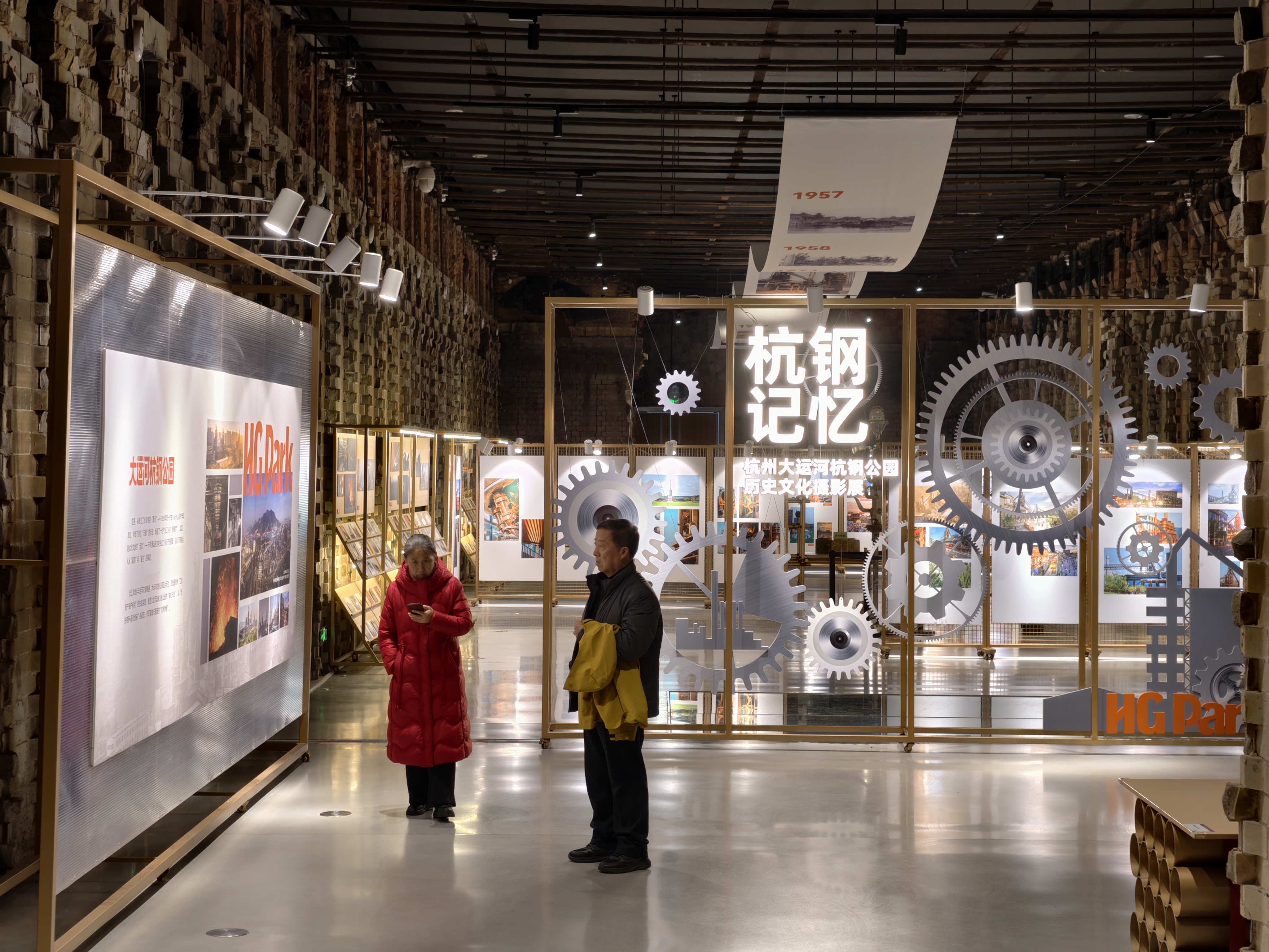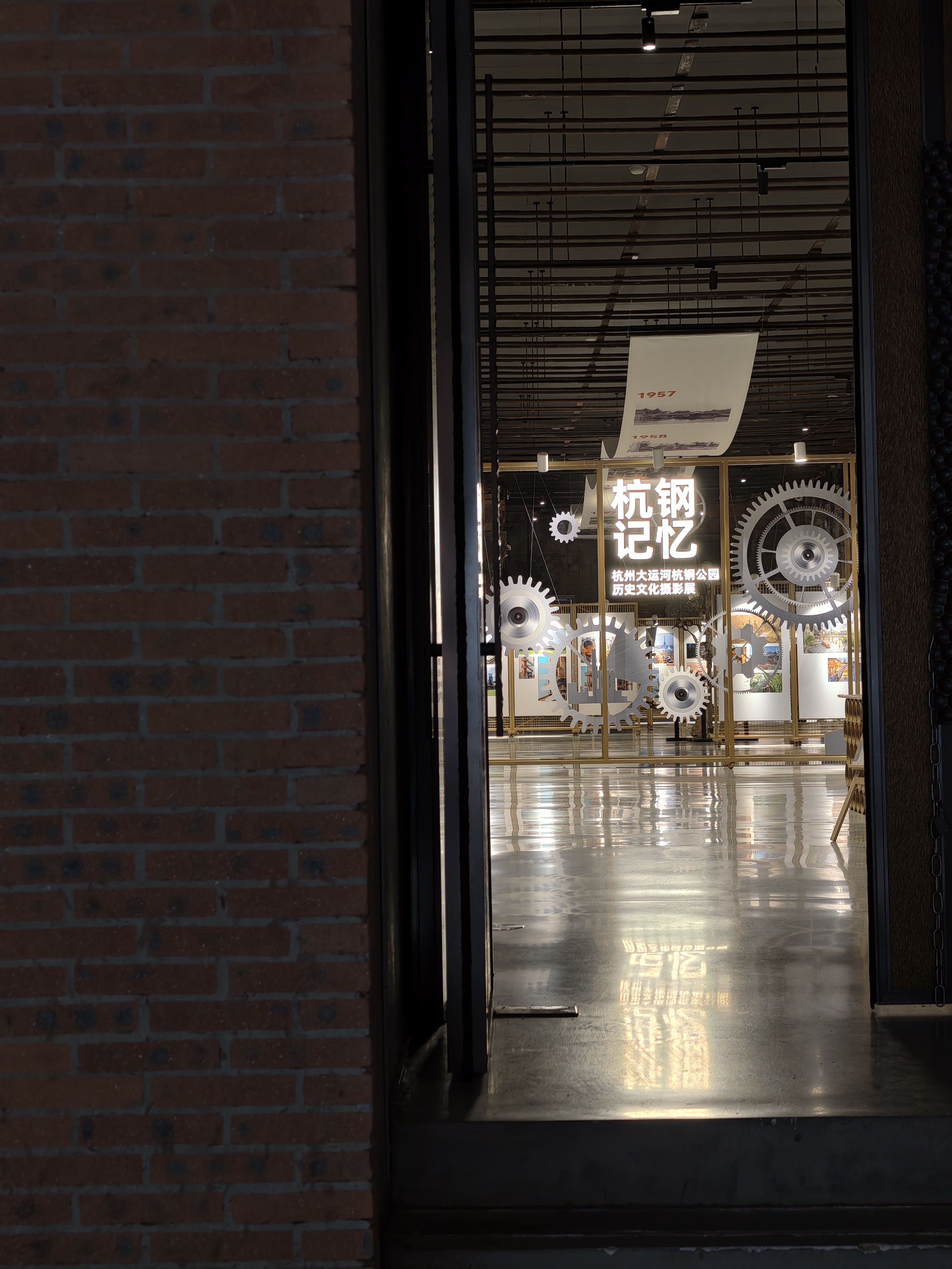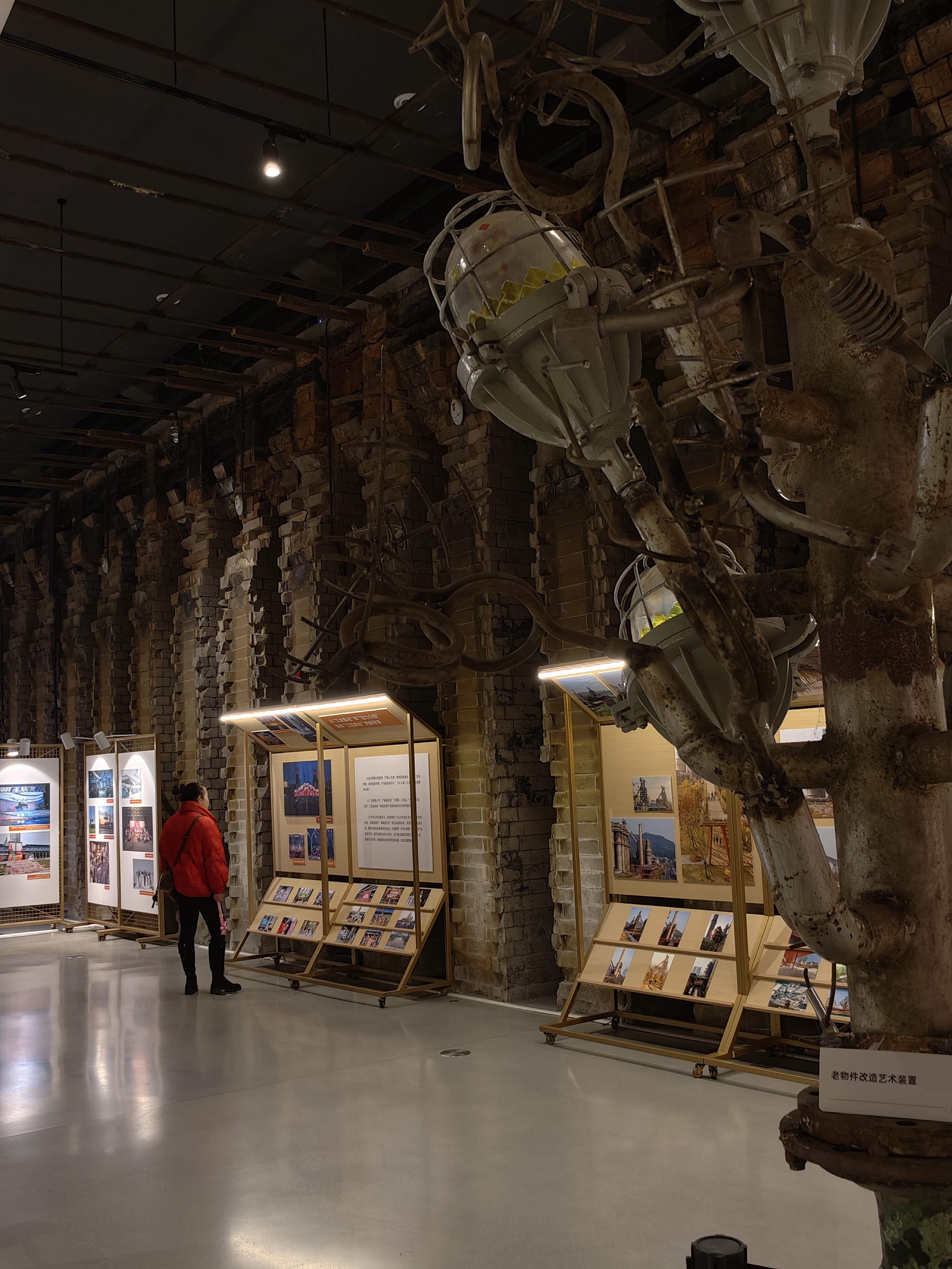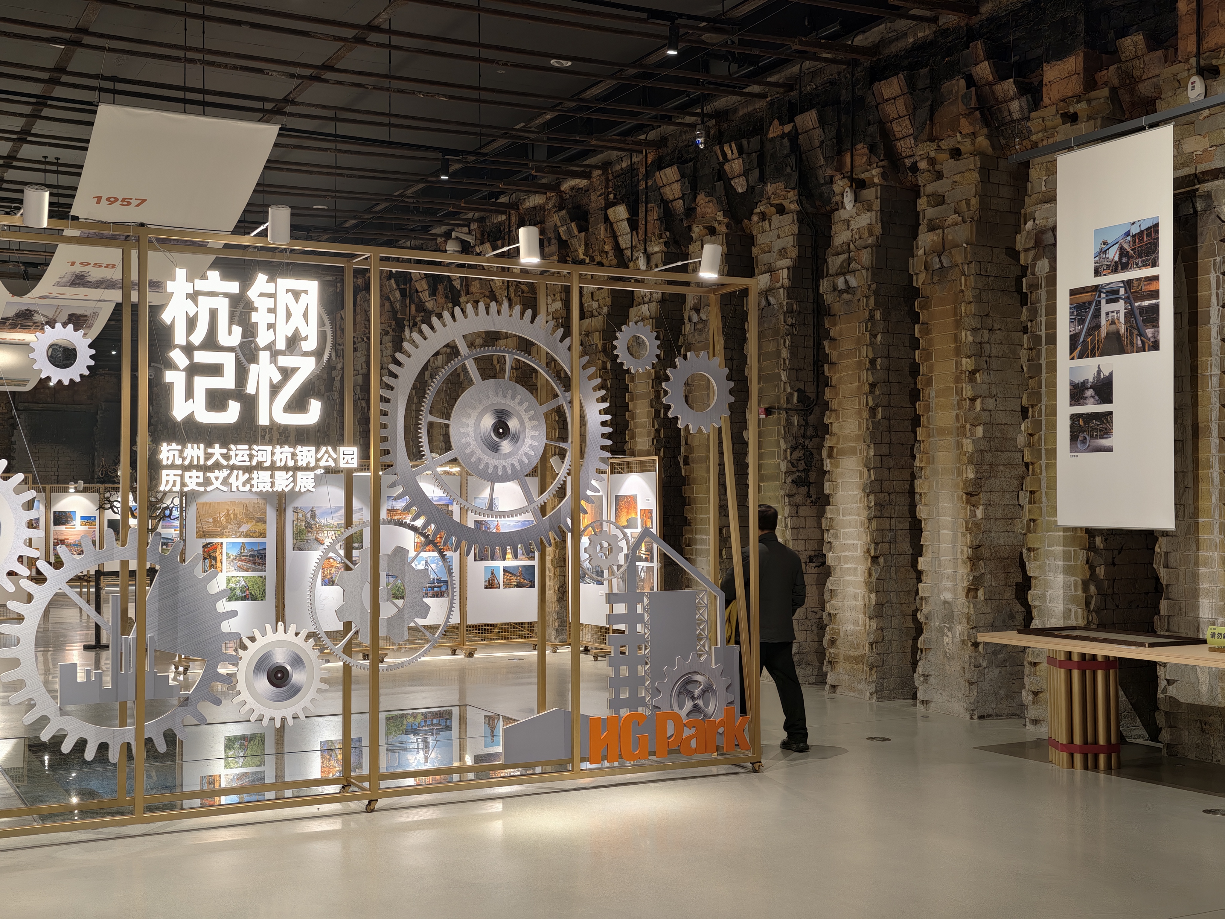杭钢公园里有一个杭钢记忆摄影展,里面有许多杭钢厂里的老物件。如老的照明灯、老车间的墙与一些标记等等。