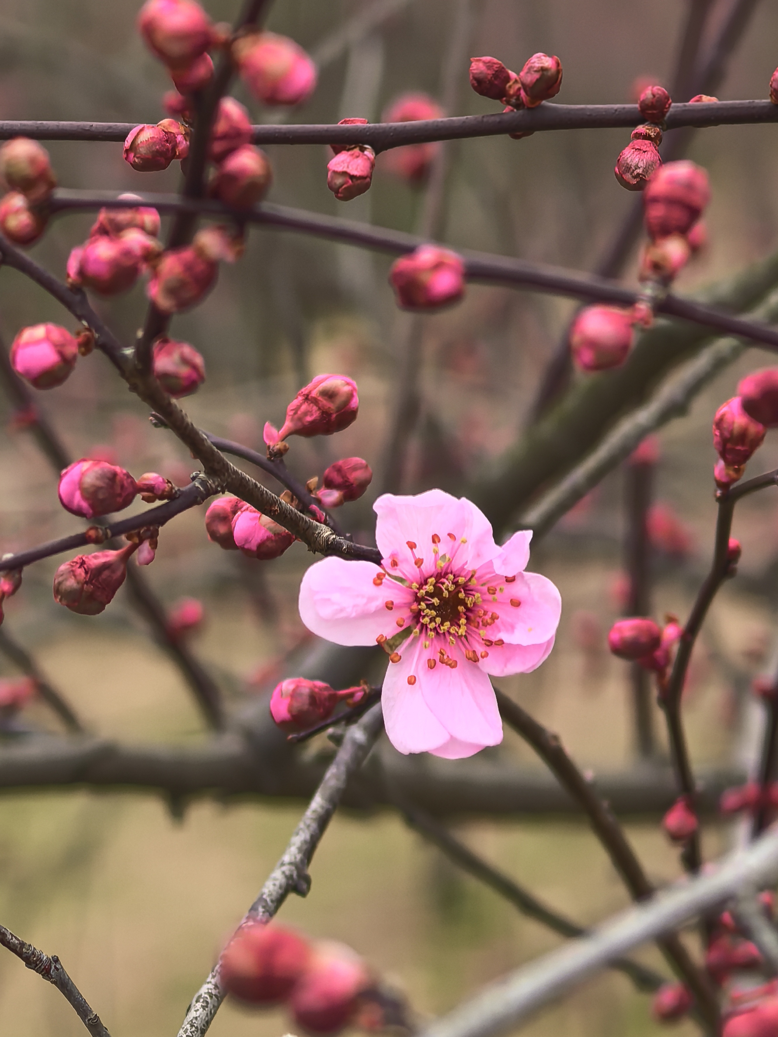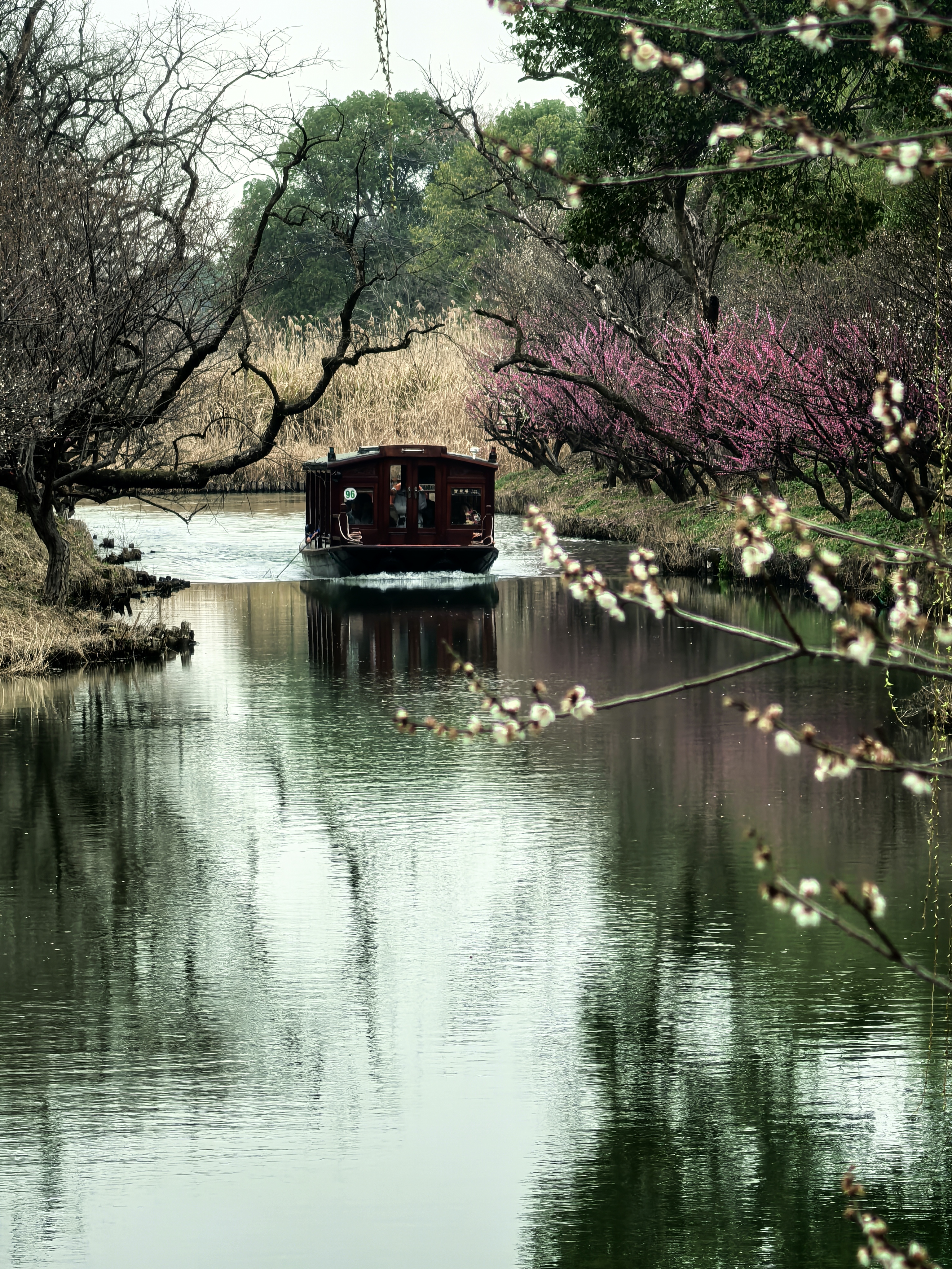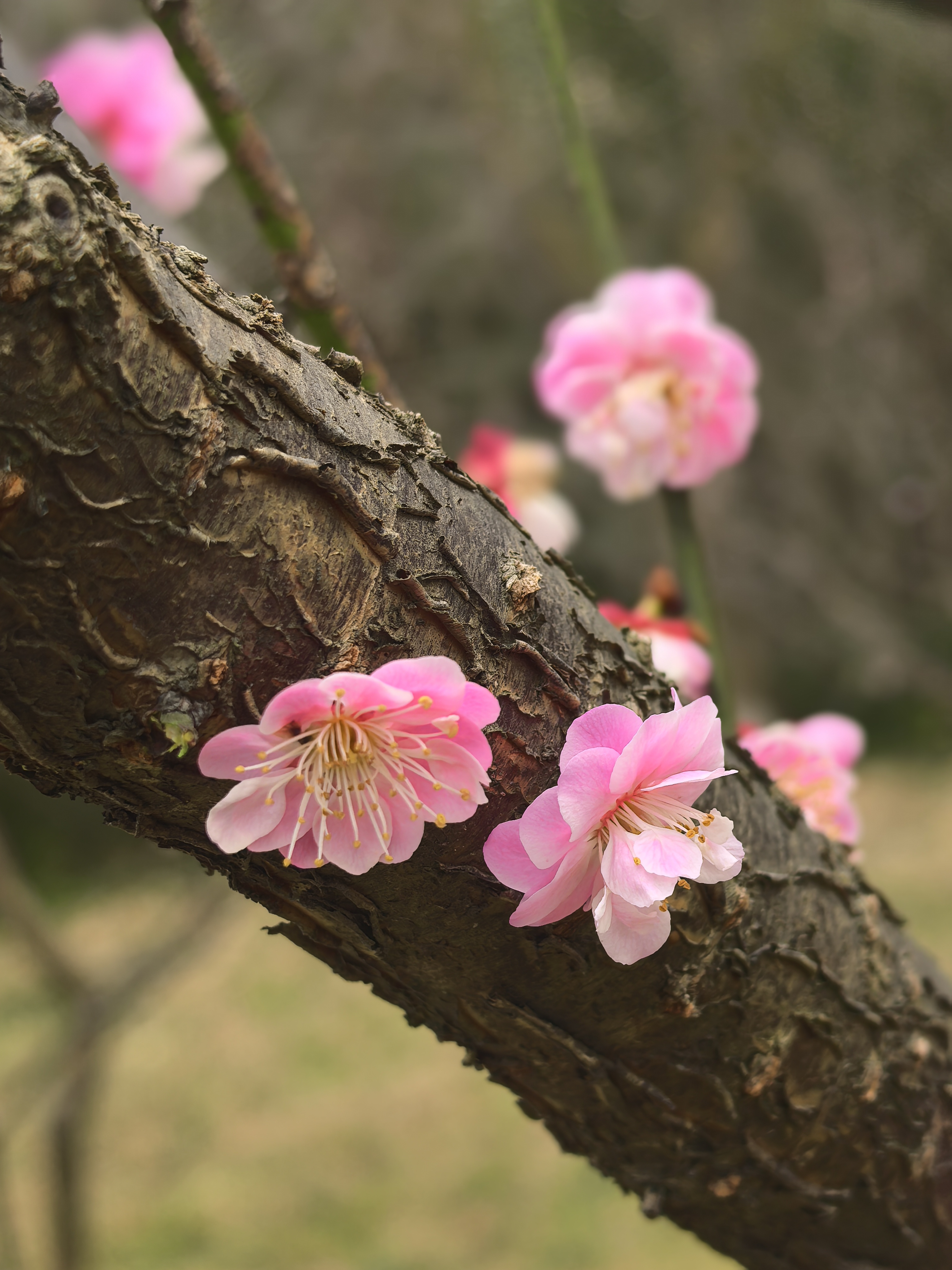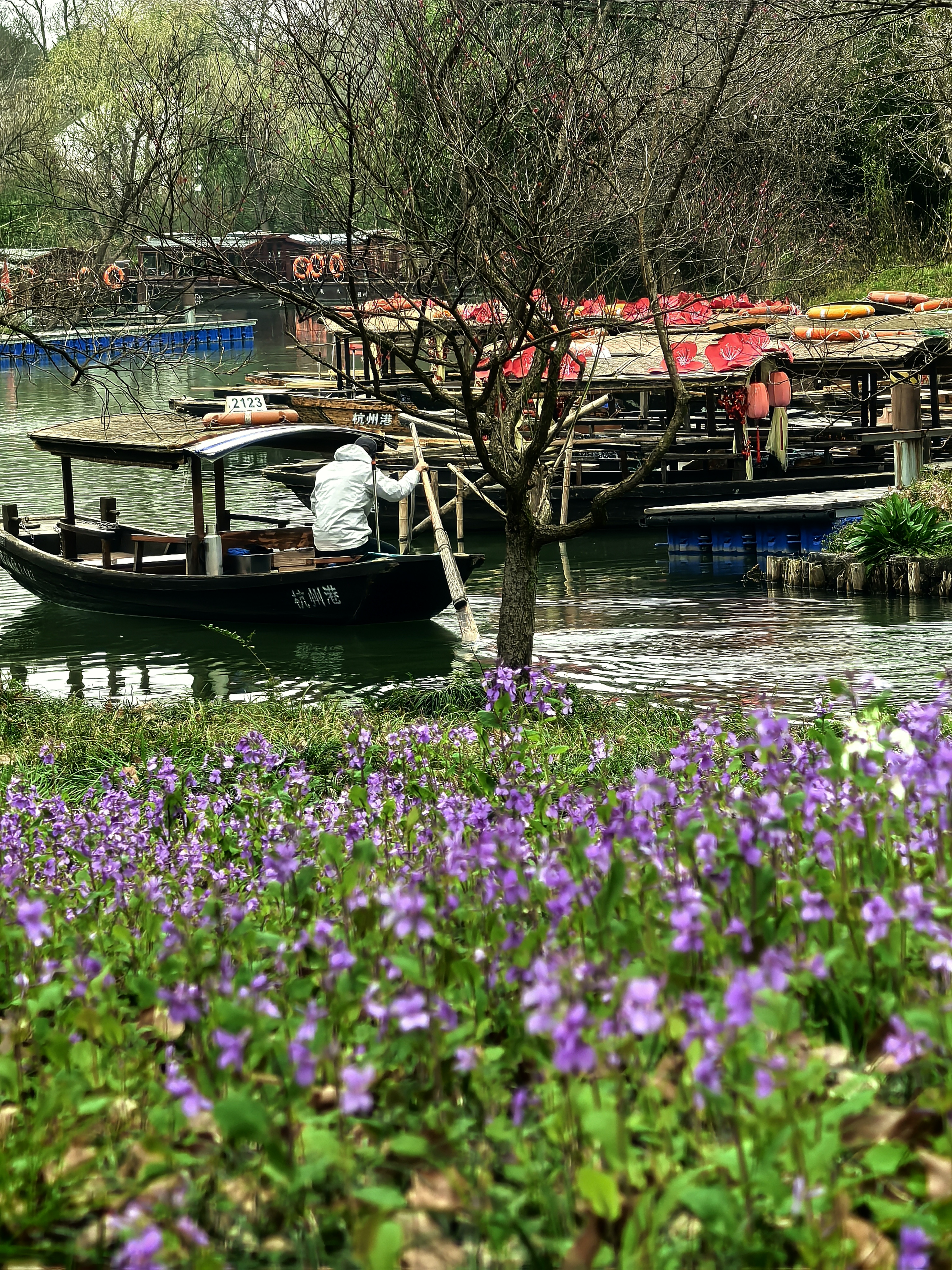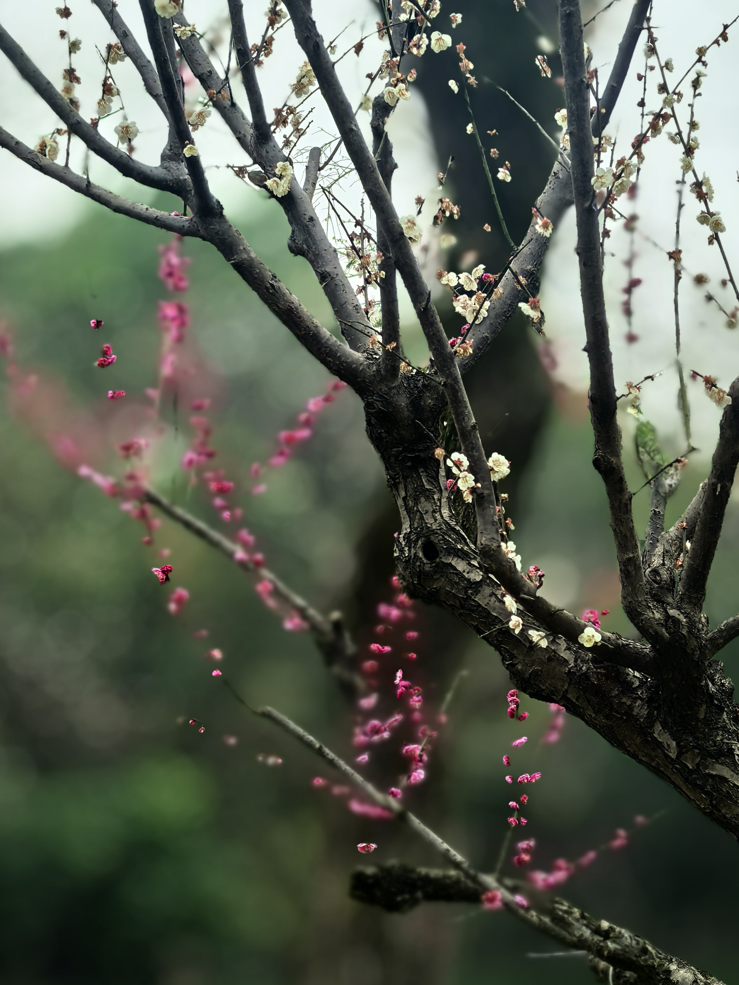 西溪的多数梅花,花期已经过半,盛开以后的梅花花香大减了。临水处先嗅到一缕清极的香,寻香探去,原来是好多株的玉蝶梅,正零零星星地开着。 身旁别的梅已谢了大半,它却才从冬梦里惺忪初醒,更奇的是,那柔粉的花,竟不生于细枝梢头,偏从黝黑粗砺的老干上直接挣出来,仿佛沧桑的臂膀,能安放娇嫩的梦。 盛放的那几朵,瓣儿薄如绡纱,透着一痕水粉,中间细细的蕊,挑着一点鹅黄;旁边紧挨的,却是圆鼓鼓的海棠似的蕾,深粉里裹着无限的密意。一开一合,一老一嫩,同在这铁画银钩的枝上,静默相对,像是岁月在低语,说着将尽未尽、方生未生的禅机。 不远处,美人梅也盈盈的。那是梅与红叶李的孩儿,继承了梅的香魂,又添了三分秾丽,团团簇簇,笑在微凉的春风里,明媚得毫无心事。 湿地静卧,水流无声,二月兰匍匐在地上更加卑微到尘土里。这个时候在游人眼里,只有树上的朵朵梅花,哪个会低下身段正眼瞧一下二月兰呢?西溪的纵横河汊边,只这玉蝶的幽古与美人梅的新艳,在蒙蒙水烟中,洇出一幅深浅有致的早春长卷。