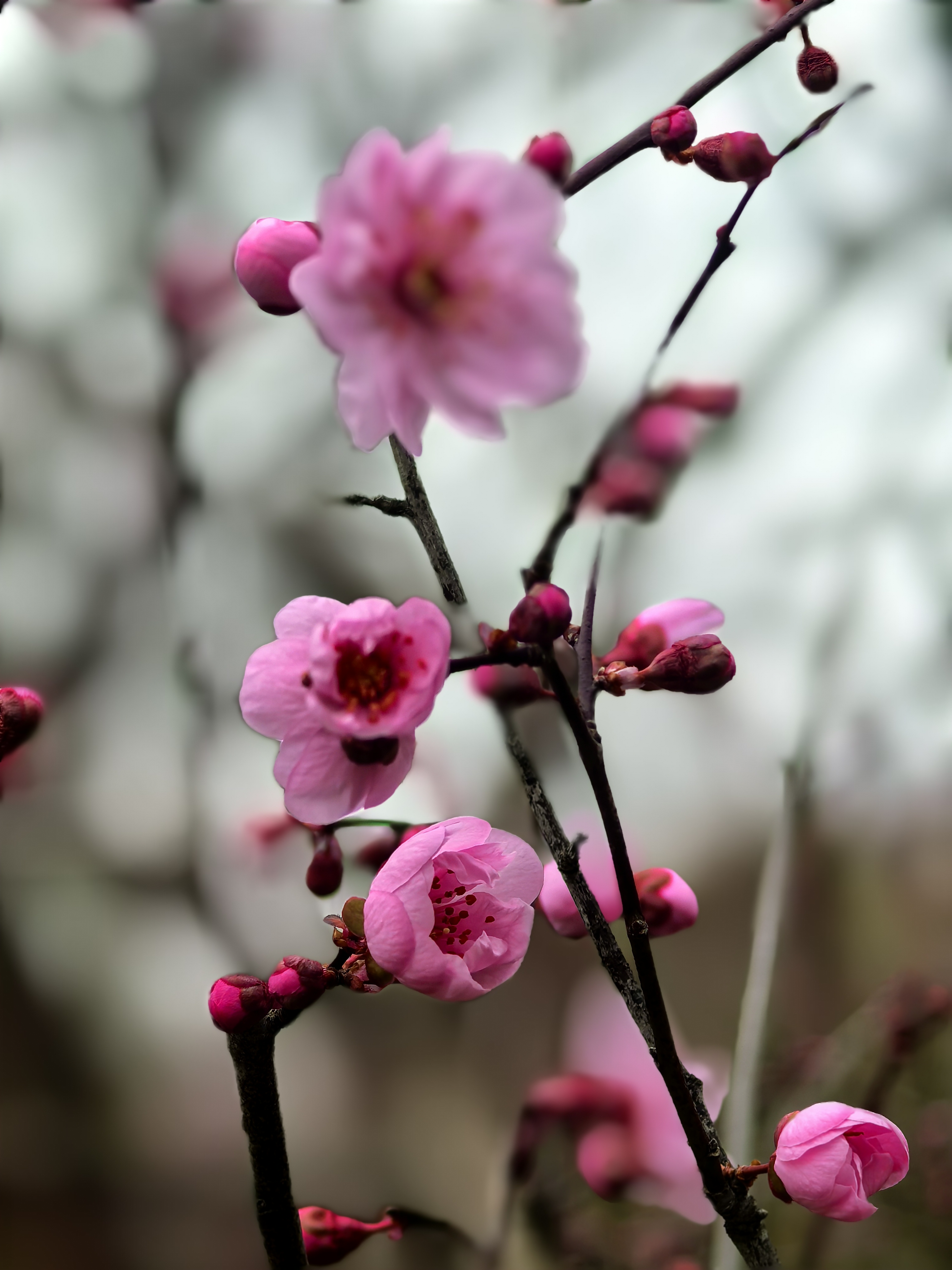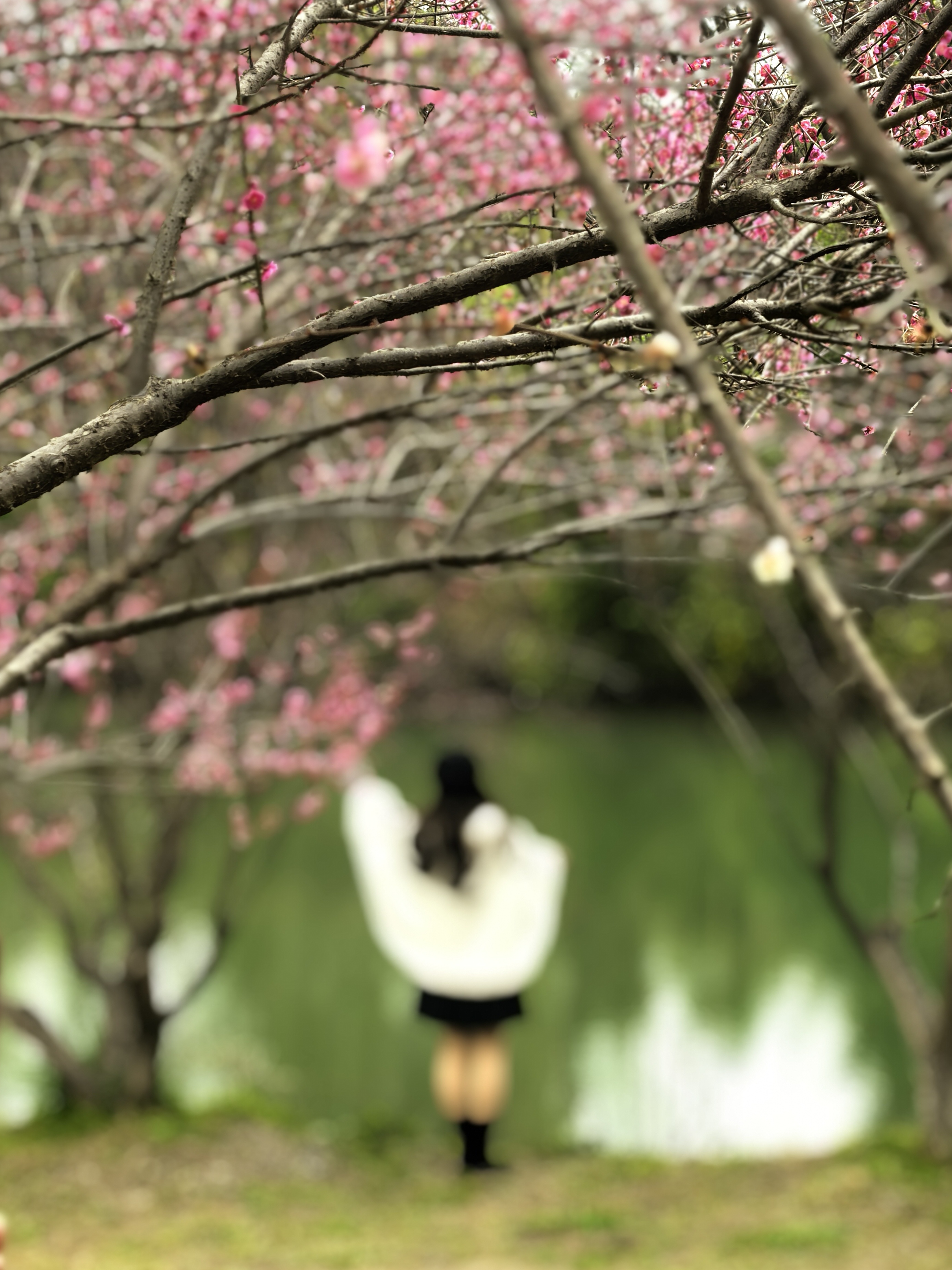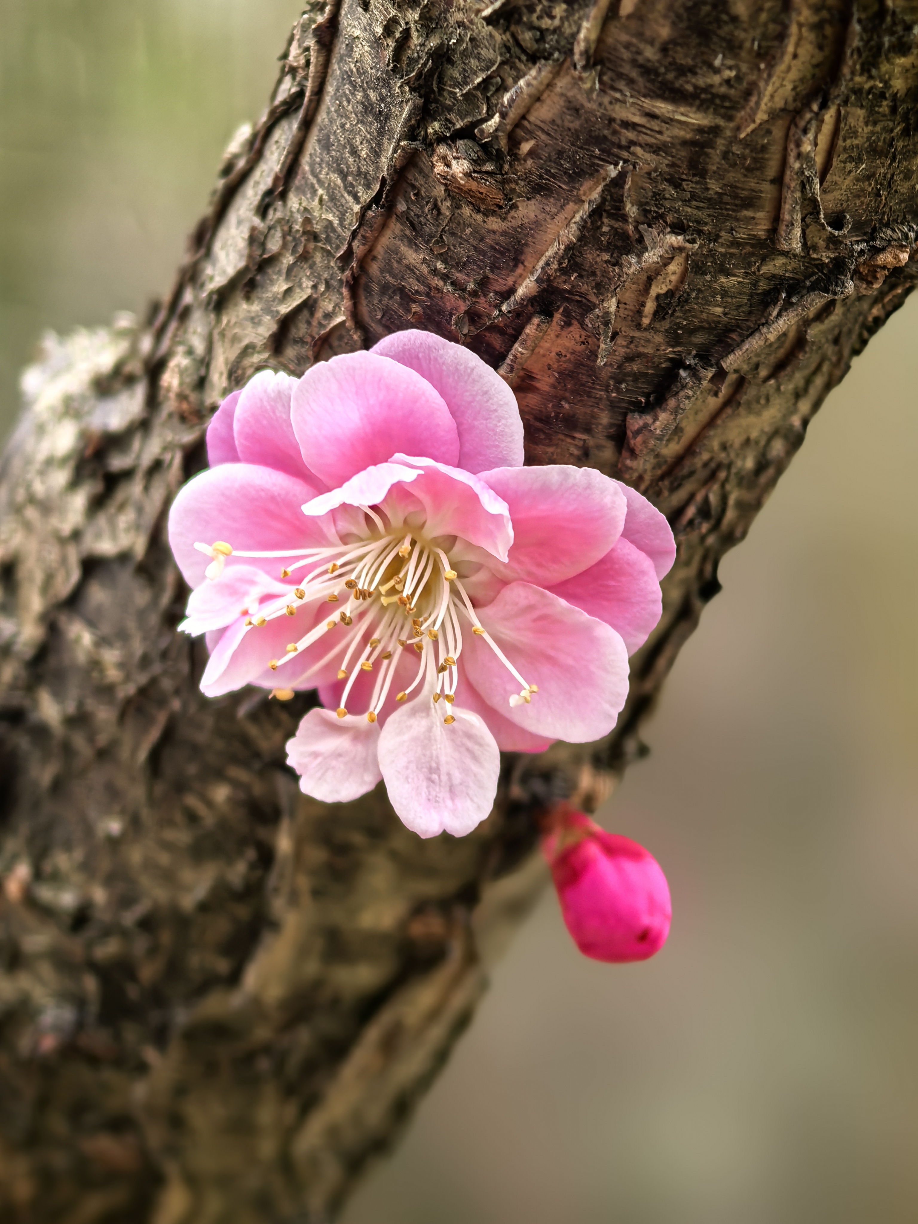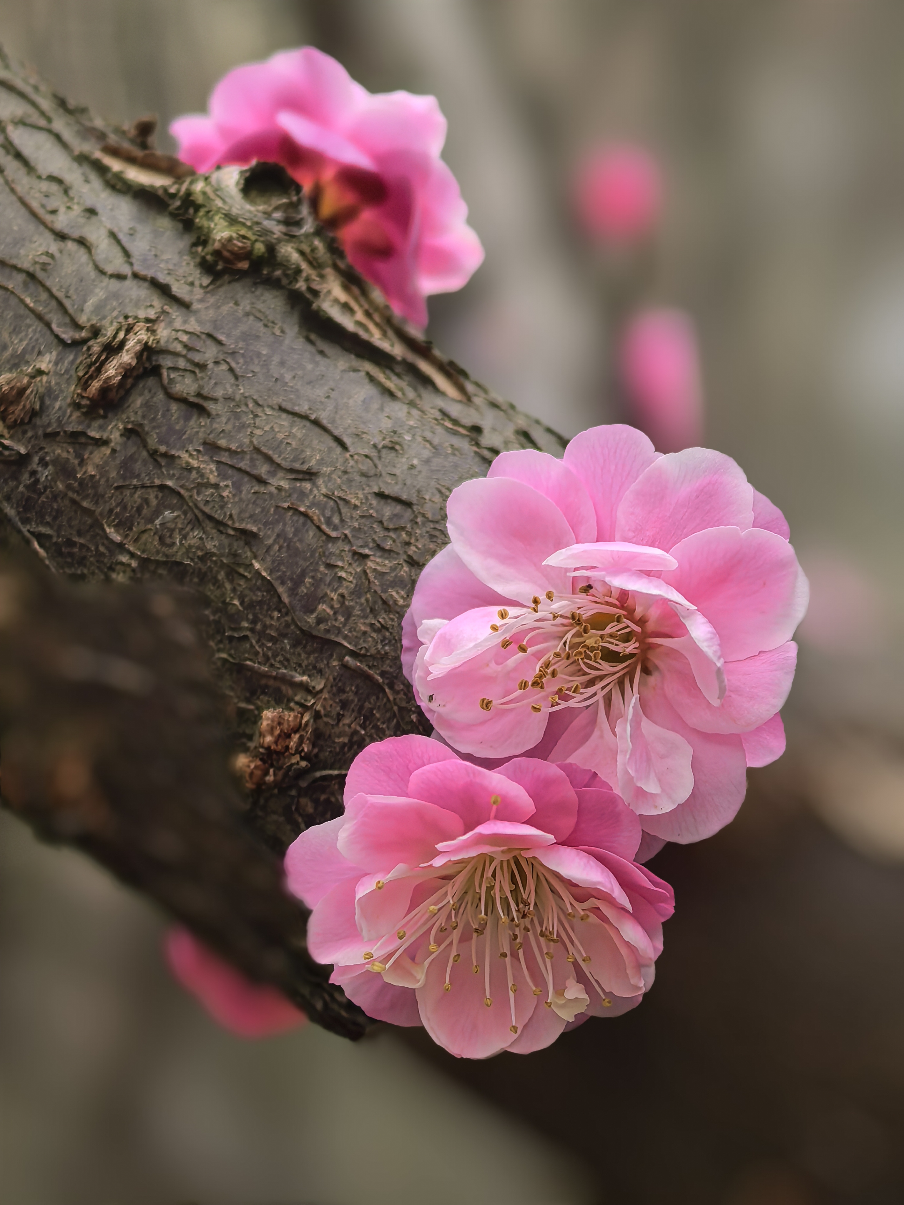 西溪的多数梅花,花期已经过半,盛开以后的梅花花香大减了。临水处先嗅到一缕清极的香,寻香探去,原来是好多株的玉蝶梅,正零零星星地开着。 身旁别的梅已谢了大半,它却才从冬梦里惺忪初醒,更奇的是,那柔粉的花,竟不生于细枝梢头,偏从黝黑粗砺的老干上直接挣出来,仿佛沧桑的臂膀,能安放娇嫩的梦。 盛放的那几朵,瓣儿薄如绡纱,透着一痕水粉,中间细细的蕊,挑着一点鹅黄;旁边紧挨的,却是圆鼓鼓的海棠似的蕾,深粉里裹着无限的密意。一开一合,一老一嫩,同在这铁画银钩的枝上,静默相对,像是岁月在低语,说着将尽未尽、方生未生的禅机。 不远处,美人梅也盈盈的。那是梅与红叶李的孩儿,继承了梅的香魂,又添了三分秾丽,团团簇簇,笑在微凉的春风里,明媚得毫无心事。 湿地静卧,水流无声,二月兰匍匐在地上更加卑微到尘土里。这个时候在游人眼里,只有树上的朵朵梅花,哪个会低下身段正眼瞧一下二月兰呢?西溪的纵横河汊边,只这玉蝶的幽古与美人梅的新艳,在蒙蒙水烟中,洇出一幅深浅有致的早春长卷。