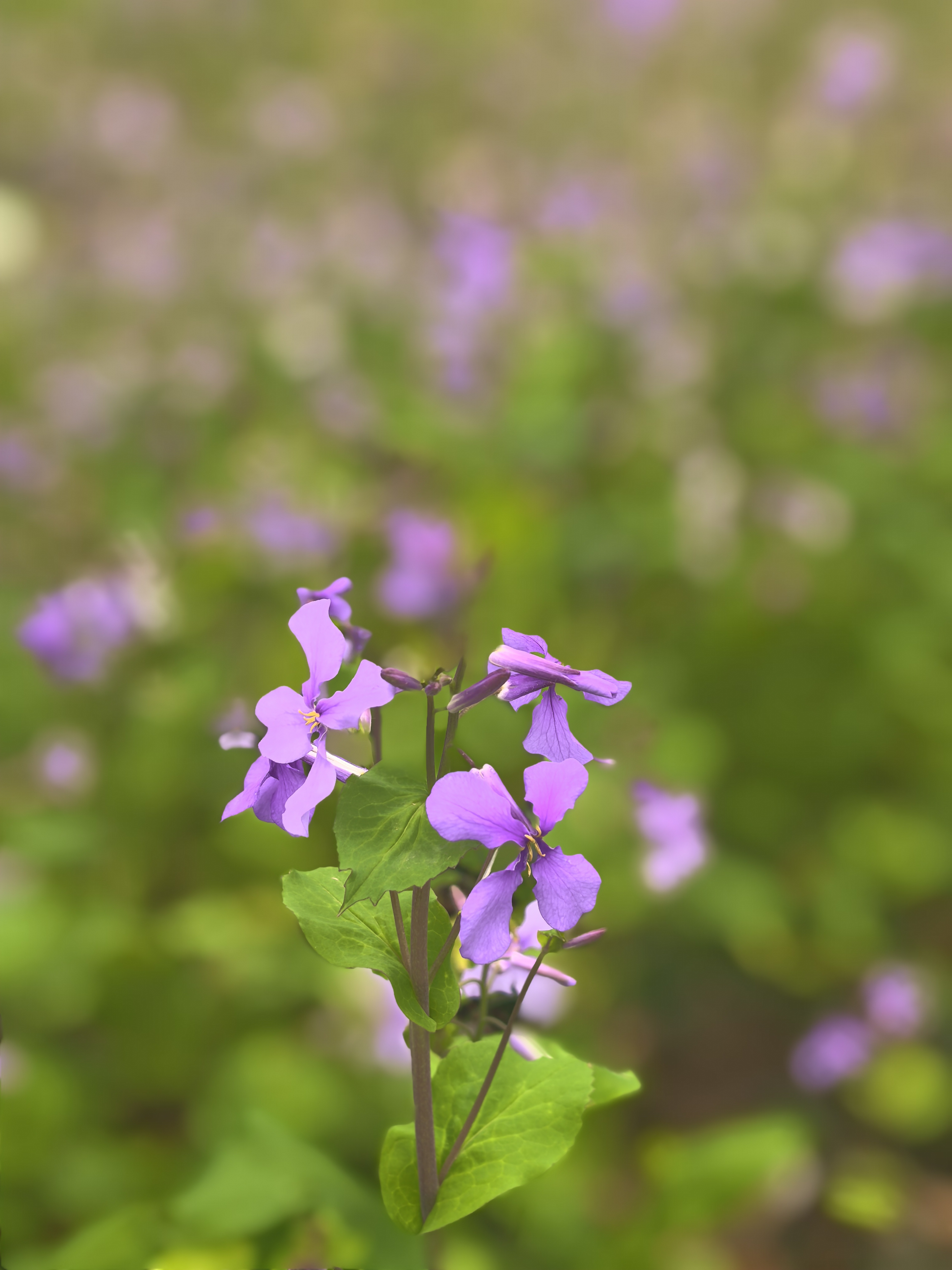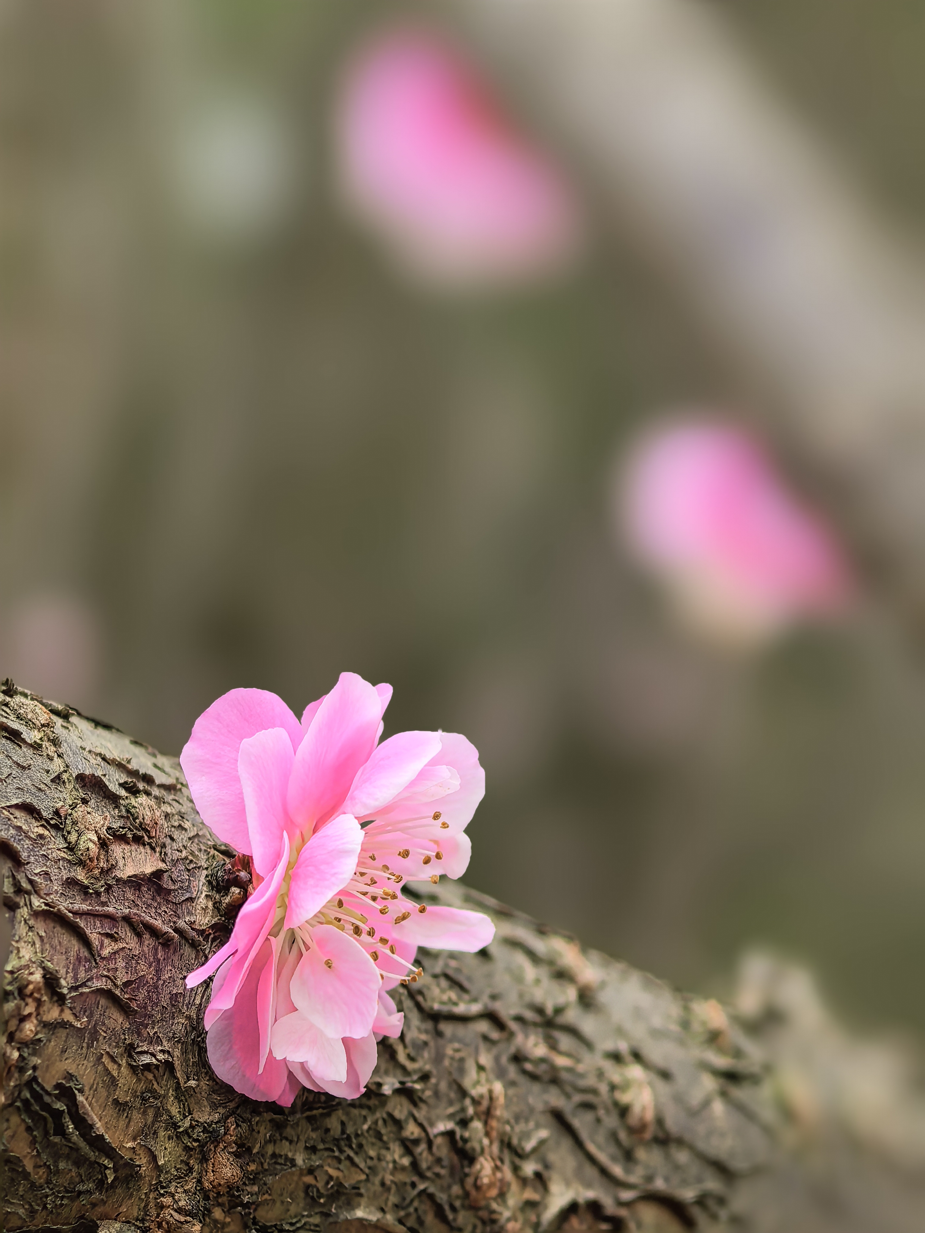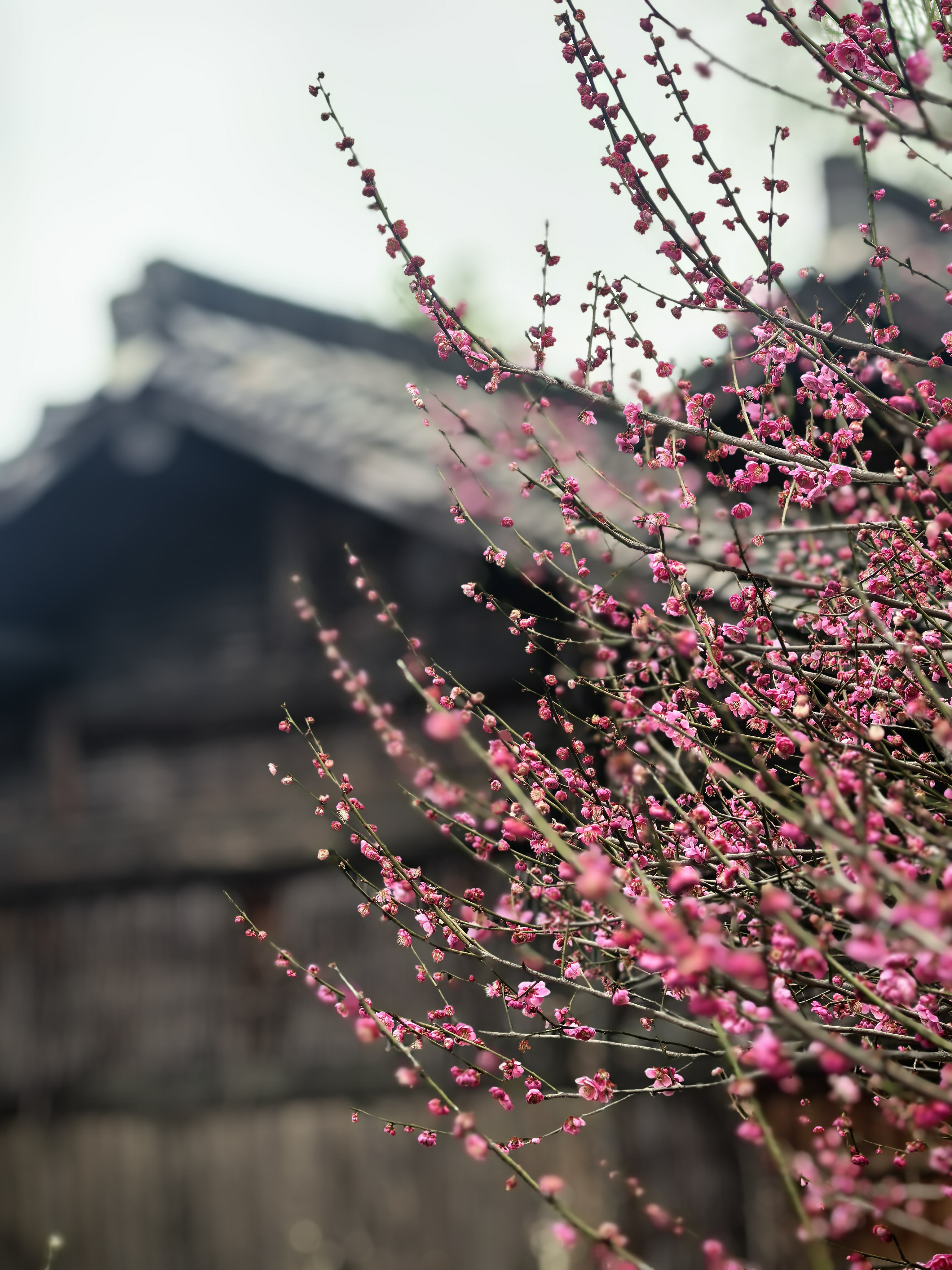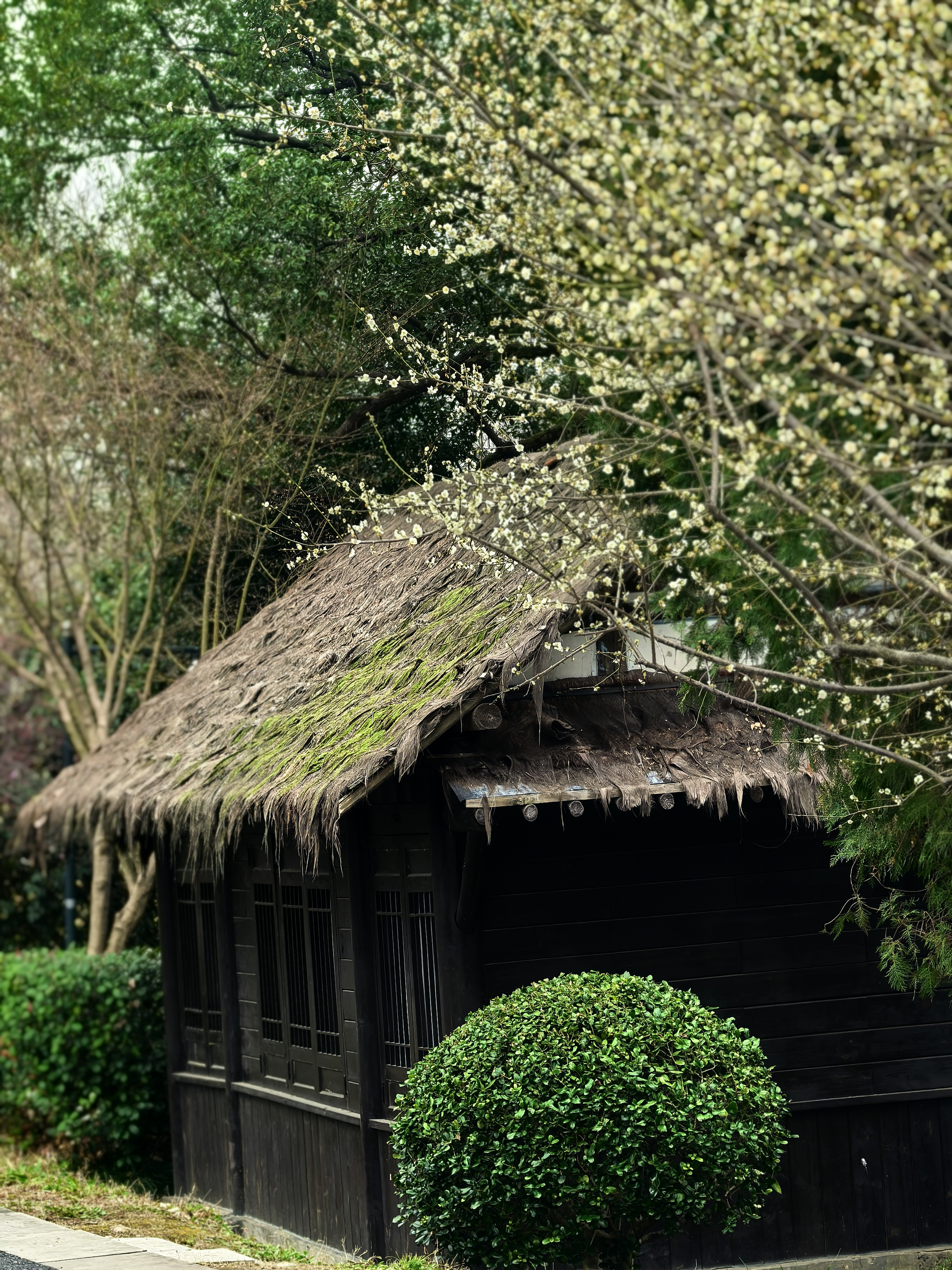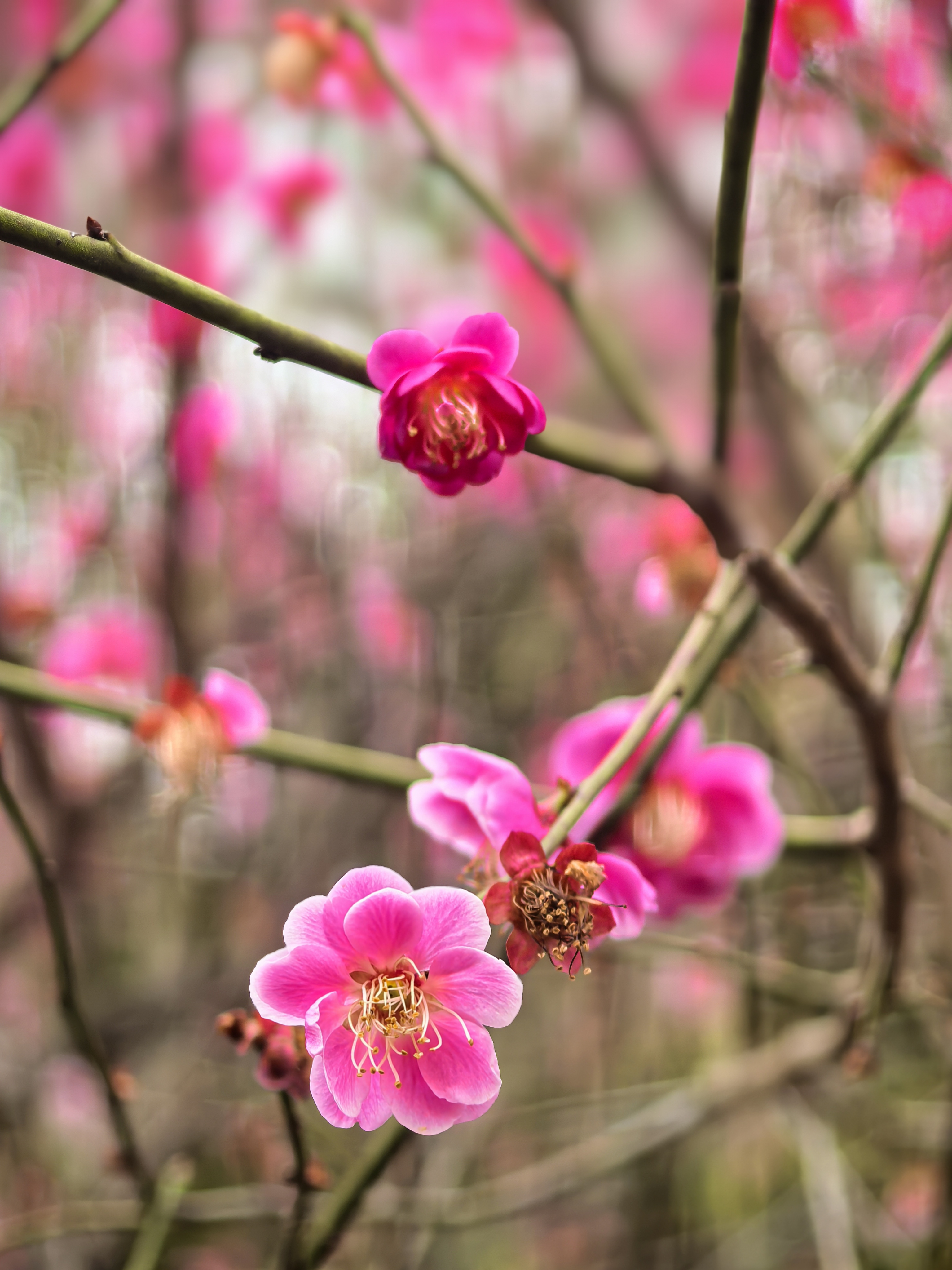 西溪的多数梅花,花期已经过半,盛开以后的梅花花香大减了。临水处先嗅到一缕清极的香,寻香探去,原来是好多株的玉蝶梅,正零零星星地开着。 身旁别的梅已谢了大半,它却才从冬梦里惺忪初醒,更奇的是,那柔粉的花,竟不生于细枝梢头,偏从黝黑粗砺的老干上直接挣出来,仿佛沧桑的臂膀,能安放娇嫩的梦。 盛放的那几朵,瓣儿薄如绡纱,透着一痕水粉,中间细细的蕊,挑着一点鹅黄;旁边紧挨的,却是圆鼓鼓的海棠似的蕾,深粉里裹着无限的密意。一开一合,一老一嫩,同在这铁画银钩的枝上,静默相对,像是岁月在低语,说着将尽未尽、方生未生的禅机。 不远处,美人梅也盈盈的。那是梅与红叶李的孩儿,继承了梅的香魂,又添了三分秾丽,团团簇簇,笑在微凉的春风里,明媚得毫无心事。 湿地静卧,水流无声,二月兰匍匐在地上更加卑微到尘土里。这个时候在游人眼里,只有树上的朵朵梅花,哪个会低下身段正眼瞧一下二月兰呢?西溪的纵横河汊边,只这玉蝶的幽古与美人梅的新艳,在蒙蒙水烟中,洇出一幅深浅有致的早春长卷。
