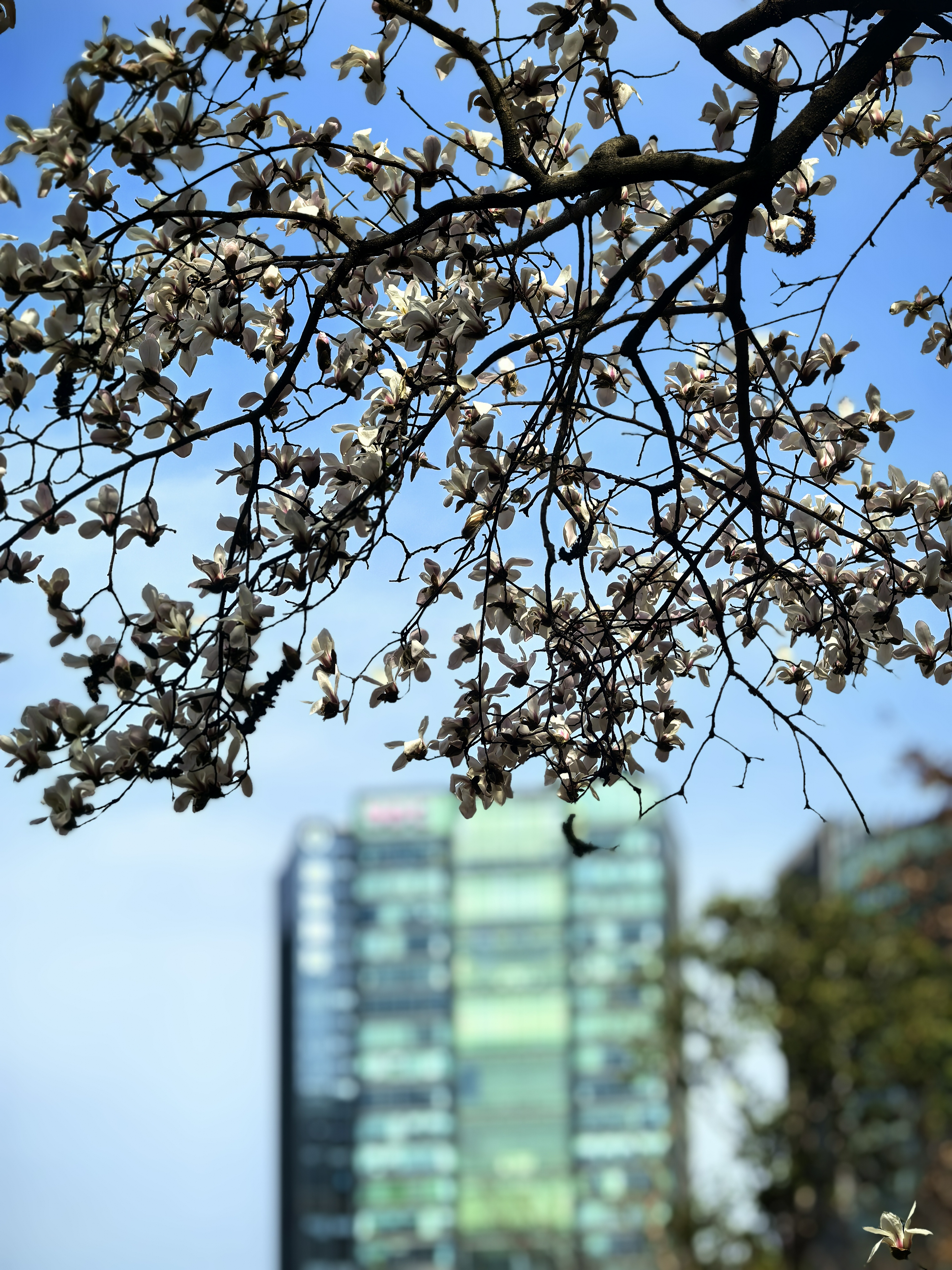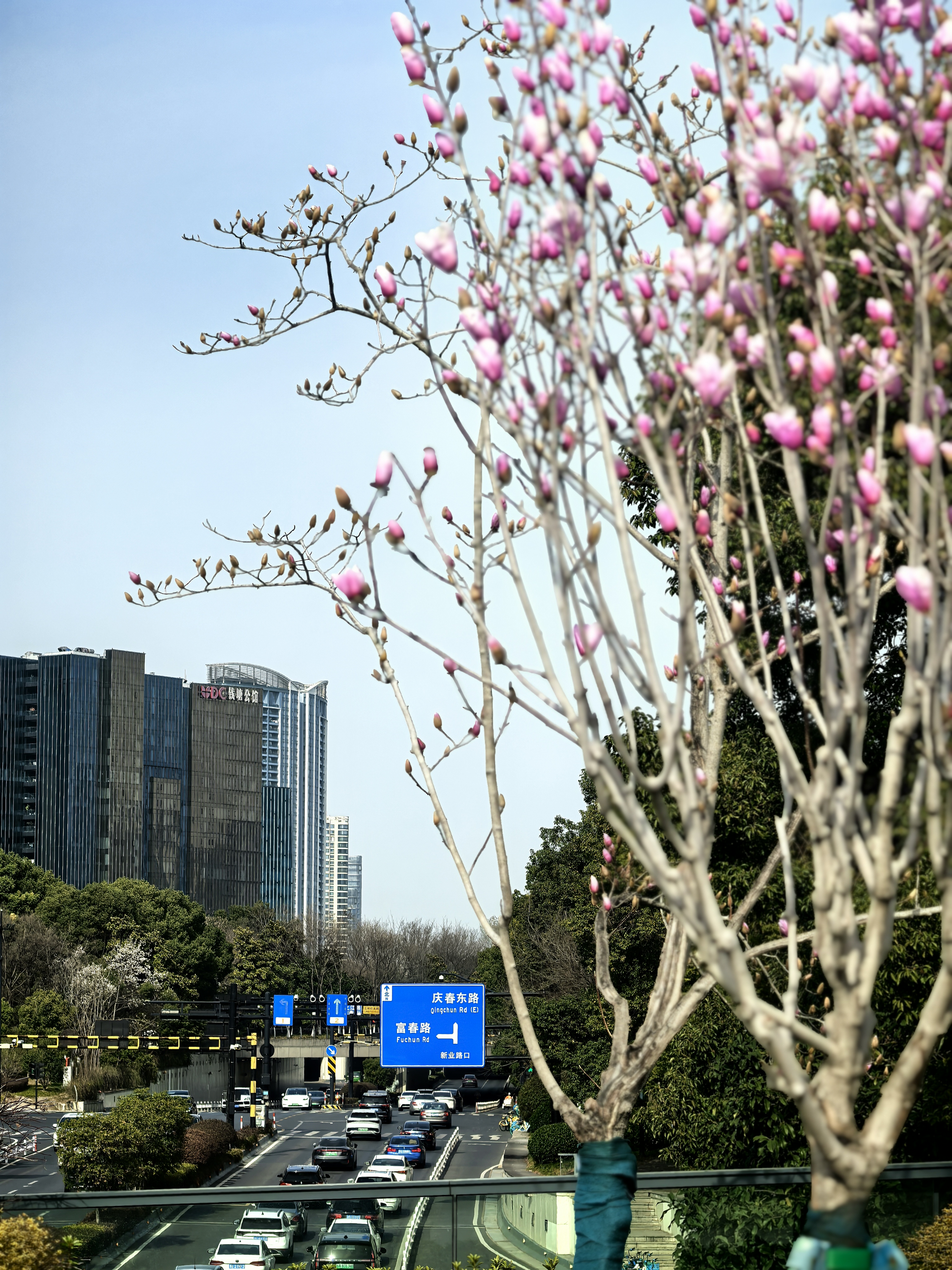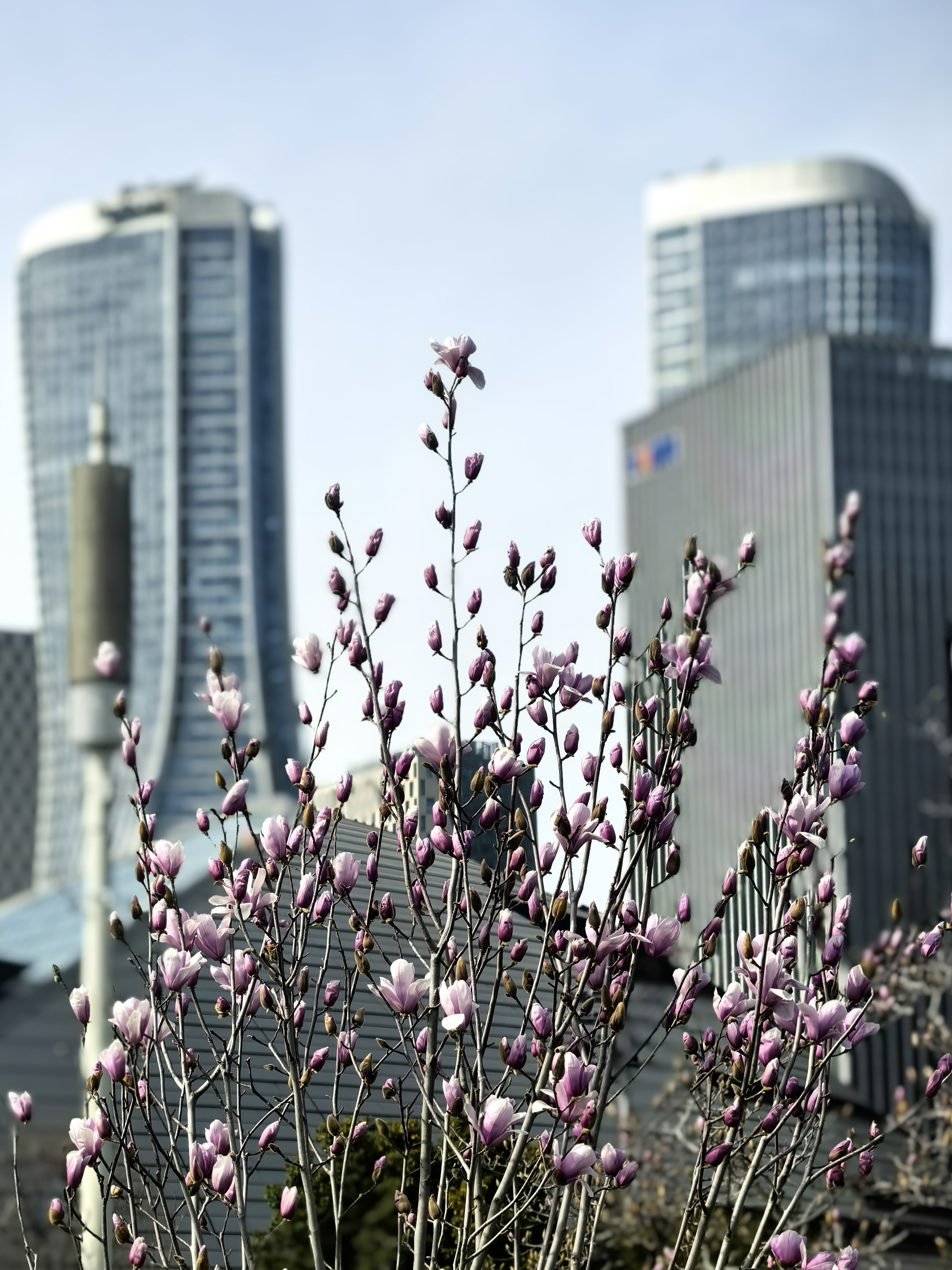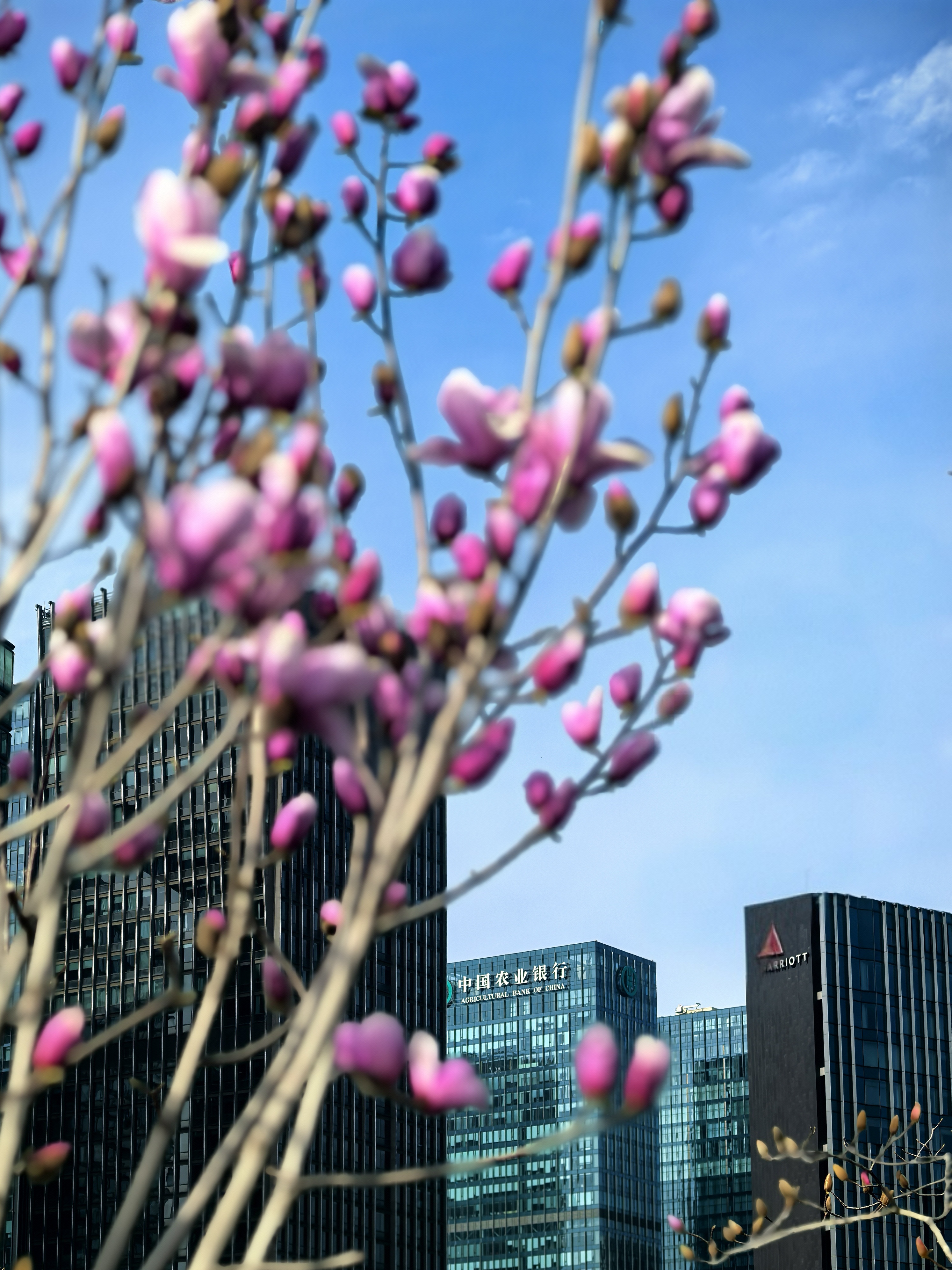 市民广场的早春,是玉兰的赛场。那几株白玉兰,仿佛一夜之间被谁悄悄点亮,硕大的花朵在枝头炸开,洁白如玉,透着一种不染尘埃的清冷。它们高擎在光秃秃的枝桠上,像是一盏盏悬在空中的灯,照亮了广场上匆匆的脚步。 而在它们身旁,红玉兰却还羞涩着。那些紫红色的花苞,紧紧裹着,像一个个攥紧的小拳头,蓄势待发。它们在风中微微颤动,仿佛在积蓄力量,准备在某个不经意的瞬间,轰然绽放出满树的热烈。 一白一红,一开一合,就这样并肩立在广场的春风里。背景是那几座流线型的现代高楼,玻璃幕墙映着蓝天,与这满树的繁花相映成趣。 近几年的此时,我都会来此拍摄玉兰初开的景象。驻足仰头凝望,这一刻,城市的钢筋水泥似乎也柔软了下来,被这满树的春意温柔地包裹着。