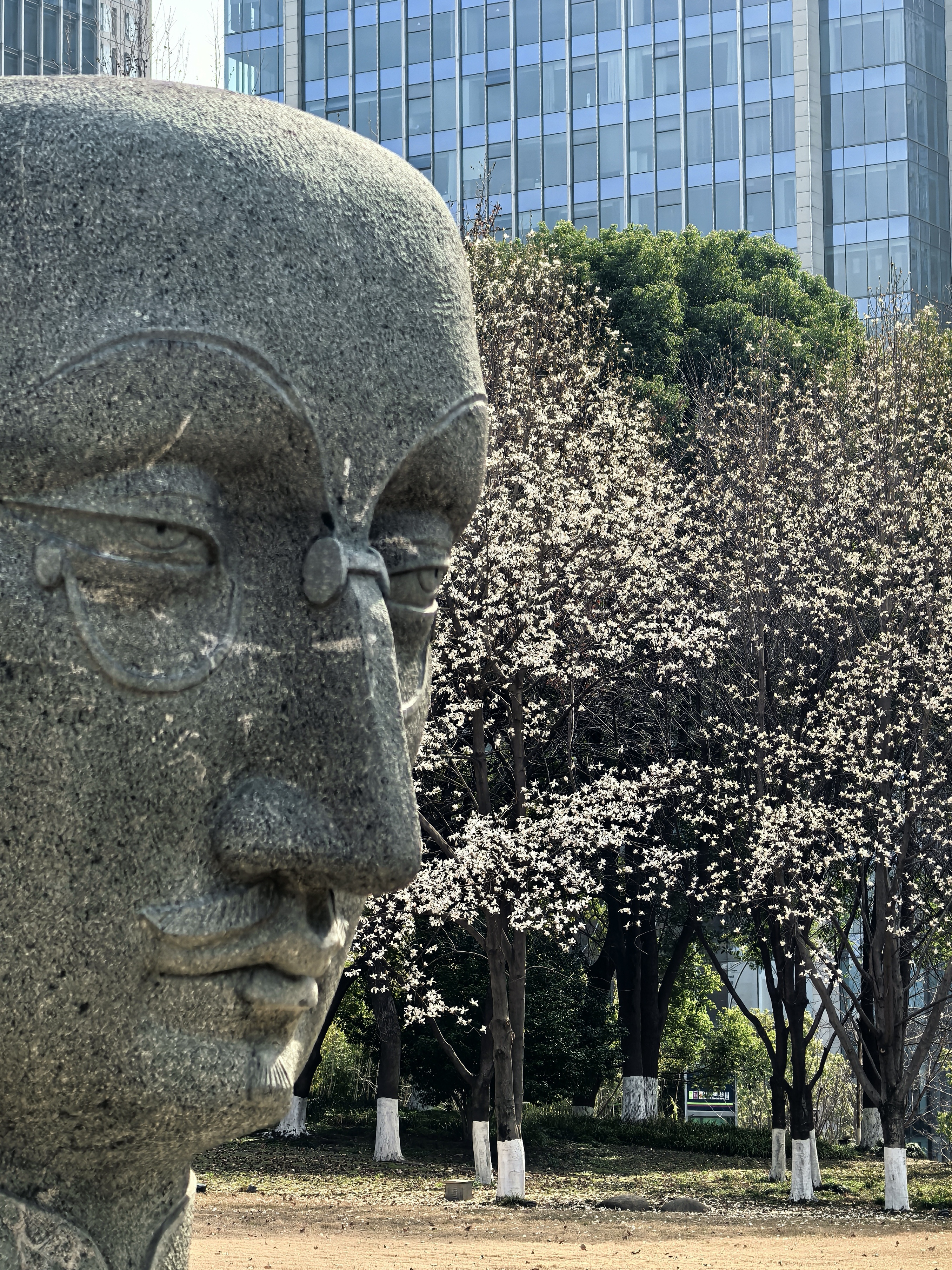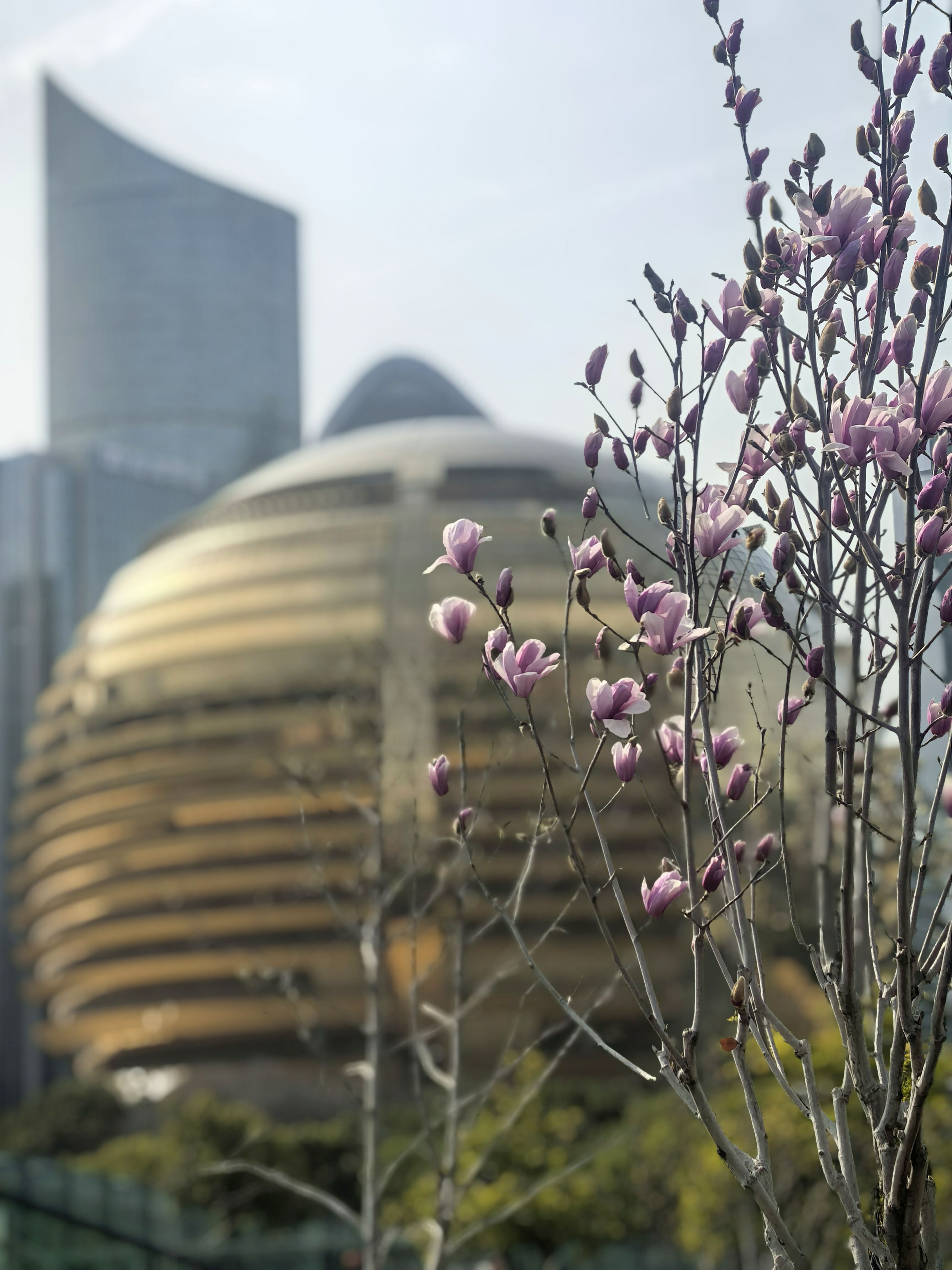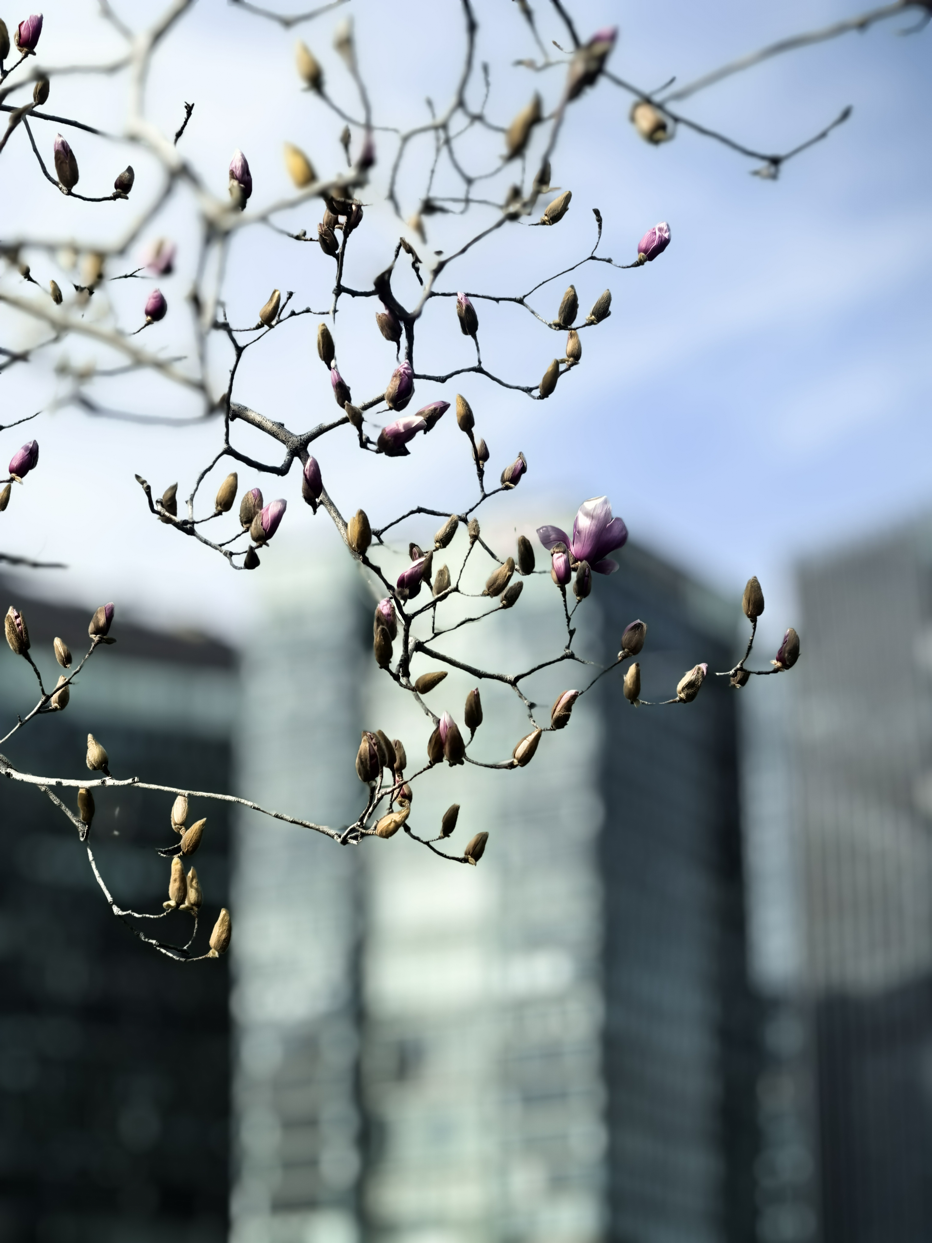 市民广场的早春,是玉兰的赛场。那几株白玉兰,仿佛一夜之间被谁悄悄点亮,硕大的花朵在枝头炸开,洁白如玉,透着一种不染尘埃的清冷。它们高擎在光秃秃的枝桠上,像是一盏盏悬在空中的灯,照亮了广场上匆匆的脚步。 而在它们身旁,红玉兰却还羞涩着。那些紫红色的花苞,紧紧裹着,像一个个攥紧的小拳头,蓄势待发。它们在风中微微颤动,仿佛在积蓄力量,准备在某个不经意的瞬间,轰然绽放出满树的热烈。 一白一红,一开一合,就这样并肩立在广场的春风里。背景是那几座流线型的现代高楼,玻璃幕墙映着蓝天,与这满树的繁花相映成趣。 近几年的此时,我都会来此拍摄玉兰初开的景象。驻足仰头凝望,这一刻,城市的钢筋水泥似乎也柔软了下来,被这满树的春意温柔地包裹着。