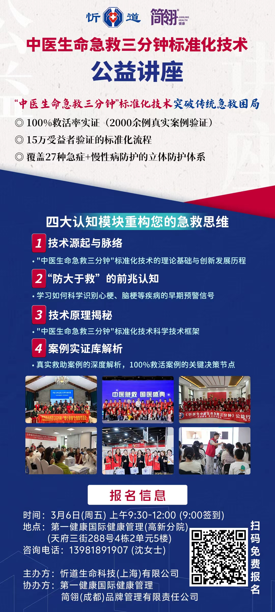 正阳社工 公益服务 💝心脑血管病,已是全民健康头号杀手! 突发心梗、脑梗、晕倒、中风,120赶来前的黄金3分钟,就是生死分界线! 🔥中医生命急救三分钟·标准化技术 不用专业设备、不用医学基础,普通人一学就会、一用就灵! ✅ 黄金抢救期快速自救+互救,抢在120前稳住生命 ✅ 7年实战救助2000+真实案例,无一例失败 ✅ 平时可养生保健、调理三高、慢病养护,全家都能用 学一门宁可千日不用、不可一日不备的救命本领,护自己、护父母、护孩子、护全家平安,比什么都重要!