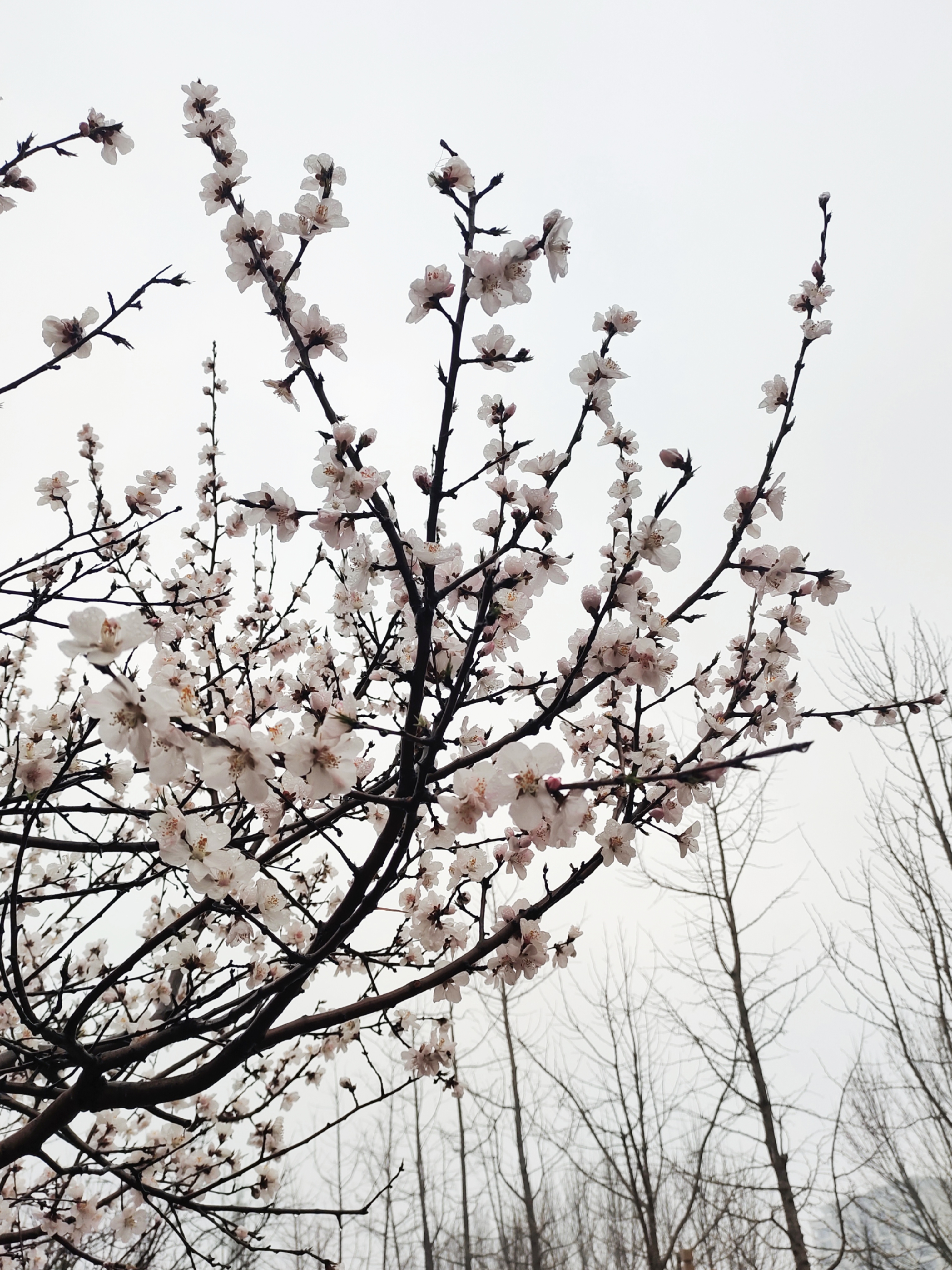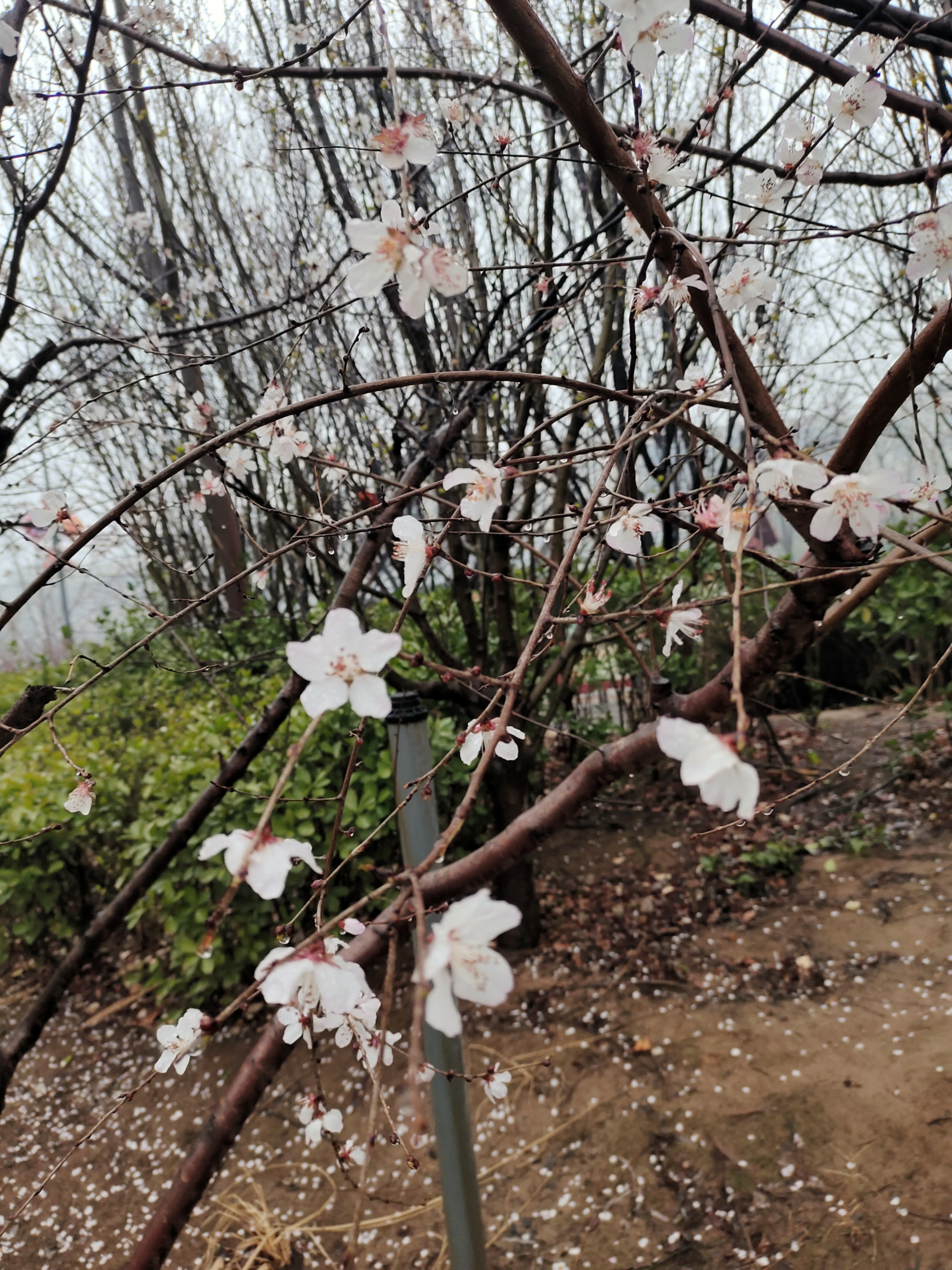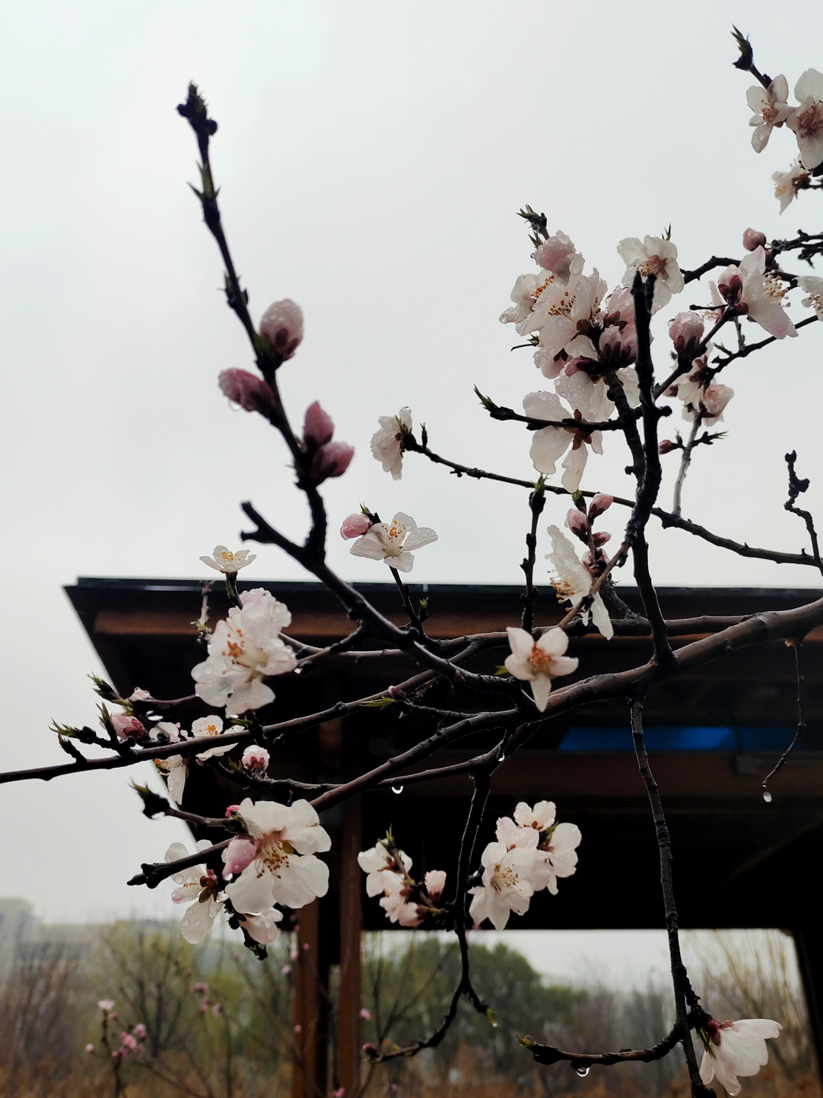 雨后桃枝垂,露珠轻颤,灰空下落花铺径,凉亭静立,春在呼吸间悄然绽放。