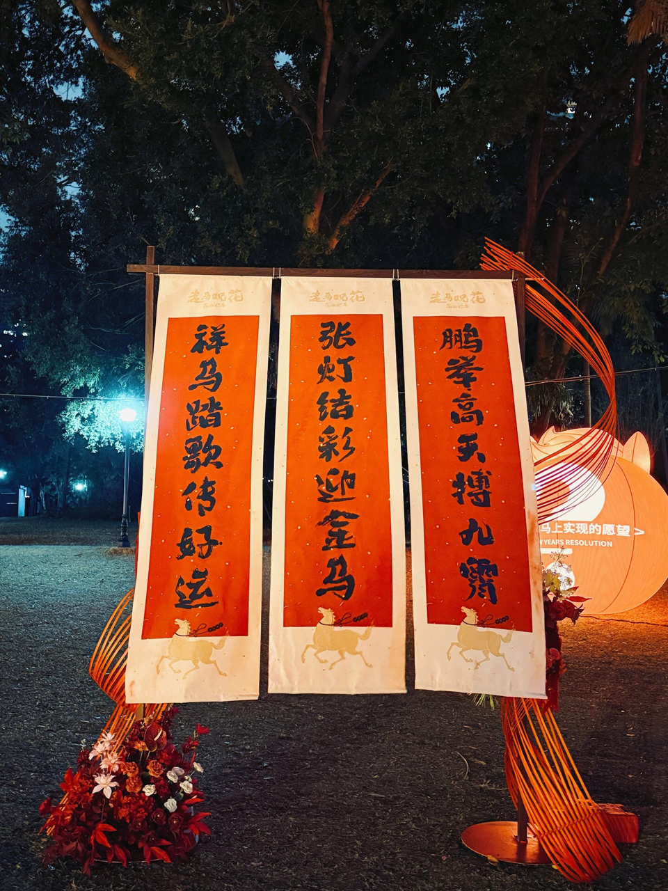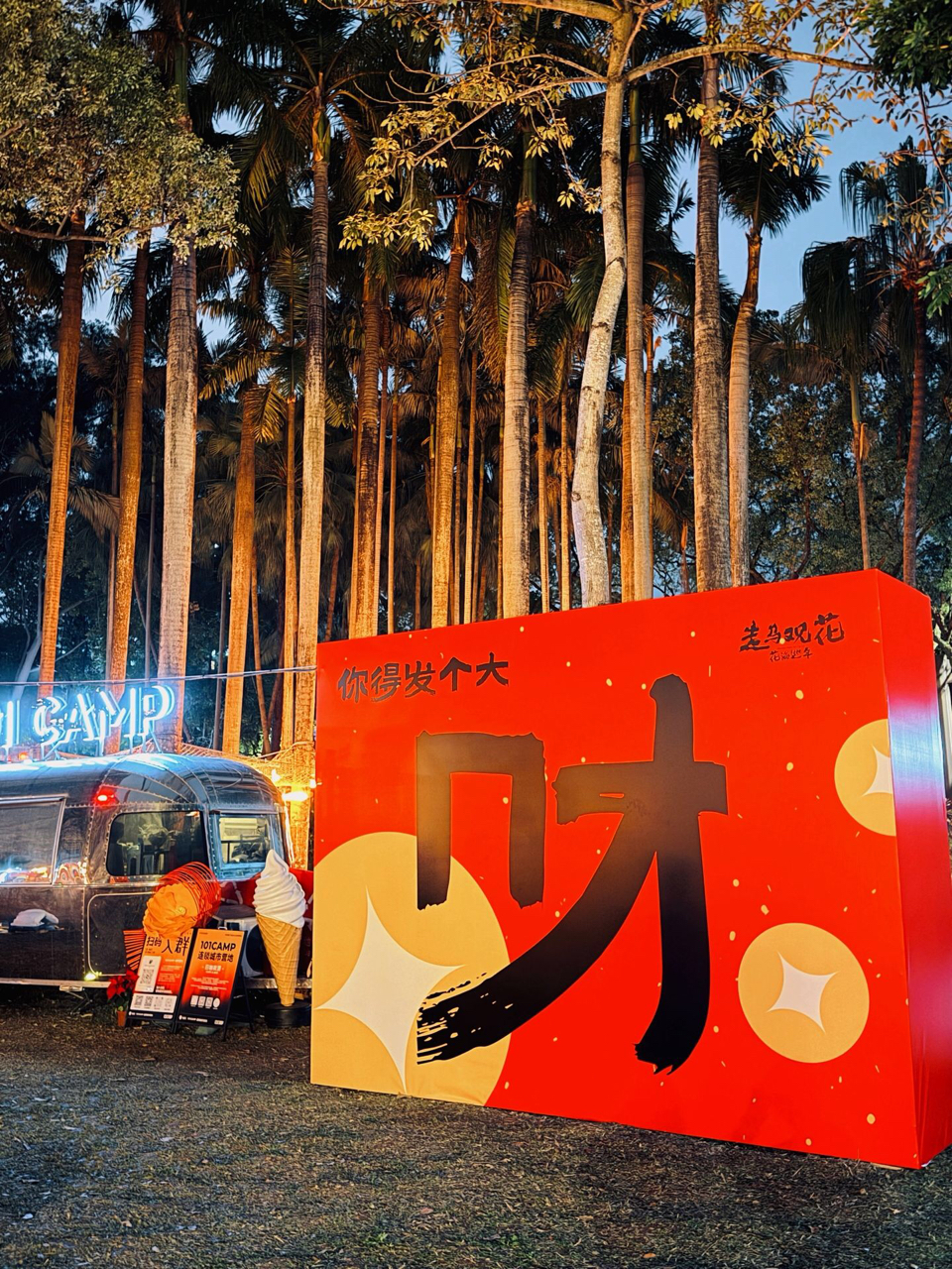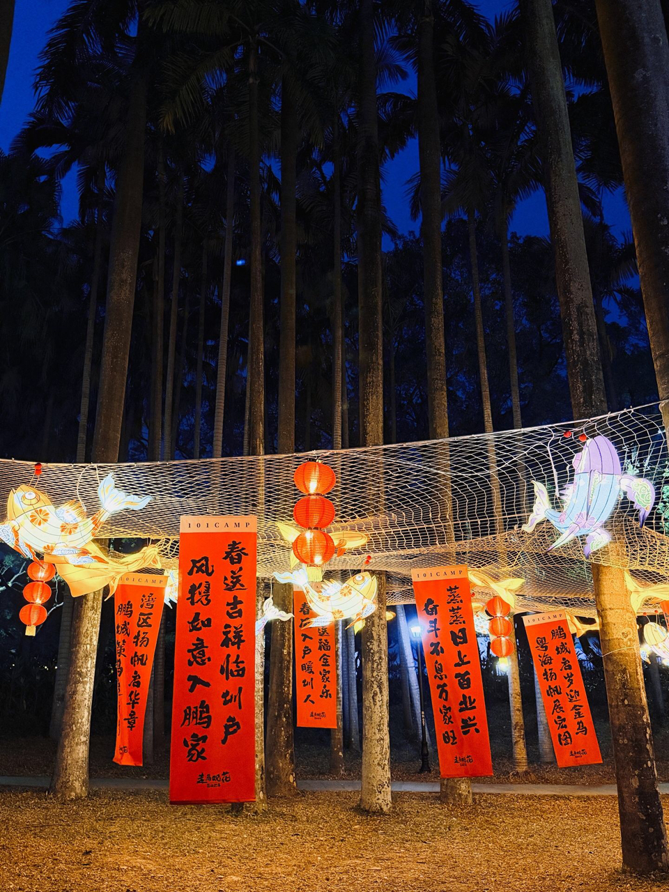深圳南山公园的101CAMP,春节灯会张灯结彩~红灯笼摇曳,春联墨香扑鼻,金马祥瑞踏歌而来!冰激凌车旁棕榈树影婆娑,夜间灯光秀点亮湾区夜空✨许个愿:万家旺、百业兴、你得发个大财!