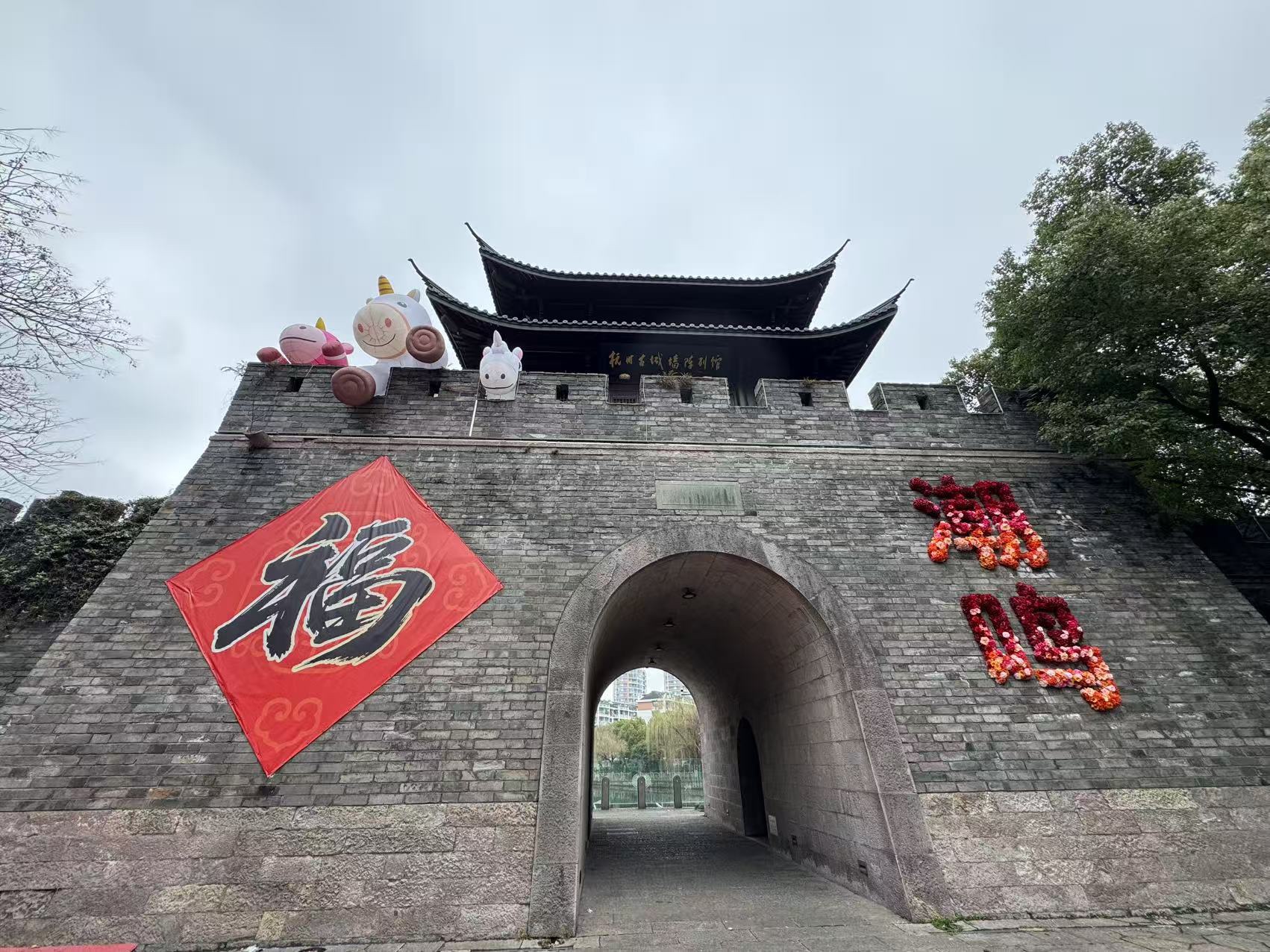 古城墙上露出可爱的马头,还有巨大的福字,以及花卉文字,有趣。