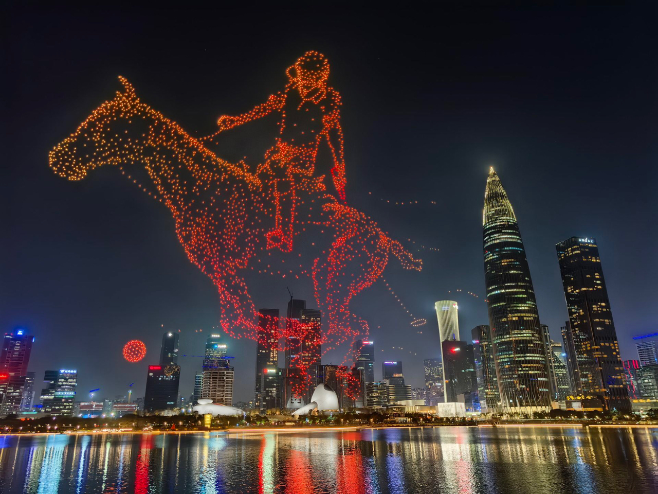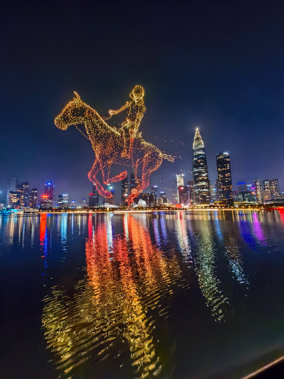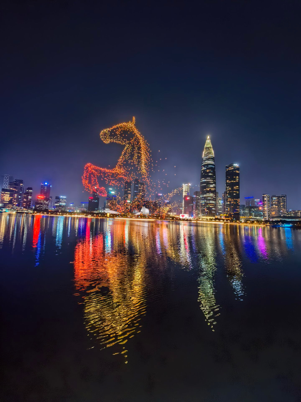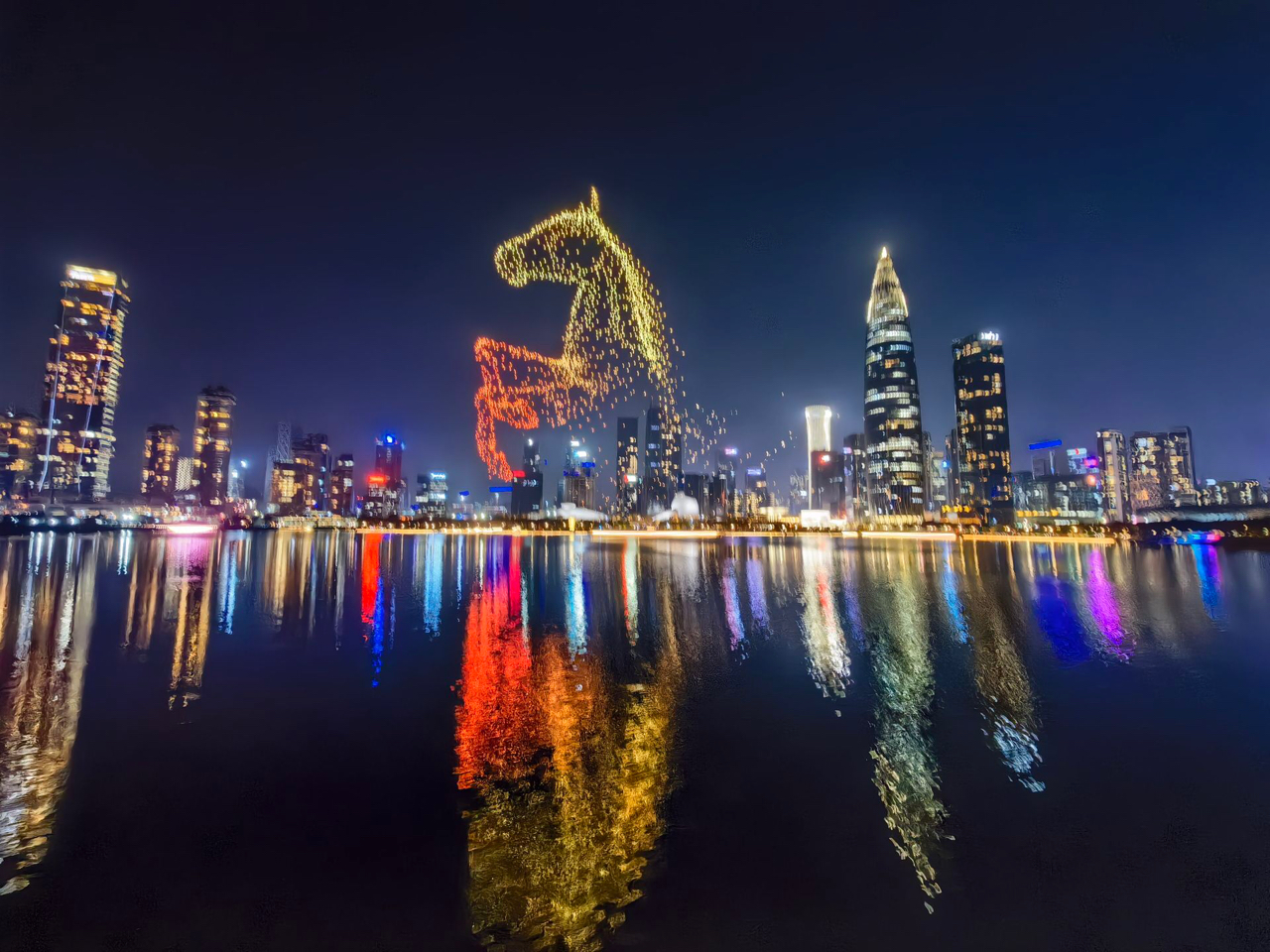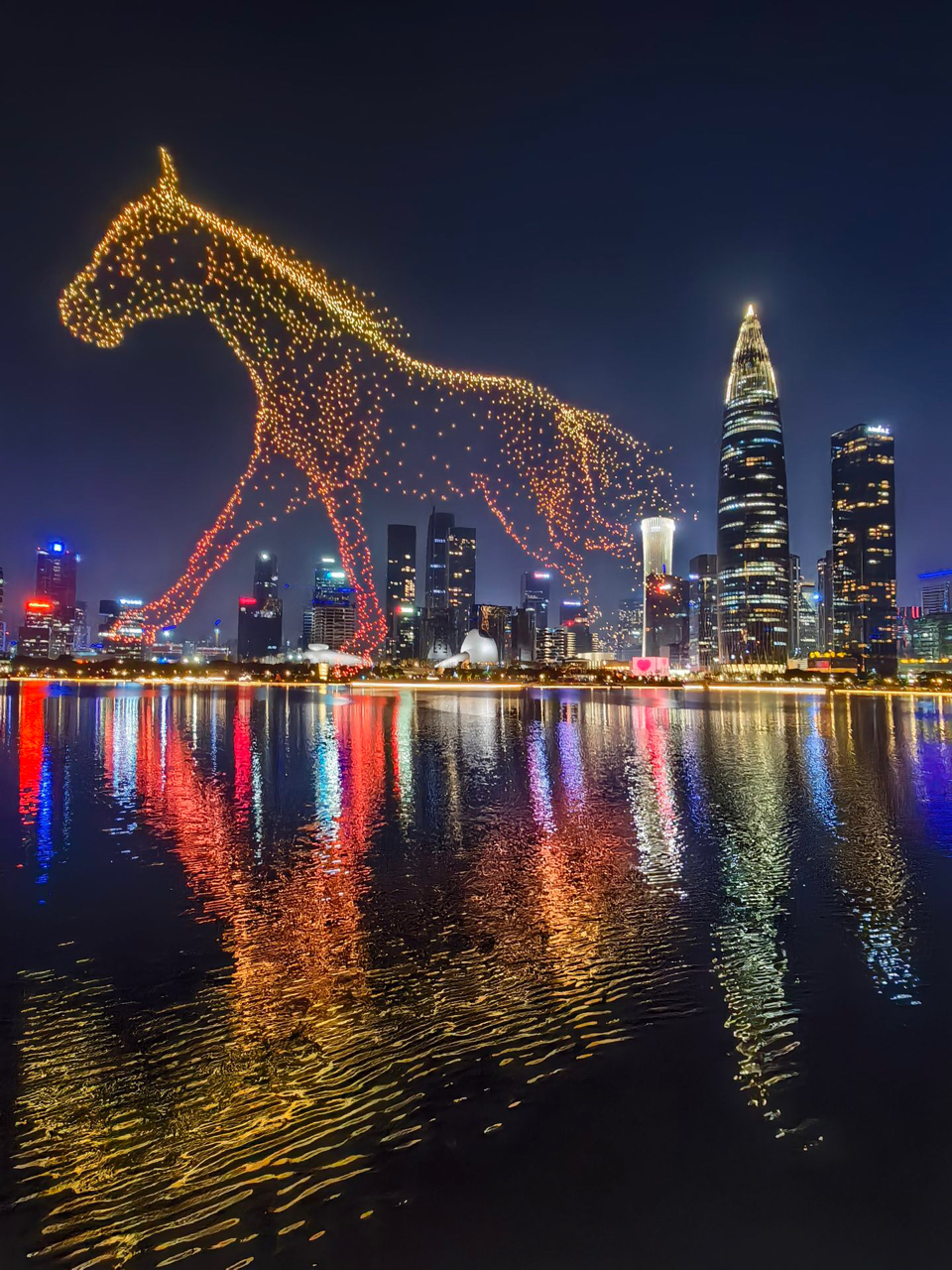 2026年2月17日,在广州省深圳市,夜幕低垂,深圳湾畔灯火初上。人才公园的水面如镜,倒映着京基100与平安金融中心的流光剪影。无人机升腾,一匹光影之马踏空而行,仿佛卡尔·拉格斐笔下未落笔的梦想——I DESIGN DREAMS FOR NOW AND TOMORROW。科技在夜色里吟诗,艺术于天际间落款。快门轻启,不是捕捉光,而是收藏一座城的呼吸与心跳。