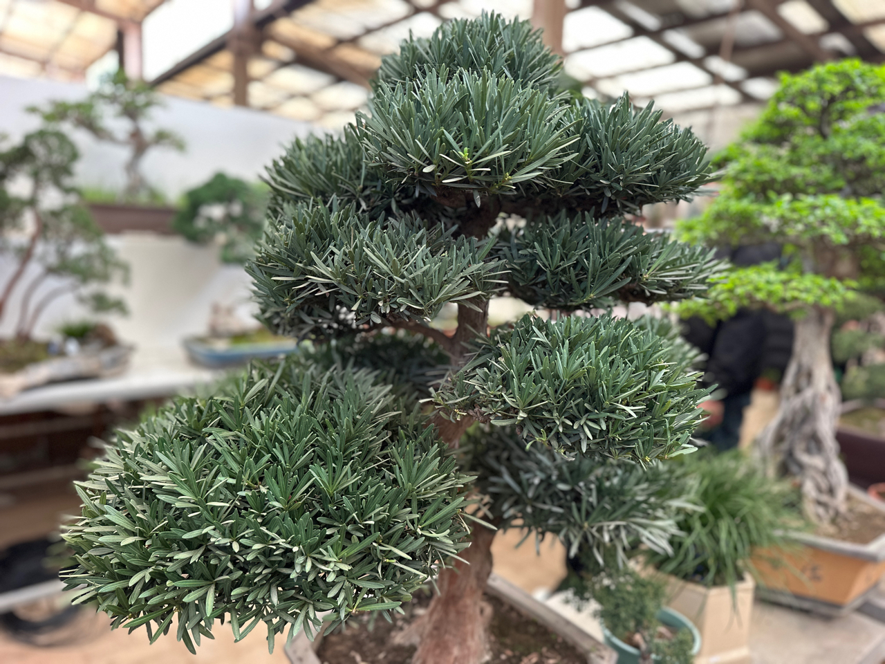 温室里,一株罗汉松静立如诗。枝干盘曲,似岁月低语;叶色浓翠,若凝住春光。bonsai不只是盆中微景,是把山林云气、千年松风,悄悄养进方寸之间。修剪是克制的爱,造型是无声的诗。多层错落,仿若自然叠嶂;叶片密集,织就一片青霭。日本风格的静谧,在室内花园里缓缓流淌。原来最磅礴的风景,有时就藏在一盆呼吸的绿意里。