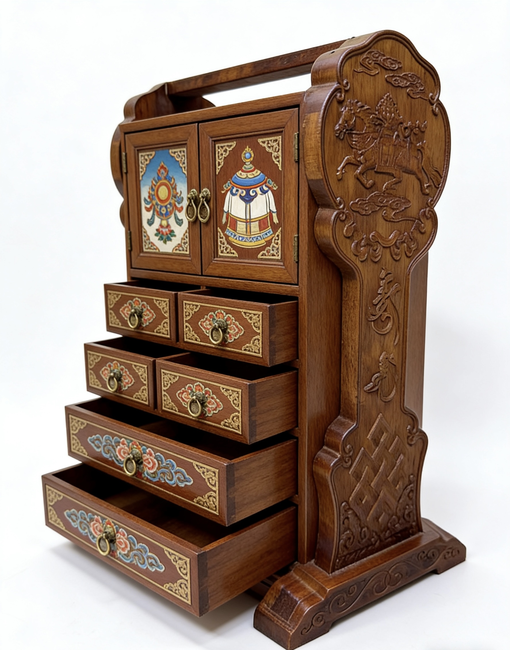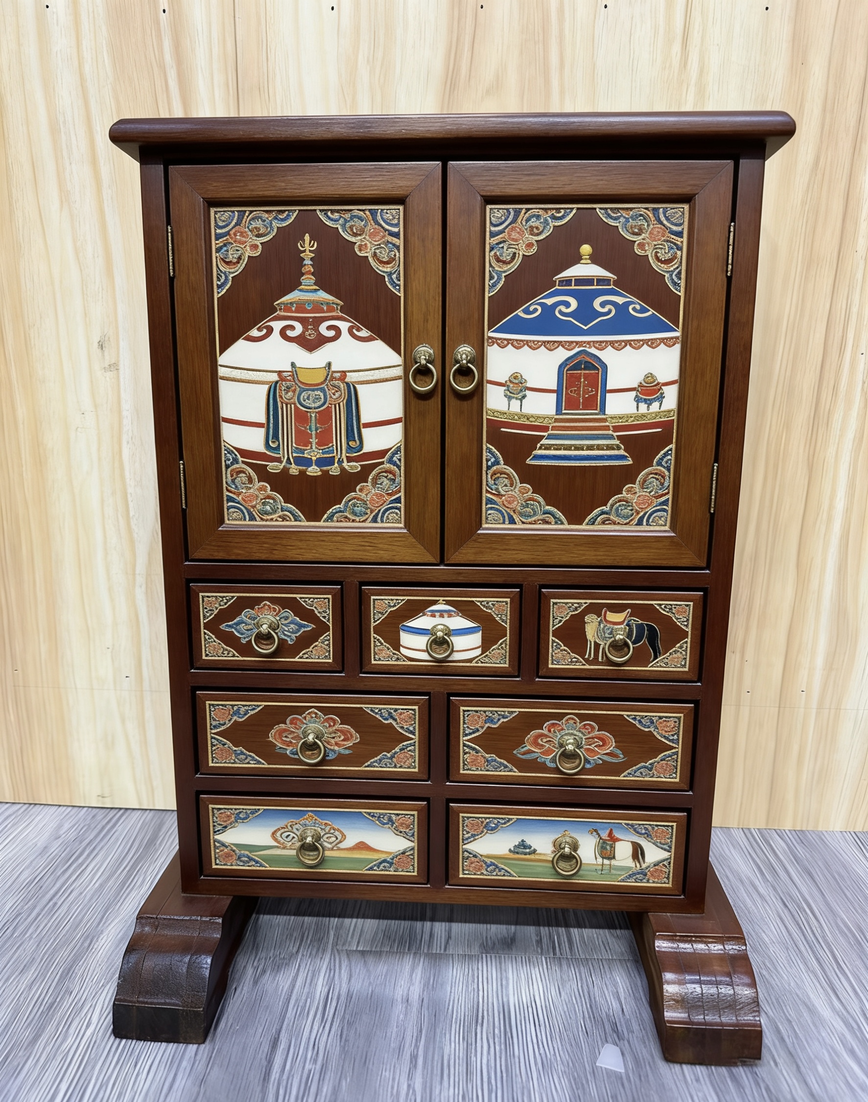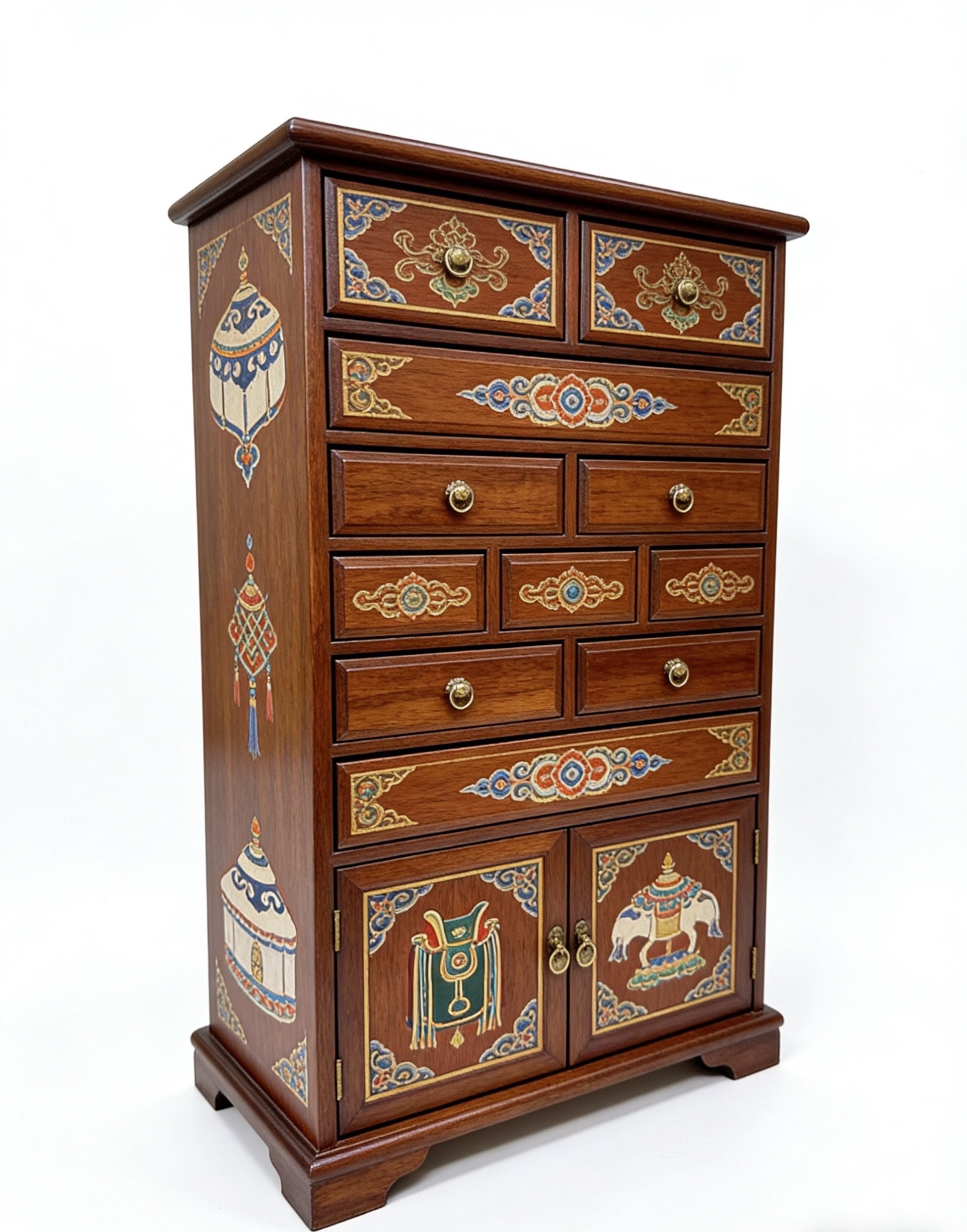 以传统马鞍架为骨,承草原千年游牧文脉;以非遗手绘为魂,绘东方吉祥图腾。一刚一柔,一文一雅,将草原的豪迈与闺阁的精致融于一体,既是文化的传承,亦是匠心的礼赞。