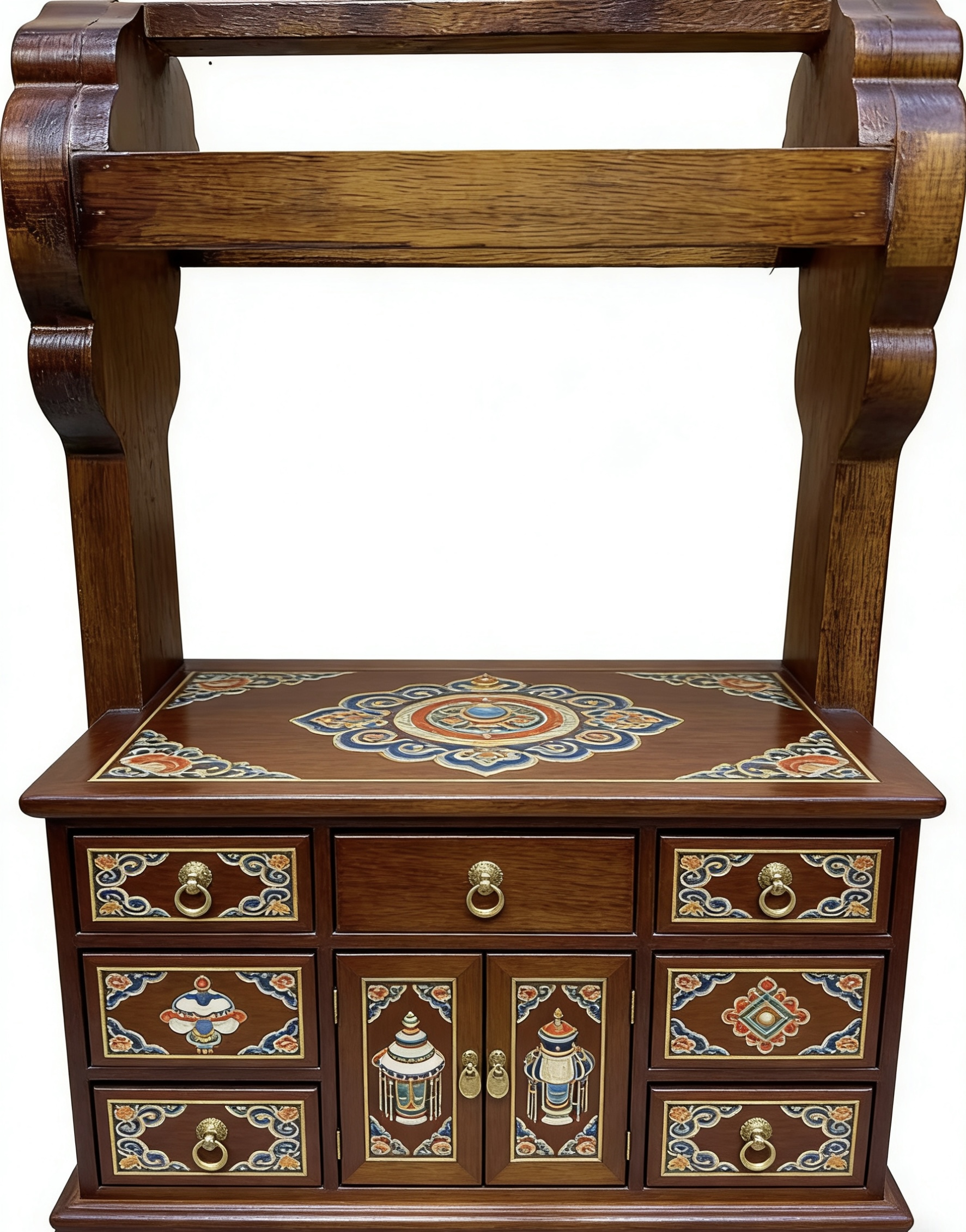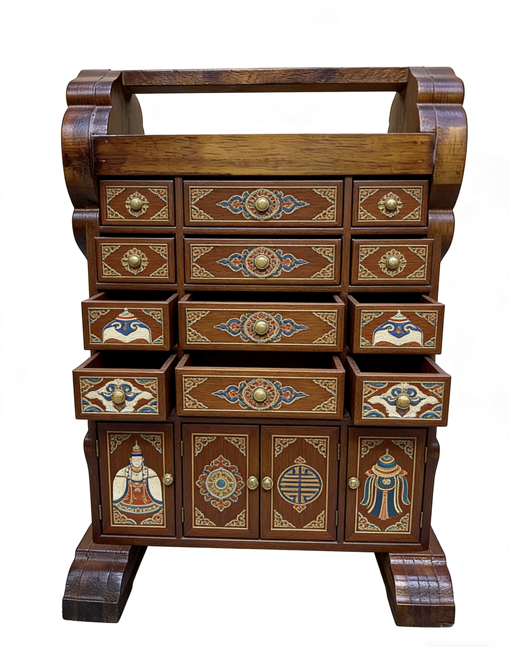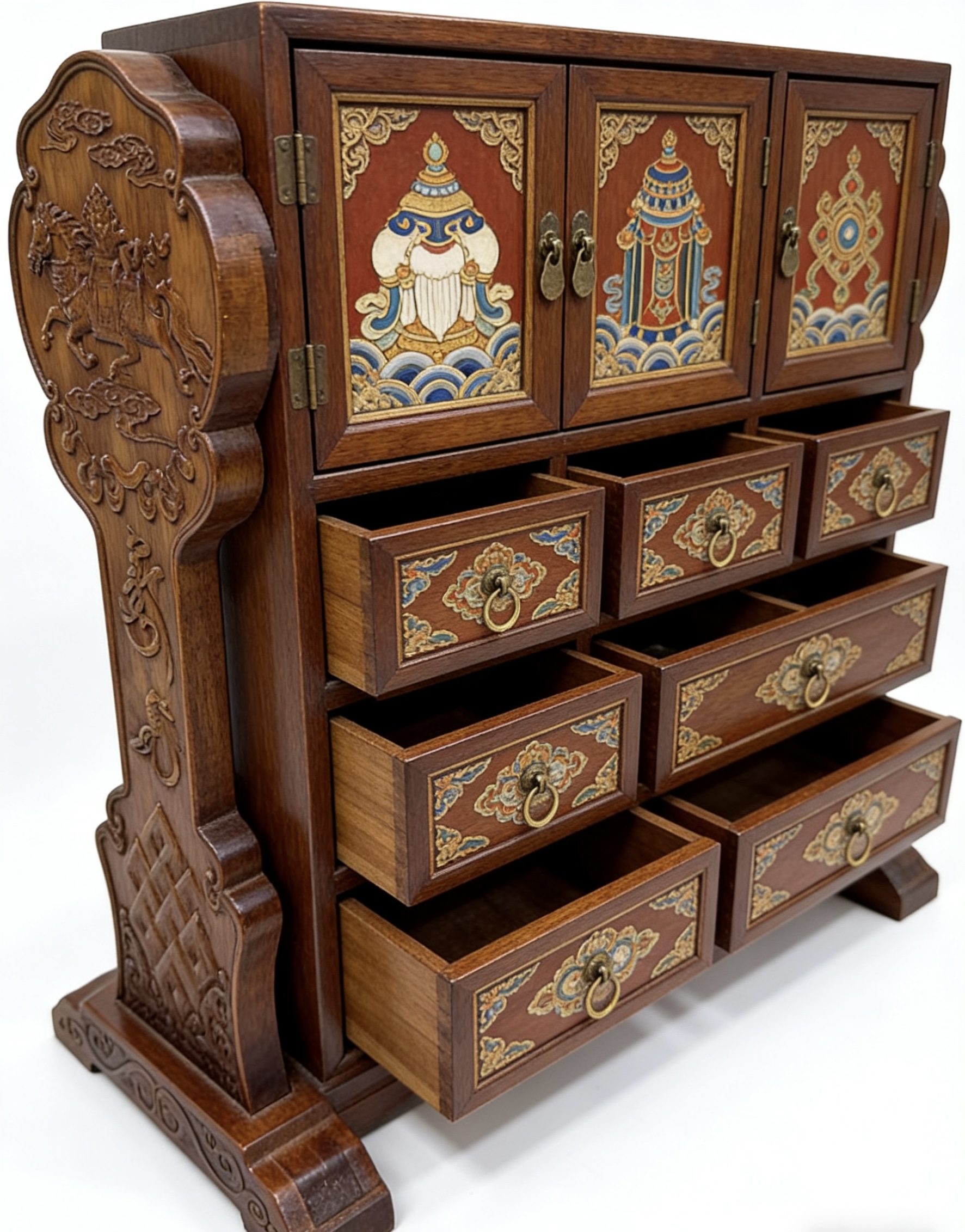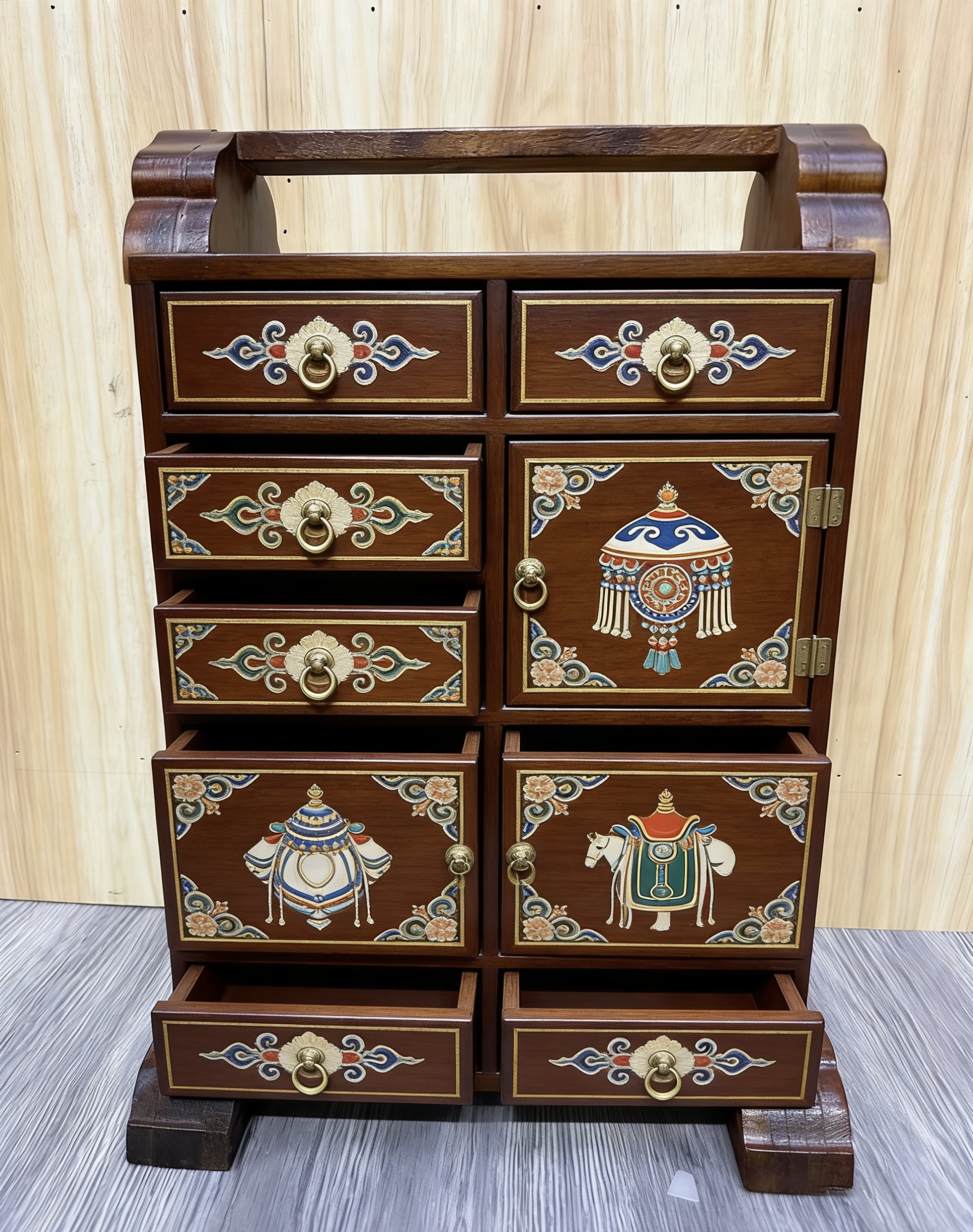 以传统马鞍架为骨,承草原千年游牧文脉;以非遗手绘为魂,绘东方吉祥图腾。一刚一柔,一文一雅,将草原的豪迈与闺阁的精致融于一体,既是文化的传承,亦是匠心的礼赞。