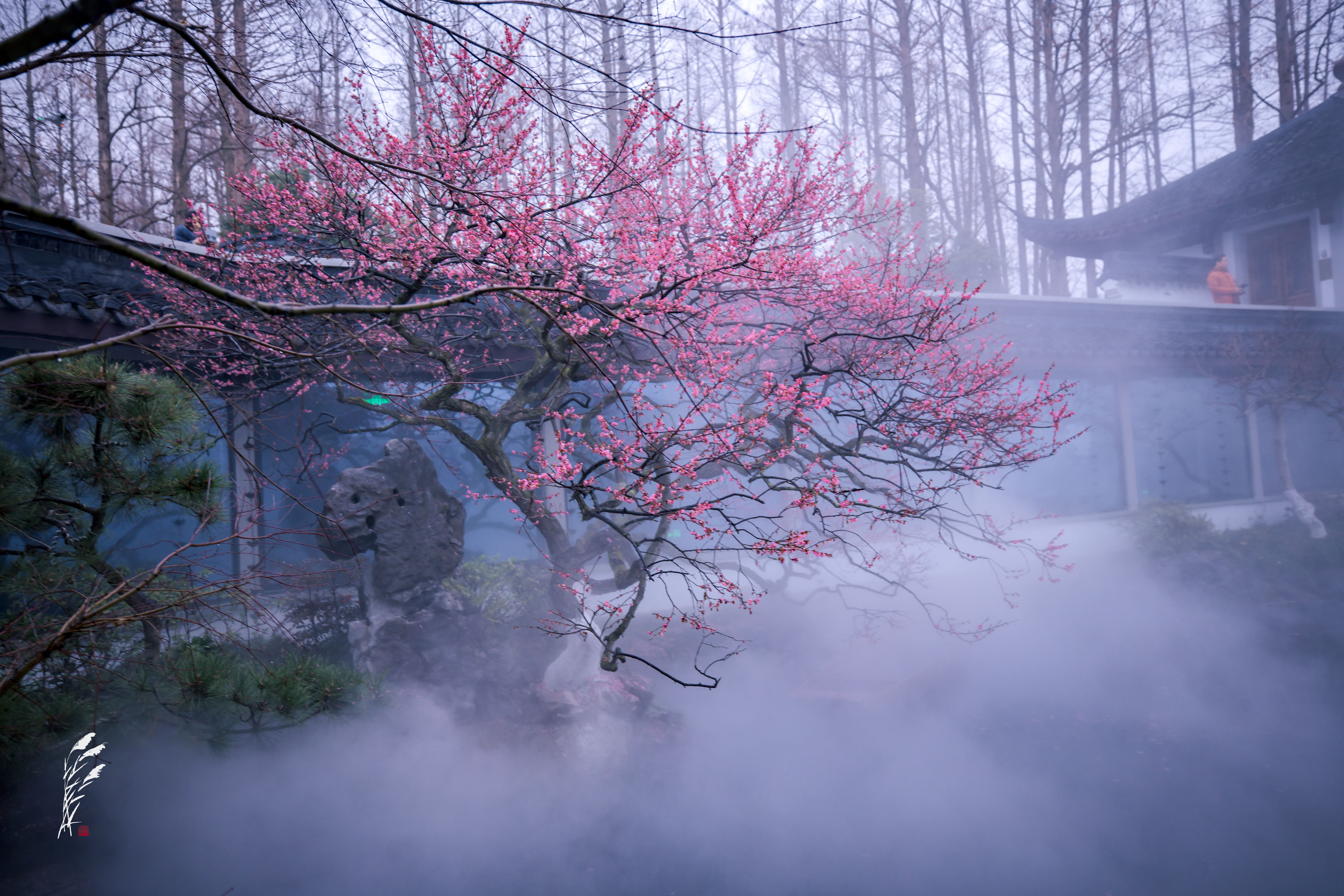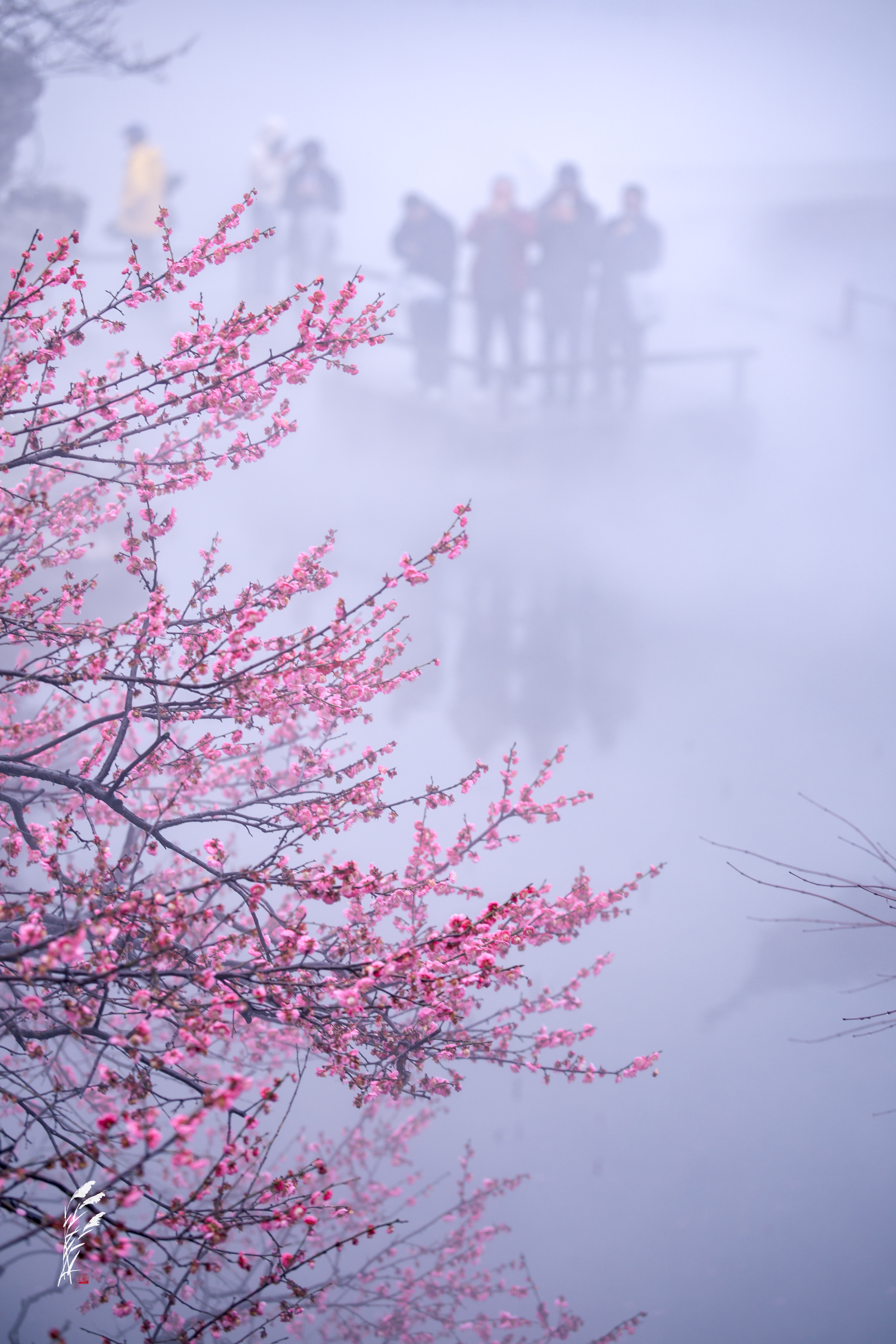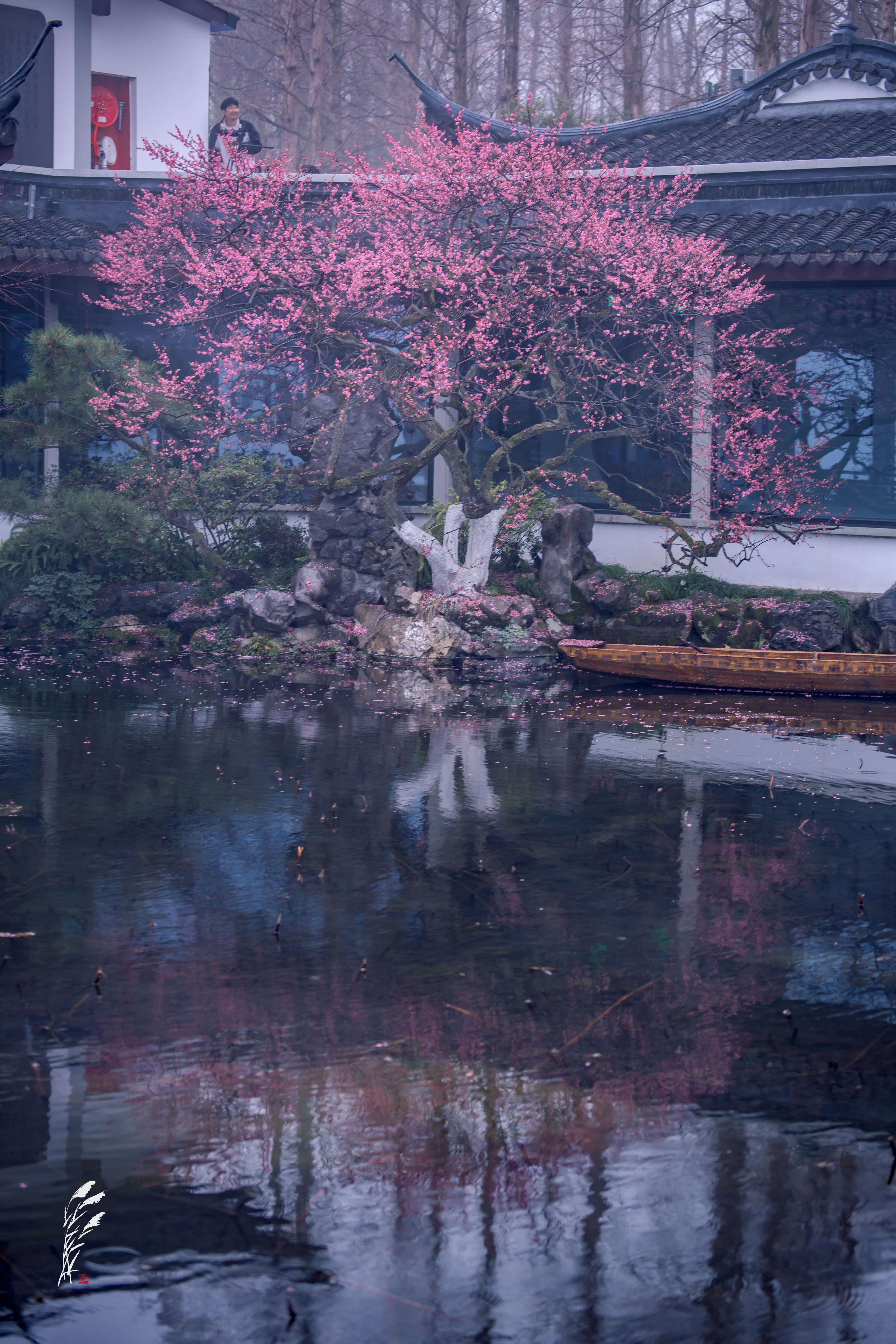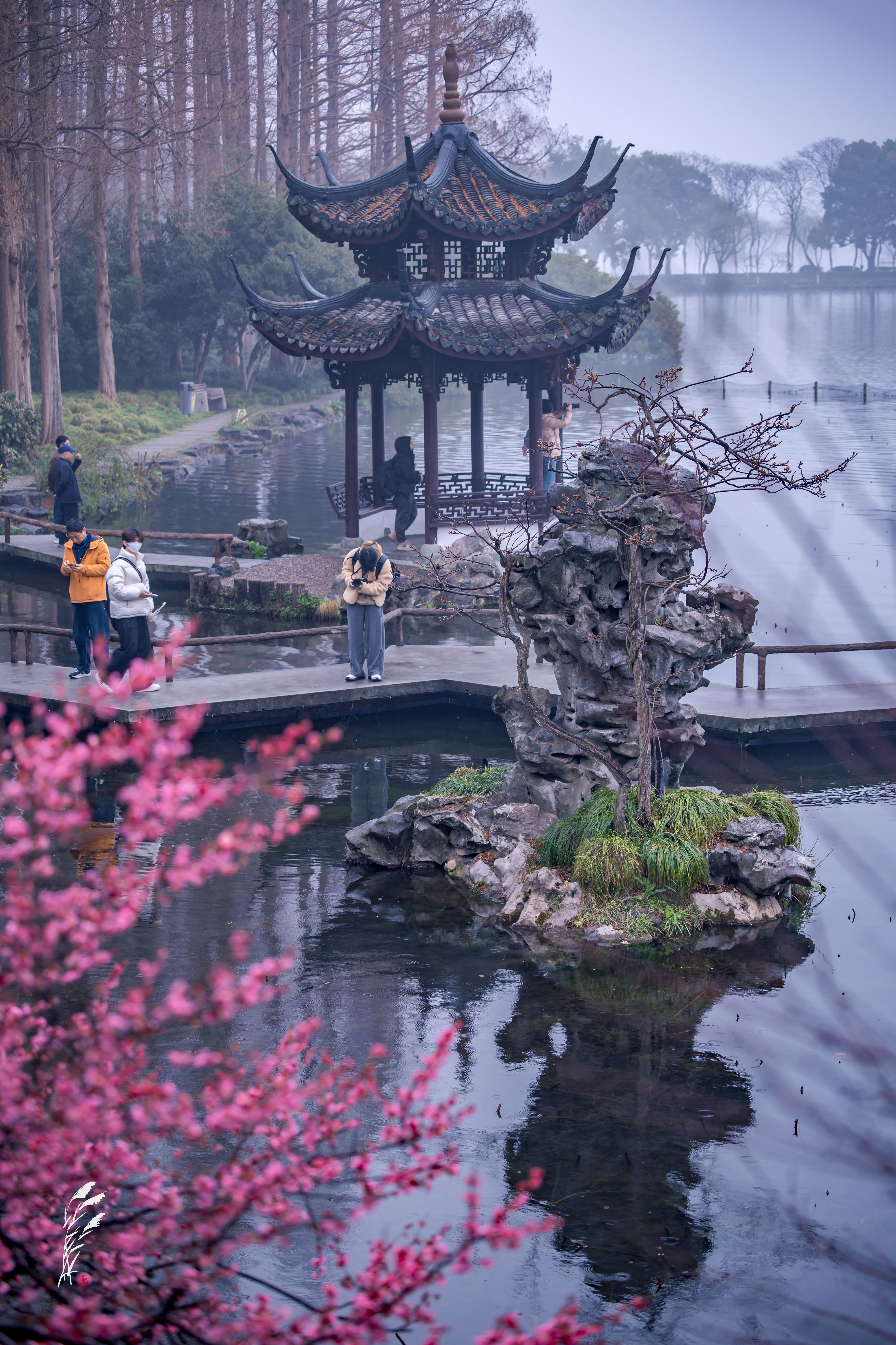 孤梅立烟岚,西湖独一春 —— 湛碧楼前的千年清绝 晨雾如潮,漫过西湖的烟波,湛碧楼畔,唯有这一棵老梅孤然挺立,在苍茫水雾中撑起整个早春的诗意。 这座临湖而筑的湛碧楼,始建于清光绪年间,曾是西湖赏荷观梅的绝佳去处。“湛碧” 二字,取 “水色澄澈,碧波万顷” 之意,当年文人墨客常登楼远眺,看夏荷映日、冬梅傲雪,将西湖四时之景尽收眼底。如今楼虽几经修缮,却仍守着这份古意,与这株孤梅相伴了数百年光阴。 它的树干皲裂如古墨,遒劲的枝桠盘曲成锋,挣脱着雾霭的缠绕,向空中舒展。满树粉蕊缀在铁骨之上,艳而不妖,与身旁苍松的翠针相映,刚柔相济。檐下铜制莲灯垂悬,莲瓣凝霜,与孤梅遥遥相望,风过处,灯链轻摇,暗香便随雾霭漫开。 粉瓣簌簌飘落,或覆上静泊水面的小木船,或沾在青灰湖石上,或随涟漪逐流。两只斑嘴鸭划开水面,搅碎花影,而虬枝间忽然探出的黄鼬,棕黄身影在雾中一闪,为这份极致的孤寂添了灵动野趣。 它不与群芳争艳,只在烟岚中独自盛放。这一棵孤梅,是西湖早春最清绝的印记,用铁骨与繁花,在朦胧间写尽了 “独傲霜雪” 的风骨,也藏尽了江南春日最动人的孤寂与温柔。而身后的湛碧楼,更像一位沉默的老者,见证着这株孤梅的岁岁枯荣,也守着西湖千年不变的诗意。