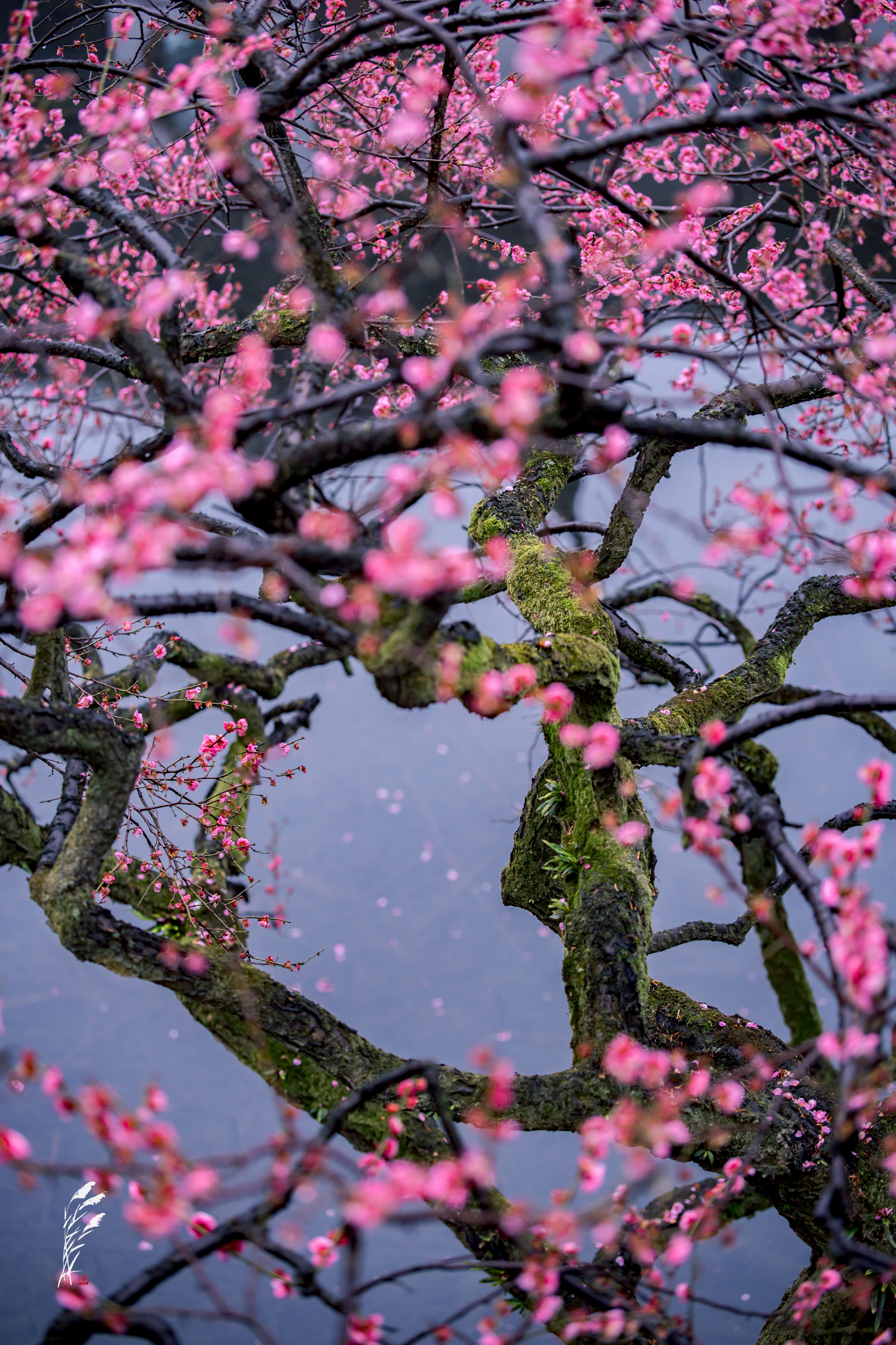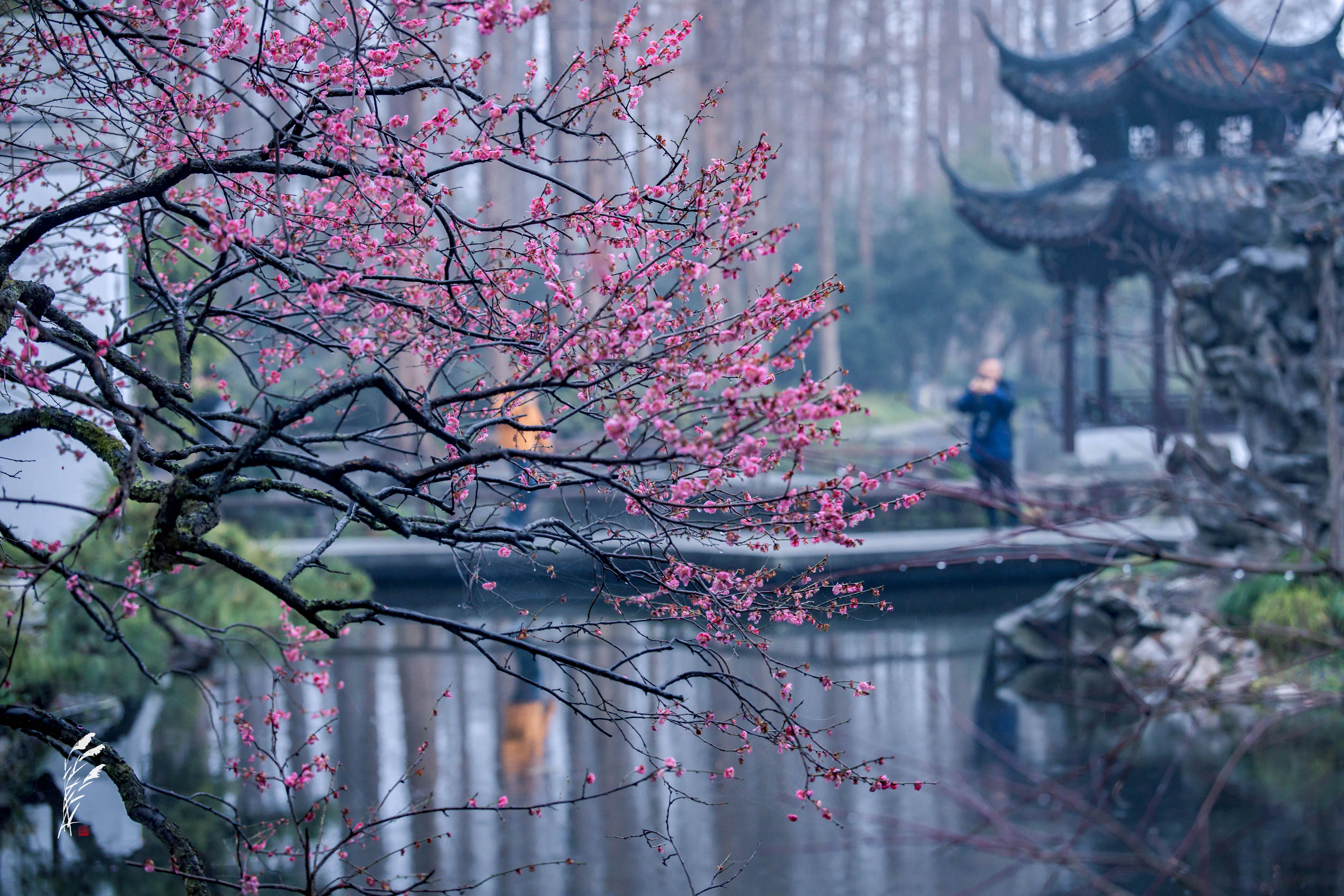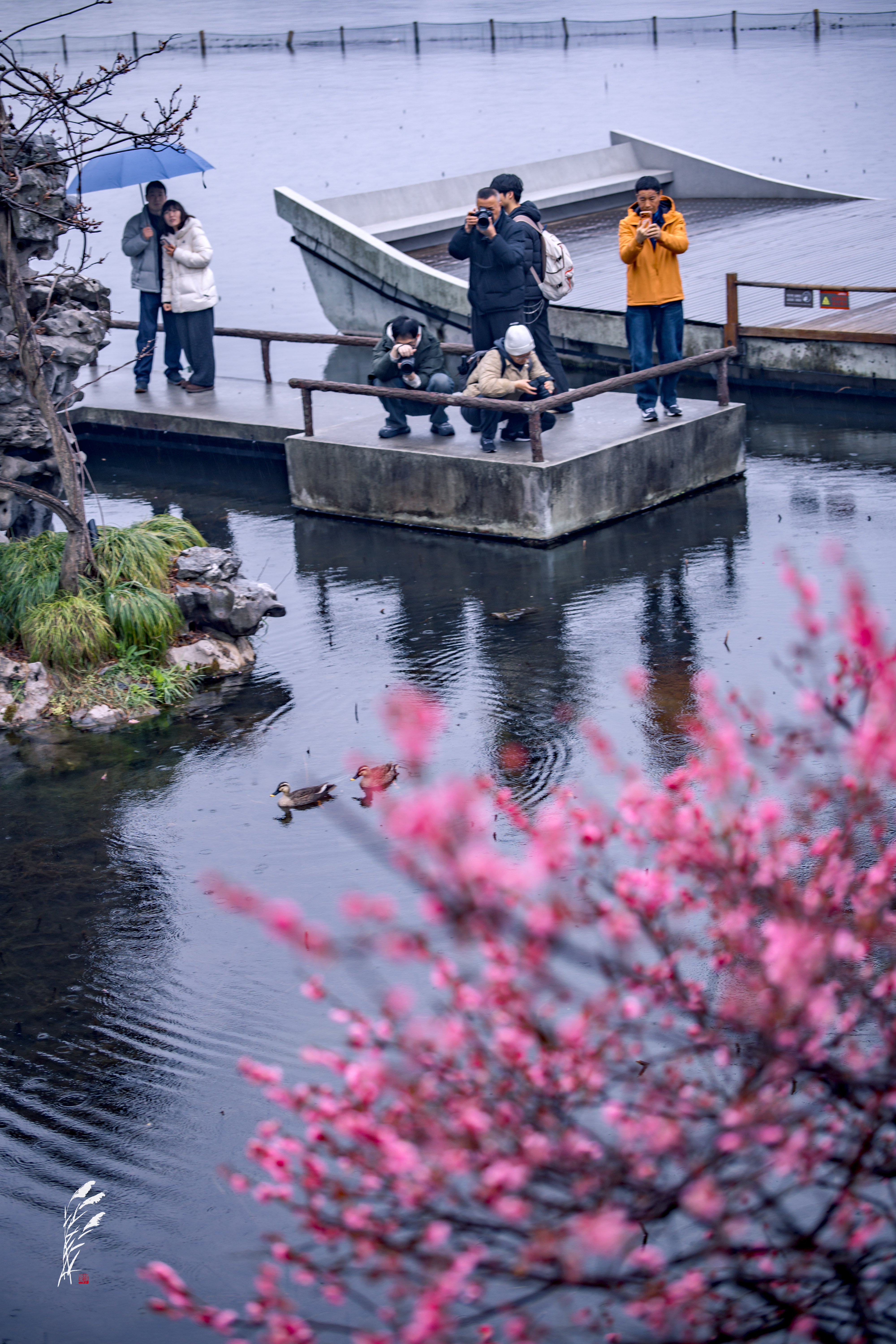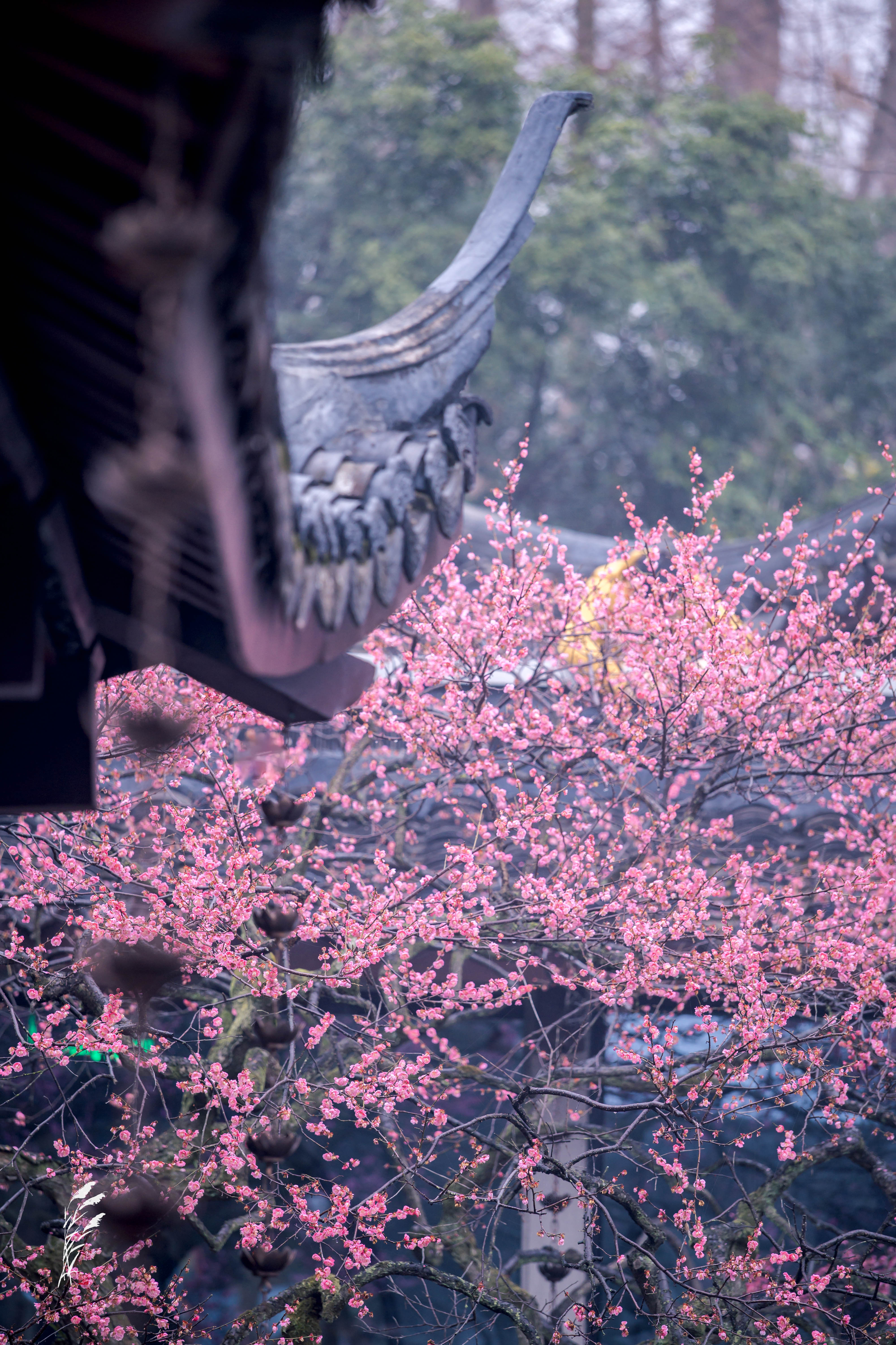 孤梅立烟岚,西湖独一春 —— 湛碧楼前的千年清绝 晨雾如潮,漫过西湖的烟波,湛碧楼畔,唯有这一棵老梅孤然挺立,在苍茫水雾中撑起整个早春的诗意。 这座临湖而筑的湛碧楼,始建于清光绪年间,曾是西湖赏荷观梅的绝佳去处。“湛碧” 二字,取 “水色澄澈,碧波万顷” 之意,当年文人墨客常登楼远眺,看夏荷映日、冬梅傲雪,将西湖四时之景尽收眼底。如今楼虽几经修缮,却仍守着这份古意,与这株孤梅相伴了数百年光阴。 它的树干皲裂如古墨,遒劲的枝桠盘曲成锋,挣脱着雾霭的缠绕,向空中舒展。满树粉蕊缀在铁骨之上,艳而不妖,与身旁苍松的翠针相映,刚柔相济。檐下铜制莲灯垂悬,莲瓣凝霜,与孤梅遥遥相望,风过处,灯链轻摇,暗香便随雾霭漫开。 粉瓣簌簌飘落,或覆上静泊水面的小木船,或沾在青灰湖石上,或随涟漪逐流。两只斑嘴鸭划开水面,搅碎花影,而虬枝间忽然探出的黄鼬,棕黄身影在雾中一闪,为这份极致的孤寂添了灵动野趣。 它不与群芳争艳,只在烟岚中独自盛放。这一棵孤梅,是西湖早春最清绝的印记,用铁骨与繁花,在朦胧间写尽了 “独傲霜雪” 的风骨,也藏尽了江南春日最动人的孤寂与温柔。而身后的湛碧楼,更像一位沉默的老者,见证着这株孤梅的岁岁枯荣,也守着西湖千年不变的诗意。