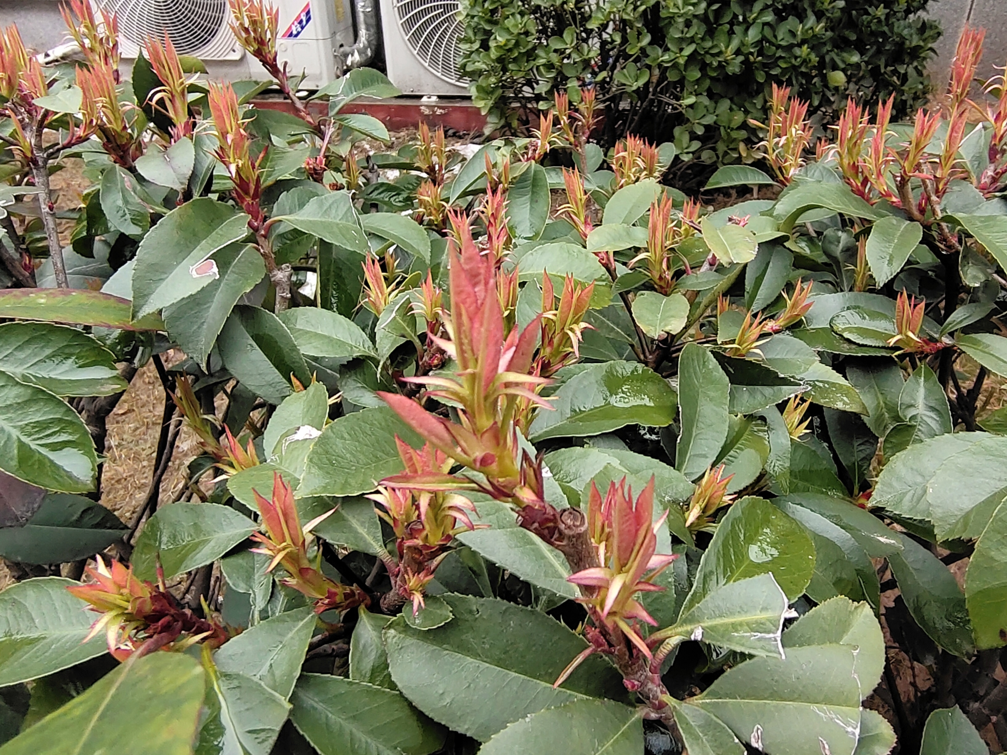 雨后石楠新叶泛红,嫩芽带光,枝条旁空调外机都成了自然画框。