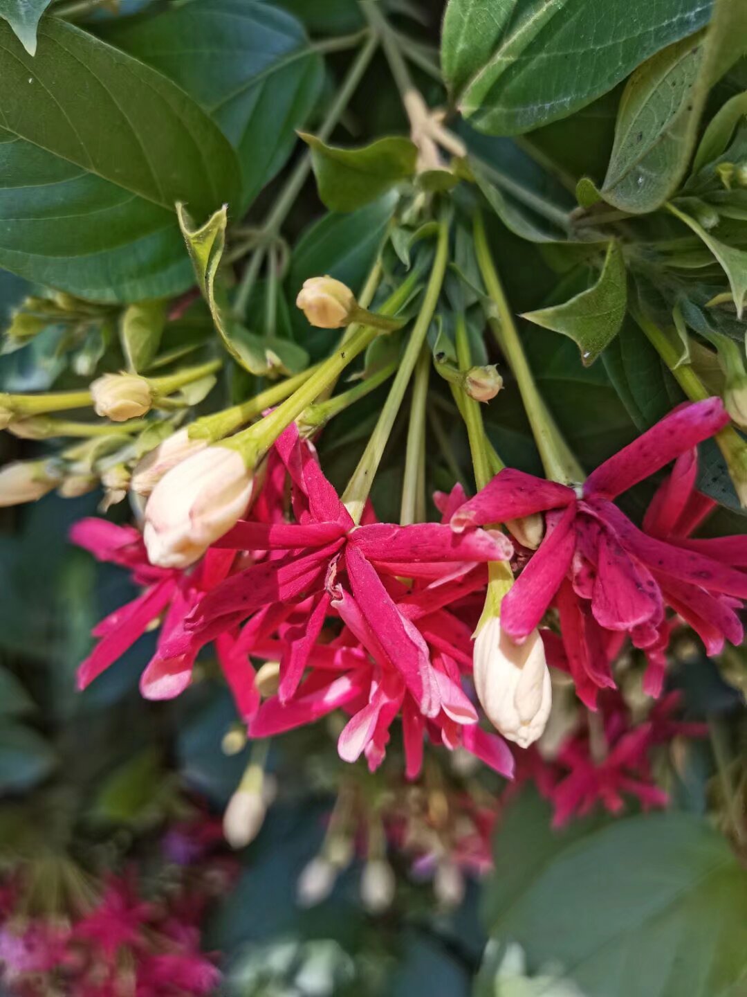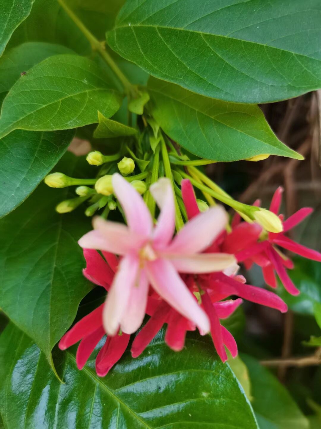 使君子,也叫留求子、仰光藤,是著名的观赏兼药用藤本花卉。(拍摄于西双版纳) 使君子 详细介绍 一、基本信息 - 学名:Combretum indicum / Quisqualis indica - 科属:使君子科 使君子属 - 类型:木质攀援灌木 二、形态特点 - 叶片:椭圆形,翠绿有光泽 - 花朵:下垂穗状花序,5瓣,花色一日三变 - 初开白色 → 渐转粉红 → 深玫红 - 香气:花香清甜,傍晚更浓郁 - 果实:成熟后黑色,有五条棱,是标志性特征 三、原产地 原产热带亚洲,主要为印度、缅甸、菲律宾一带。 四、中国分布 在我国主要分布在长江以南温暖地区: - 广东、广西、福建、海南 - 四川、云南、贵州 - 湖南、江西南部、台湾 四川是传统道地产区,产量大、品质佳。 五、生长习性 - 喜温暖湿润、阳光充足 - 不耐寒、怕霜冻 - 花期:南方5—11月,北方6—9月 - 适合花架、廊架、围墙攀爬观赏 六、价值 1. 观赏:花色多变、花量大、花期长,是优秀藤本花卉 2. 药用:果实入药,是传统驱蛔虫、消疳积良药 需要我为你写一首赞美使君子的小诗吗?