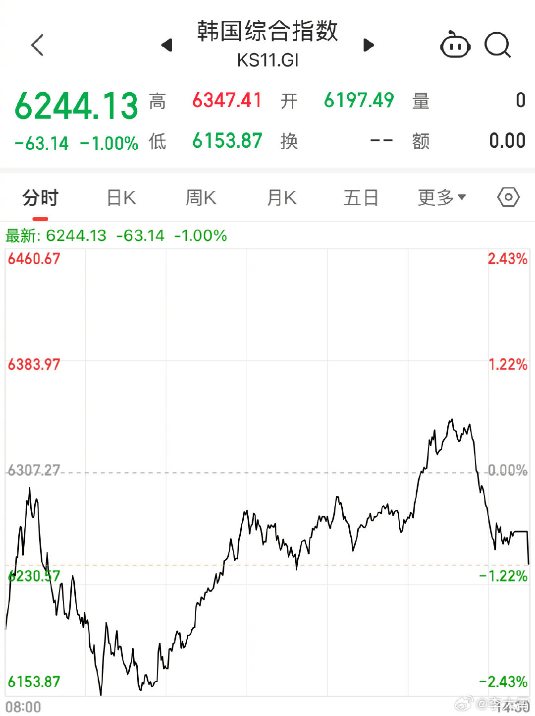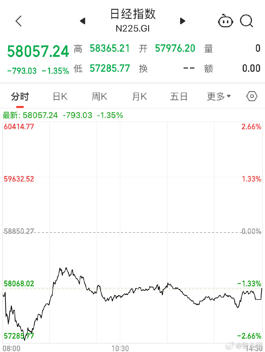 日股大跌超1300点,受外围不稳定因素影响,日经225指数今日表现疲软,上午盘一度下探至57285点的低位,收盘报58057点,下跌1.35%。韩国综合指数同样出现下挫,一度跌超2.43%,最低探到6153点,收盘报6244点,下跌1%。