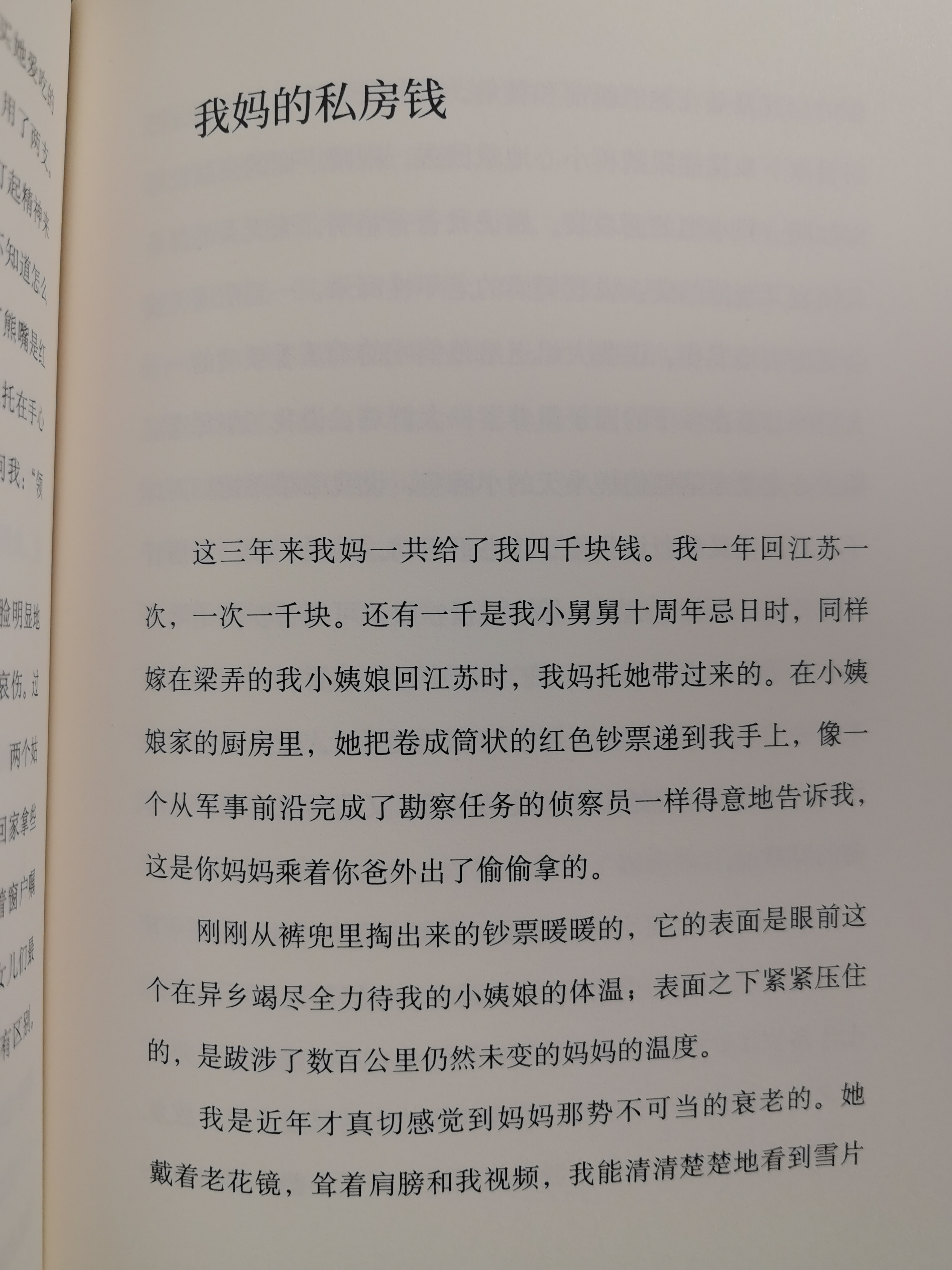 今天阅读《我妈的私房钱》:三年来我妈一共给了我四千块钱,每年回江苏老家一次给一千块,还有一千块是妈妈托小姨娘带给我的,这可都是她的私房钱。这大家就要问了,我们浙江一般家里的钱都是女方管的,要藏私房钱也是男方藏的,怎么女方也会藏私房钱呢,何况母亲手能轻巧,上的了厨房,下的了厅堂。这就要从头说起了,我爸是个极其强势的人,又是退伍军人,退伍后再供销社开车,工作岗位好。所以当我妈想进工厂学技能时,老爸大手一挥说:我长年累月出差在外,你再去工作了,我一身泥一身汗的回到家里,连个热汤都喝不到,你不要去工作了,我来养你,有我一口吃绝不会饿着你们。经常以部队首长的姿态来对待母亲和我们几个孩子。做不好就会被劈头盖脸的打击一顿,让你体无完肤,对此我们对他时敬而远之。我们对着母亲抱怨时,母亲则对他很满意,说:你爸就是脾气差点,但是他很顾家,不抽烟、不喝酒、不赌博,又没有把我们饿着,经常还给你们改善伙食,你看,我们家都早早地盖起来起房子。不得不说,母亲是个智者,只要父亲顾家,谁管钱都是一样,不管钱反而不用操心,有时候舍得就是就最大的成功。