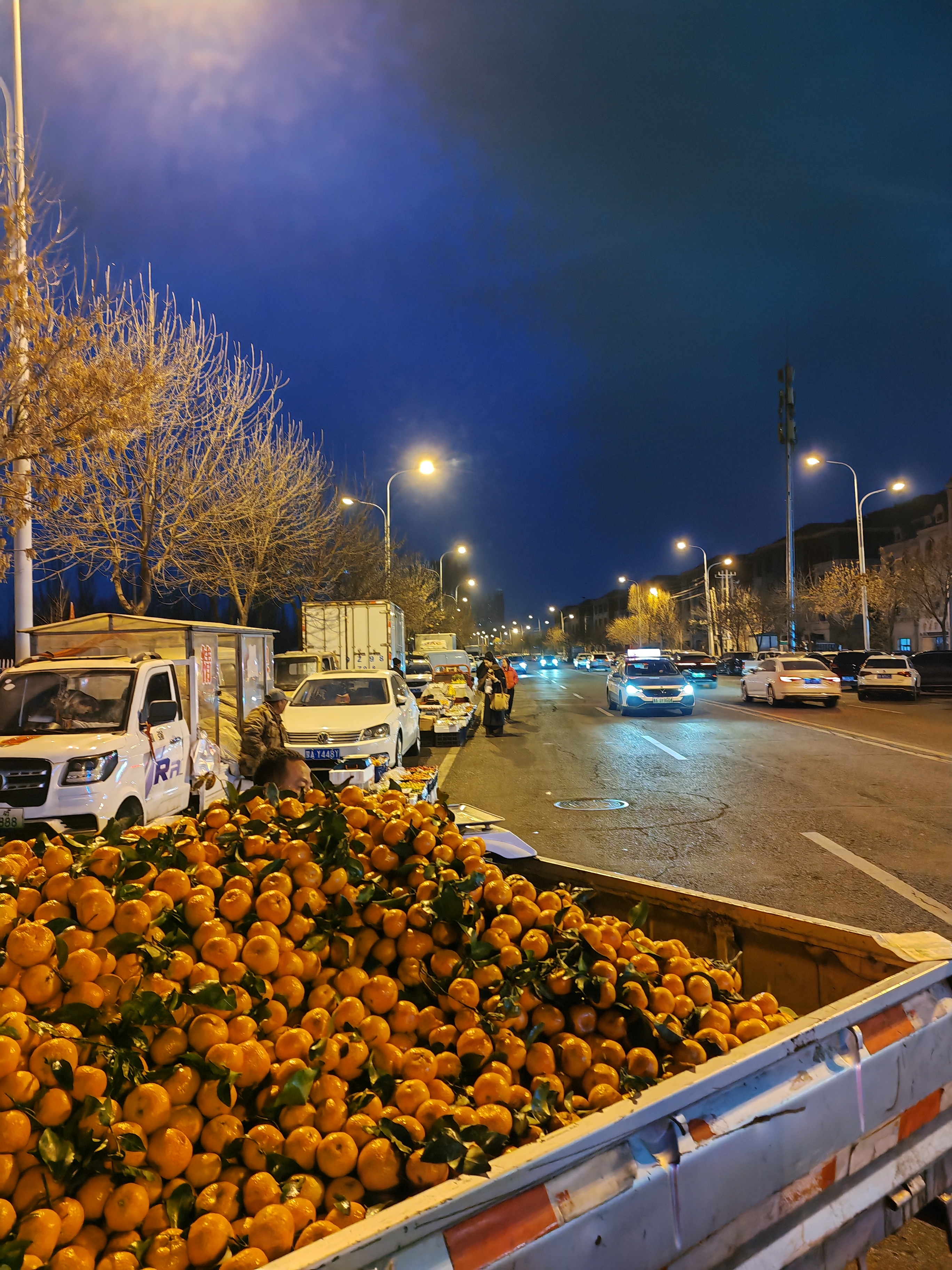 夜市水果摊前,橙子堆成小山,路灯下暖光流淌,冬树剪影里人来车往,烟火气正浓~