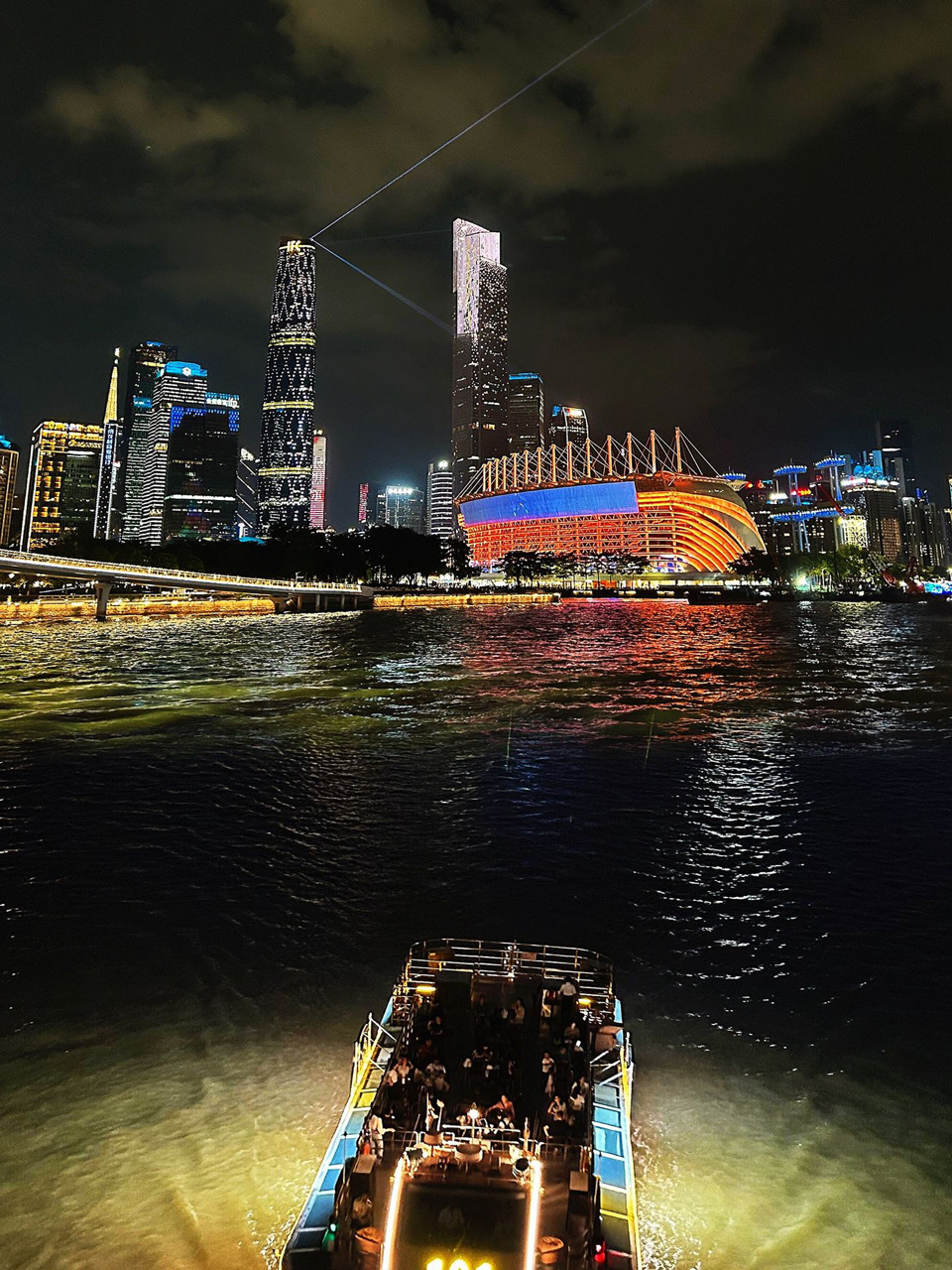 珠江夜游,船一晃,广州塔就在我镜头里扭腰~海心沙的灯光秀刚开场,珠江新城的摩天楼群就集体亮灯打call!水面倒影碎成星河,猎德大桥像条发光锁链。风一吹,连倒影都在笑~随手一按,全是都市浪漫暴击💥(手机直出,没修图,信我!)