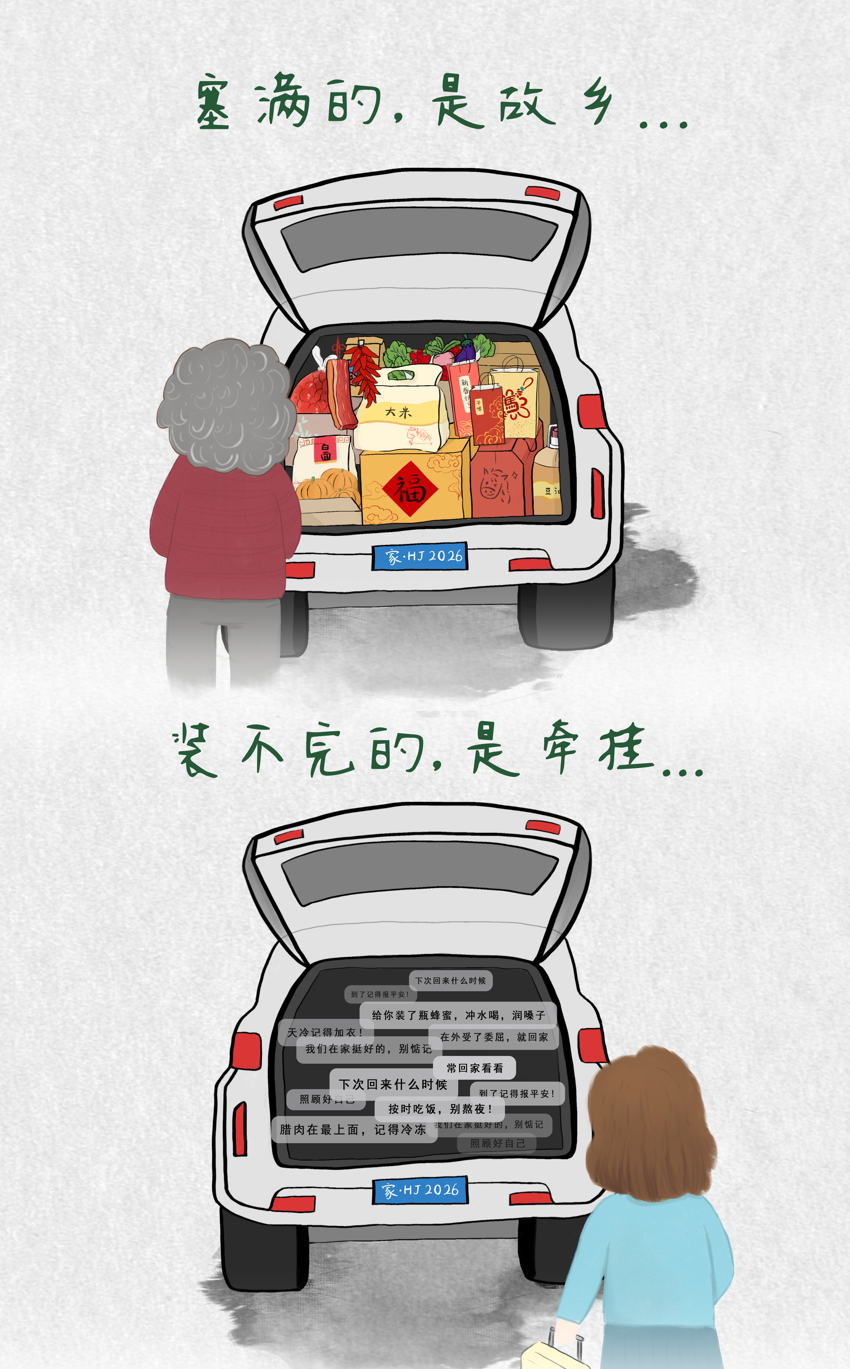 《打开过完年的后备箱》 2026年春节假期落幕,返程的后备箱再度成为朋友圈里“最温情的摄影棚”。湖南邵阳的李先生返程广东时,父亲忙着将自家熏的腊肉、新碾的大米塞满后备箱,连缝隙都要用土鸡蛋填上;四川雅安的李女士出发前,母亲一边念叨“外面的菜不放心”,一边往车里搬自家种的油菜头和手工糍粑;还有网友晒出,父母甚至将雨伞、洗脸巾都悄悄打包,直言“感觉明年要换辆卡车才装得下”。 塞满的,是故乡—— 在后备箱这一小小天地里,装载的不是简单的生活物资。在长辈眼中,那些带着烟火气的土特产,好似能为出门在外的游子抵御风雨。而当年轻人们回到奋斗的城市,再次打开后备箱,触发的不仅是视觉,更是记忆的弹幕机制:手指碰到腊肉,耳边响起“记得放冷冻”;捧起鸡蛋,浮现“别磕坏了,用谷糠隔开的”;拧开蜂蜜罐,那句“润嗓子,少熬夜”便自动播放。这些未曾写进聊天记录的唠叨,以实物的形式在异乡重新呈现。 装不下的,是牵挂—— 我们总是在关上车门后,才开始学习如何被爱着。回忆那些叮咛背后的潜台词:“多穿点”是“我怕你照顾不好自己”;“钱够吗”是“累了就回来”;“常回来看看”是“我想你了”。长辈们不会说什么甜言蜜语,只会把爱换算成实物,用谷糠、麻绳和蛇皮袋,完成一场笨拙而固执的打包。 所谓乡愁,从来不是地理的距离,而是时间的错位——最重的从来不是哪箱特产,而是父母按了两次才关上的后备箱门,是藏在每件物资里说不尽的牵挂,这也是每位游子奔赴远方最温暖的底气。 文稿:安徽理工大学 韩婷 漫画:安徽理工大学 张瑾 #漫画评论# #漫评#