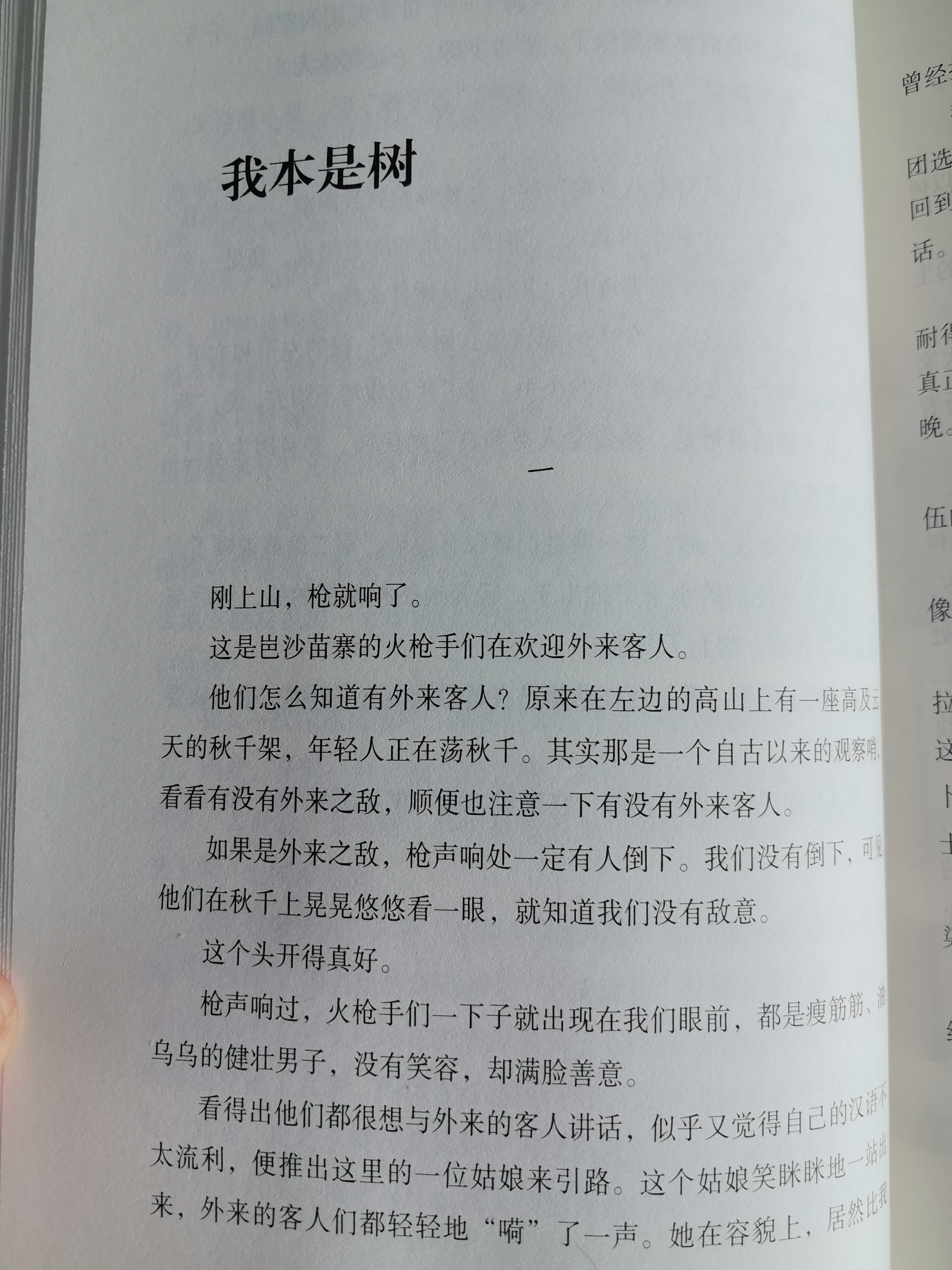今天于都余秋雨老师的《山河之书》之“我本是树”,这本书也是我前段时间在潮新闻读书活动中获赠的。这篇文章还是讲述苗寨里人们的故事,在他们寨子左右边的高山上有一座高级云顶的秋千架,咋一看还以为是什么娱乐项目,其实不然,这就他们的观察哨。由于在最高点,外面有人过来就能远远地看到。年轻的火枪手随时在那里待命,如果遇到敌人就毫不客气的开枪,如果你还听到枪声,没有中枪,那就是知道我们没有敌意。苗族作为蚩尤的后代很崇拜树,以树为神明一样对待。孩子出生时会种上一棵树,等他死了,这把这棵树砍下来埋在一起,并种一棵树,象征生命还在延续,因此你去他们那里看不到一座坟、一块墓碑。一棵树在别处看来是一段木料,但是这里不是,这正像甲骨文不是一堆骨料,万里长城不是一堆砖料一样。树即是人,人即是树,既然灵魂与躯体都与树林山川全然一体了,那又何来生死?陶渊明所说的:“托体同山啊”,大概就是这个意思吧。